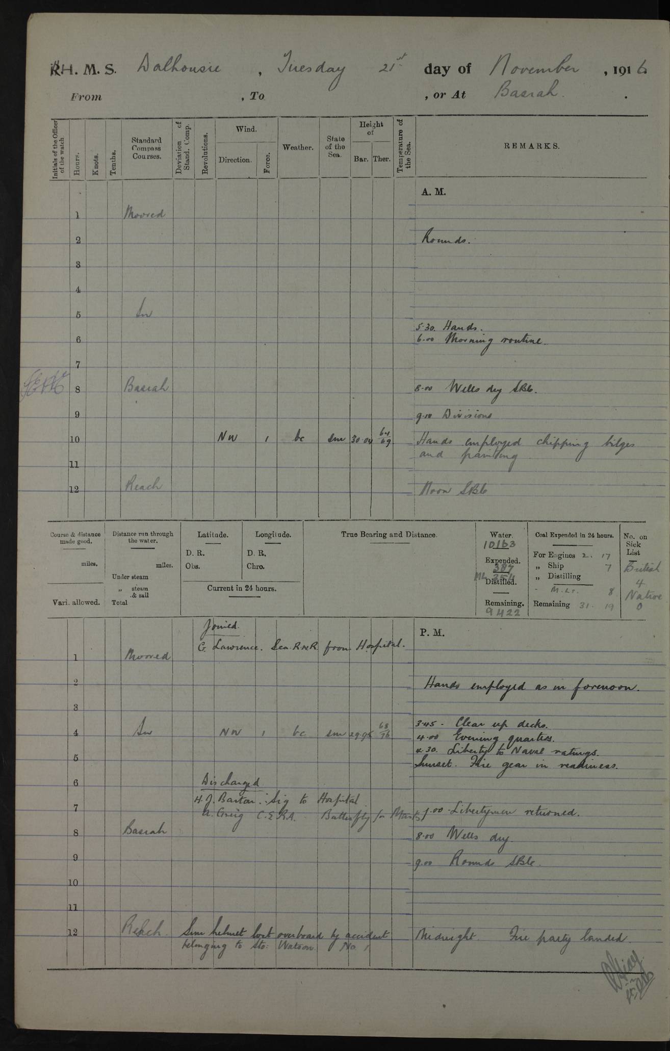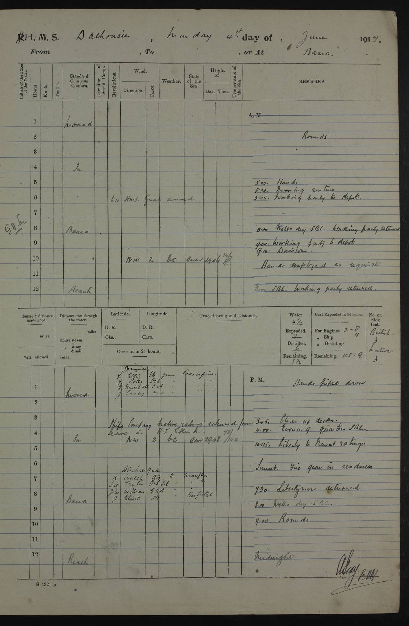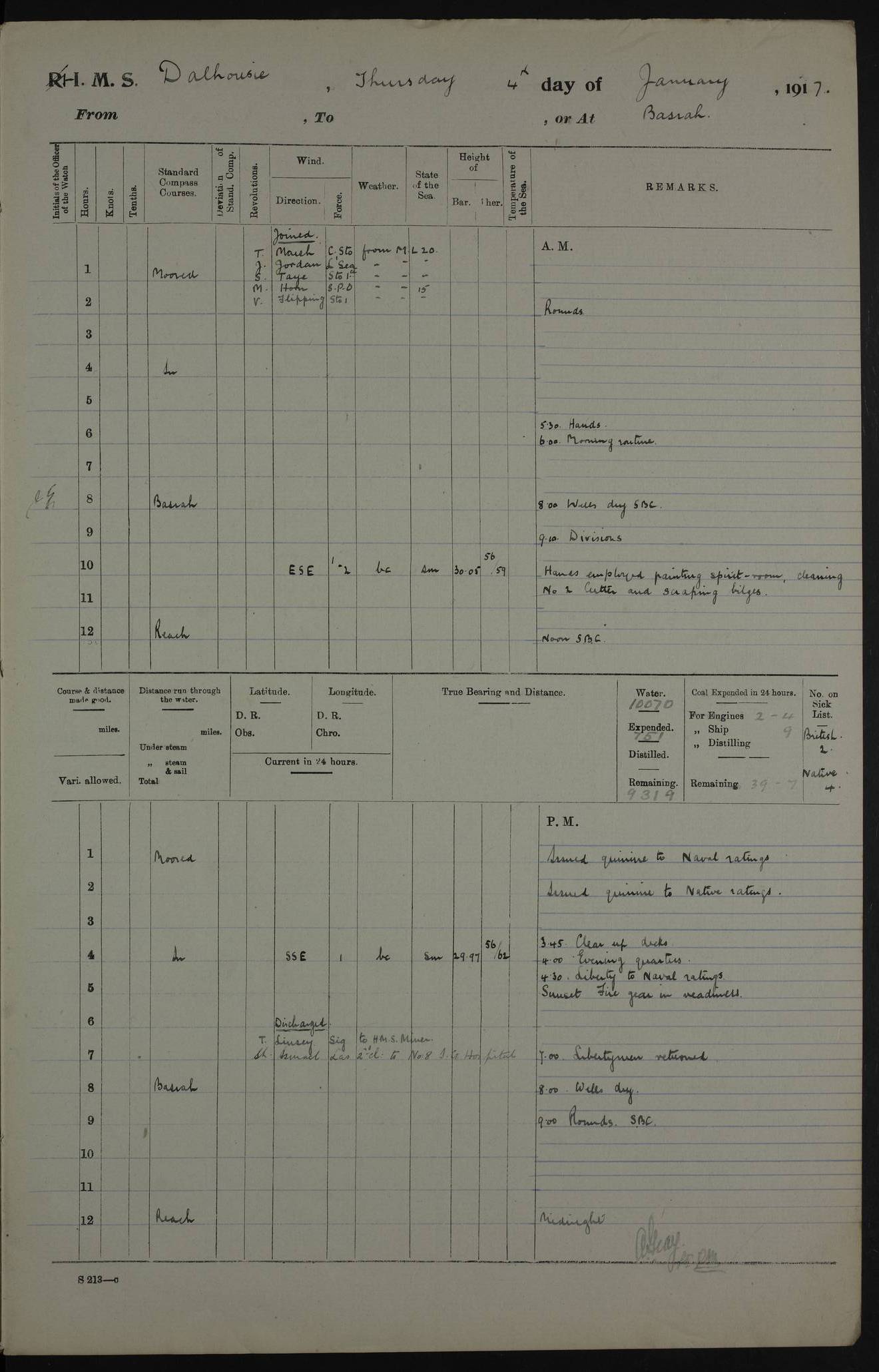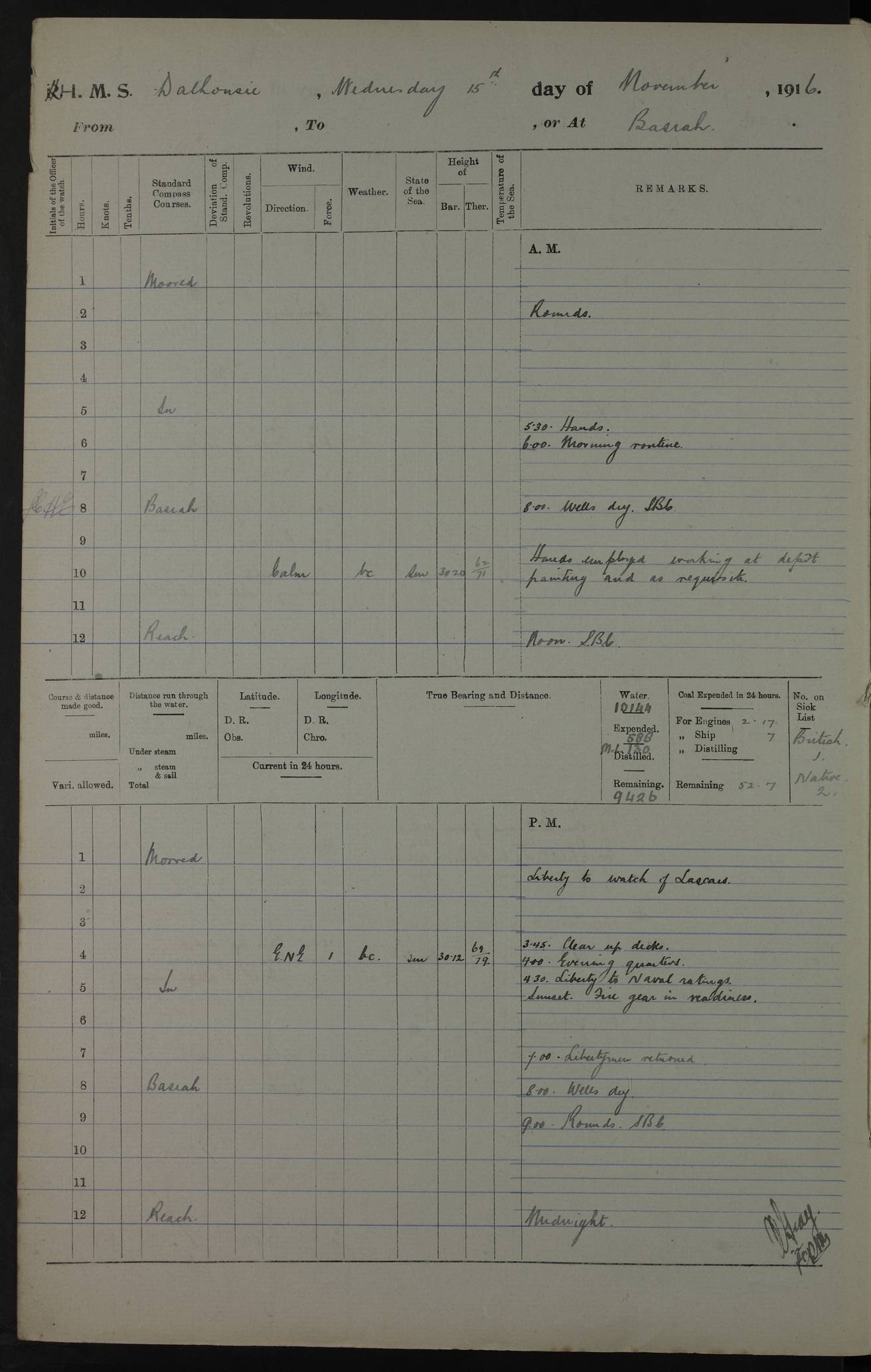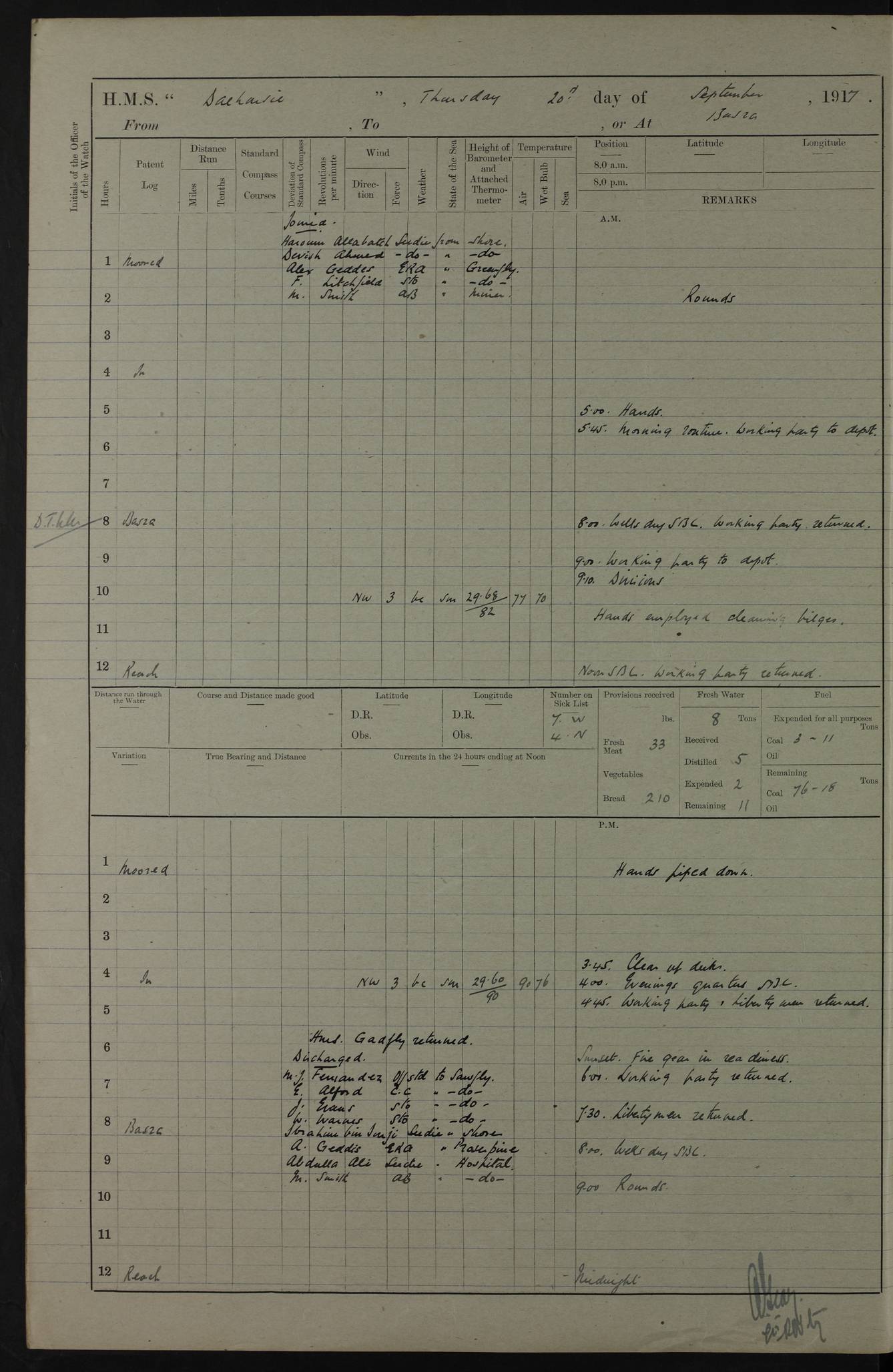 PM - Discharged To Hospital: H Widger, Engine Room Artificer - PW Harrison, Stoker Royal Navy Reserve To Motor Launch 11: J W Whitfield, Stoker 4ef4fa93e53e0a0c910056e2: (https://s3.amazonaws.com:443/oldweather/ADM53-39392/0018_0.jpg) 31 August 1916 Place: Basrah Lat 30.5269, Long 47.8407 2:00am: Rounds 5:05am: Hospital Ship SYRIA passed down 5:30am: Hands 6:00am: Morning Routine 8:00am: Wells dry – Signal Books Correct 9:30am: Divisions - Hands cleaning ship 11:00am: Drew Three Thousand Rupees from the Field treasury 12:00pm: Signal Books Correct – Issued Quinine to ship’s company 12:30pm: Piped Down 3:30pm: 4:00pm: Signal Books Correct 4:30pm: Cleared up decks 5:00pm: Evening Quarters – Leave to Watch of Naval Ratings 7:00pm: Sunset - Fire Gear in readiness 7:30pm: Liberty men returned 8:00pm: Wells dry - Signal Books Correct 9:00pm: Rounds - Signal Books Correct 11:00pm: Destroyed 19 tins Milk being unfit for use. AM – Joined From Motor Launch Depot: M. McMillan, Able Seaman From 5 Mess: T. Jackson, Petty Officer 1st From 4 Mess: T Golden, Stoker – J Tunney, Royal Navy Reserve Trawler Section From 10 Mess: J Donegan Royal Navy Reserve Trawler Section