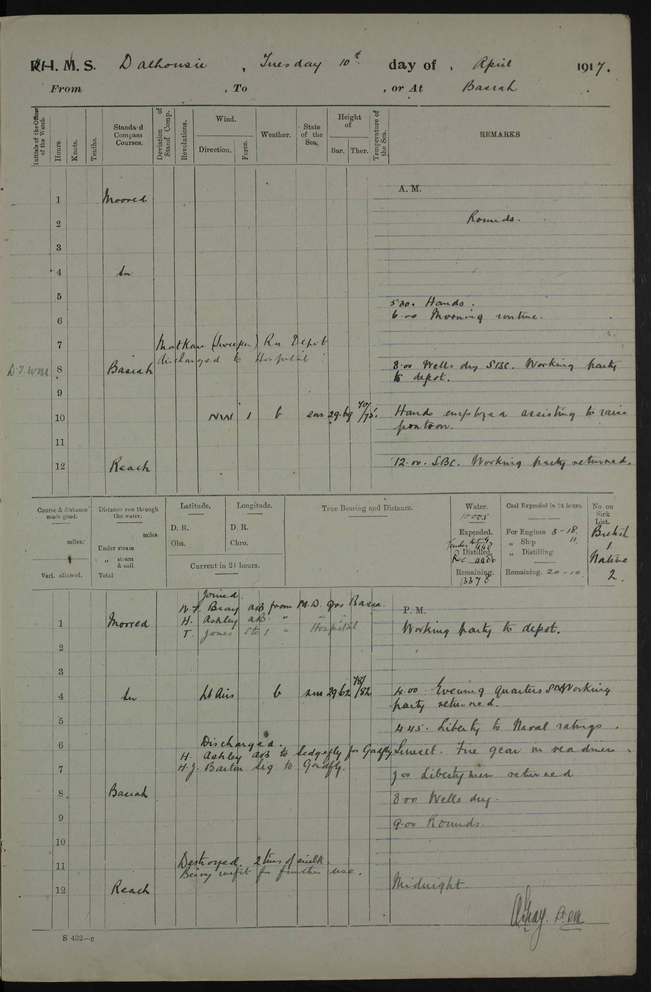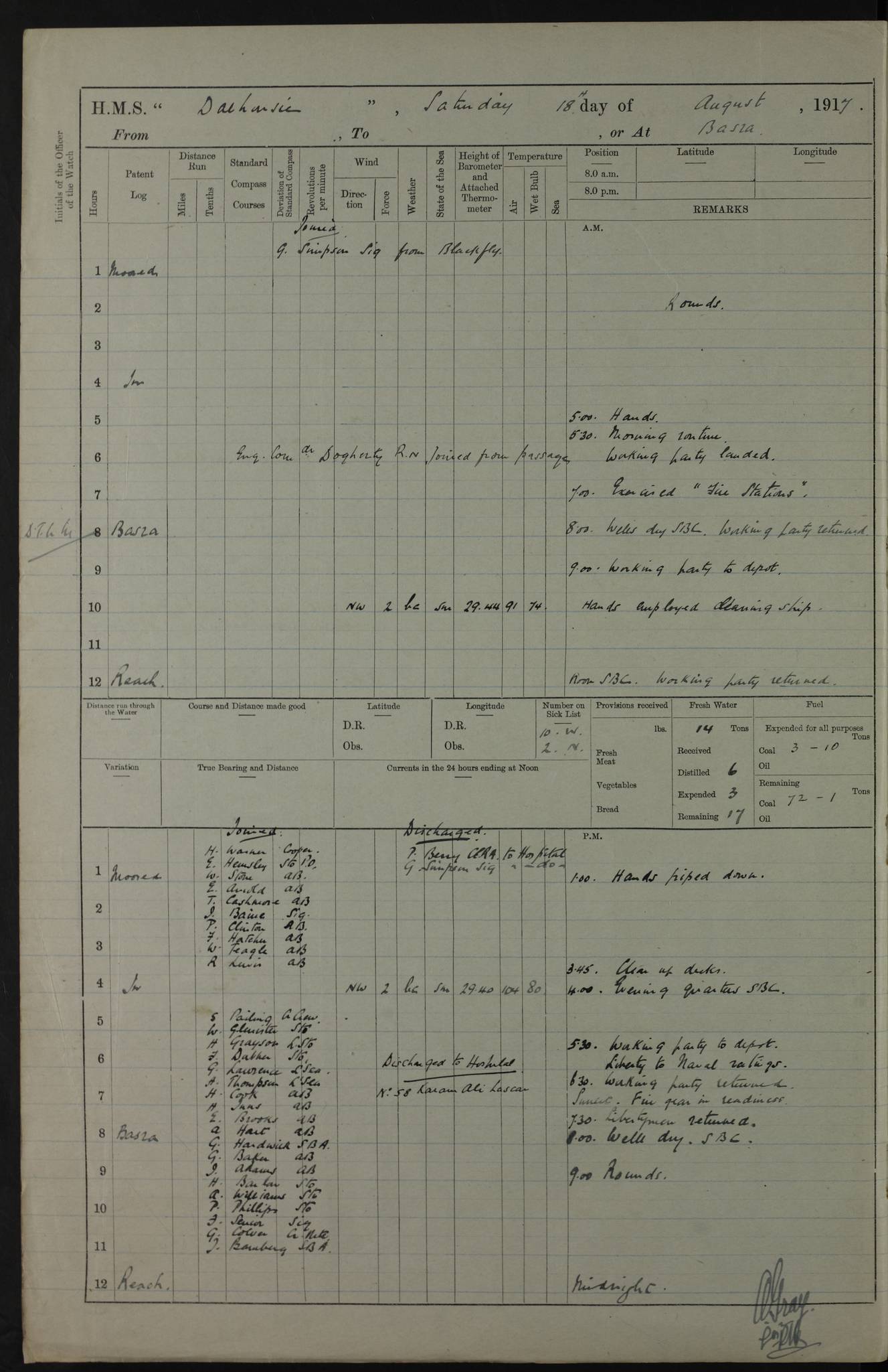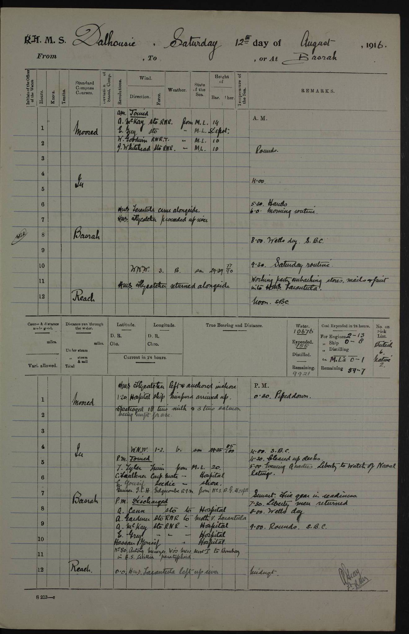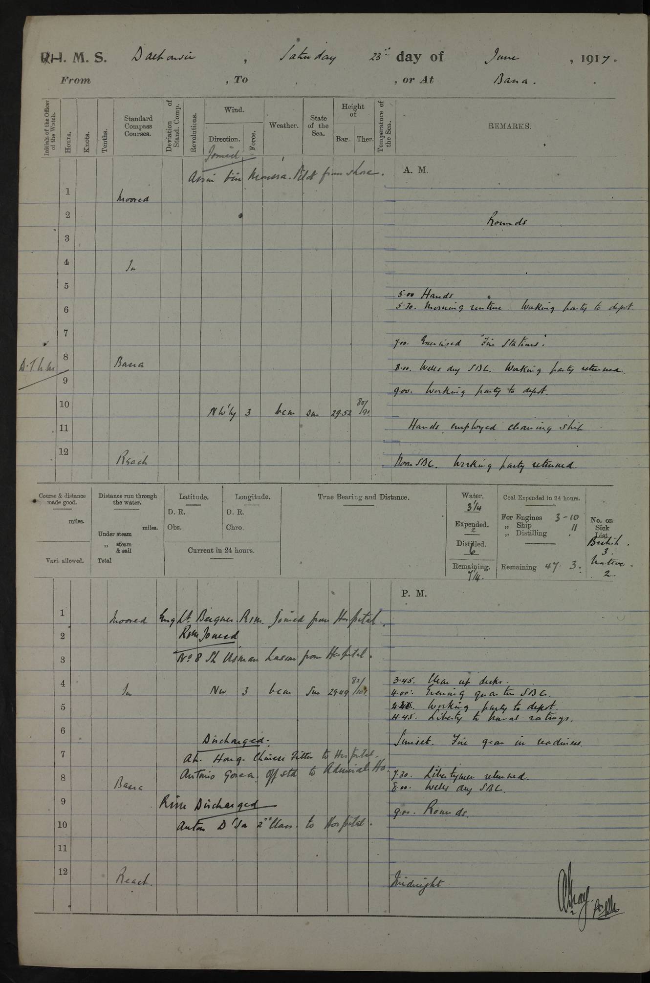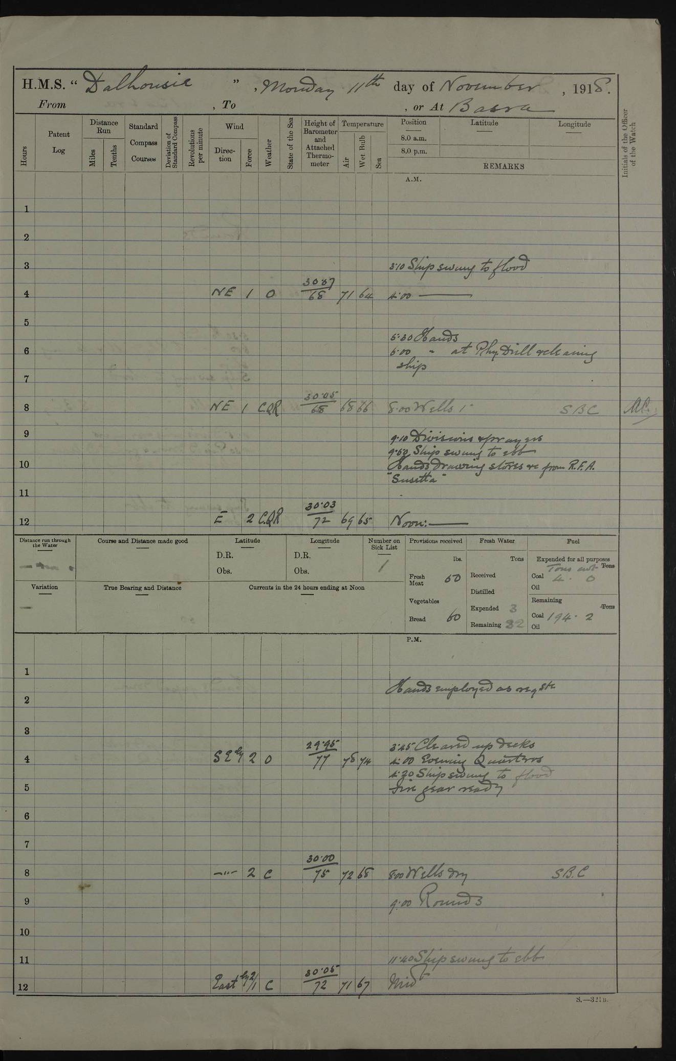PM - Discharged To Hospital: H Widger, Engine Room Artificer - PW Harrison, Stoker Royal Navy Reserve To Motor Launch 11: J W Whitfield, Stoker 4ef4fa93e53e0a0c910056e2: (https://s3.amazonaws.com:443/oldweather/ADM53-39392/0018_0.jpg) 31 August 1916 Place: Basrah Lat 30.5269, Long 47.8407 2:00am: Rounds 5:05am: Hospital Ship SYRIA passed down 5:30am: Hands 6:00am: Morning Routine 8:00am: Wells dry – Signal Books Correct 9:30am: Divisions - Hands cleaning ship 11:00am: Drew Three Thousand Rupees from the Field treasury 12:00pm: Signal Books Correct – Issued Quinine to ship’s company 12:30pm: Piped Down 3:30pm: 4:00pm: Signal Books Correct 4:30pm: Cleared up decks 5:00pm: Evening Quarters – Leave to Watch of Naval Ratings 7:00pm: Sunset - Fire Gear in readiness 7:30pm: Liberty men returned 8:00pm: Wells dry - Signal Books Correct 9:00pm: Rounds - Signal Books Correct 11:00pm: Destroyed 19 tins Milk being unfit for use. AM – Joined From Motor Launch Depot: M. McMillan, Able Seaman From 5 Mess: T. Jackson, Petty Officer 1st From 4 Mess: T Golden, Stoker – J Tunney, Royal Navy Reserve Trawler Section From 10 Mess: J Donegan Royal Navy Reserve Trawler Section
