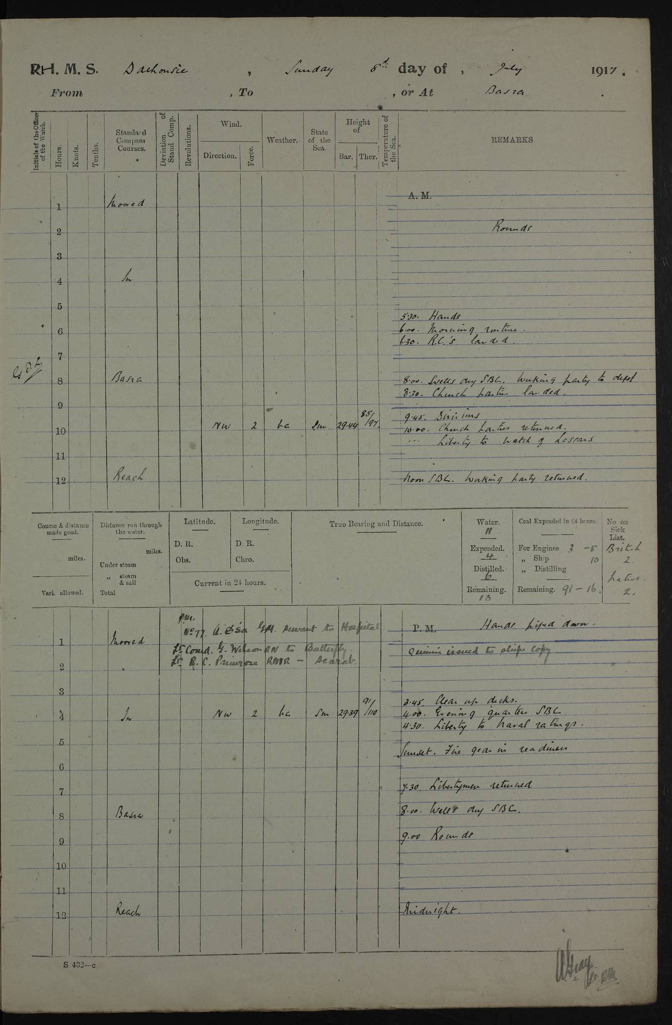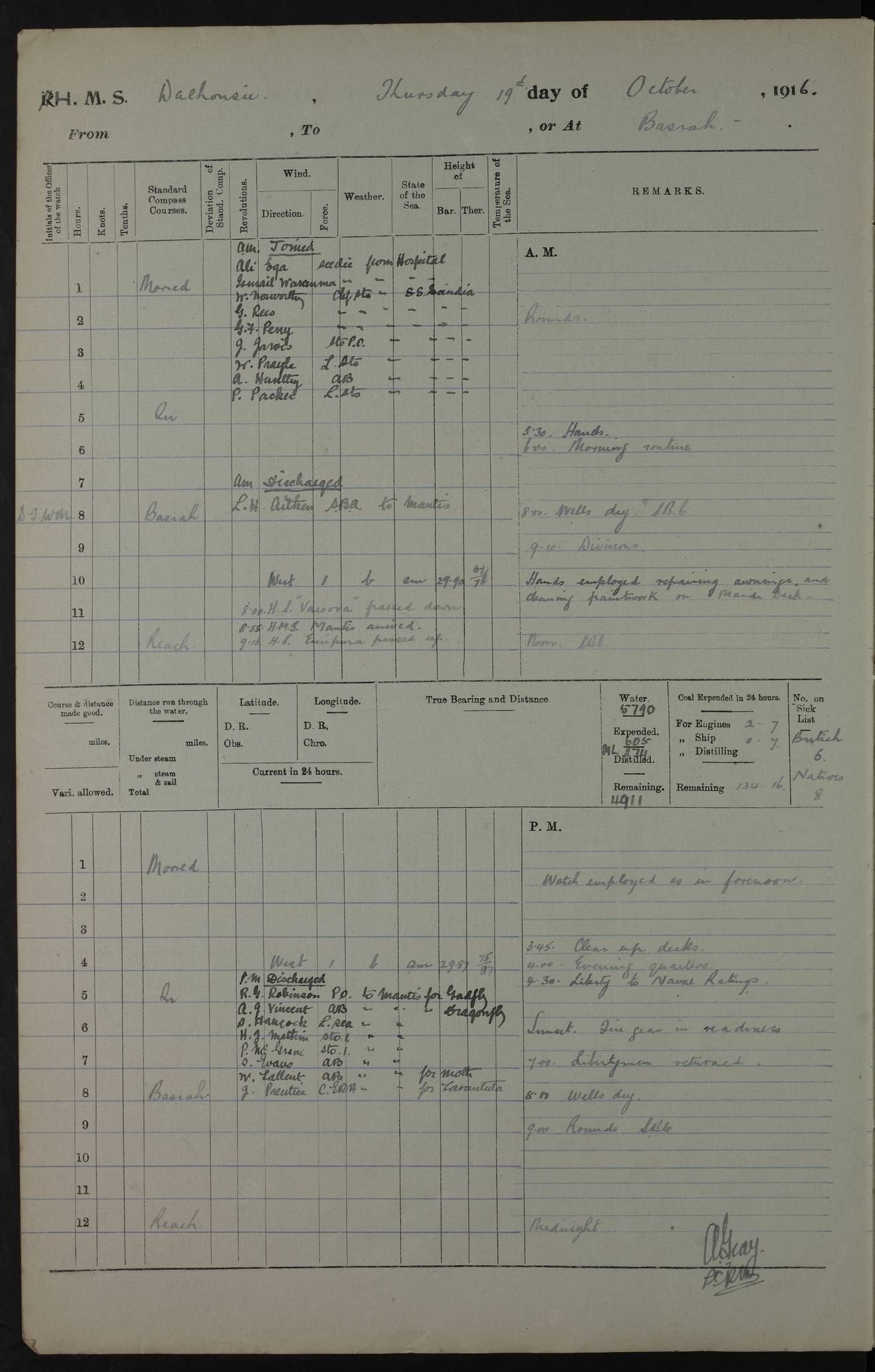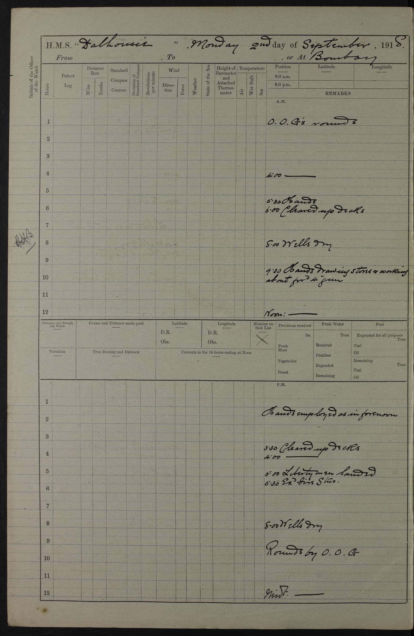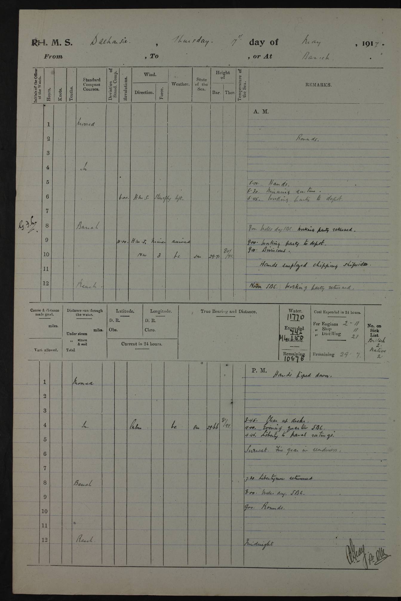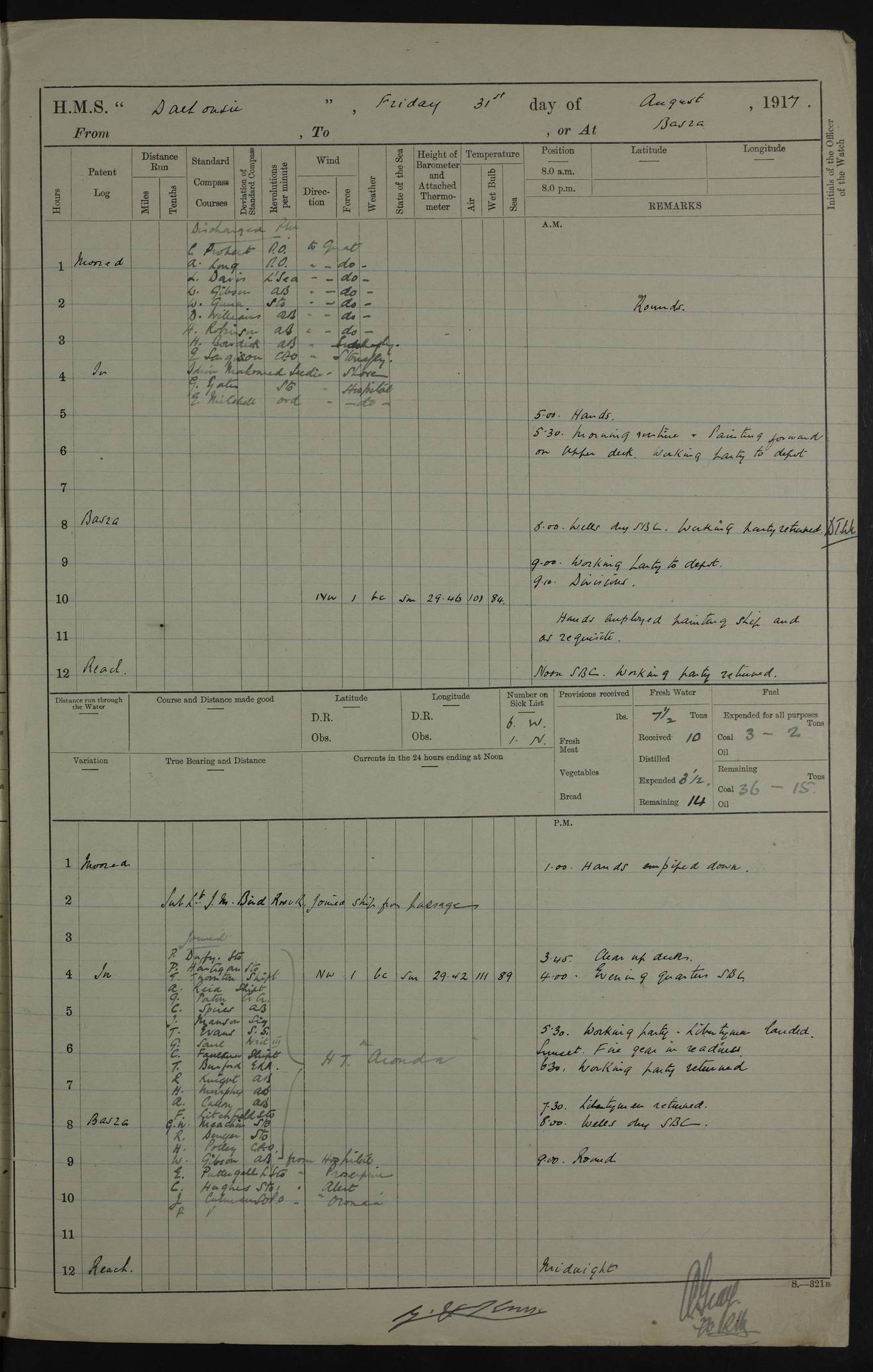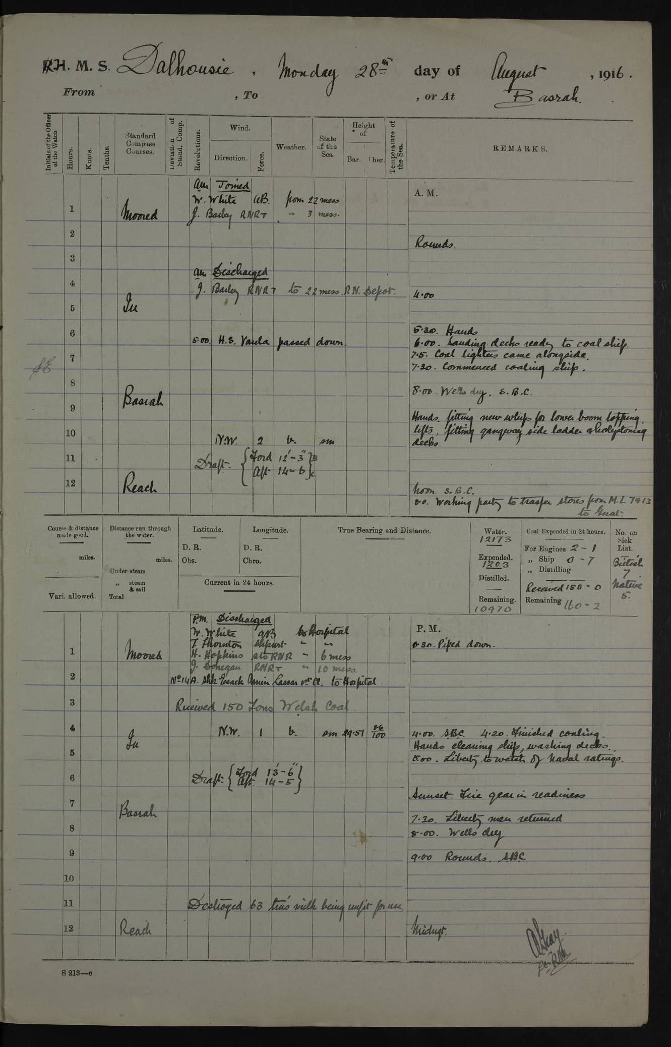 PM - Discharged To Hospital: H Widger, Engine Room Artificer - PW Harrison, Stoker Royal Navy Reserve To Motor Launch 11: J W Whitfield, Stoker 4ef4fa93e53e0a0c910056e2: (https://s3.amazonaws.com:443/oldweather/ADM53-39392/0018_0.jpg) 31 August 1916 Place: Basrah Lat 30.5269, Long 47.8407 2:00am: Rounds 5:05am: Hospital Ship SYRIA passed down 5:30am: Hands 6:00am: Morning Routine 8:00am: Wells dry – Signal Books Correct 9:30am: Divisions - Hands cleaning ship 11:00am: Drew Three Thousand Rupees from the Field treasury 12:00pm: Signal Books Correct – Issued Quinine to ship’s company 12:30pm: Piped Down 3:30pm: 4:00pm: Signal Books Correct 4:30pm: Cleared up decks 5:00pm: Evening Quarters – Leave to Watch of Naval Ratings 7:00pm: Sunset - Fire Gear in readiness 7:30pm: Liberty men returned 8:00pm: Wells dry - Signal Books Correct 9:00pm: Rounds - Signal Books Correct 11:00pm: Destroyed 19 tins Milk being unfit for use. AM – Joined From Motor Launch Depot: M. McMillan, Able Seaman From 5 Mess: T. Jackson, Petty Officer 1st From 4 Mess: T Golden, Stoker – J Tunney, Royal Navy Reserve Trawler Section From 10 Mess: J Donegan Royal Navy Reserve Trawler Section