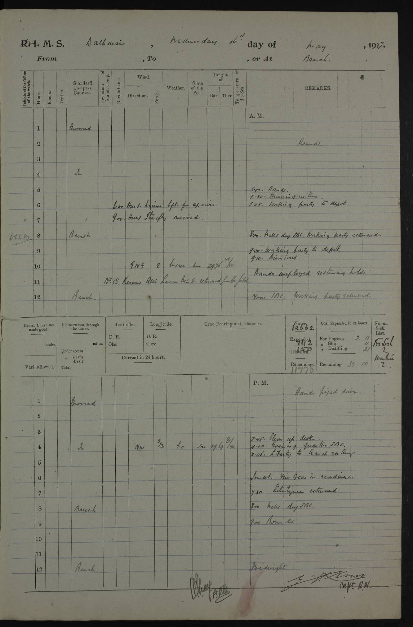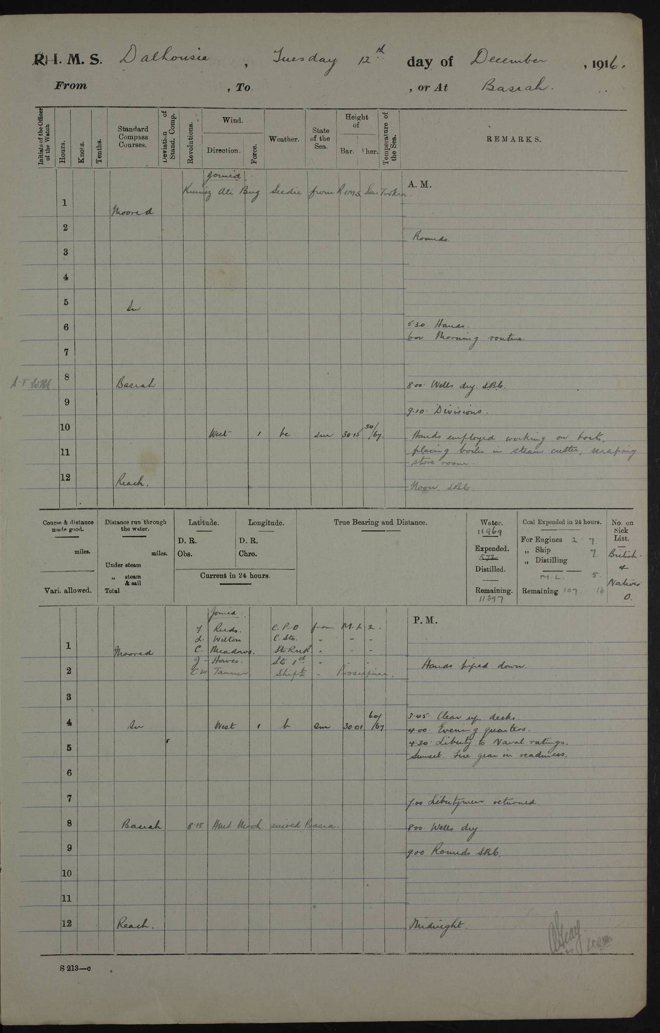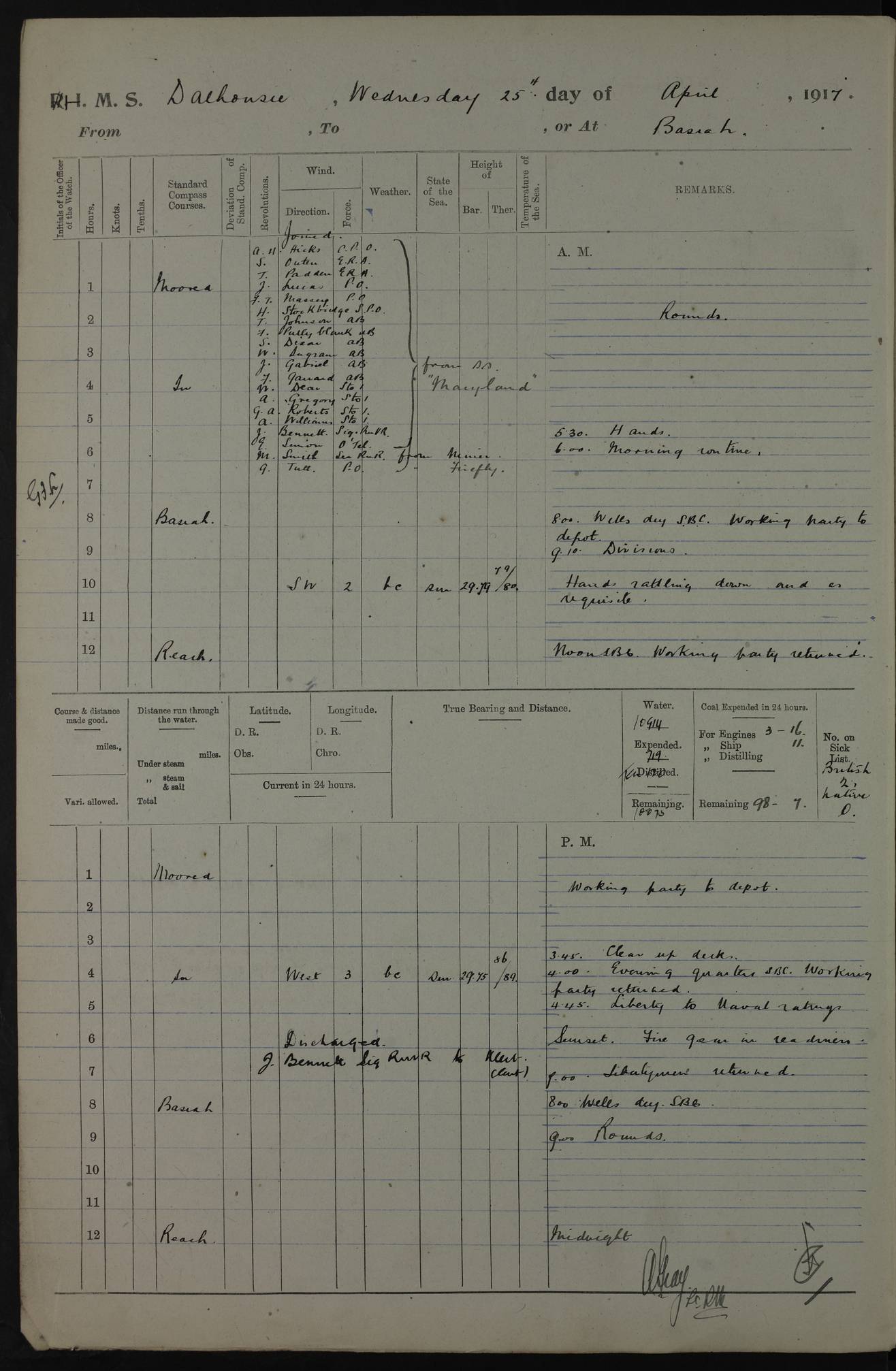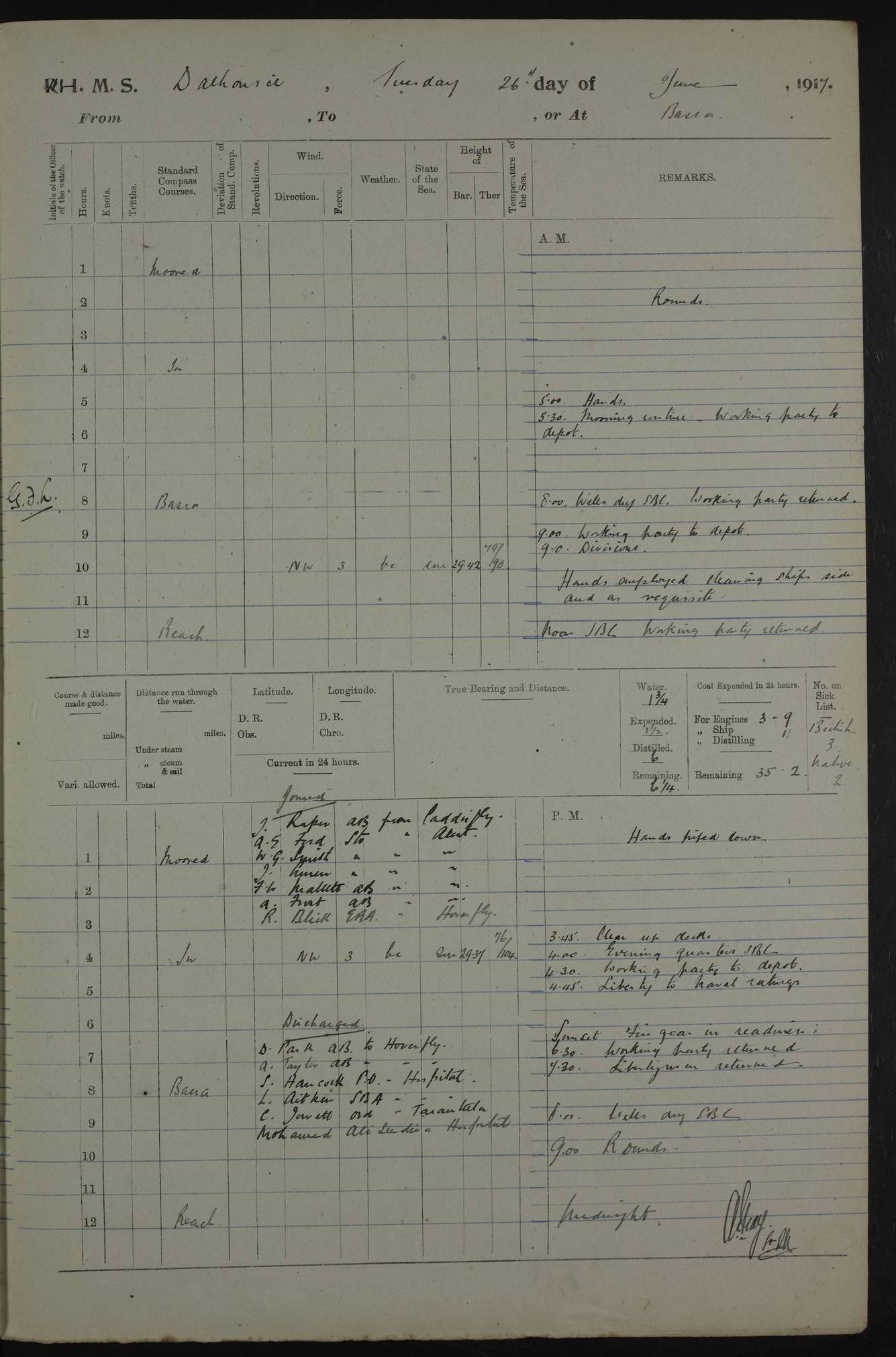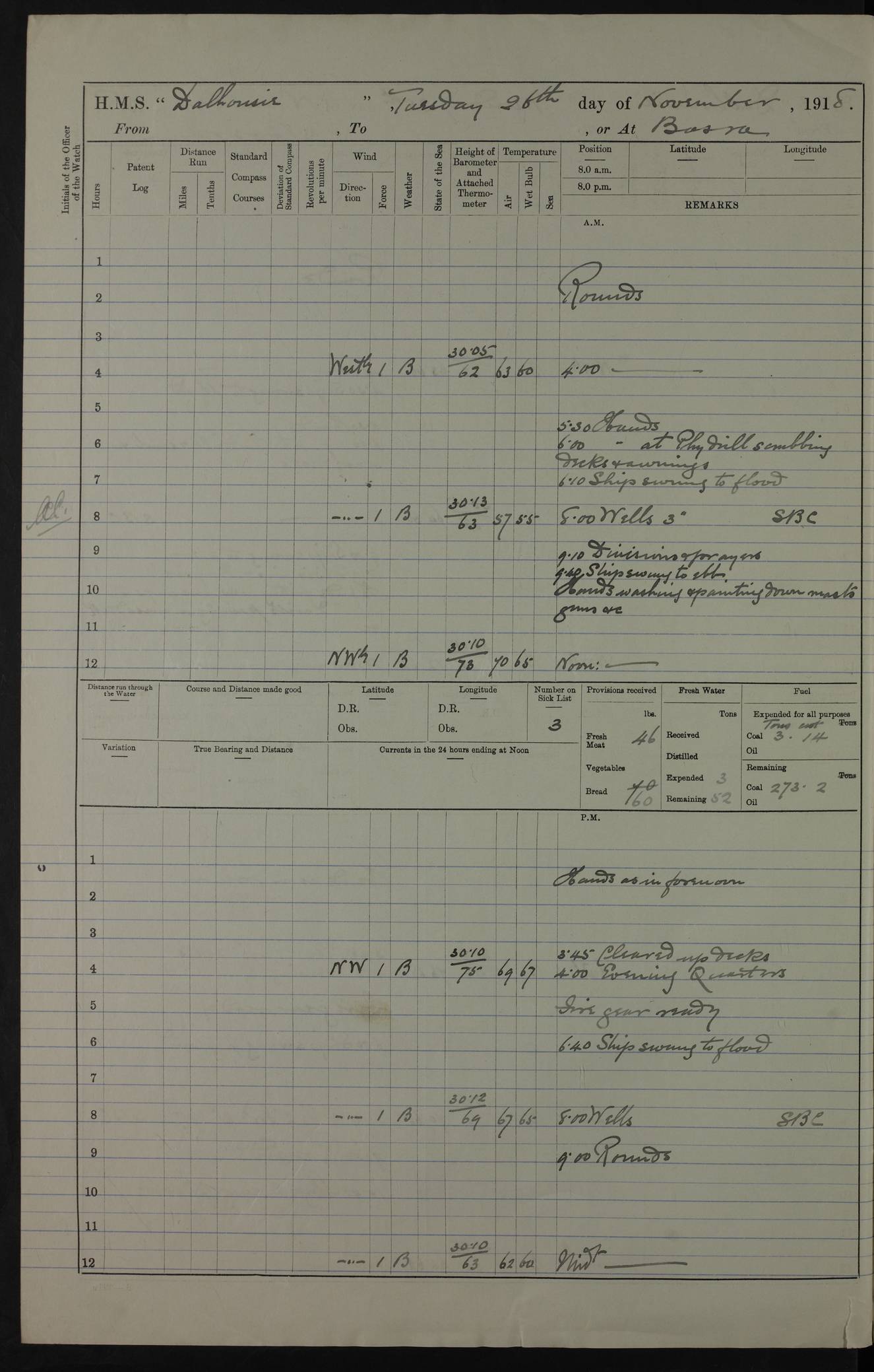 PM - Discharged To Hospital: H Widger, Engine Room Artificer - PW Harrison, Stoker Royal Navy Reserve To Motor Launch 11: J W Whitfield, Stoker 4ef4fa93e53e0a0c910056e2: (https://s3.amazonaws.com:443/oldweather/ADM53-39392/0018_0.jpg) 31 August 1916 Place: Basrah Lat 30.5269, Long 47.8407 2:00am: Rounds 5:05am: Hospital Ship SYRIA passed down 5:30am: Hands 6:00am: Morning Routine 8:00am: Wells dry – Signal Books Correct 9:30am: Divisions - Hands cleaning ship 11:00am: Drew Three Thousand Rupees from the Field treasury 12:00pm: Signal Books Correct – Issued Quinine to ship’s company 12:30pm: Piped Down 3:30pm: 4:00pm: Signal Books Correct 4:30pm: Cleared up decks 5:00pm: Evening Quarters – Leave to Watch of Naval Ratings 7:00pm: Sunset - Fire Gear in readiness 7:30pm: Liberty men returned 8:00pm: Wells dry - Signal Books Correct 9:00pm: Rounds - Signal Books Correct 11:00pm: Destroyed 19 tins Milk being unfit for use. AM – Joined From Motor Launch Depot: M. McMillan, Able Seaman From 5 Mess: T. Jackson, Petty Officer 1st From 4 Mess: T Golden, Stoker – J Tunney, Royal Navy Reserve Trawler Section From 10 Mess: J Donegan Royal Navy Reserve Trawler Section