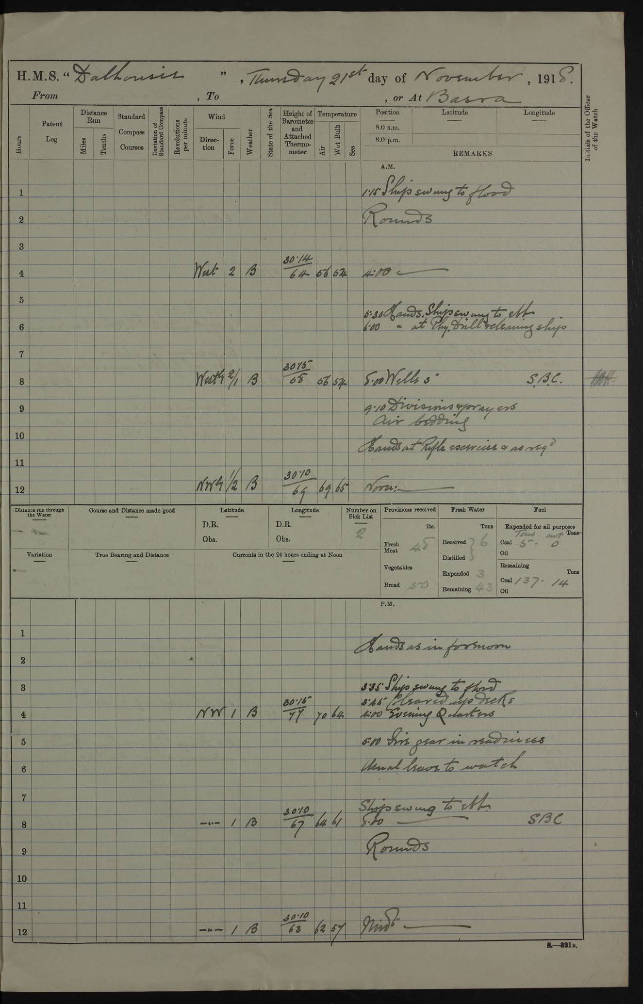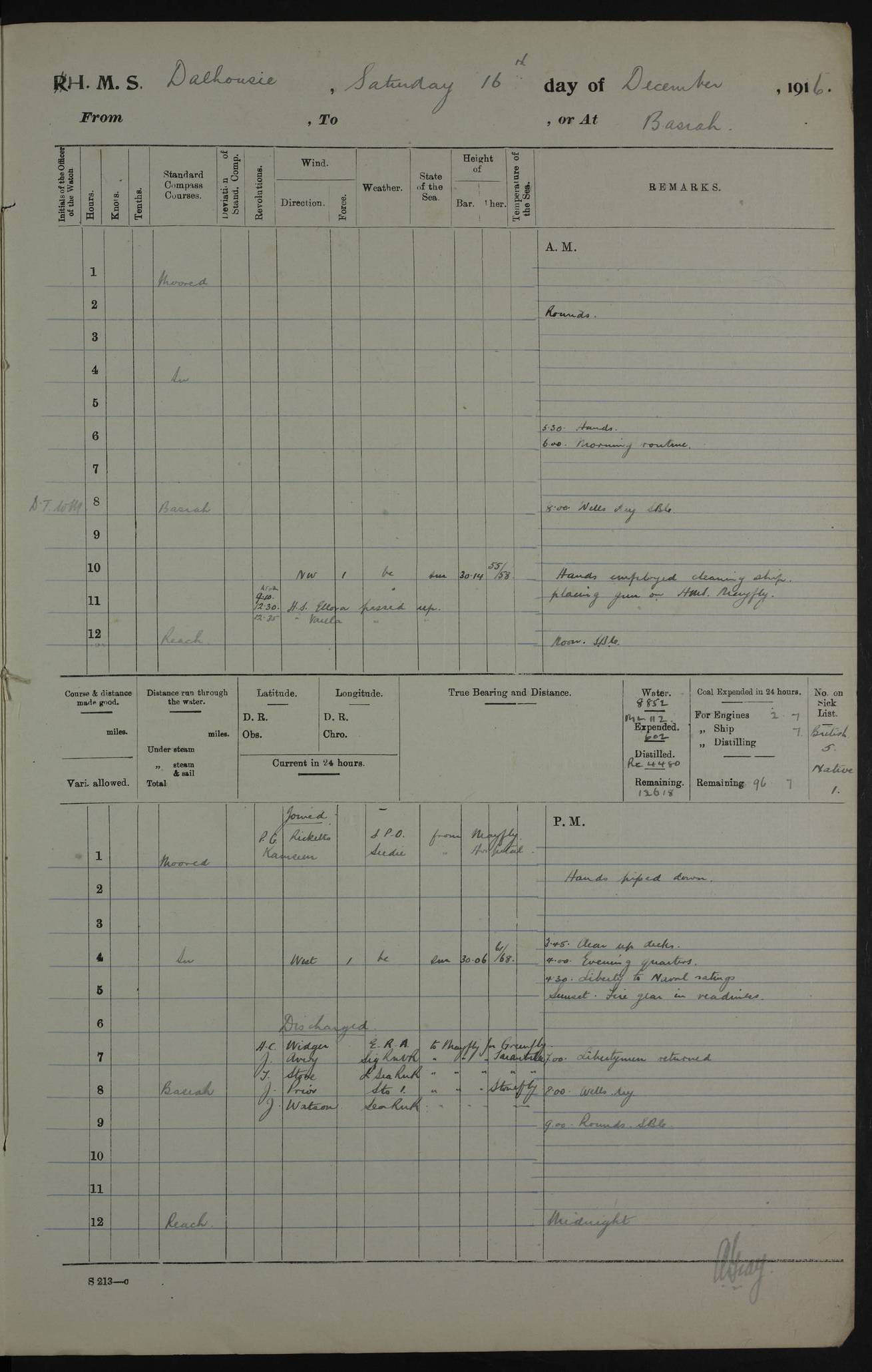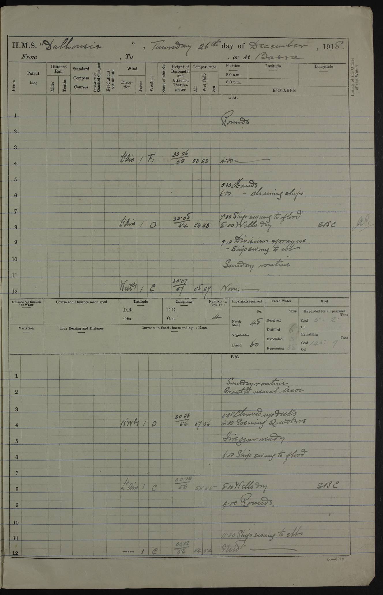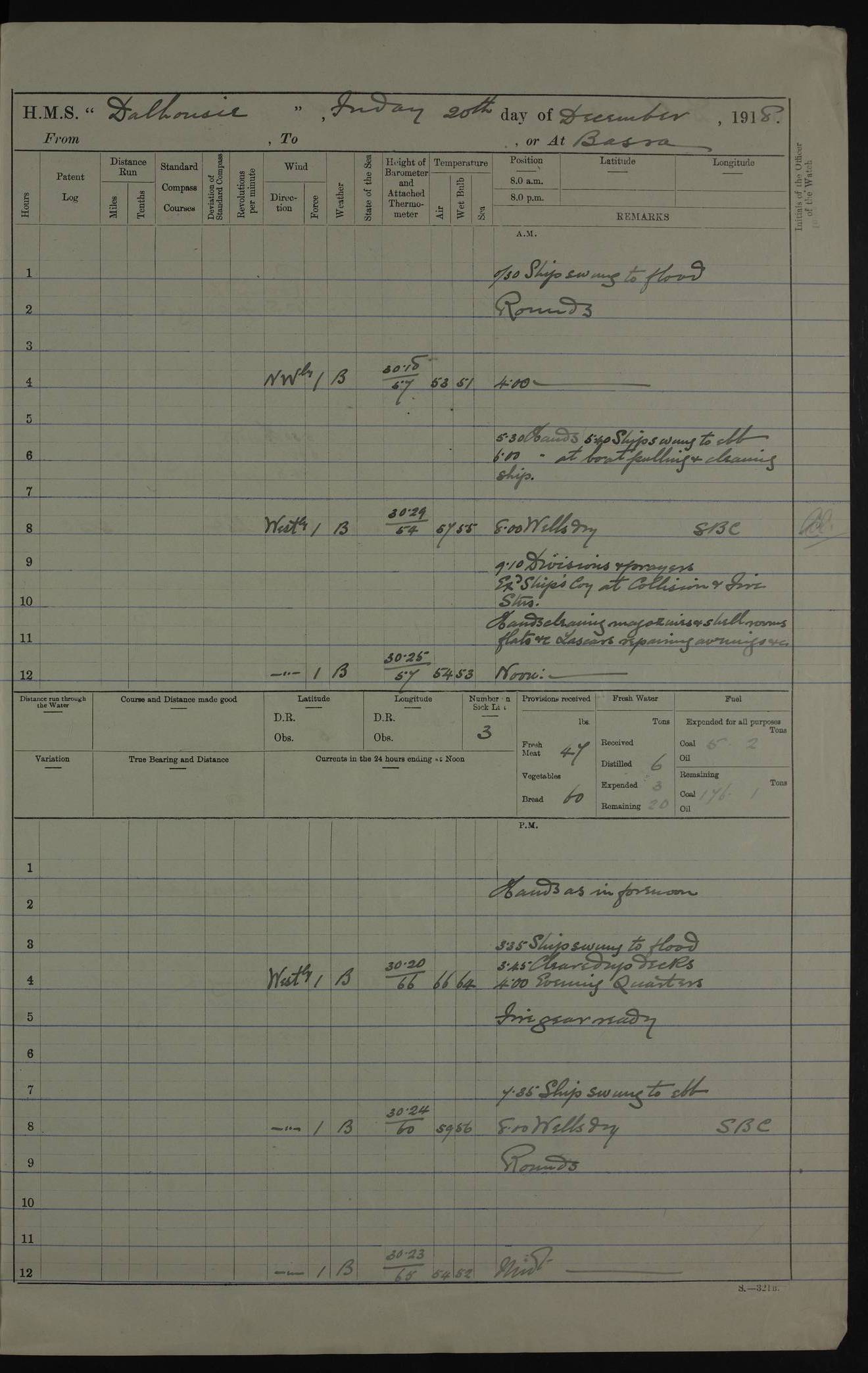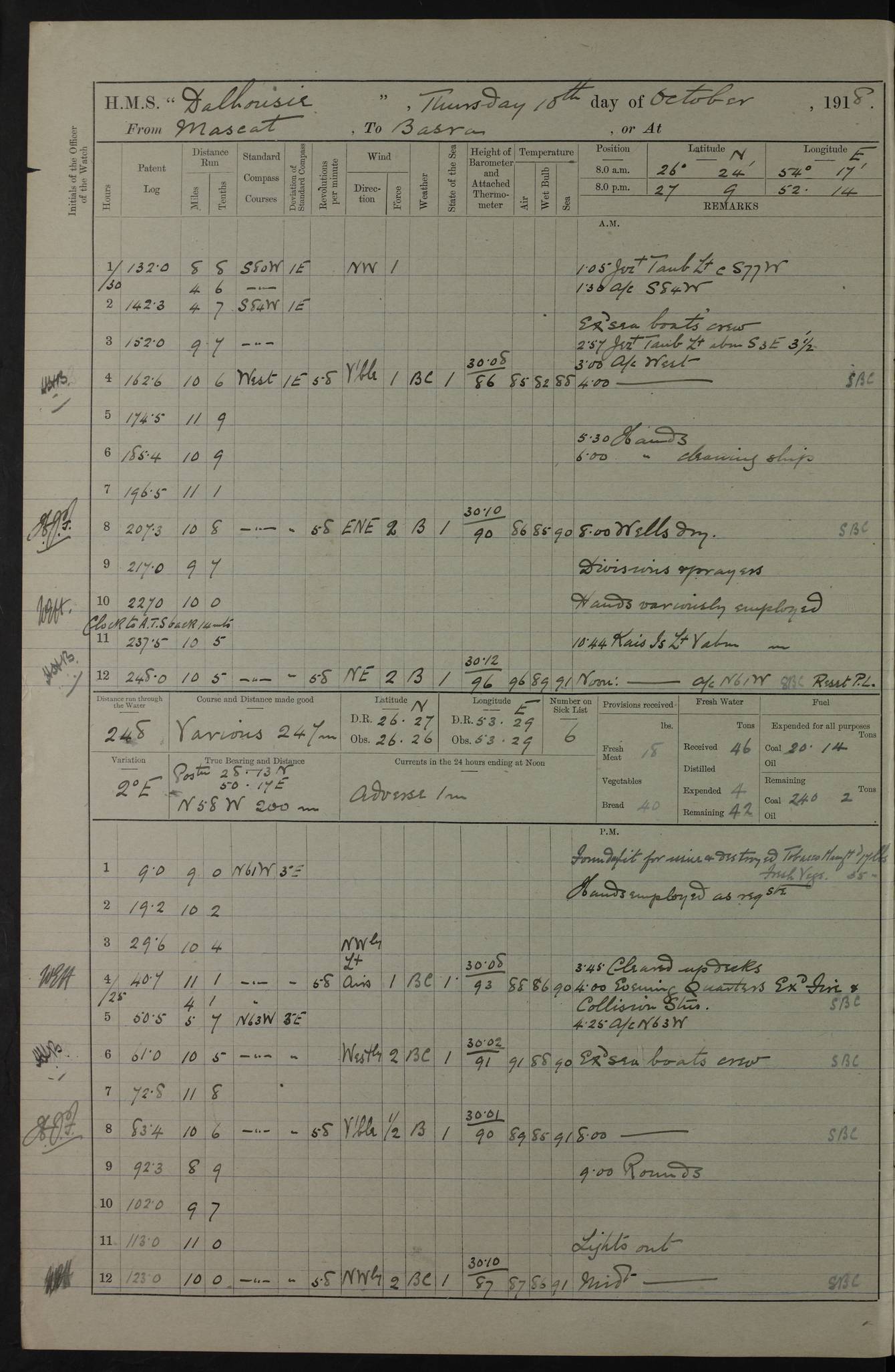 PM - Discharged To Hospital: H Widger, Engine Room Artificer - PW Harrison, Stoker Royal Navy Reserve To Motor Launch 11: J W Whitfield, Stoker 4ef4fa93e53e0a0c910056e2: (https://s3.amazonaws.com:443/oldweather/ADM53-39392/0018_0.jpg) 31 August 1916 Place: Basrah Lat 30.5269, Long 47.8407 2:00am: Rounds 5:05am: Hospital Ship SYRIA passed down 5:30am: Hands 6:00am: Morning Routine 8:00am: Wells dry – Signal Books Correct 9:30am: Divisions - Hands cleaning ship 11:00am: Drew Three Thousand Rupees from the Field treasury 12:00pm: Signal Books Correct – Issued Quinine to ship’s company 12:30pm: Piped Down 3:30pm: 4:00pm: Signal Books Correct 4:30pm: Cleared up decks 5:00pm: Evening Quarters – Leave to Watch of Naval Ratings 7:00pm: Sunset - Fire Gear in readiness 7:30pm: Liberty men returned 8:00pm: Wells dry - Signal Books Correct 9:00pm: Rounds - Signal Books Correct 11:00pm: Destroyed 19 tins Milk being unfit for use. AM – Joined From Motor Launch Depot: M. McMillan, Able Seaman From 5 Mess: T. Jackson, Petty Officer 1st From 4 Mess: T Golden, Stoker – J Tunney, Royal Navy Reserve Trawler Section From 10 Mess: J Donegan Royal Navy Reserve Trawler Section