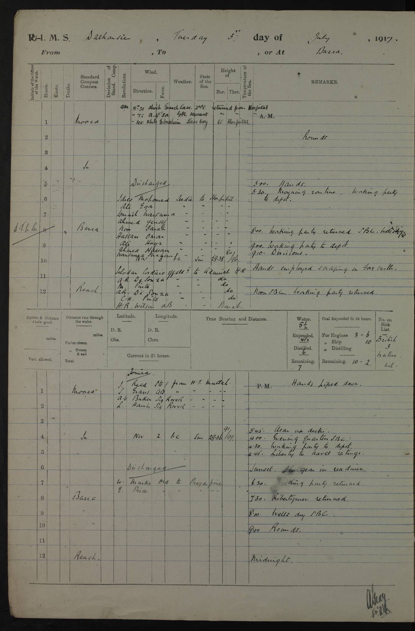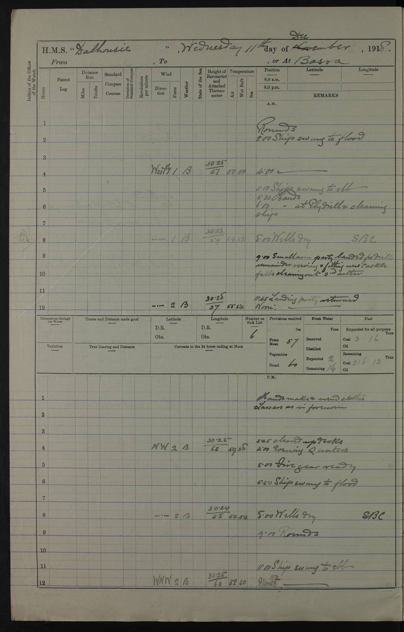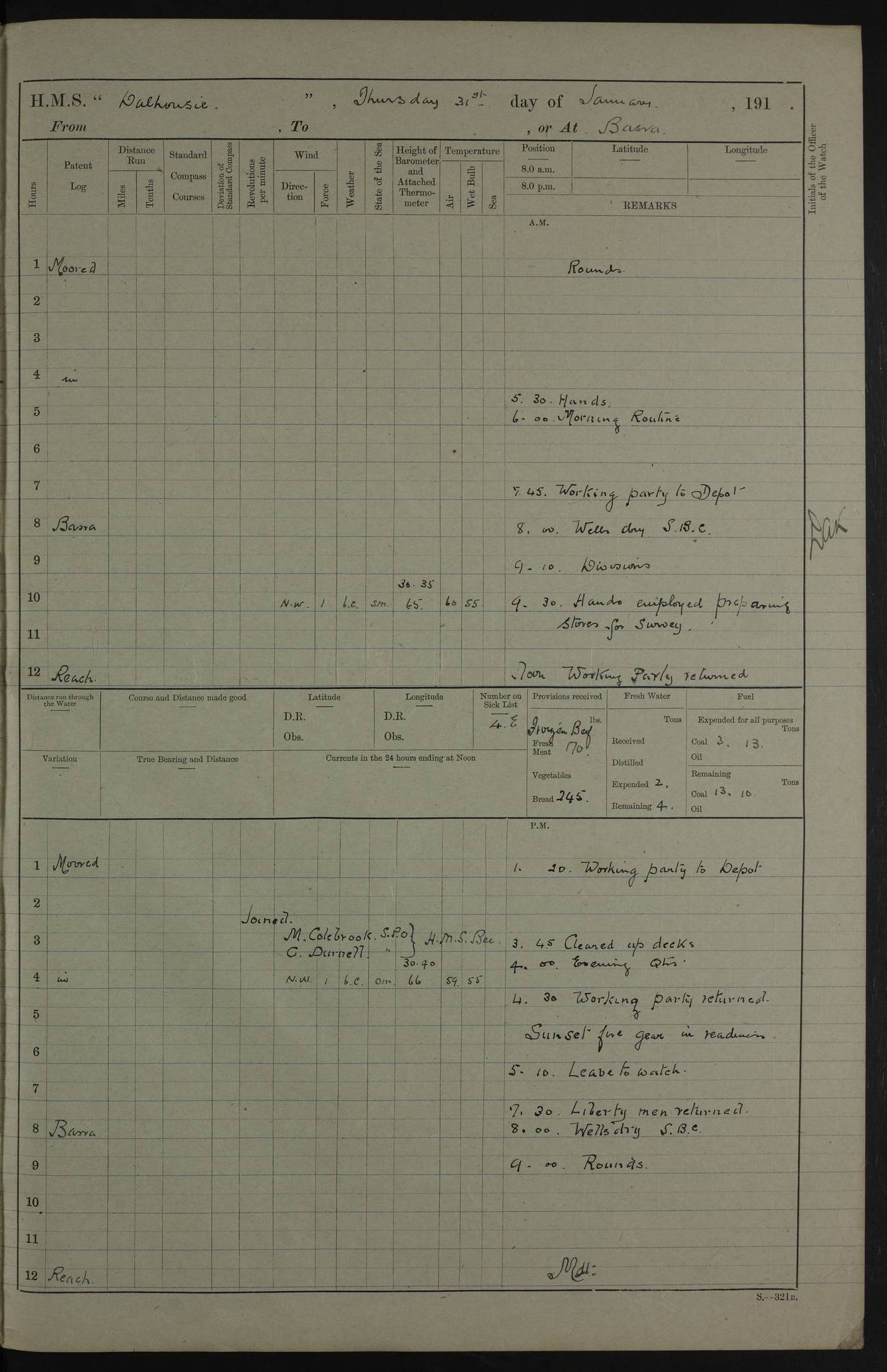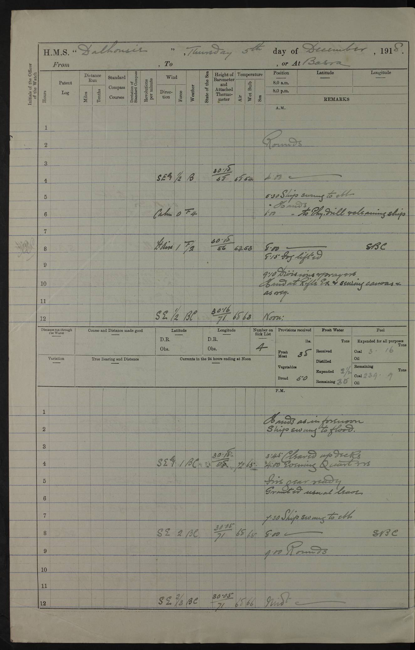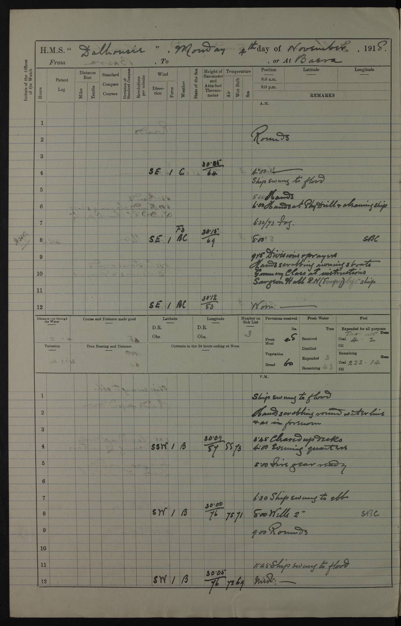 PM - Discharged To Hospital: H Widger, Engine Room Artificer - PW Harrison, Stoker Royal Navy Reserve To Motor Launch 11: J W Whitfield, Stoker 4ef4fa93e53e0a0c910056e2: (https://s3.amazonaws.com:443/oldweather/ADM53-39392/0018_0.jpg) 31 August 1916 Place: Basrah Lat 30.5269, Long 47.8407 2:00am: Rounds 5:05am: Hospital Ship SYRIA passed down 5:30am: Hands 6:00am: Morning Routine 8:00am: Wells dry – Signal Books Correct 9:30am: Divisions - Hands cleaning ship 11:00am: Drew Three Thousand Rupees from the Field treasury 12:00pm: Signal Books Correct – Issued Quinine to ship’s company 12:30pm: Piped Down 3:30pm: 4:00pm: Signal Books Correct 4:30pm: Cleared up decks 5:00pm: Evening Quarters – Leave to Watch of Naval Ratings 7:00pm: Sunset - Fire Gear in readiness 7:30pm: Liberty men returned 8:00pm: Wells dry - Signal Books Correct 9:00pm: Rounds - Signal Books Correct 11:00pm: Destroyed 19 tins Milk being unfit for use. AM – Joined From Motor Launch Depot: M. McMillan, Able Seaman From 5 Mess: T. Jackson, Petty Officer 1st From 4 Mess: T Golden, Stoker – J Tunney, Royal Navy Reserve Trawler Section From 10 Mess: J Donegan Royal Navy Reserve Trawler Section