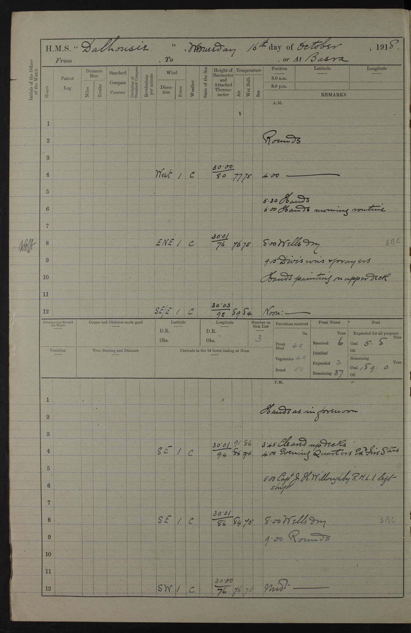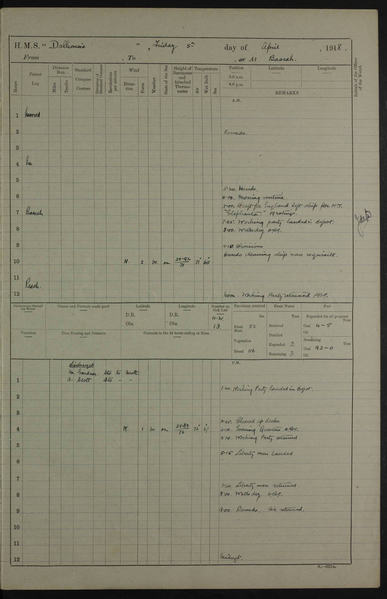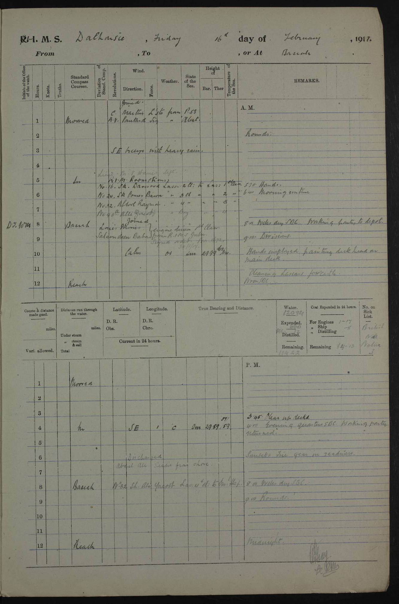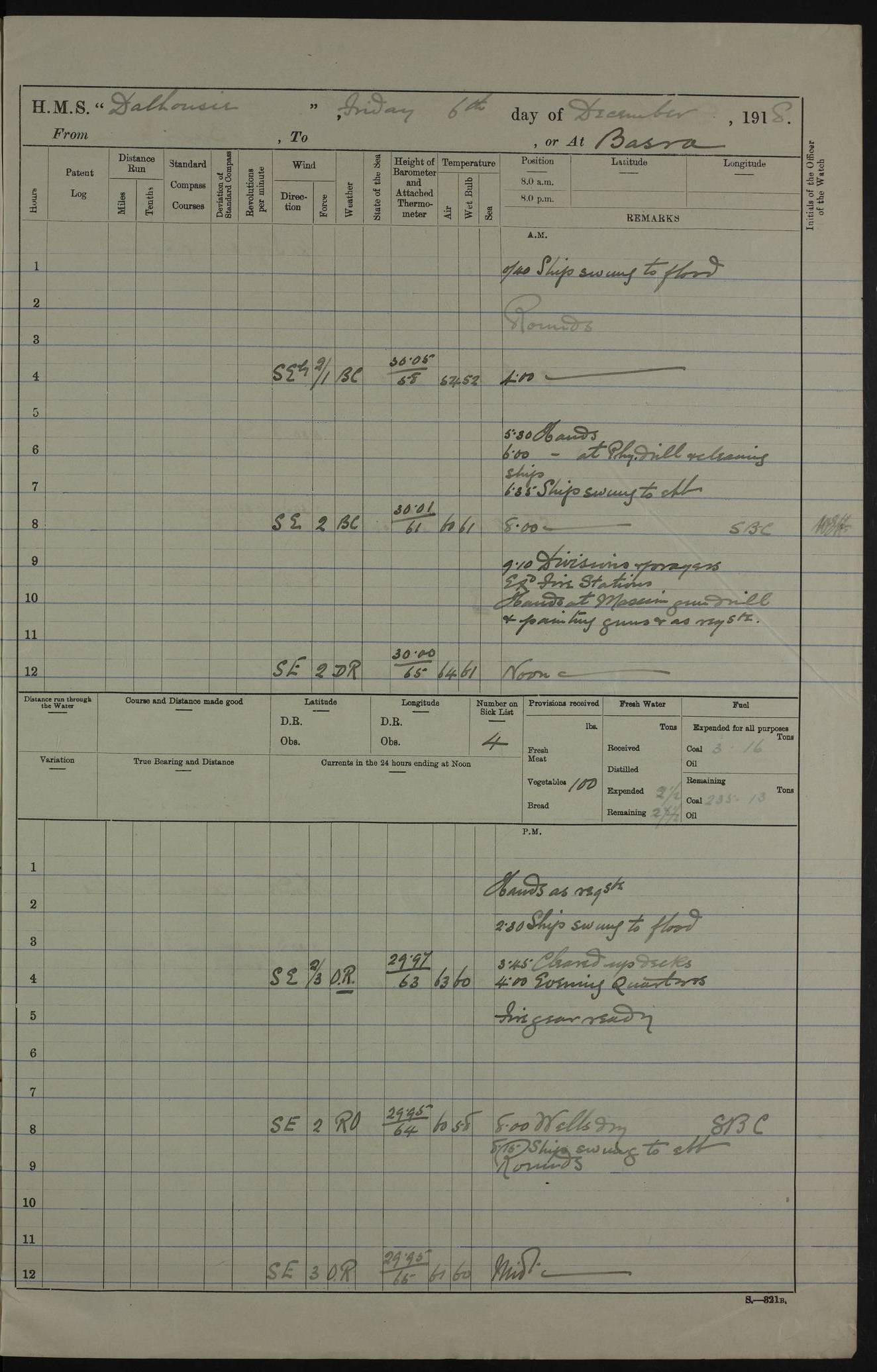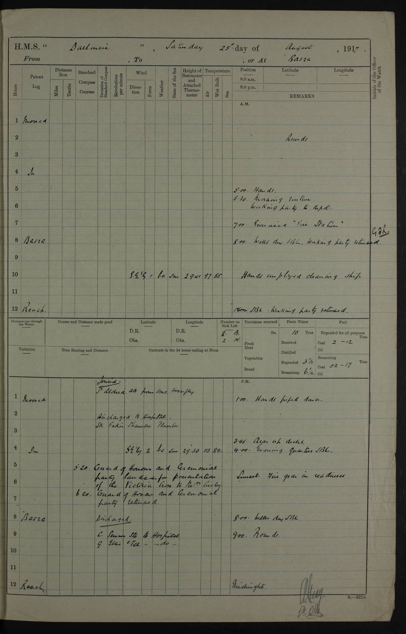 PM - Discharged To Hospital: H Widger, Engine Room Artificer - PW Harrison, Stoker Royal Navy Reserve To Motor Launch 11: J W Whitfield, Stoker 4ef4fa93e53e0a0c910056e2: (https://s3.amazonaws.com:443/oldweather/ADM53-39392/0018_0.jpg) 31 August 1916 Place: Basrah Lat 30.5269, Long 47.8407 2:00am: Rounds 5:05am: Hospital Ship SYRIA passed down 5:30am: Hands 6:00am: Morning Routine 8:00am: Wells dry – Signal Books Correct 9:30am: Divisions - Hands cleaning ship 11:00am: Drew Three Thousand Rupees from the Field treasury 12:00pm: Signal Books Correct – Issued Quinine to ship’s company 12:30pm: Piped Down 3:30pm: 4:00pm: Signal Books Correct 4:30pm: Cleared up decks 5:00pm: Evening Quarters – Leave to Watch of Naval Ratings 7:00pm: Sunset - Fire Gear in readiness 7:30pm: Liberty men returned 8:00pm: Wells dry - Signal Books Correct 9:00pm: Rounds - Signal Books Correct 11:00pm: Destroyed 19 tins Milk being unfit for use. AM – Joined From Motor Launch Depot: M. McMillan, Able Seaman From 5 Mess: T. Jackson, Petty Officer 1st From 4 Mess: T Golden, Stoker – J Tunney, Royal Navy Reserve Trawler Section From 10 Mess: J Donegan Royal Navy Reserve Trawler Section