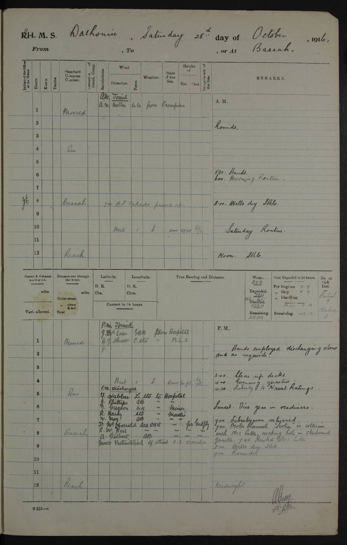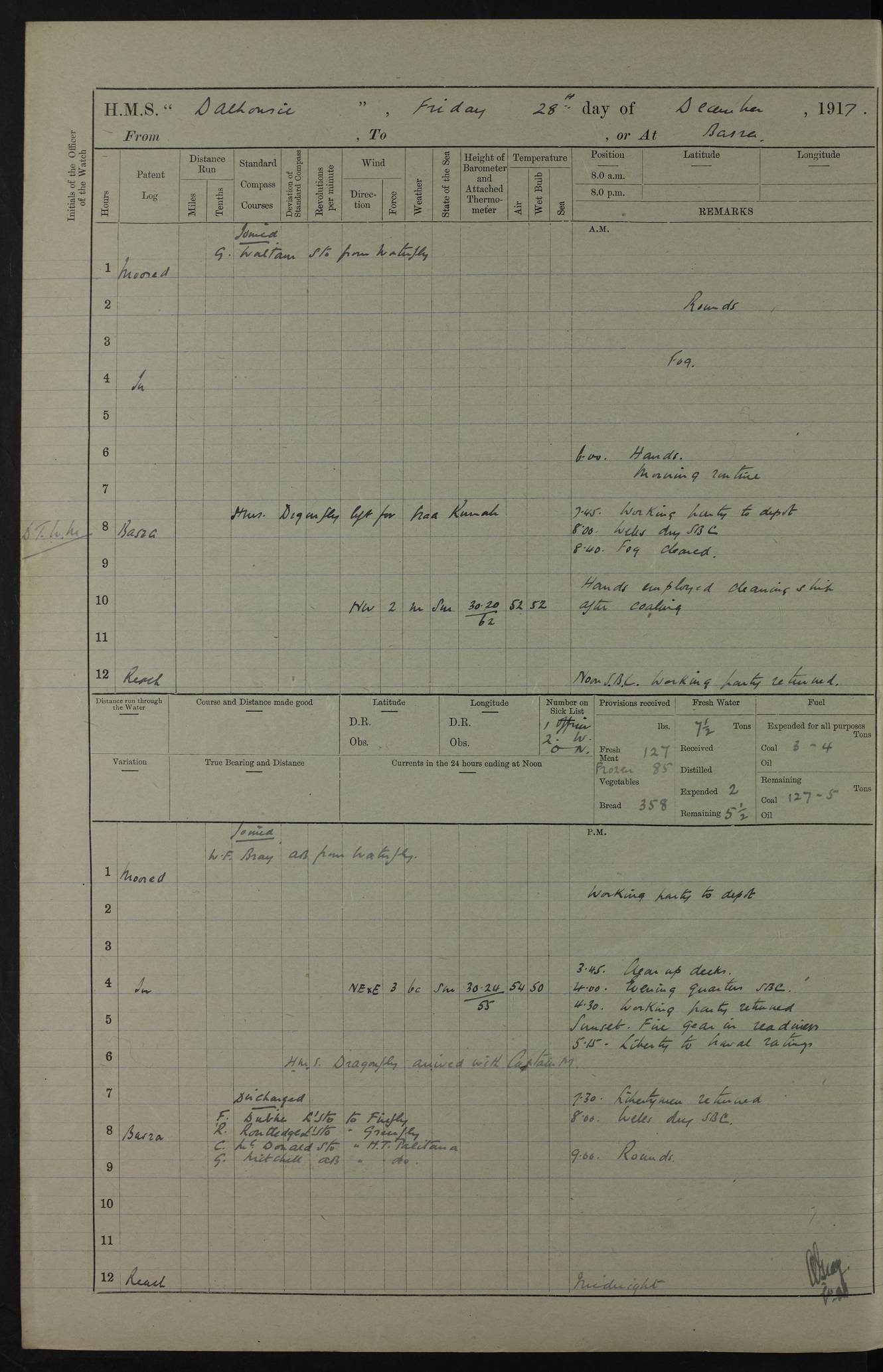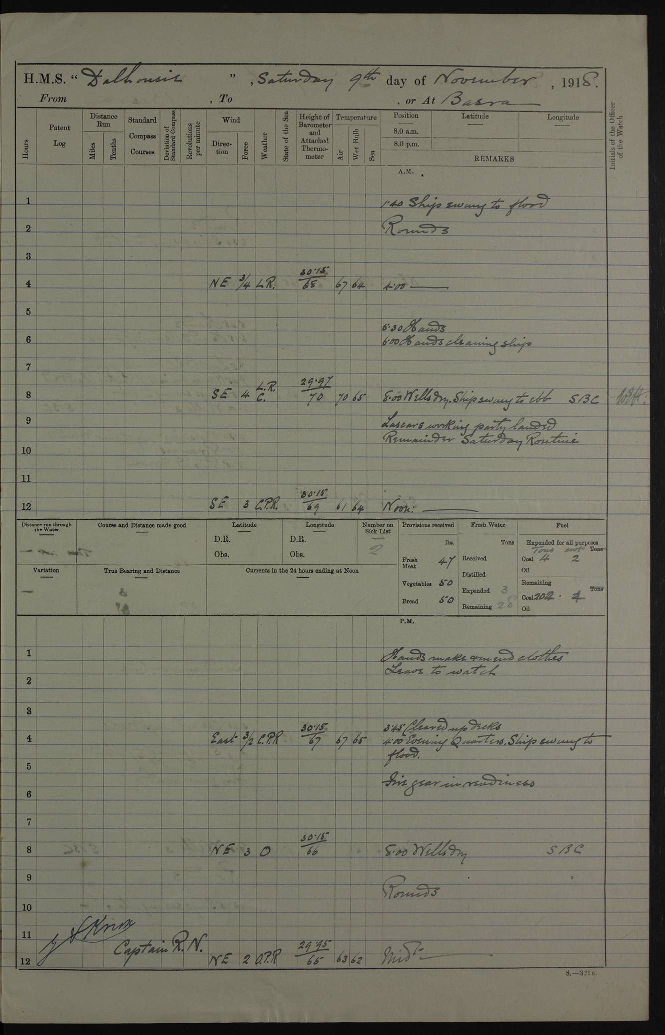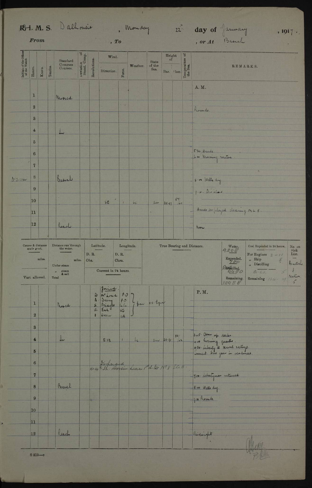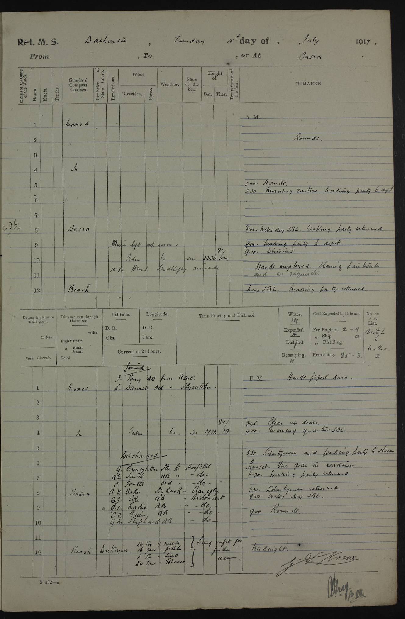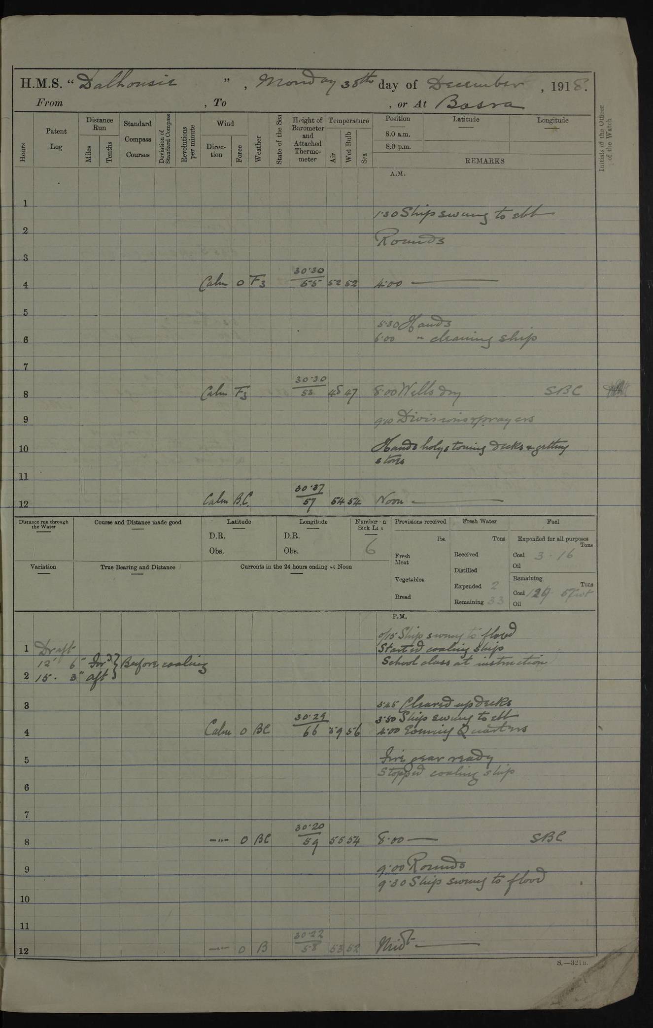 PM - Discharged To Hospital: H Widger, Engine Room Artificer - PW Harrison, Stoker Royal Navy Reserve To Motor Launch 11: J W Whitfield, Stoker 4ef4fa93e53e0a0c910056e2: (https://s3.amazonaws.com:443/oldweather/ADM53-39392/0018_0.jpg) 31 August 1916 Place: Basrah Lat 30.5269, Long 47.8407 2:00am: Rounds 5:05am: Hospital Ship SYRIA passed down 5:30am: Hands 6:00am: Morning Routine 8:00am: Wells dry – Signal Books Correct 9:30am: Divisions - Hands cleaning ship 11:00am: Drew Three Thousand Rupees from the Field treasury 12:00pm: Signal Books Correct – Issued Quinine to ship’s company 12:30pm: Piped Down 3:30pm: 4:00pm: Signal Books Correct 4:30pm: Cleared up decks 5:00pm: Evening Quarters – Leave to Watch of Naval Ratings 7:00pm: Sunset - Fire Gear in readiness 7:30pm: Liberty men returned 8:00pm: Wells dry - Signal Books Correct 9:00pm: Rounds - Signal Books Correct 11:00pm: Destroyed 19 tins Milk being unfit for use. AM – Joined From Motor Launch Depot: M. McMillan, Able Seaman From 5 Mess: T. Jackson, Petty Officer 1st From 4 Mess: T Golden, Stoker – J Tunney, Royal Navy Reserve Trawler Section From 10 Mess: J Donegan Royal Navy Reserve Trawler Section