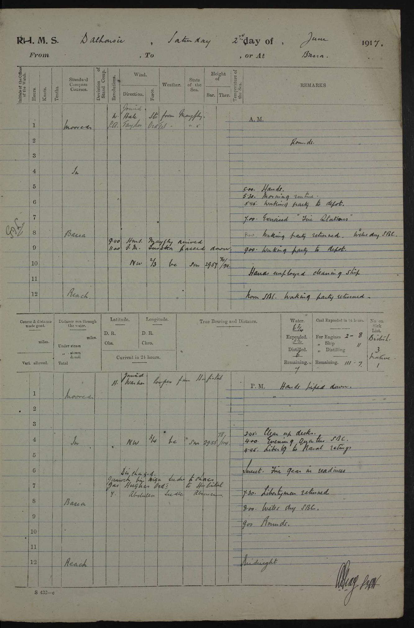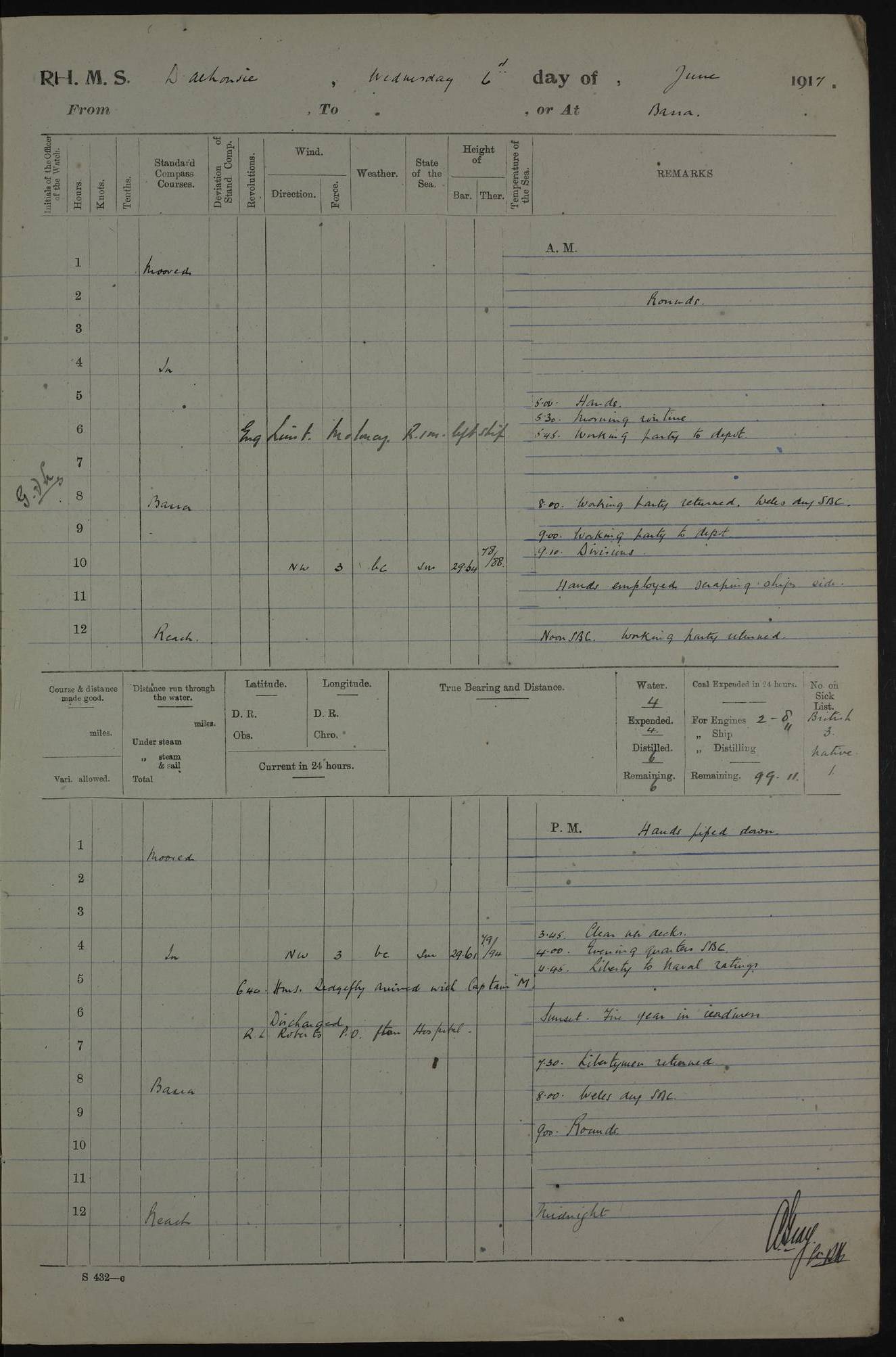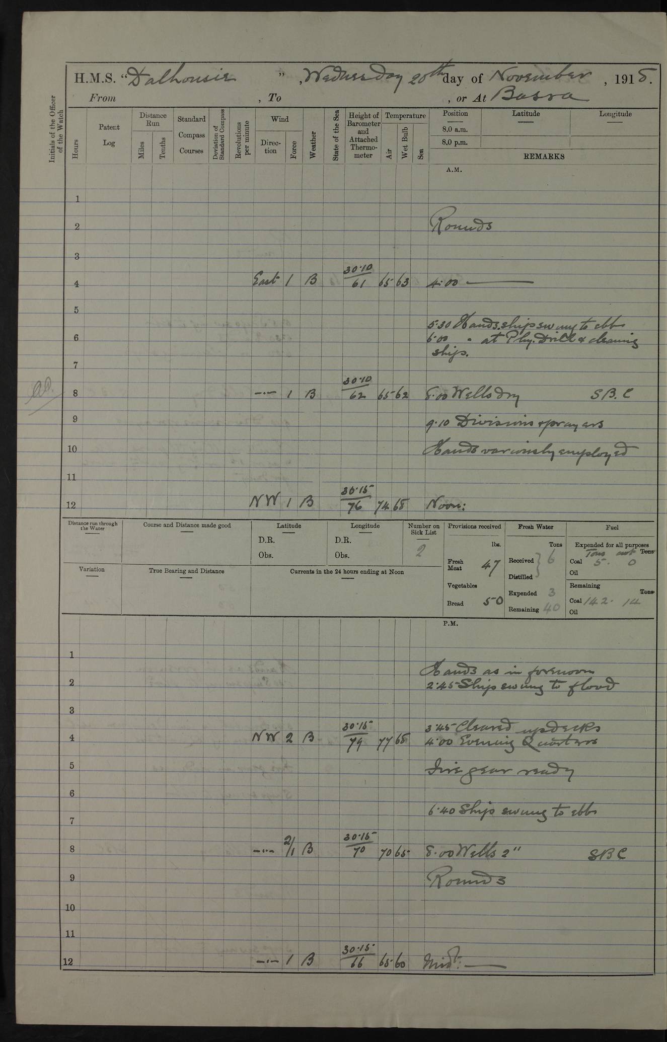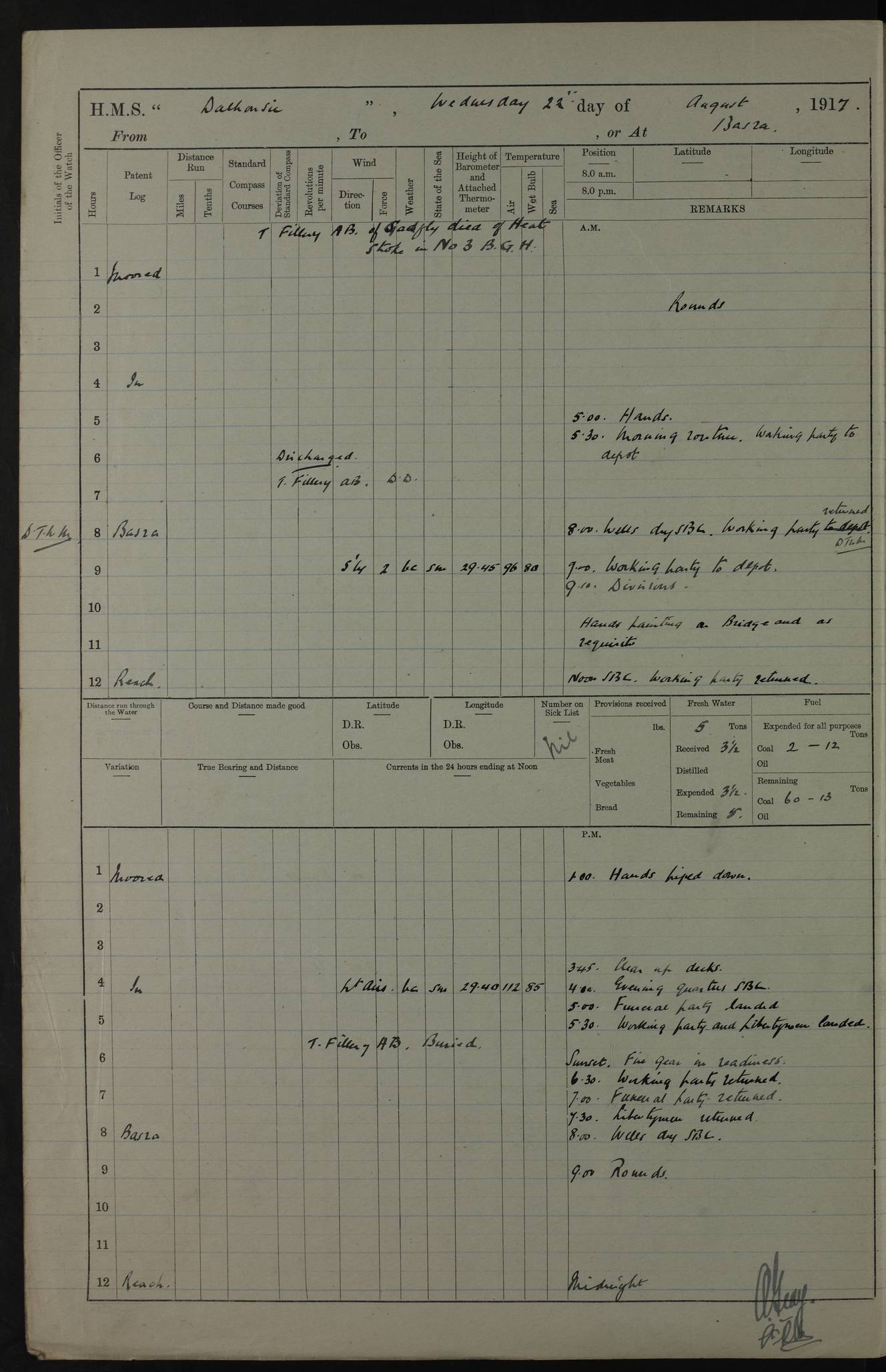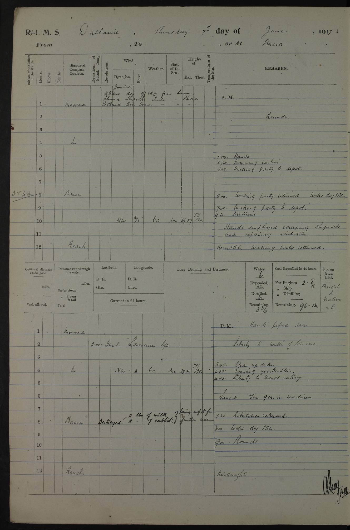 PM - Discharged To Hospital: H Widger, Engine Room Artificer - PW Harrison, Stoker Royal Navy Reserve To Motor Launch 11: J W Whitfield, Stoker 4ef4fa93e53e0a0c910056e2: (https://s3.amazonaws.com:443/oldweather/ADM53-39392/0018_0.jpg) 31 August 1916 Place: Basrah Lat 30.5269, Long 47.8407 2:00am: Rounds 5:05am: Hospital Ship SYRIA passed down 5:30am: Hands 6:00am: Morning Routine 8:00am: Wells dry – Signal Books Correct 9:30am: Divisions - Hands cleaning ship 11:00am: Drew Three Thousand Rupees from the Field treasury 12:00pm: Signal Books Correct – Issued Quinine to ship’s company 12:30pm: Piped Down 3:30pm: 4:00pm: Signal Books Correct 4:30pm: Cleared up decks 5:00pm: Evening Quarters – Leave to Watch of Naval Ratings 7:00pm: Sunset - Fire Gear in readiness 7:30pm: Liberty men returned 8:00pm: Wells dry - Signal Books Correct 9:00pm: Rounds - Signal Books Correct 11:00pm: Destroyed 19 tins Milk being unfit for use. AM – Joined From Motor Launch Depot: M. McMillan, Able Seaman From 5 Mess: T. Jackson, Petty Officer 1st From 4 Mess: T Golden, Stoker – J Tunney, Royal Navy Reserve Trawler Section From 10 Mess: J Donegan Royal Navy Reserve Trawler Section