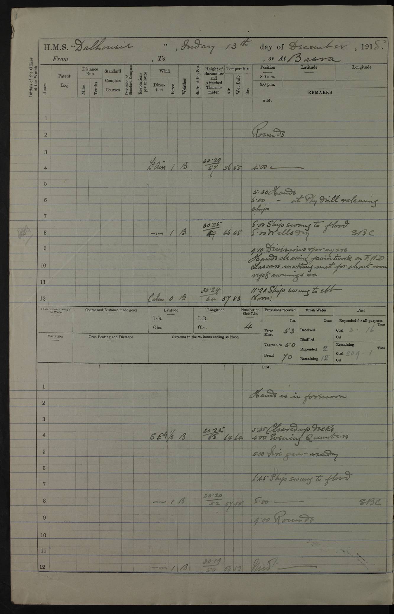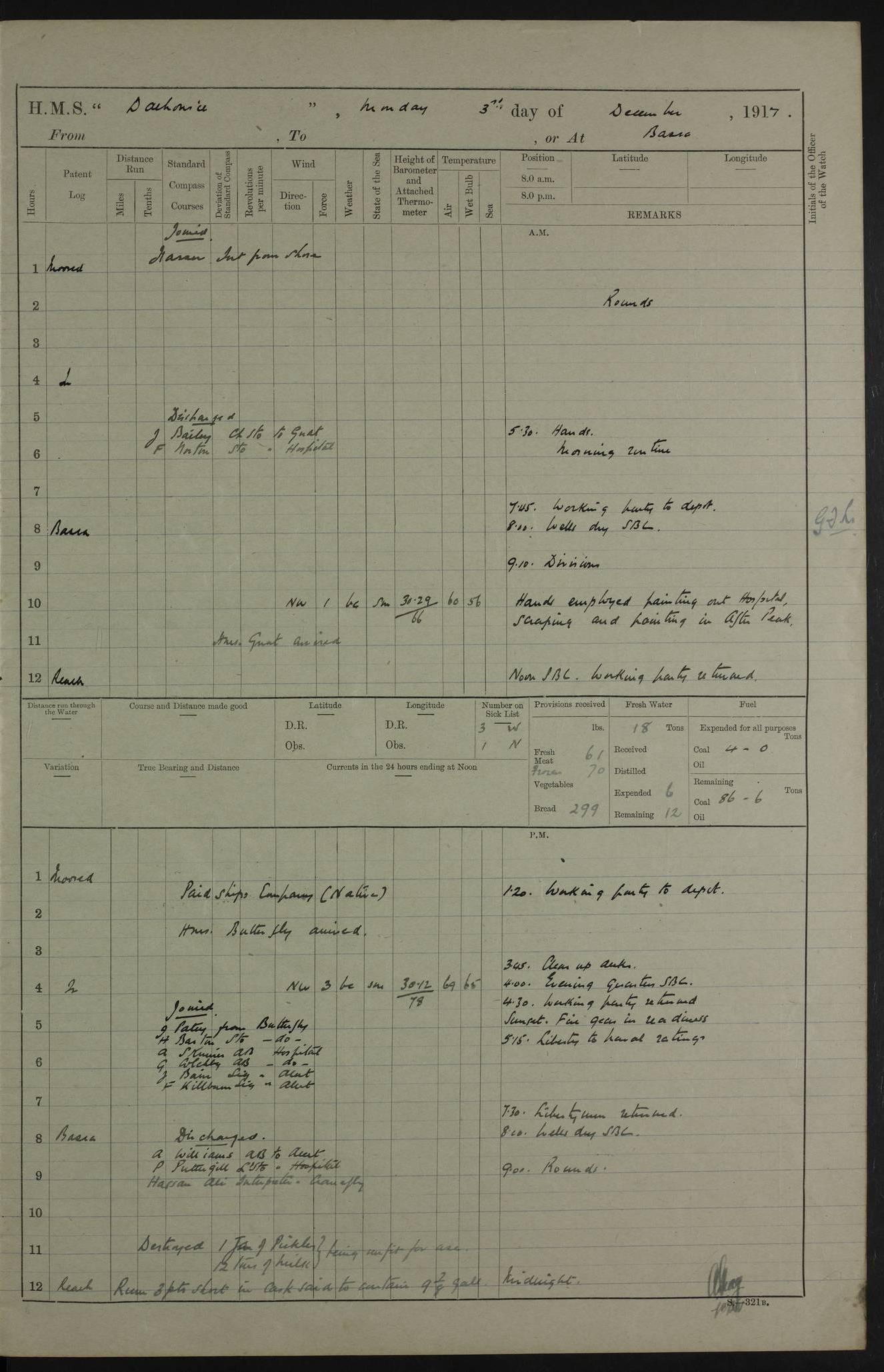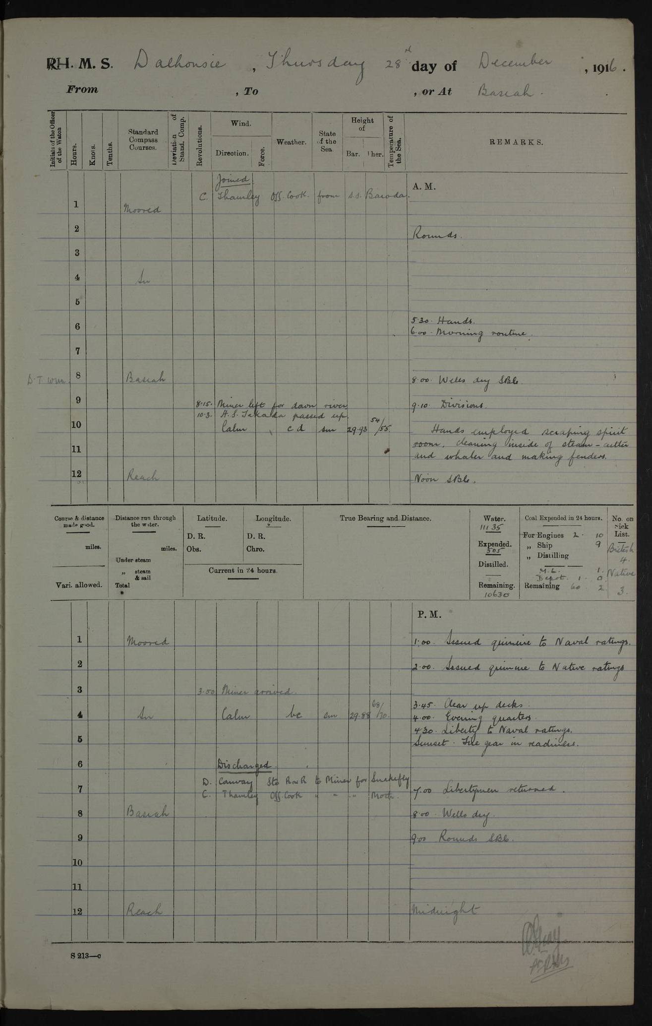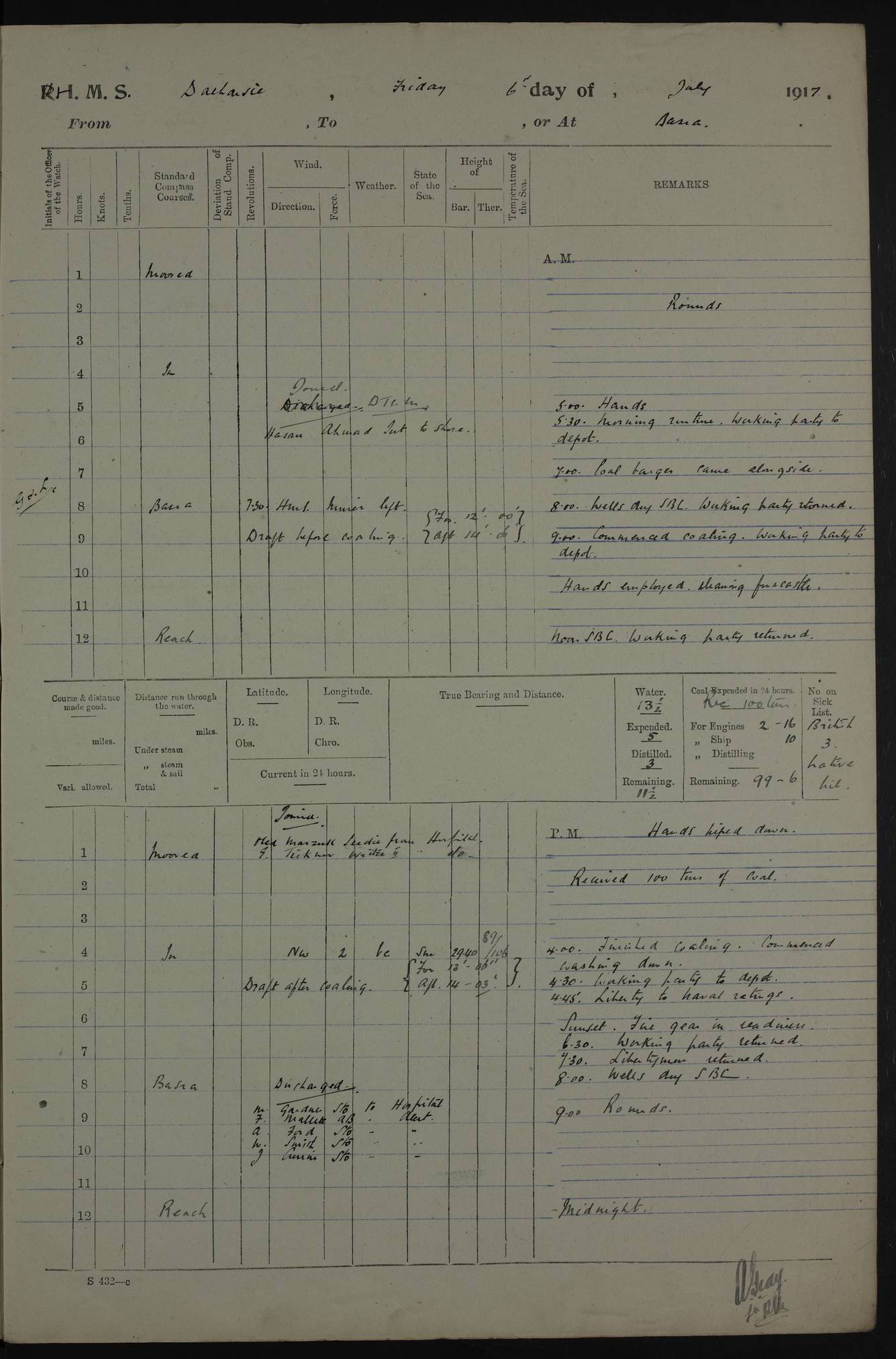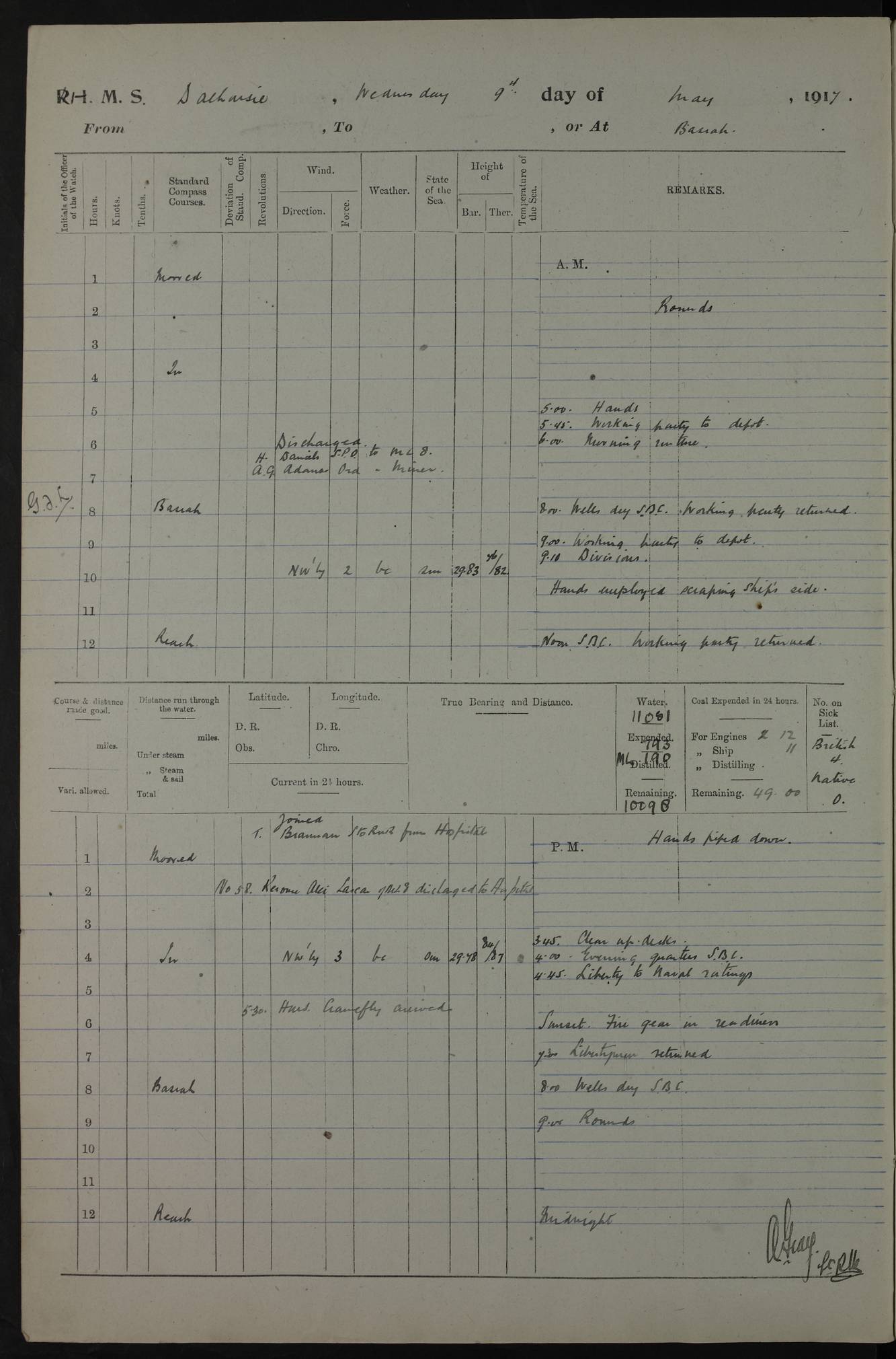 PM - Discharged To Hospital: H Widger, Engine Room Artificer - PW Harrison, Stoker Royal Navy Reserve To Motor Launch 11: J W Whitfield, Stoker 4ef4fa93e53e0a0c910056e2: (https://s3.amazonaws.com:443/oldweather/ADM53-39392/0018_0.jpg) 31 August 1916 Place: Basrah Lat 30.5269, Long 47.8407 2:00am: Rounds 5:05am: Hospital Ship SYRIA passed down 5:30am: Hands 6:00am: Morning Routine 8:00am: Wells dry – Signal Books Correct 9:30am: Divisions - Hands cleaning ship 11:00am: Drew Three Thousand Rupees from the Field treasury 12:00pm: Signal Books Correct – Issued Quinine to ship’s company 12:30pm: Piped Down 3:30pm: 4:00pm: Signal Books Correct 4:30pm: Cleared up decks 5:00pm: Evening Quarters – Leave to Watch of Naval Ratings 7:00pm: Sunset - Fire Gear in readiness 7:30pm: Liberty men returned 8:00pm: Wells dry - Signal Books Correct 9:00pm: Rounds - Signal Books Correct 11:00pm: Destroyed 19 tins Milk being unfit for use. AM – Joined From Motor Launch Depot: M. McMillan, Able Seaman From 5 Mess: T. Jackson, Petty Officer 1st From 4 Mess: T Golden, Stoker – J Tunney, Royal Navy Reserve Trawler Section From 10 Mess: J Donegan Royal Navy Reserve Trawler Section