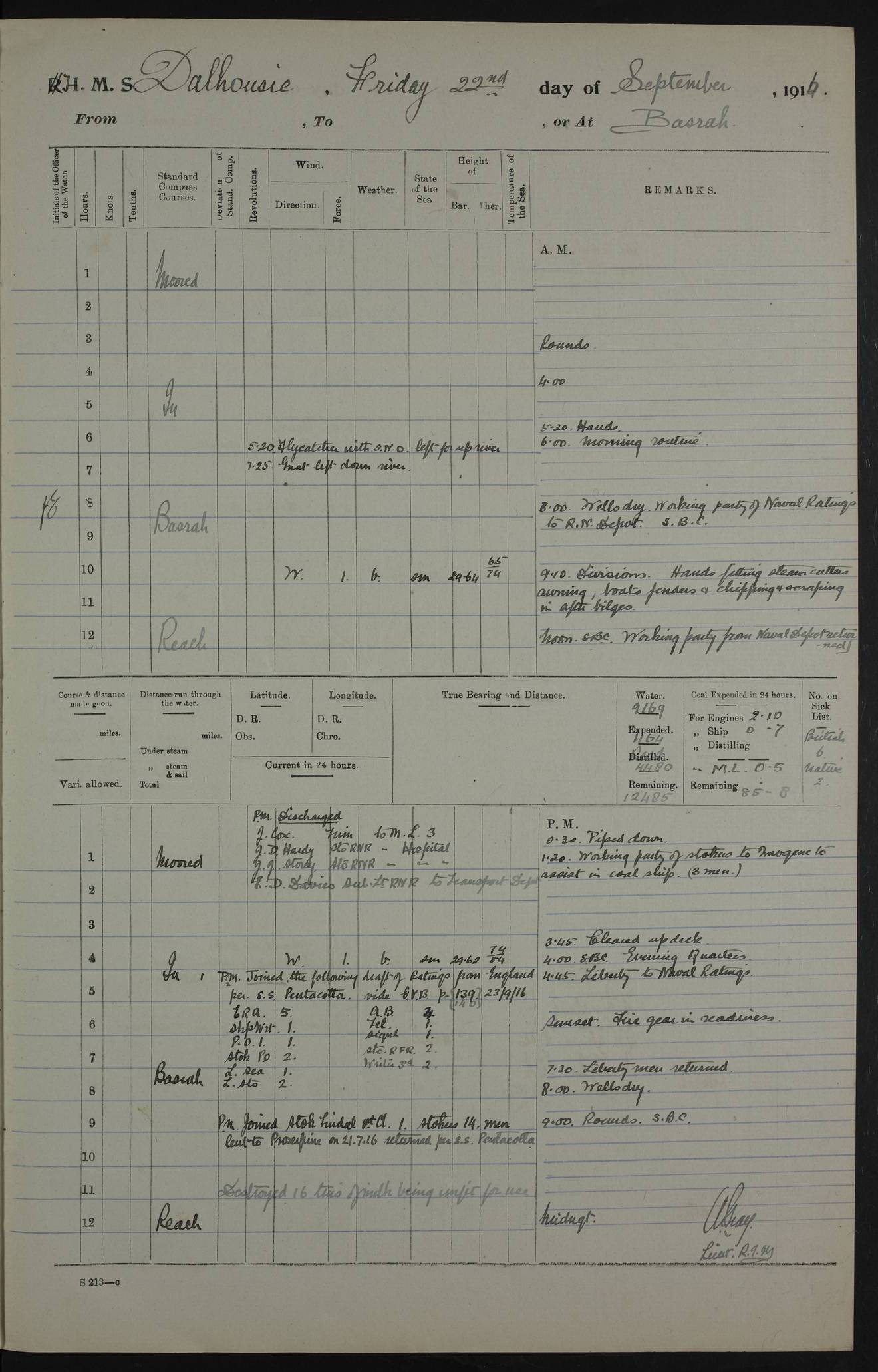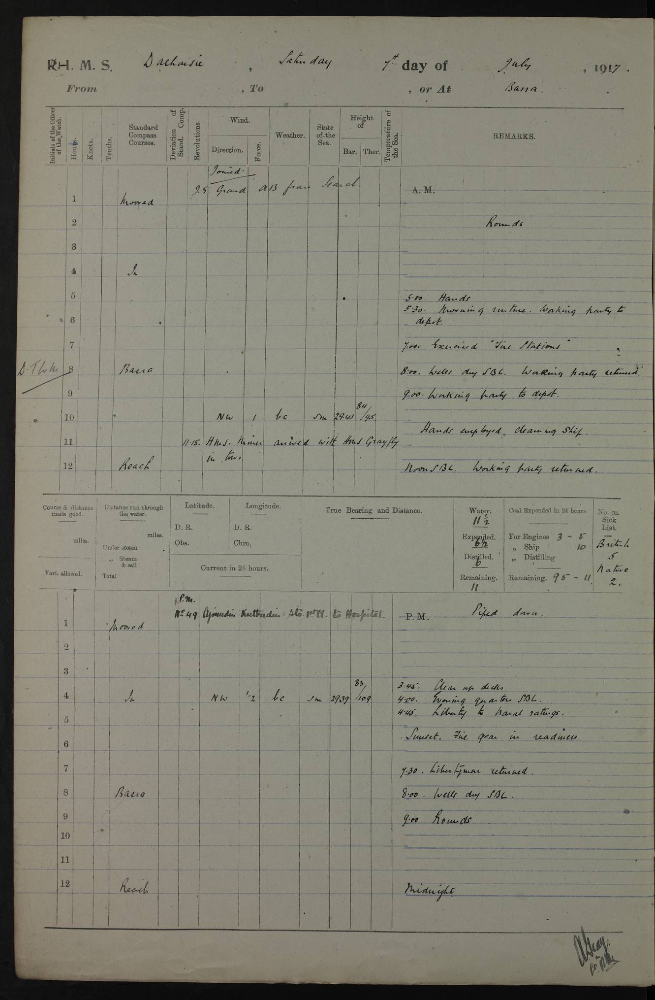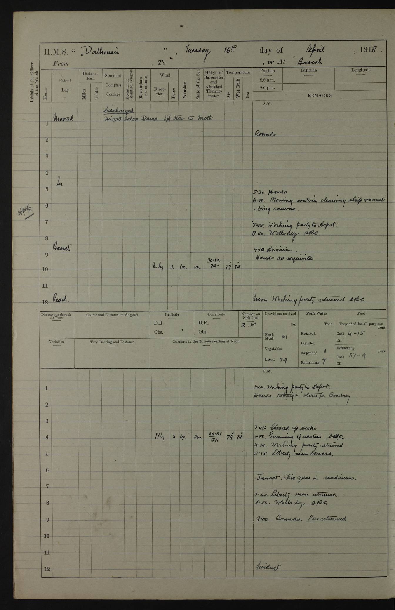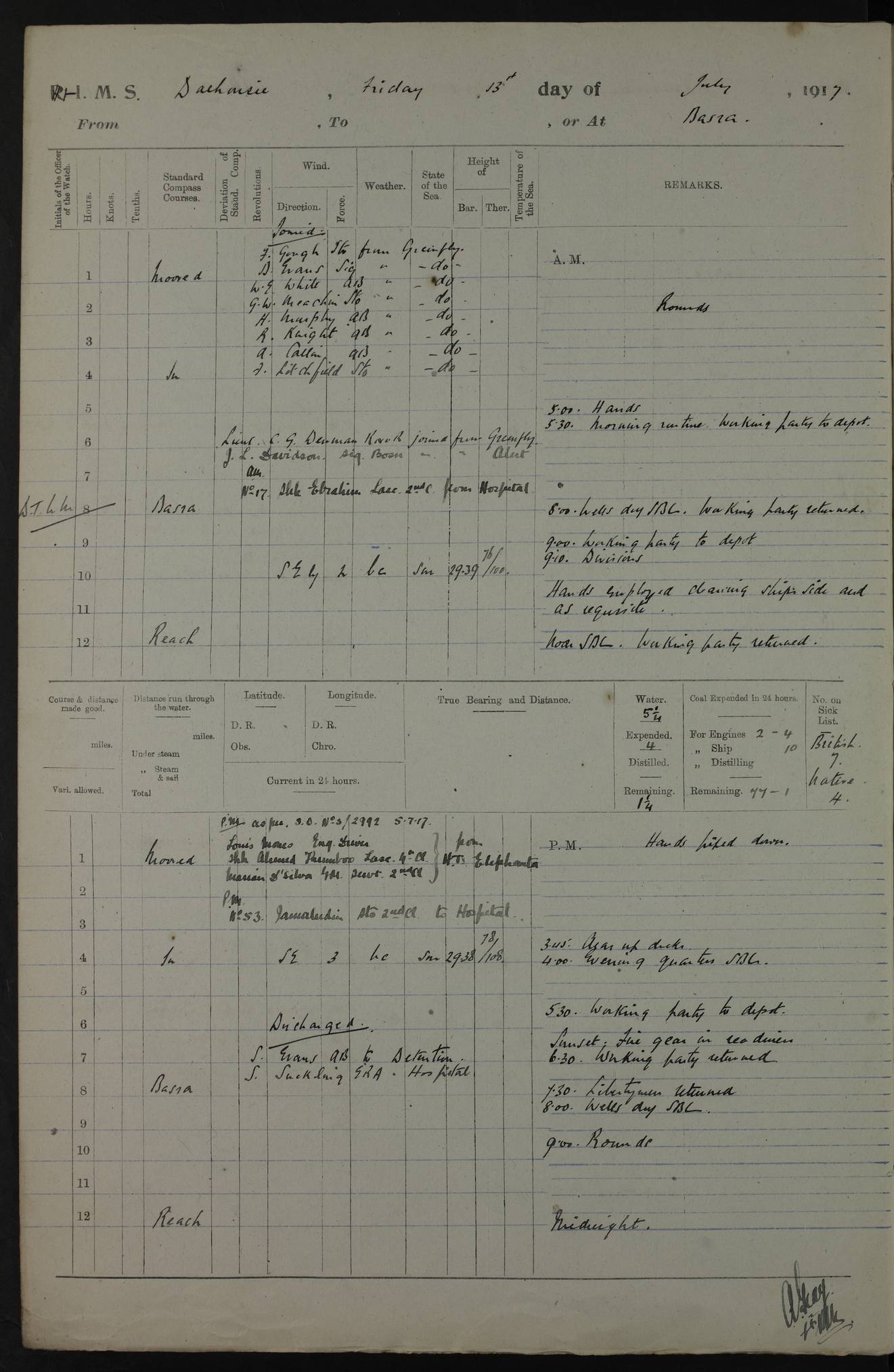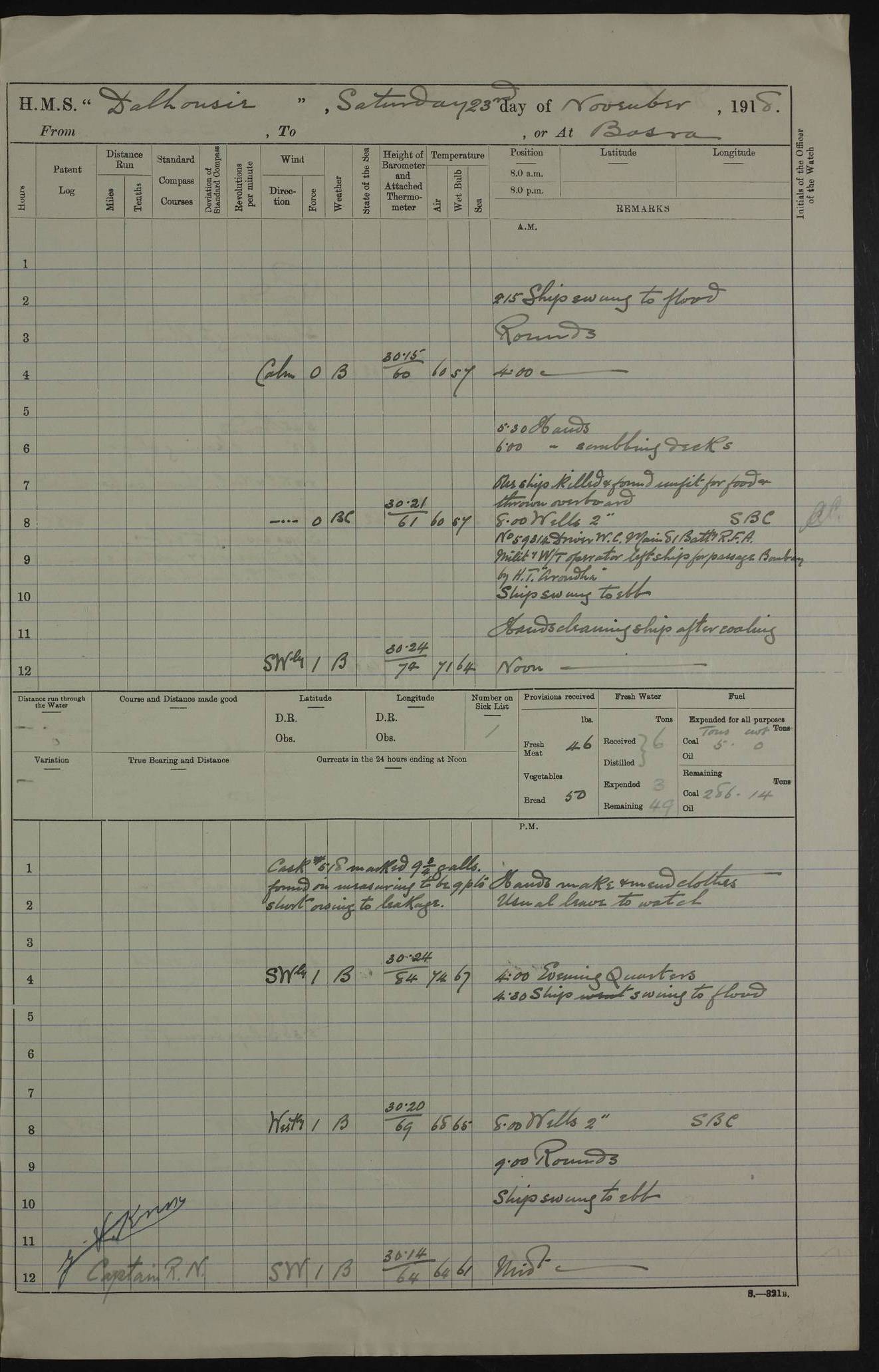 PM - Discharged To Hospital: H Widger, Engine Room Artificer - PW Harrison, Stoker Royal Navy Reserve To Motor Launch 11: J W Whitfield, Stoker 4ef4fa93e53e0a0c910056e2: (https://s3.amazonaws.com:443/oldweather/ADM53-39392/0018_0.jpg) 31 August 1916 Place: Basrah Lat 30.5269, Long 47.8407 2:00am: Rounds 5:05am: Hospital Ship SYRIA passed down 5:30am: Hands 6:00am: Morning Routine 8:00am: Wells dry – Signal Books Correct 9:30am: Divisions - Hands cleaning ship 11:00am: Drew Three Thousand Rupees from the Field treasury 12:00pm: Signal Books Correct – Issued Quinine to ship’s company 12:30pm: Piped Down 3:30pm: 4:00pm: Signal Books Correct 4:30pm: Cleared up decks 5:00pm: Evening Quarters – Leave to Watch of Naval Ratings 7:00pm: Sunset - Fire Gear in readiness 7:30pm: Liberty men returned 8:00pm: Wells dry - Signal Books Correct 9:00pm: Rounds - Signal Books Correct 11:00pm: Destroyed 19 tins Milk being unfit for use. AM – Joined From Motor Launch Depot: M. McMillan, Able Seaman From 5 Mess: T. Jackson, Petty Officer 1st From 4 Mess: T Golden, Stoker – J Tunney, Royal Navy Reserve Trawler Section From 10 Mess: J Donegan Royal Navy Reserve Trawler Section