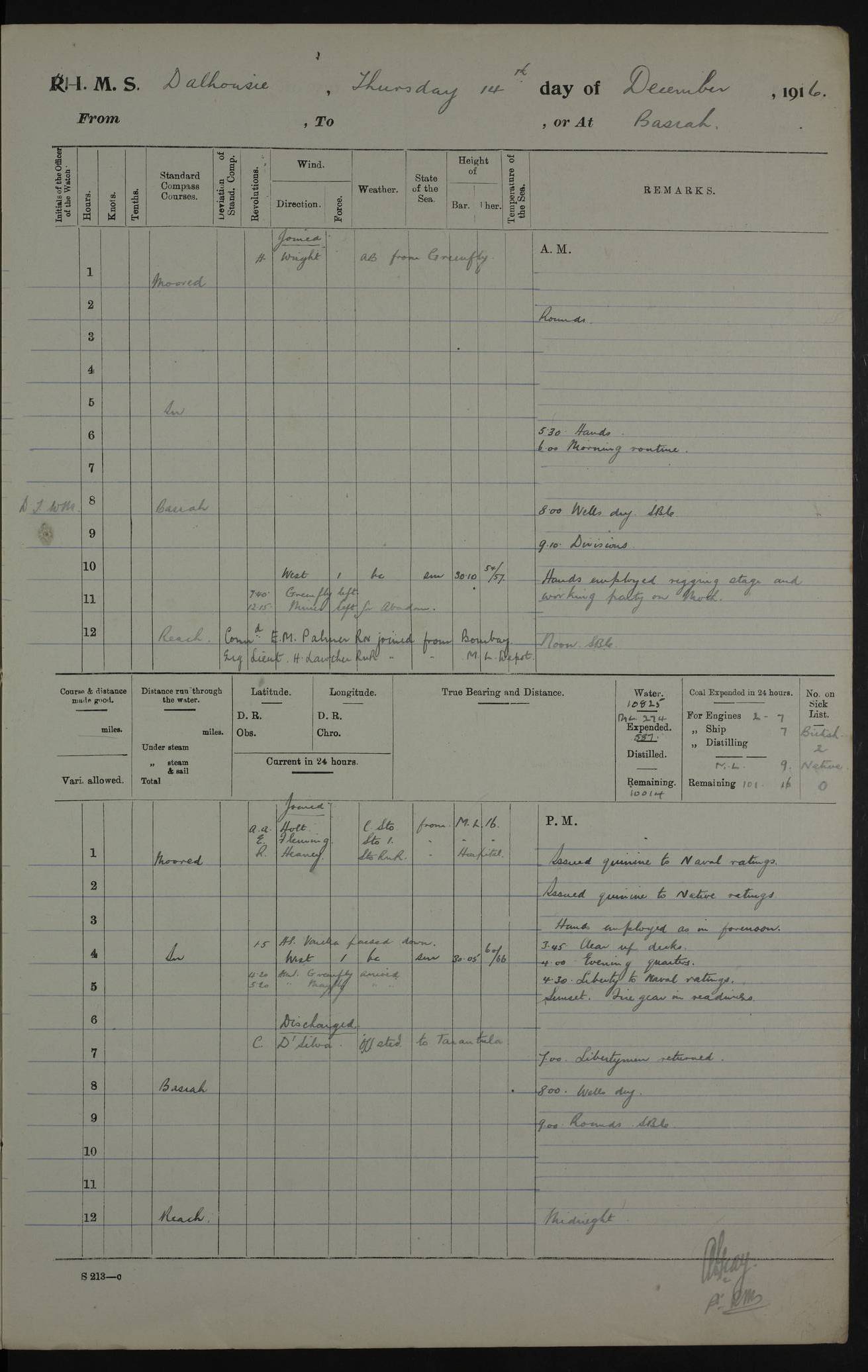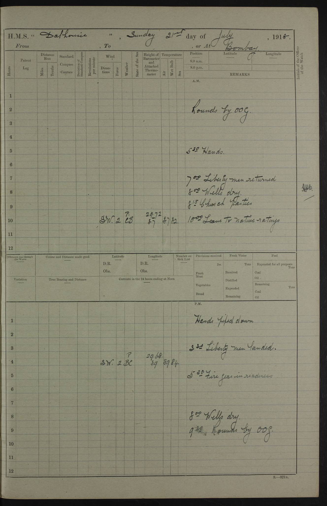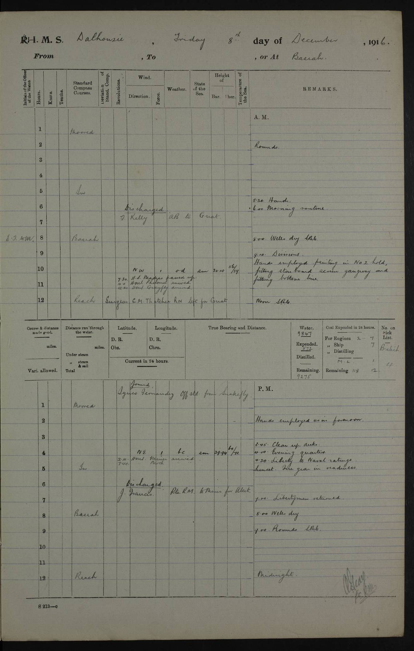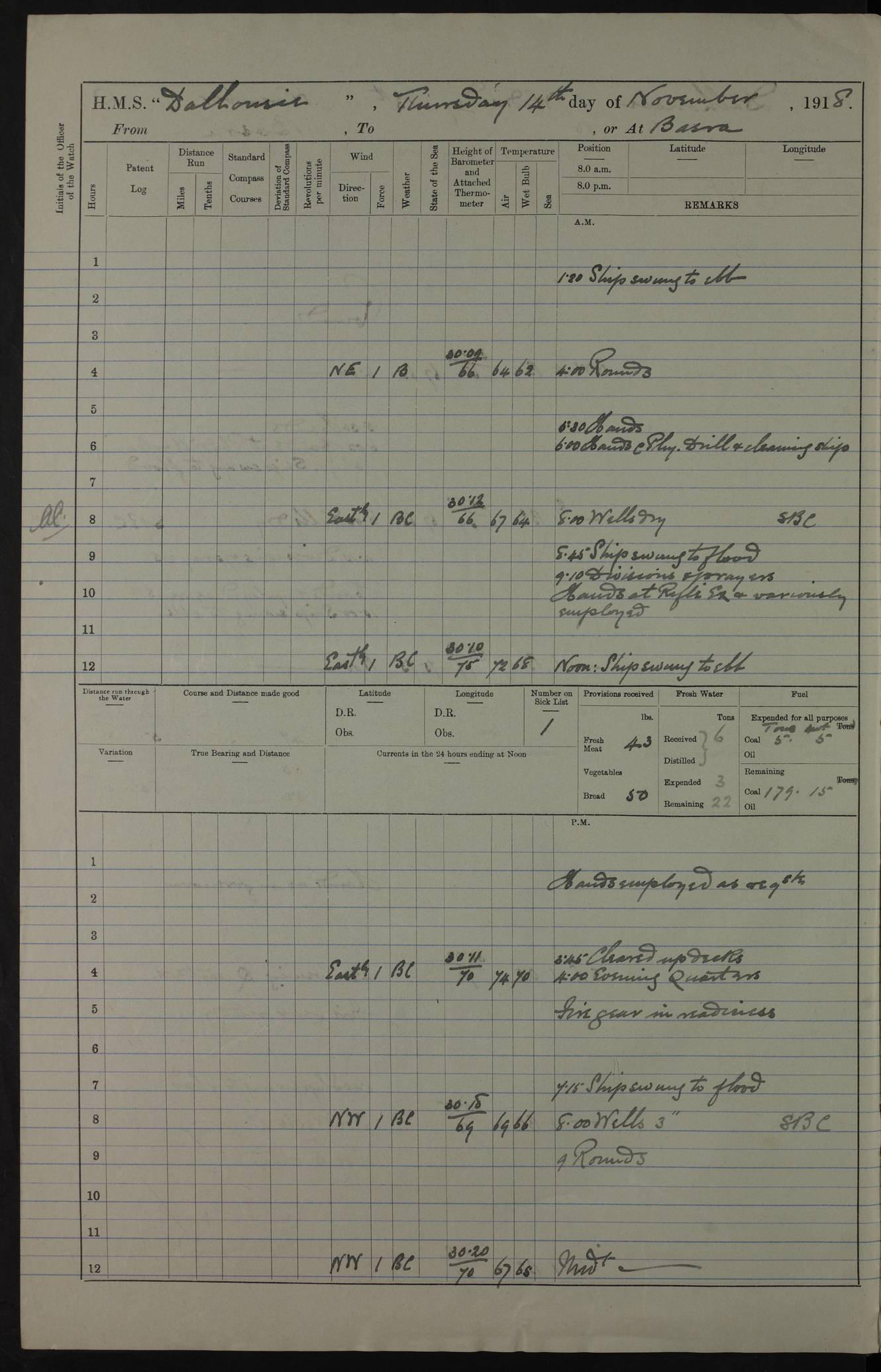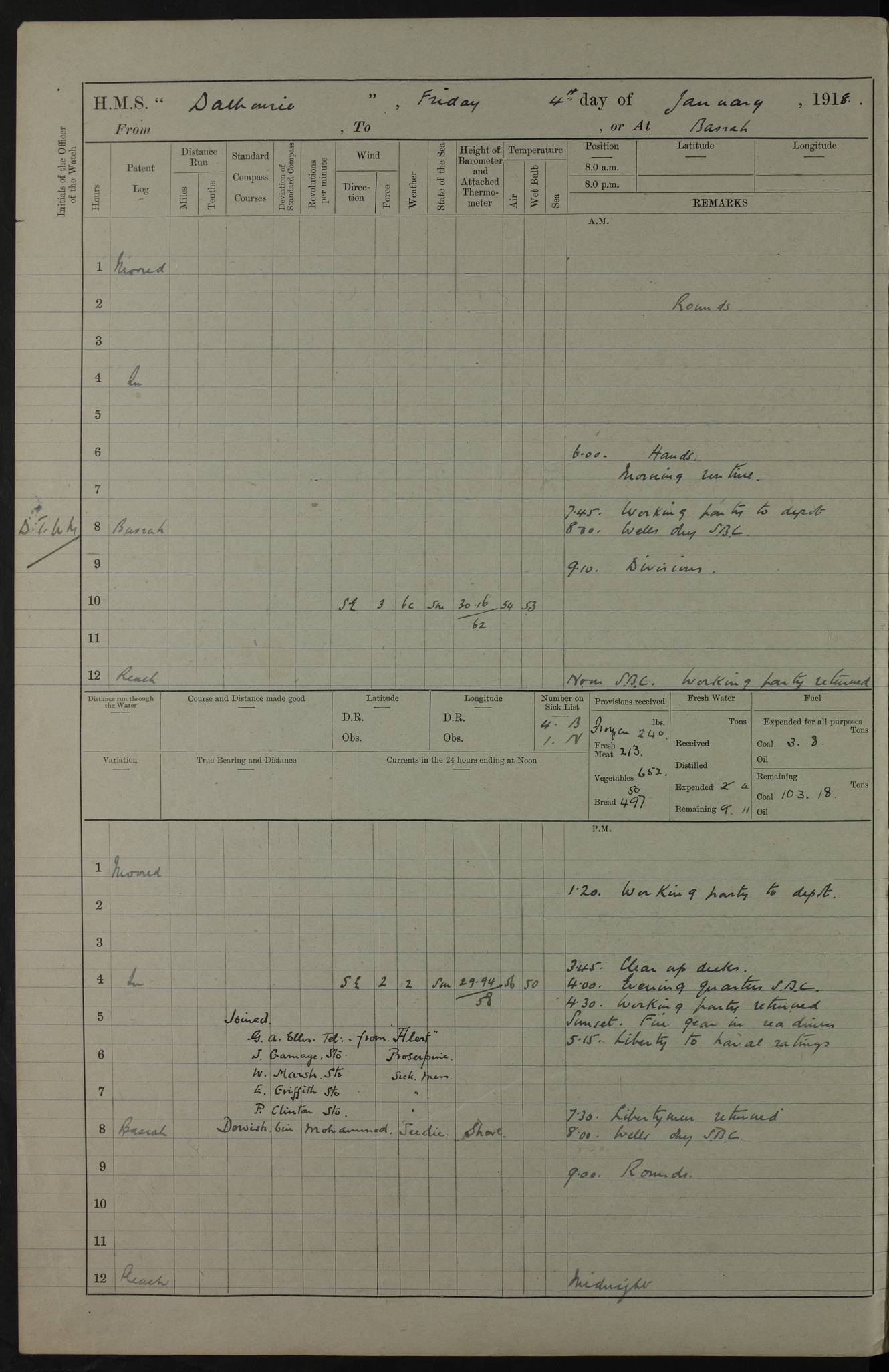 PM - Discharged To Hospital: H Widger, Engine Room Artificer - PW Harrison, Stoker Royal Navy Reserve To Motor Launch 11: J W Whitfield, Stoker 4ef4fa93e53e0a0c910056e2: (https://s3.amazonaws.com:443/oldweather/ADM53-39392/0018_0.jpg) 31 August 1916 Place: Basrah Lat 30.5269, Long 47.8407 2:00am: Rounds 5:05am: Hospital Ship SYRIA passed down 5:30am: Hands 6:00am: Morning Routine 8:00am: Wells dry – Signal Books Correct 9:30am: Divisions - Hands cleaning ship 11:00am: Drew Three Thousand Rupees from the Field treasury 12:00pm: Signal Books Correct – Issued Quinine to ship’s company 12:30pm: Piped Down 3:30pm: 4:00pm: Signal Books Correct 4:30pm: Cleared up decks 5:00pm: Evening Quarters – Leave to Watch of Naval Ratings 7:00pm: Sunset - Fire Gear in readiness 7:30pm: Liberty men returned 8:00pm: Wells dry - Signal Books Correct 9:00pm: Rounds - Signal Books Correct 11:00pm: Destroyed 19 tins Milk being unfit for use. AM – Joined From Motor Launch Depot: M. McMillan, Able Seaman From 5 Mess: T. Jackson, Petty Officer 1st From 4 Mess: T Golden, Stoker – J Tunney, Royal Navy Reserve Trawler Section From 10 Mess: J Donegan Royal Navy Reserve Trawler Section