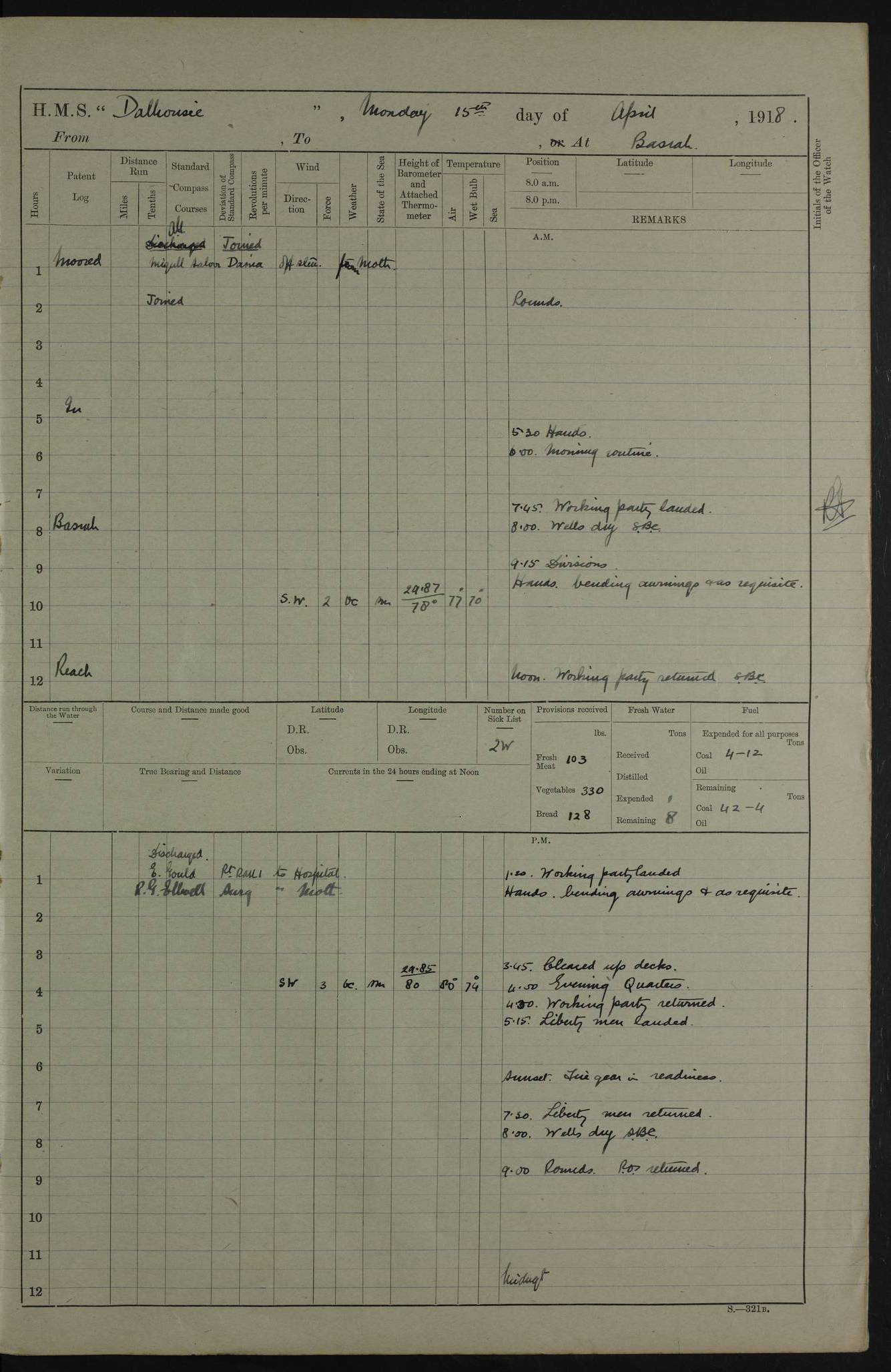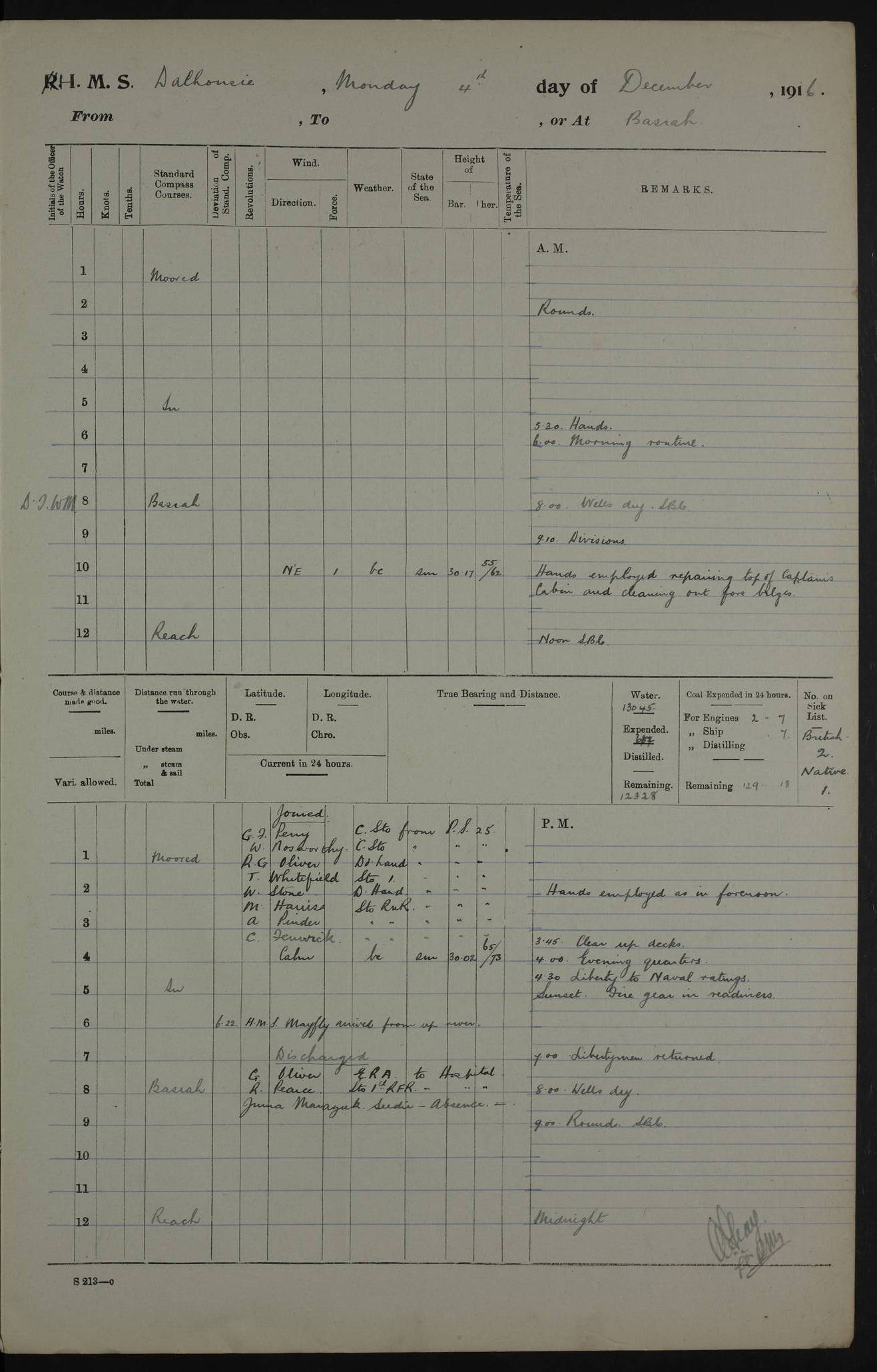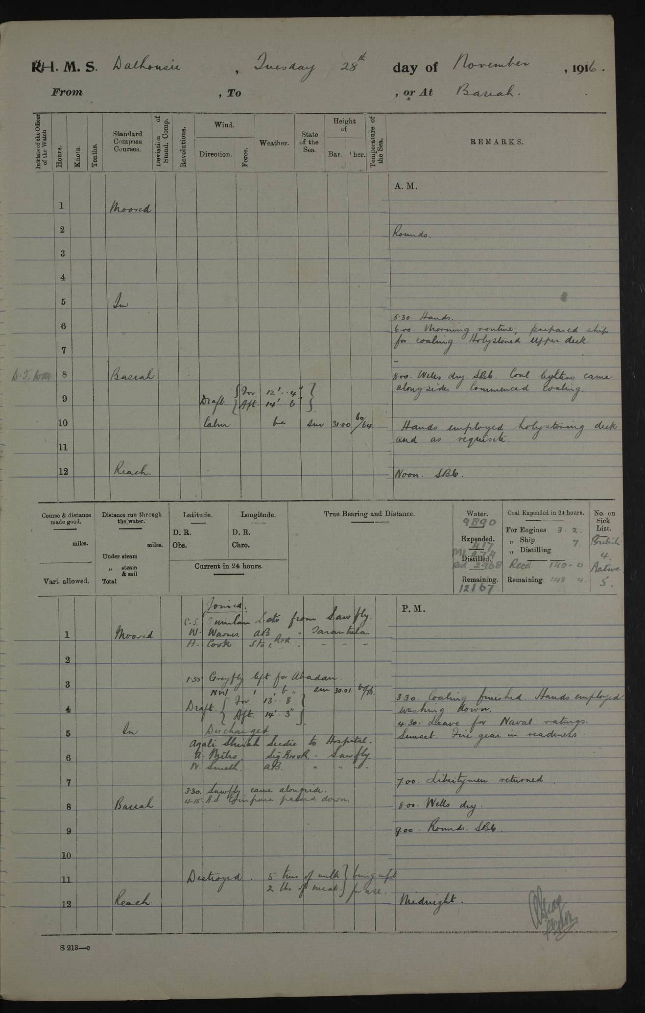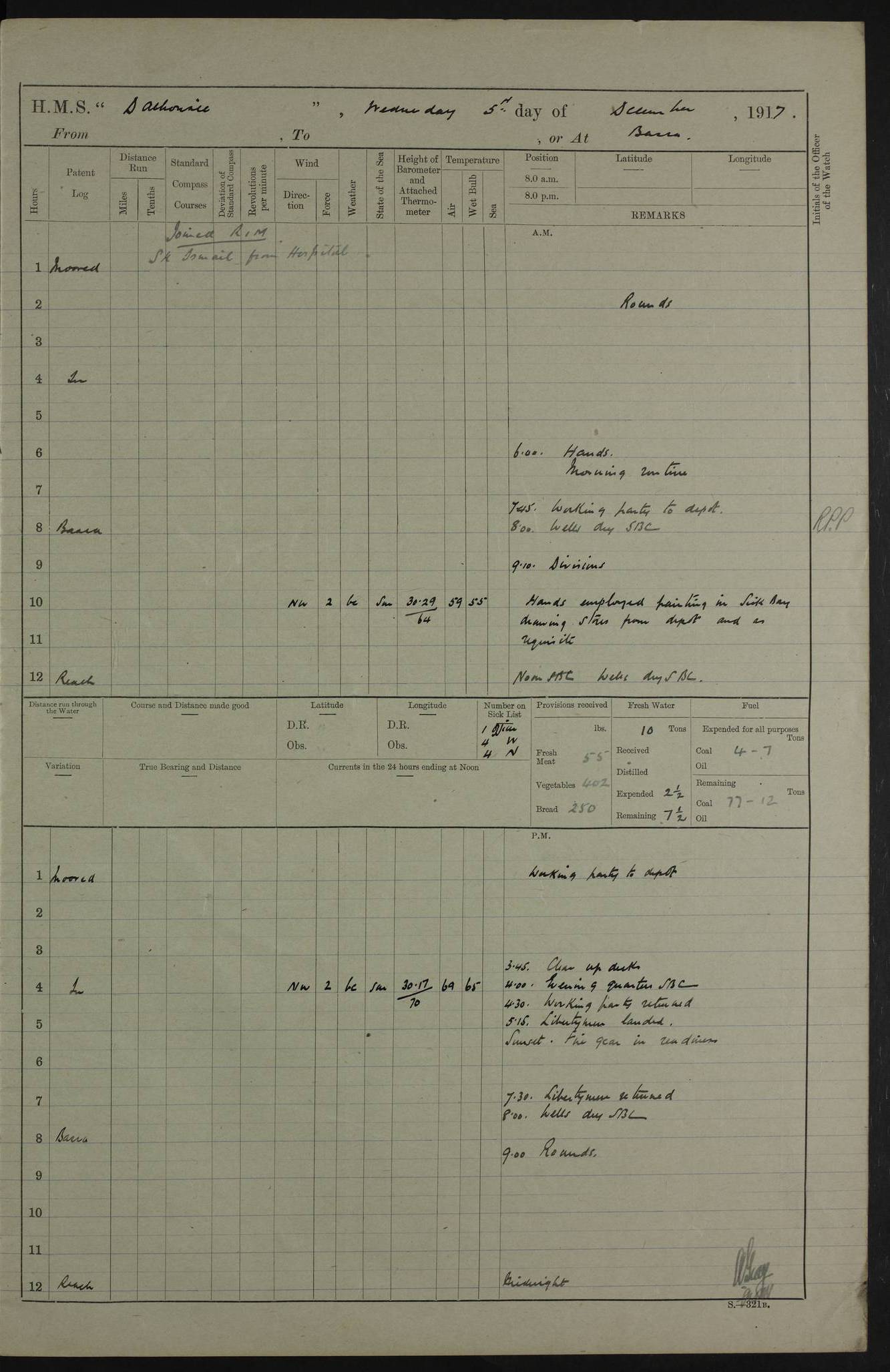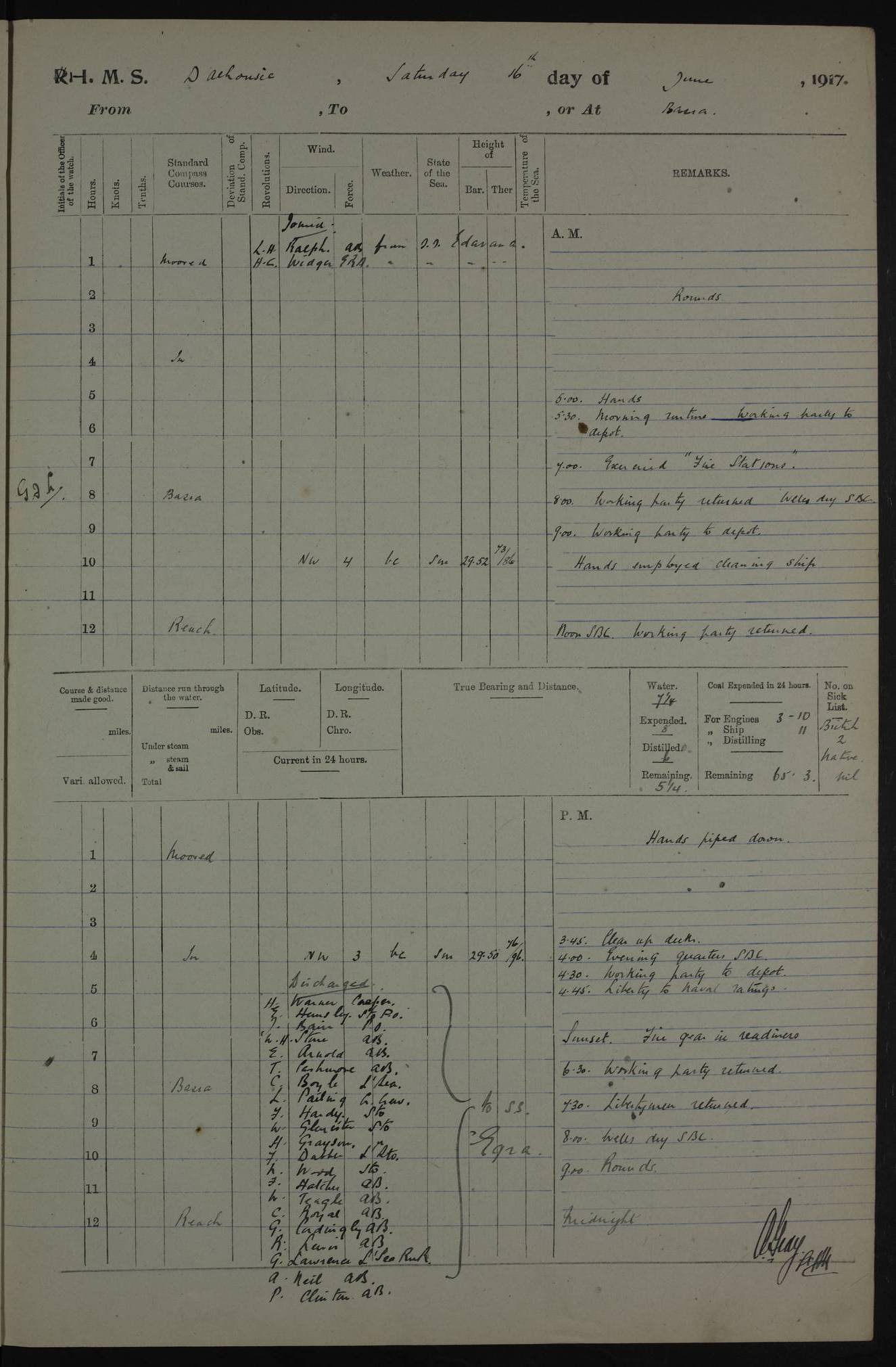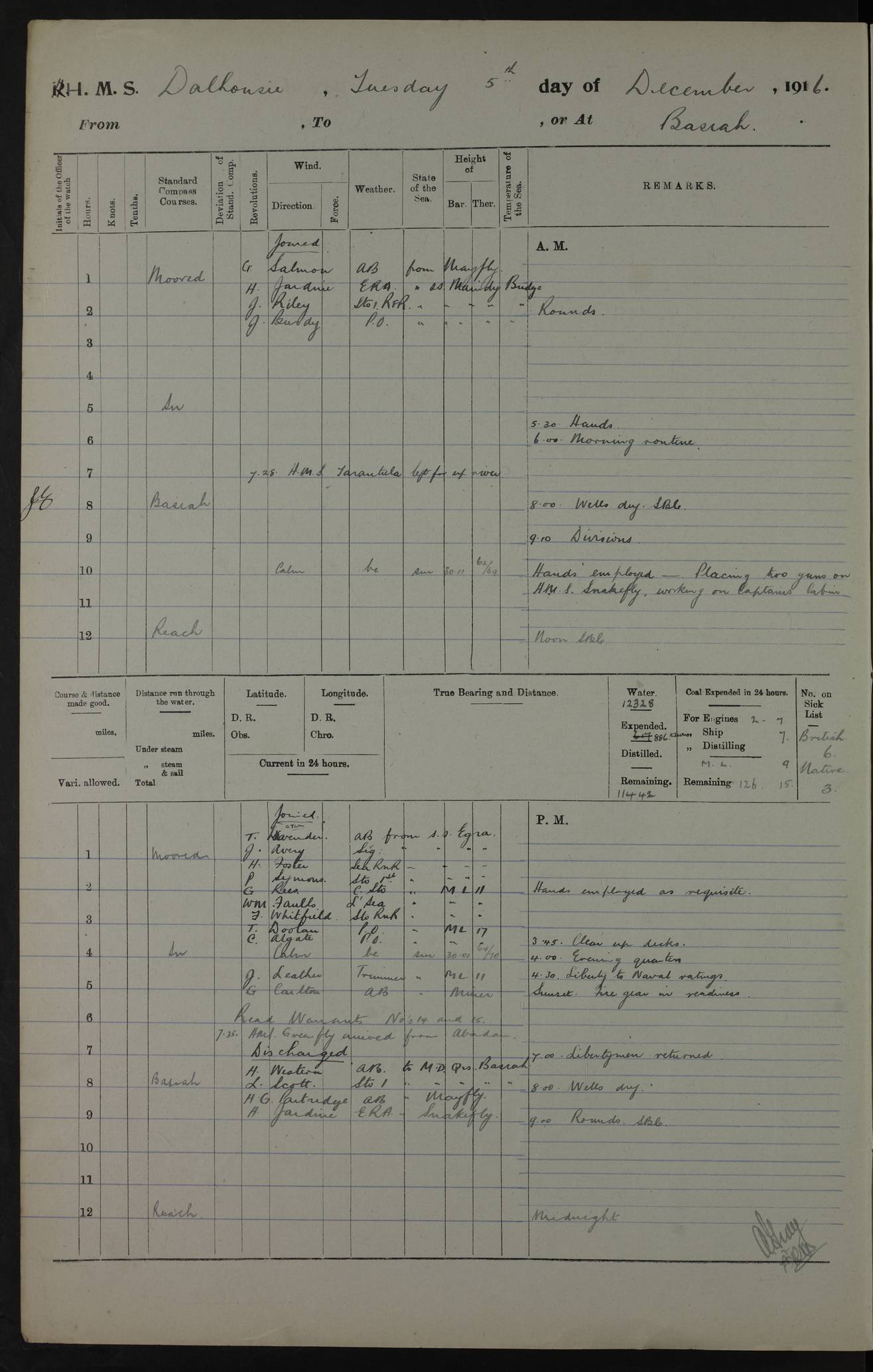 PM - Discharged To Hospital: H Widger, Engine Room Artificer - PW Harrison, Stoker Royal Navy Reserve To Motor Launch 11: J W Whitfield, Stoker 4ef4fa93e53e0a0c910056e2: (https://s3.amazonaws.com:443/oldweather/ADM53-39392/0018_0.jpg) 31 August 1916 Place: Basrah Lat 30.5269, Long 47.8407 2:00am: Rounds 5:05am: Hospital Ship SYRIA passed down 5:30am: Hands 6:00am: Morning Routine 8:00am: Wells dry – Signal Books Correct 9:30am: Divisions - Hands cleaning ship 11:00am: Drew Three Thousand Rupees from the Field treasury 12:00pm: Signal Books Correct – Issued Quinine to ship’s company 12:30pm: Piped Down 3:30pm: 4:00pm: Signal Books Correct 4:30pm: Cleared up decks 5:00pm: Evening Quarters – Leave to Watch of Naval Ratings 7:00pm: Sunset - Fire Gear in readiness 7:30pm: Liberty men returned 8:00pm: Wells dry - Signal Books Correct 9:00pm: Rounds - Signal Books Correct 11:00pm: Destroyed 19 tins Milk being unfit for use. AM – Joined From Motor Launch Depot: M. McMillan, Able Seaman From 5 Mess: T. Jackson, Petty Officer 1st From 4 Mess: T Golden, Stoker – J Tunney, Royal Navy Reserve Trawler Section From 10 Mess: J Donegan Royal Navy Reserve Trawler Section