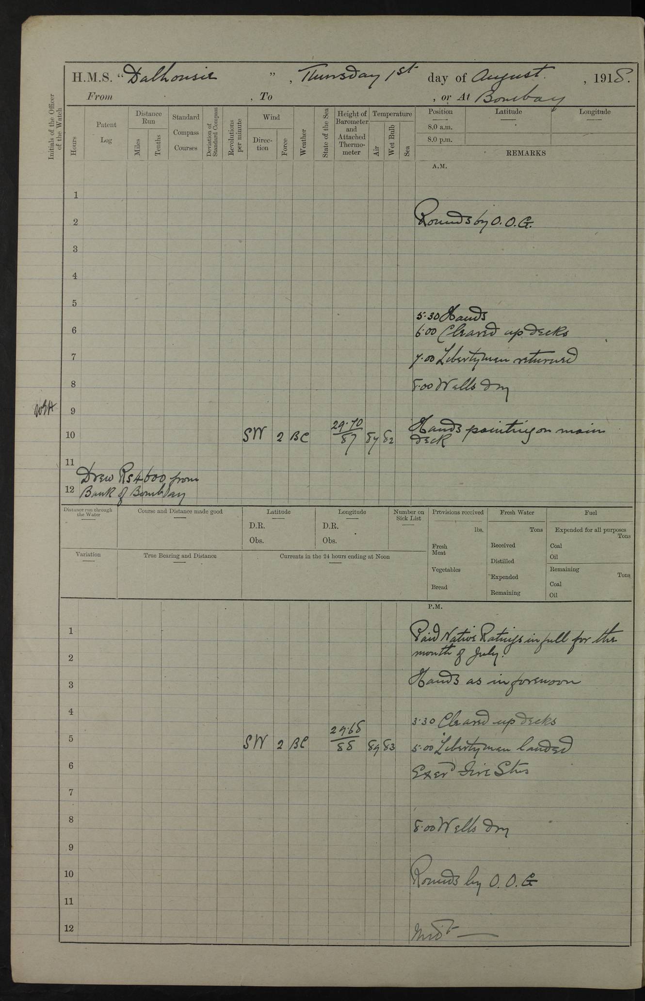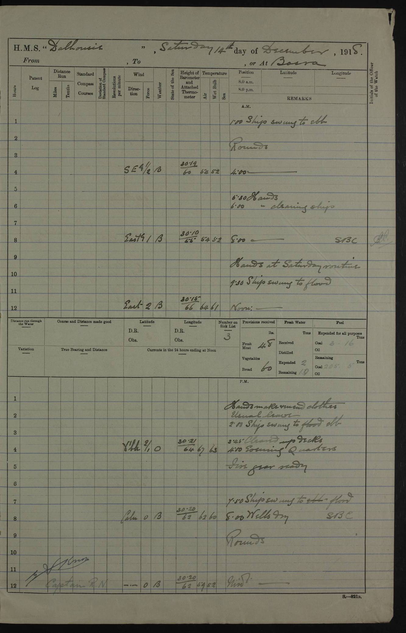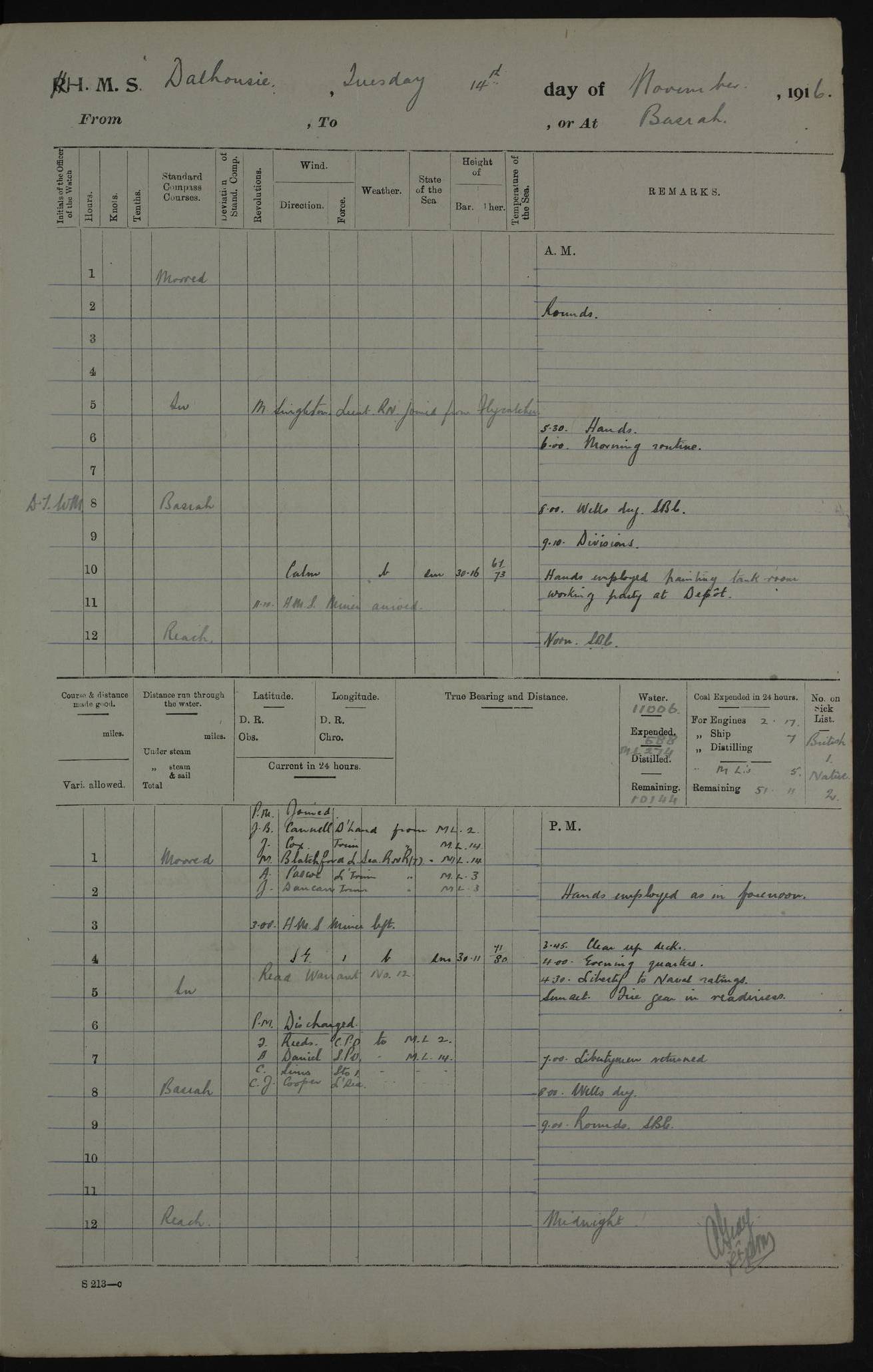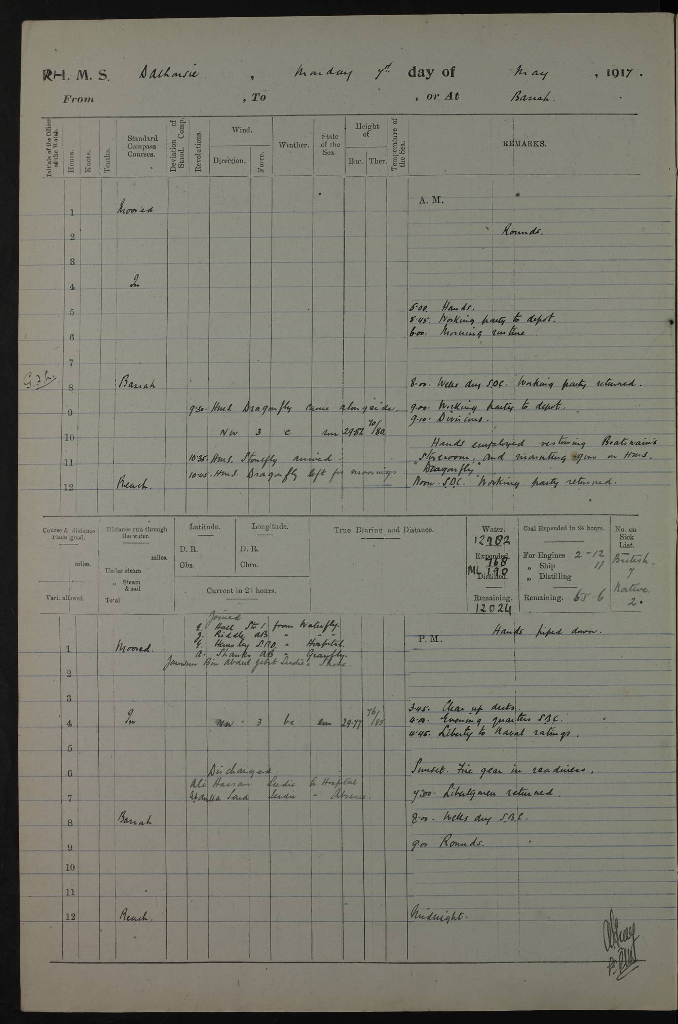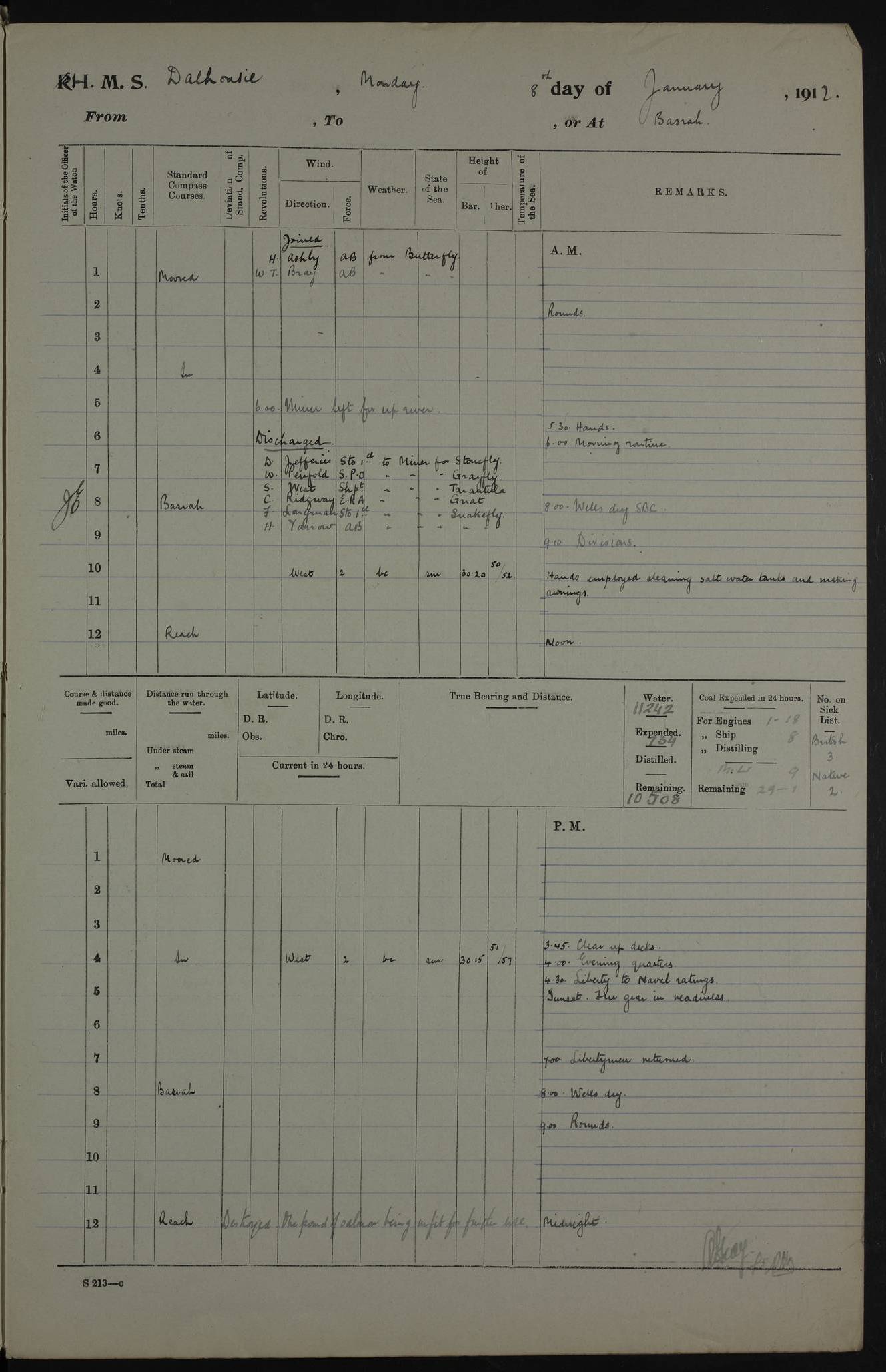 PM - Discharged To Hospital: H Widger, Engine Room Artificer - PW Harrison, Stoker Royal Navy Reserve To Motor Launch 11: J W Whitfield, Stoker 4ef4fa93e53e0a0c910056e2: (https://s3.amazonaws.com:443/oldweather/ADM53-39392/0018_0.jpg) 31 August 1916 Place: Basrah Lat 30.5269, Long 47.8407 2:00am: Rounds 5:05am: Hospital Ship SYRIA passed down 5:30am: Hands 6:00am: Morning Routine 8:00am: Wells dry – Signal Books Correct 9:30am: Divisions - Hands cleaning ship 11:00am: Drew Three Thousand Rupees from the Field treasury 12:00pm: Signal Books Correct – Issued Quinine to ship’s company 12:30pm: Piped Down 3:30pm: 4:00pm: Signal Books Correct 4:30pm: Cleared up decks 5:00pm: Evening Quarters – Leave to Watch of Naval Ratings 7:00pm: Sunset - Fire Gear in readiness 7:30pm: Liberty men returned 8:00pm: Wells dry - Signal Books Correct 9:00pm: Rounds - Signal Books Correct 11:00pm: Destroyed 19 tins Milk being unfit for use. AM – Joined From Motor Launch Depot: M. McMillan, Able Seaman From 5 Mess: T. Jackson, Petty Officer 1st From 4 Mess: T Golden, Stoker – J Tunney, Royal Navy Reserve Trawler Section From 10 Mess: J Donegan Royal Navy Reserve Trawler Section
