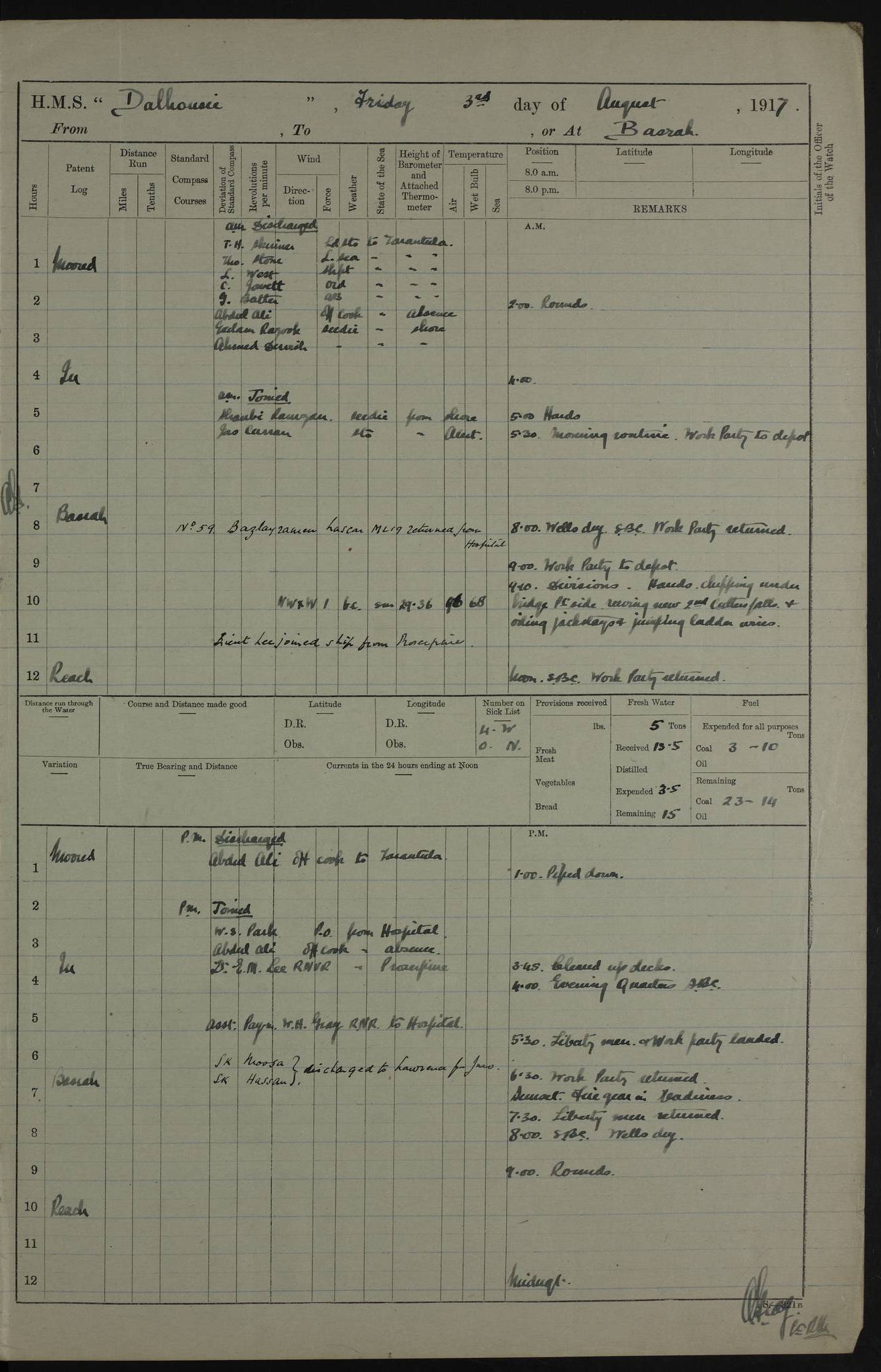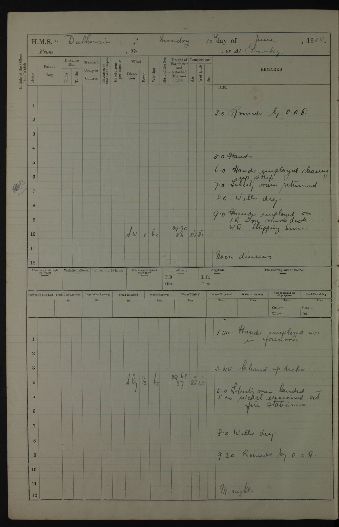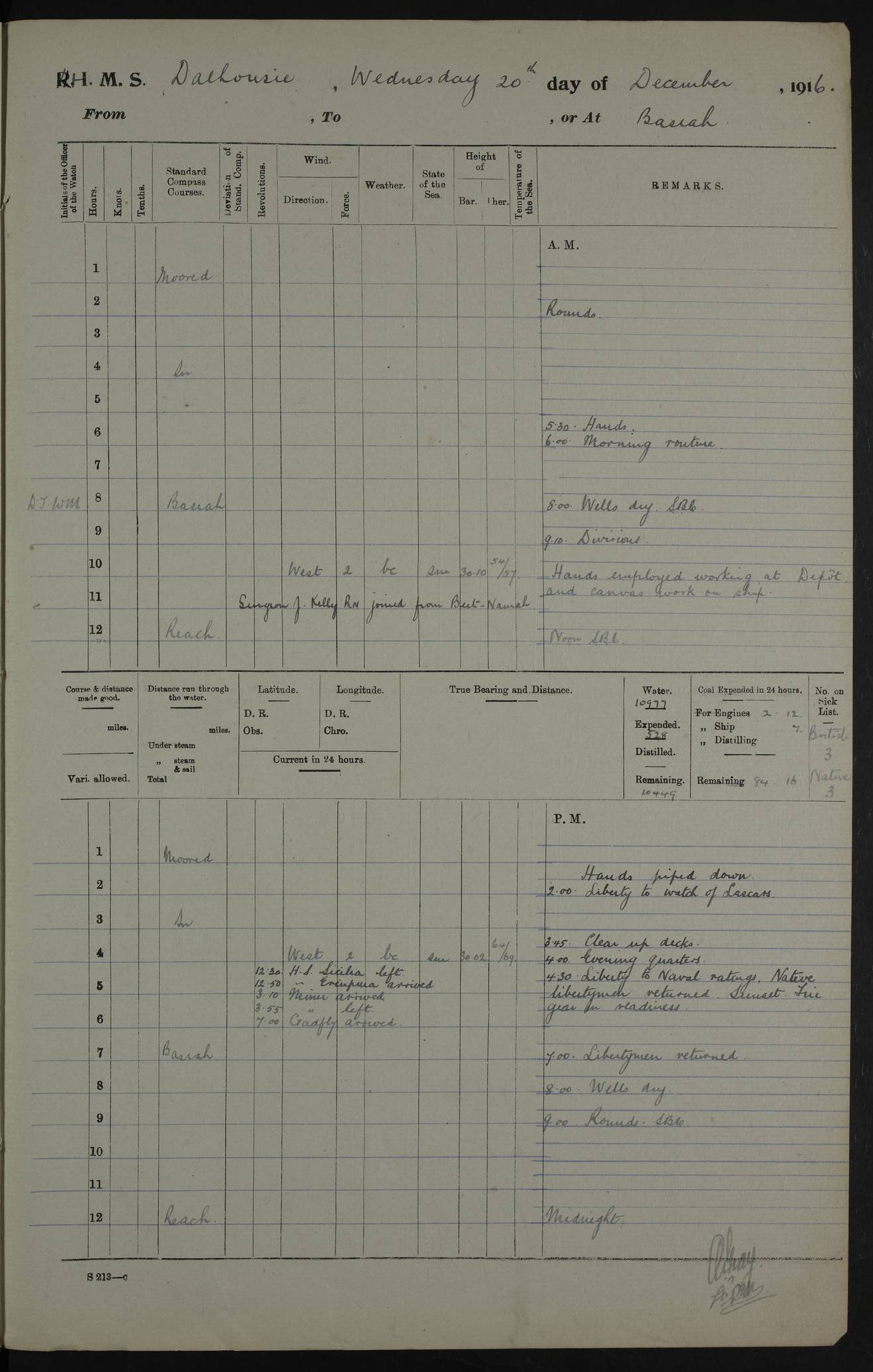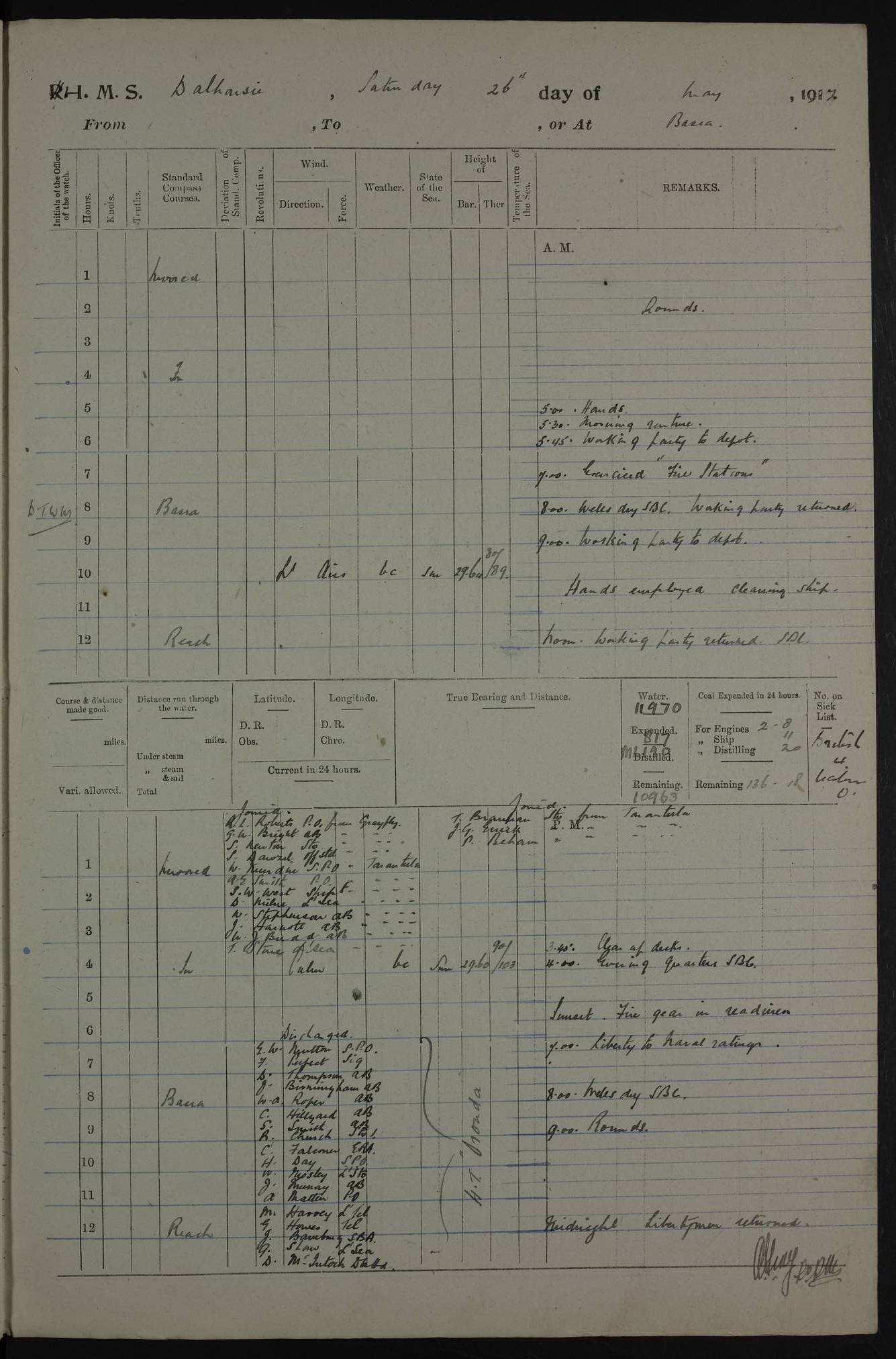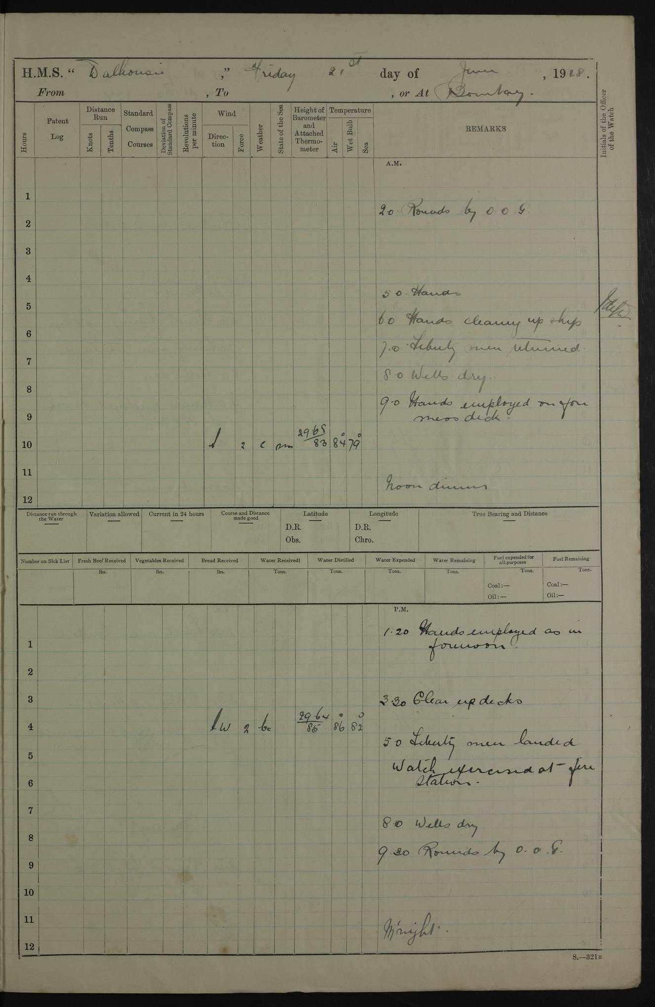 PM - Discharged To Hospital: H Widger, Engine Room Artificer - PW Harrison, Stoker Royal Navy Reserve To Motor Launch 11: J W Whitfield, Stoker 4ef4fa93e53e0a0c910056e2: (https://s3.amazonaws.com:443/oldweather/ADM53-39392/0018_0.jpg) 31 August 1916 Place: Basrah Lat 30.5269, Long 47.8407 2:00am: Rounds 5:05am: Hospital Ship SYRIA passed down 5:30am: Hands 6:00am: Morning Routine 8:00am: Wells dry – Signal Books Correct 9:30am: Divisions - Hands cleaning ship 11:00am: Drew Three Thousand Rupees from the Field treasury 12:00pm: Signal Books Correct – Issued Quinine to ship’s company 12:30pm: Piped Down 3:30pm: 4:00pm: Signal Books Correct 4:30pm: Cleared up decks 5:00pm: Evening Quarters – Leave to Watch of Naval Ratings 7:00pm: Sunset - Fire Gear in readiness 7:30pm: Liberty men returned 8:00pm: Wells dry - Signal Books Correct 9:00pm: Rounds - Signal Books Correct 11:00pm: Destroyed 19 tins Milk being unfit for use. AM – Joined From Motor Launch Depot: M. McMillan, Able Seaman From 5 Mess: T. Jackson, Petty Officer 1st From 4 Mess: T Golden, Stoker – J Tunney, Royal Navy Reserve Trawler Section From 10 Mess: J Donegan Royal Navy Reserve Trawler Section