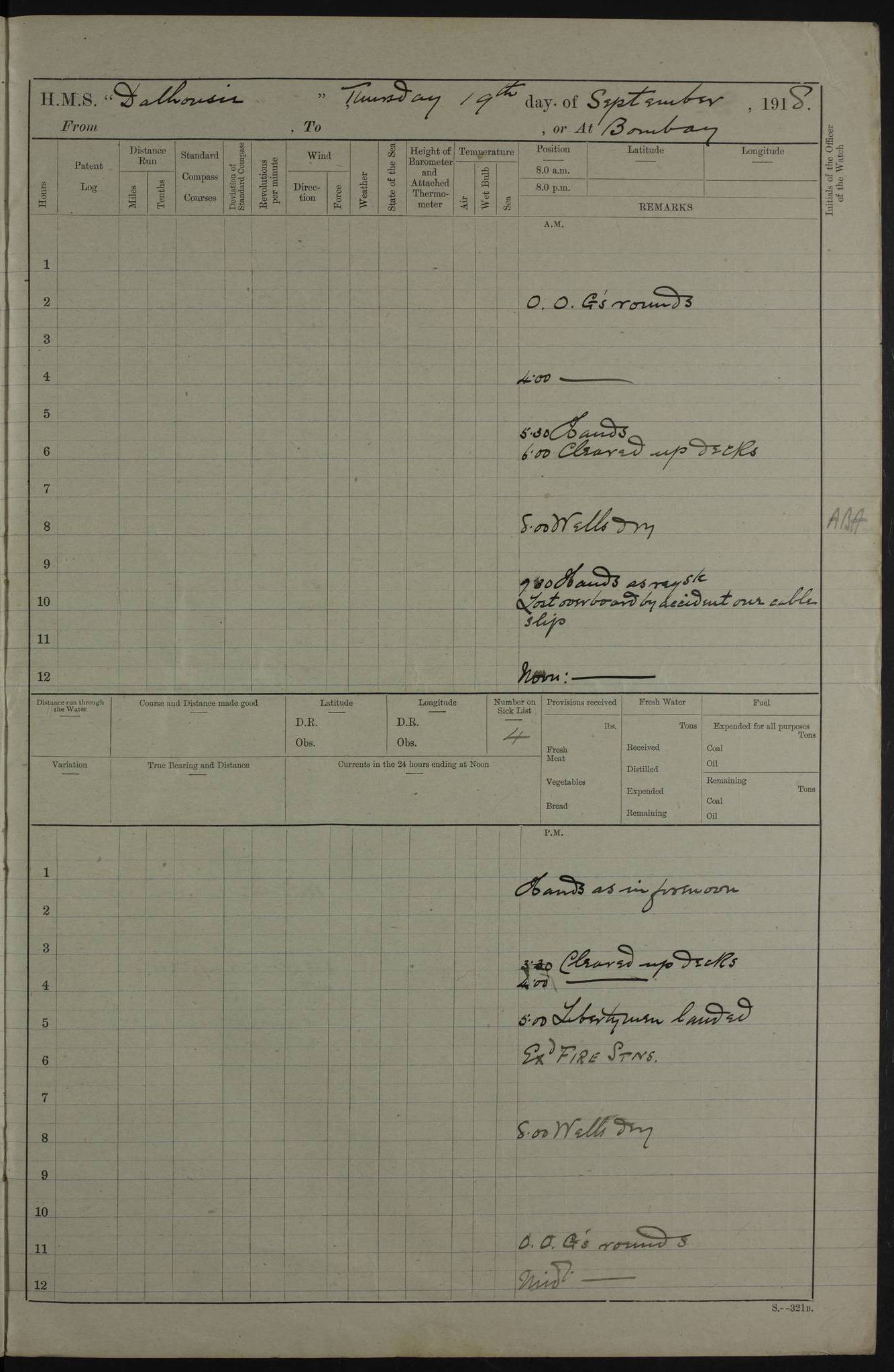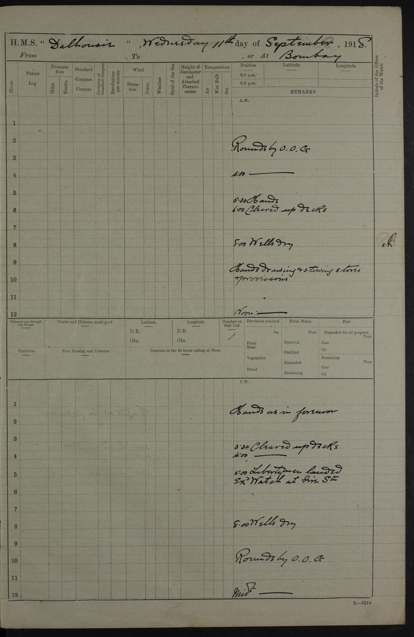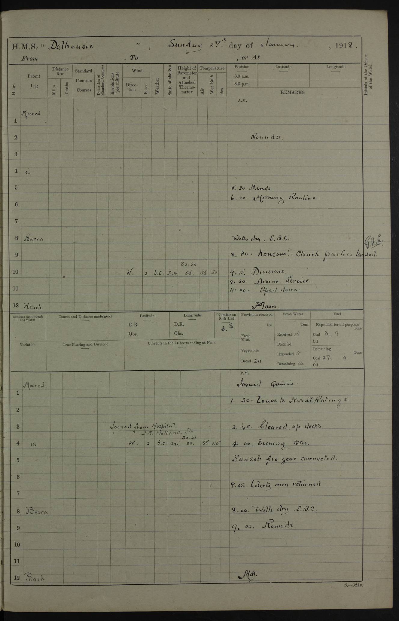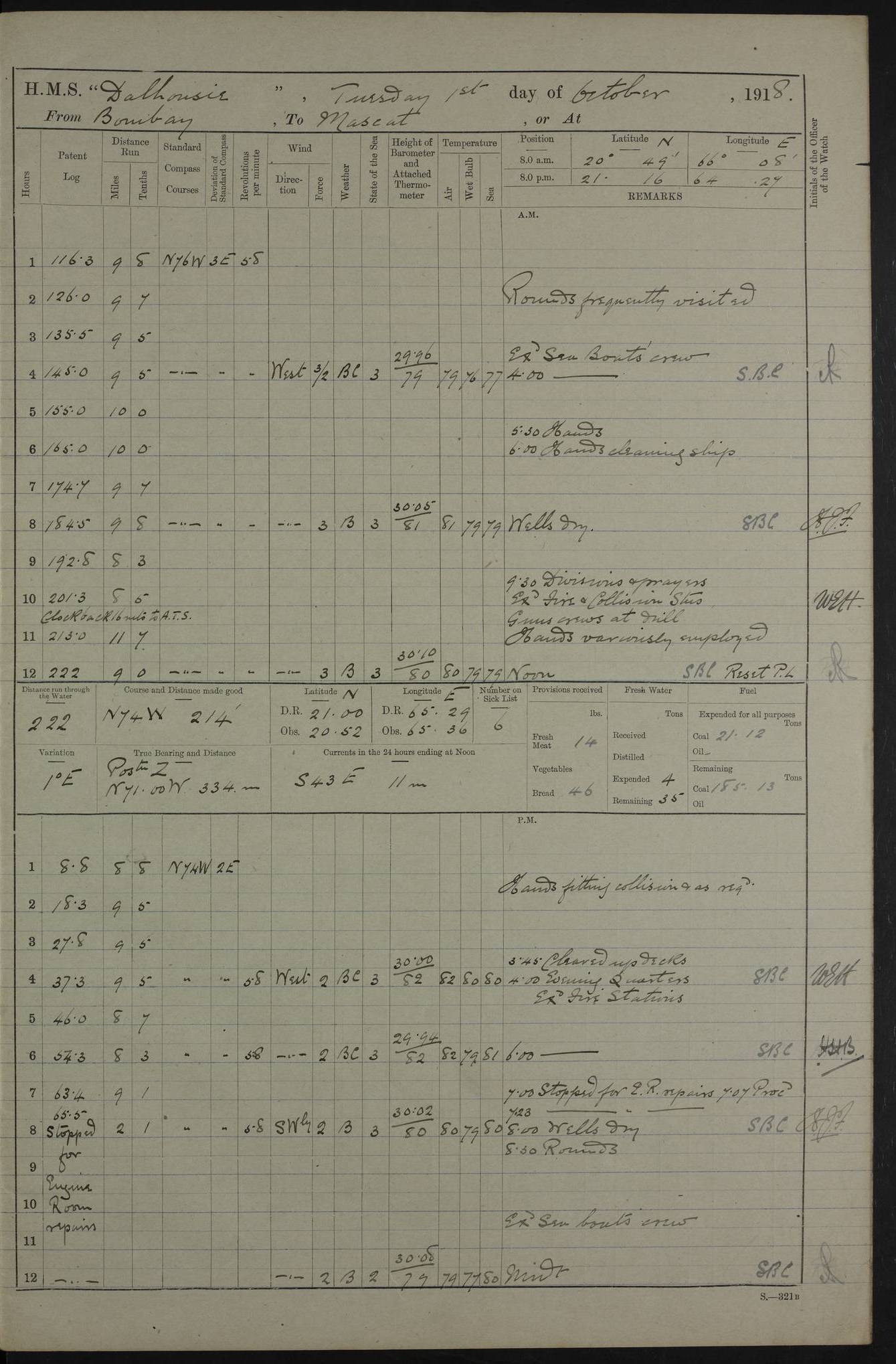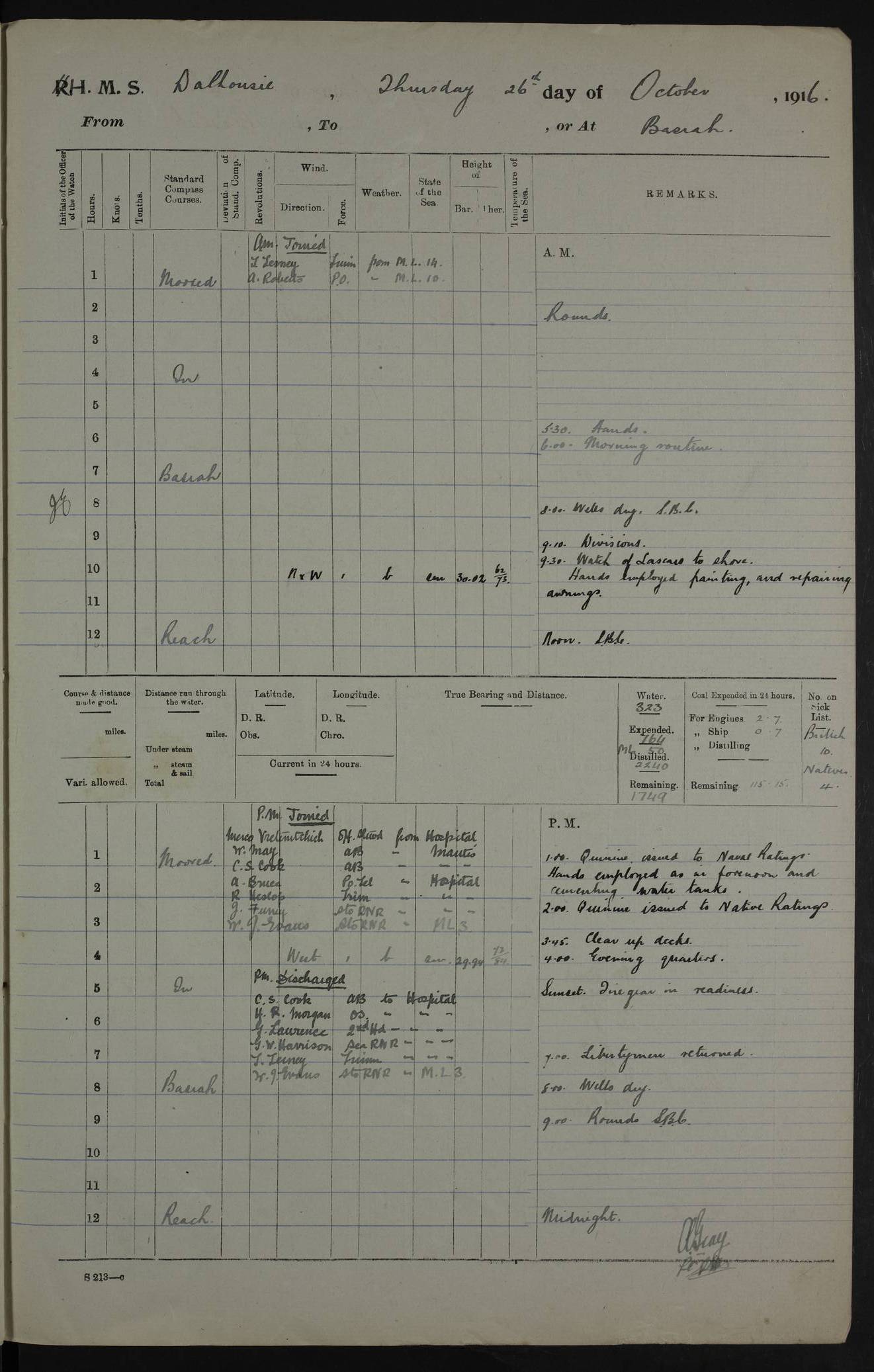 PM - Discharged To Hospital: H Widger, Engine Room Artificer - PW Harrison, Stoker Royal Navy Reserve To Motor Launch 11: J W Whitfield, Stoker 4ef4fa93e53e0a0c910056e2: (https://s3.amazonaws.com:443/oldweather/ADM53-39392/0018_0.jpg) 31 August 1916 Place: Basrah Lat 30.5269, Long 47.8407 2:00am: Rounds 5:05am: Hospital Ship SYRIA passed down 5:30am: Hands 6:00am: Morning Routine 8:00am: Wells dry – Signal Books Correct 9:30am: Divisions - Hands cleaning ship 11:00am: Drew Three Thousand Rupees from the Field treasury 12:00pm: Signal Books Correct – Issued Quinine to ship’s company 12:30pm: Piped Down 3:30pm: 4:00pm: Signal Books Correct 4:30pm: Cleared up decks 5:00pm: Evening Quarters – Leave to Watch of Naval Ratings 7:00pm: Sunset - Fire Gear in readiness 7:30pm: Liberty men returned 8:00pm: Wells dry - Signal Books Correct 9:00pm: Rounds - Signal Books Correct 11:00pm: Destroyed 19 tins Milk being unfit for use. AM – Joined From Motor Launch Depot: M. McMillan, Able Seaman From 5 Mess: T. Jackson, Petty Officer 1st From 4 Mess: T Golden, Stoker – J Tunney, Royal Navy Reserve Trawler Section From 10 Mess: J Donegan Royal Navy Reserve Trawler Section