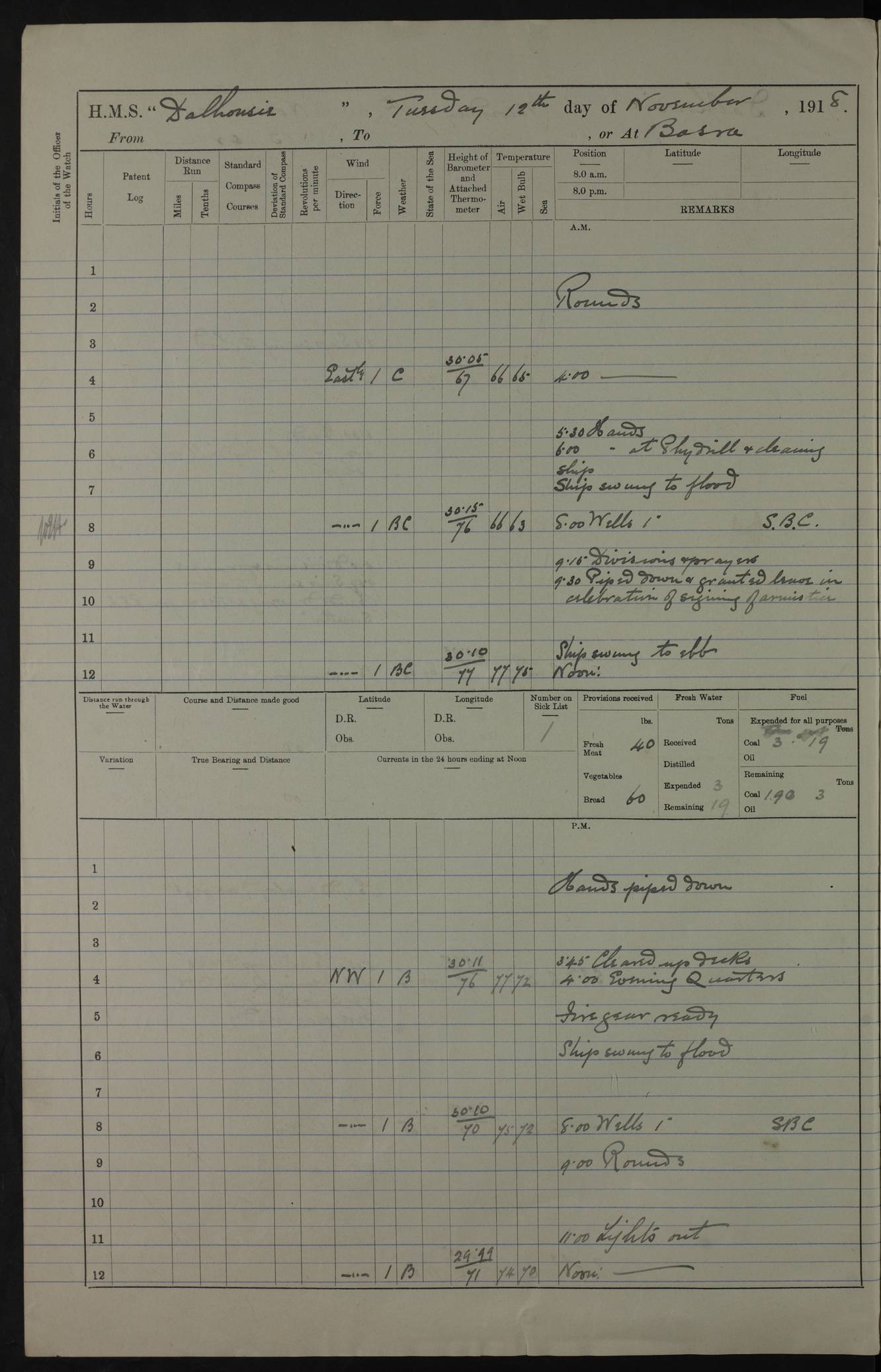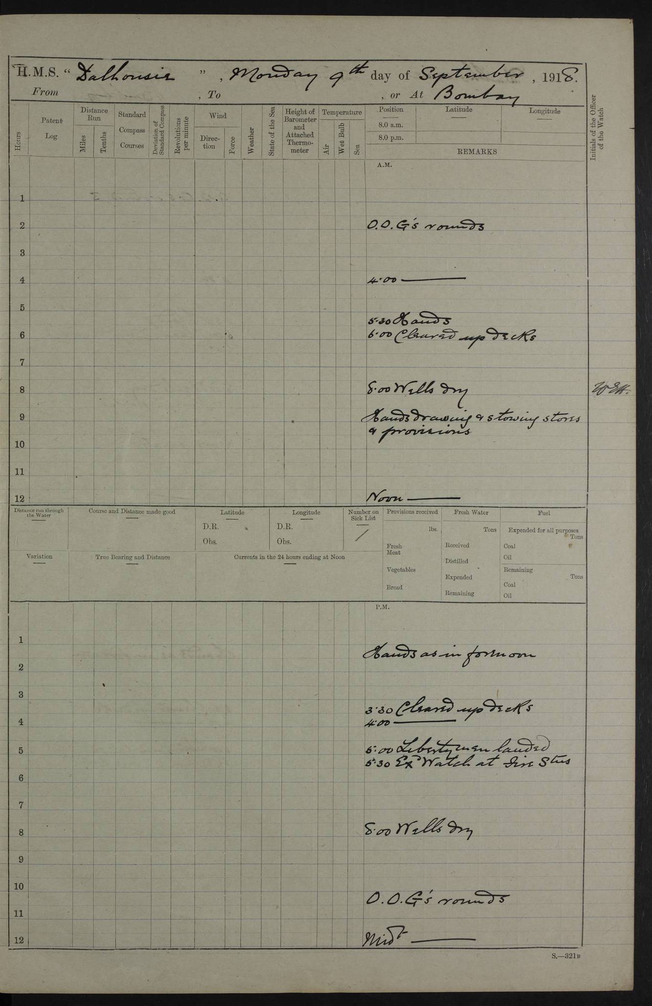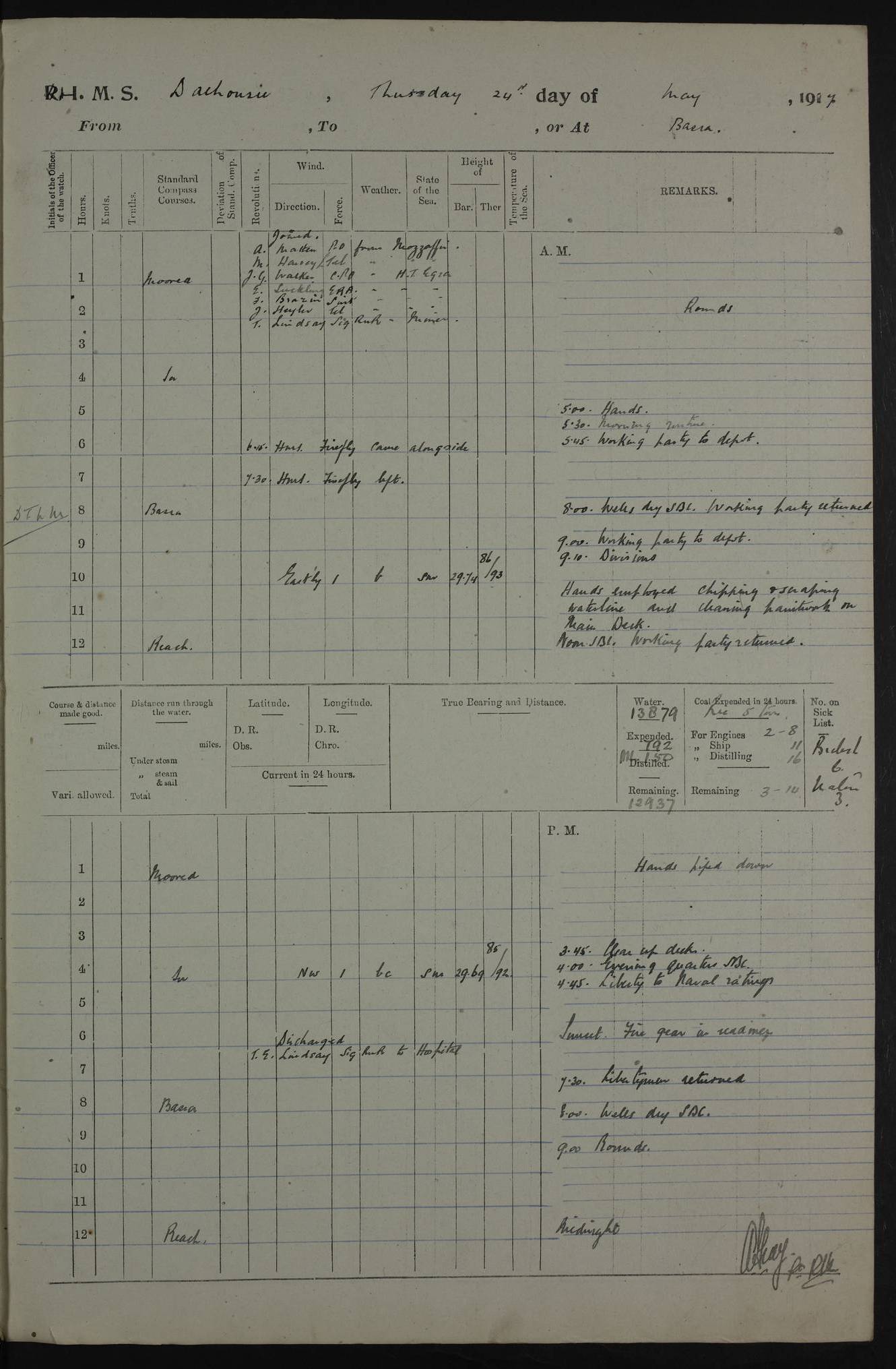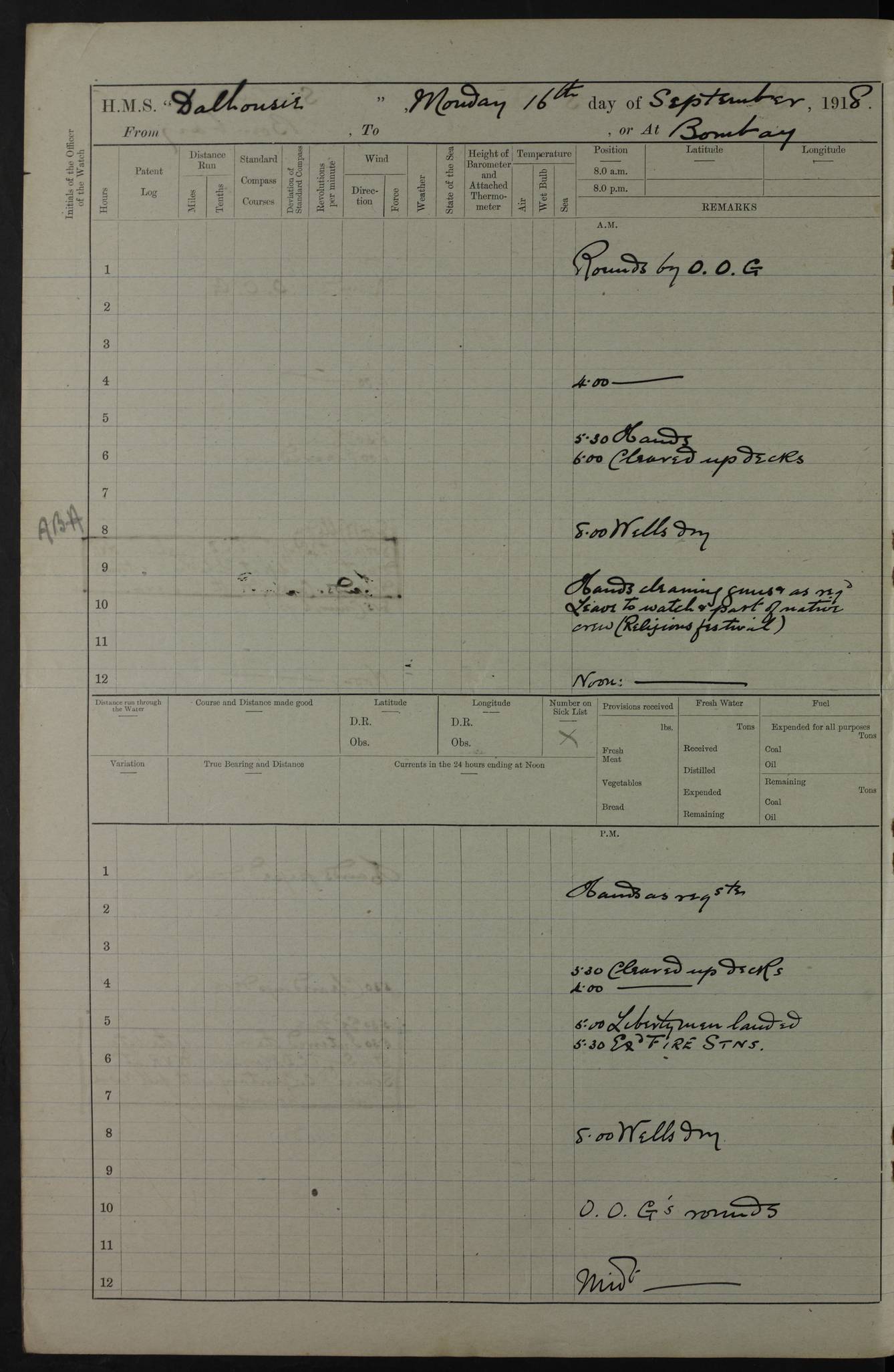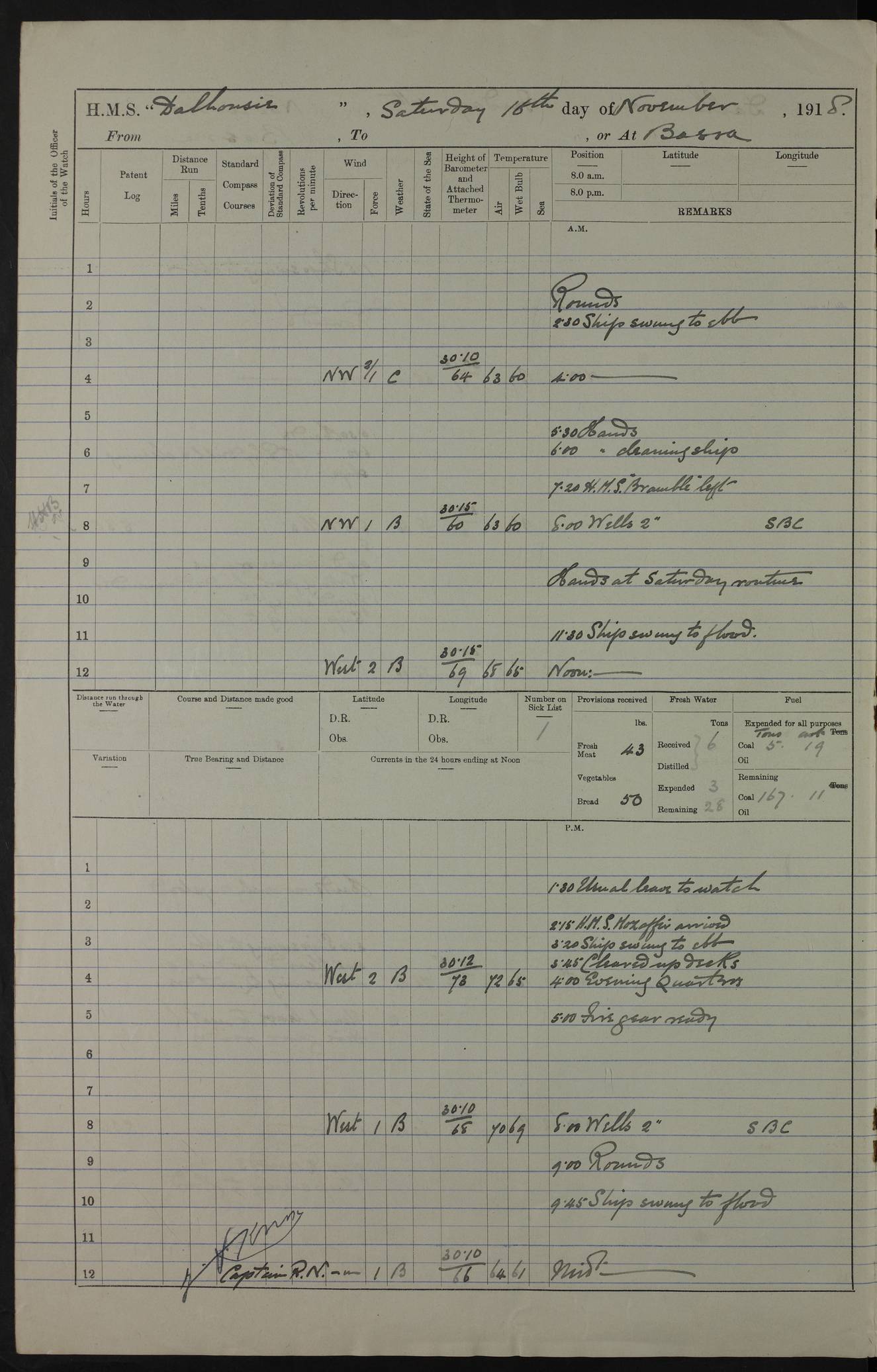 PM - Discharged To Hospital: H Widger, Engine Room Artificer - PW Harrison, Stoker Royal Navy Reserve To Motor Launch 11: J W Whitfield, Stoker 4ef4fa93e53e0a0c910056e2: (https://s3.amazonaws.com:443/oldweather/ADM53-39392/0018_0.jpg) 31 August 1916 Place: Basrah Lat 30.5269, Long 47.8407 2:00am: Rounds 5:05am: Hospital Ship SYRIA passed down 5:30am: Hands 6:00am: Morning Routine 8:00am: Wells dry – Signal Books Correct 9:30am: Divisions - Hands cleaning ship 11:00am: Drew Three Thousand Rupees from the Field treasury 12:00pm: Signal Books Correct – Issued Quinine to ship’s company 12:30pm: Piped Down 3:30pm: 4:00pm: Signal Books Correct 4:30pm: Cleared up decks 5:00pm: Evening Quarters – Leave to Watch of Naval Ratings 7:00pm: Sunset - Fire Gear in readiness 7:30pm: Liberty men returned 8:00pm: Wells dry - Signal Books Correct 9:00pm: Rounds - Signal Books Correct 11:00pm: Destroyed 19 tins Milk being unfit for use. AM – Joined From Motor Launch Depot: M. McMillan, Able Seaman From 5 Mess: T. Jackson, Petty Officer 1st From 4 Mess: T Golden, Stoker – J Tunney, Royal Navy Reserve Trawler Section From 10 Mess: J Donegan Royal Navy Reserve Trawler Section