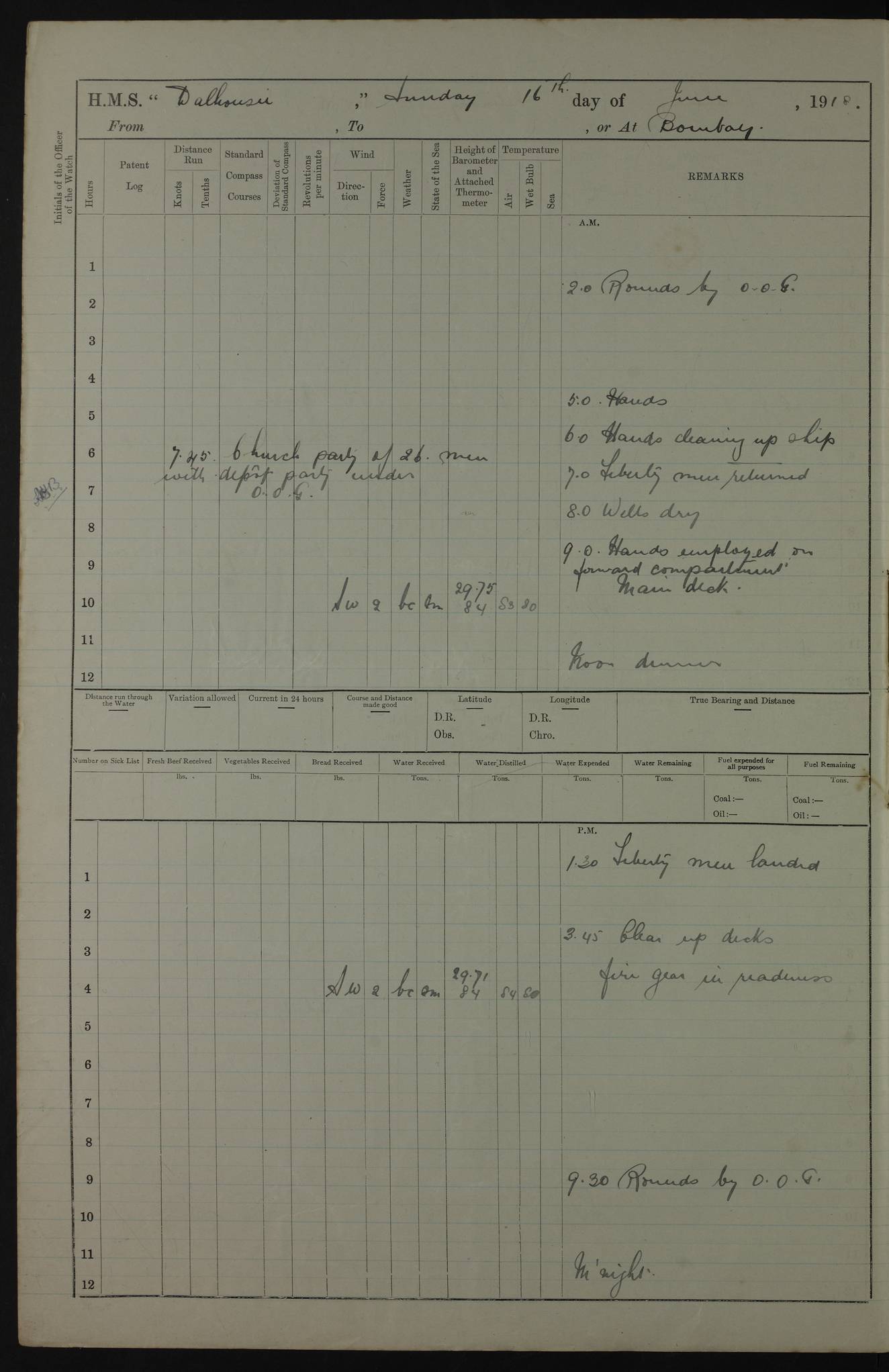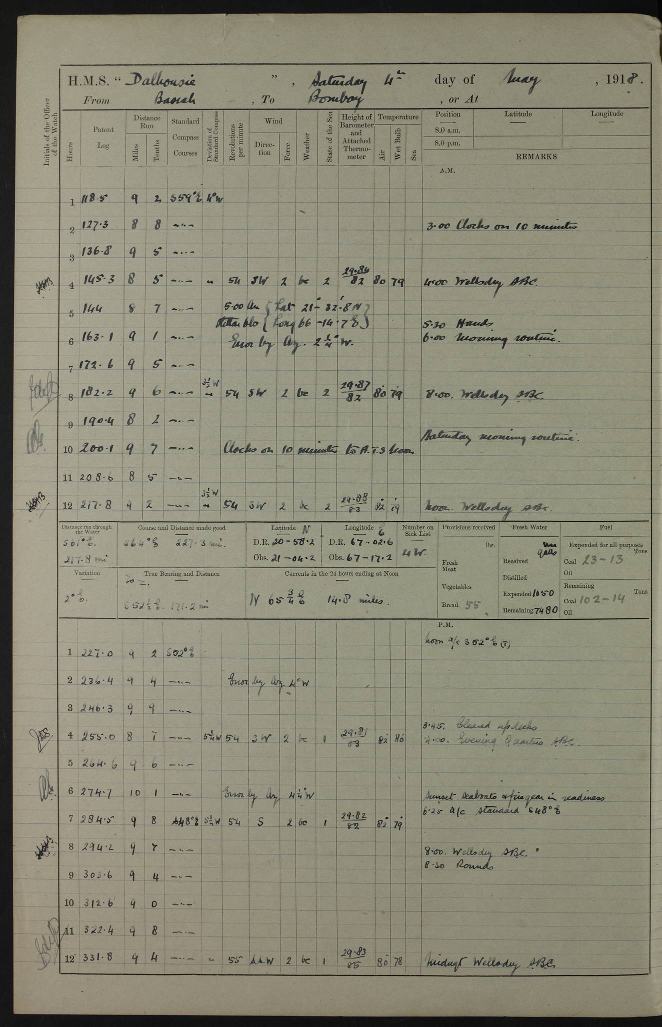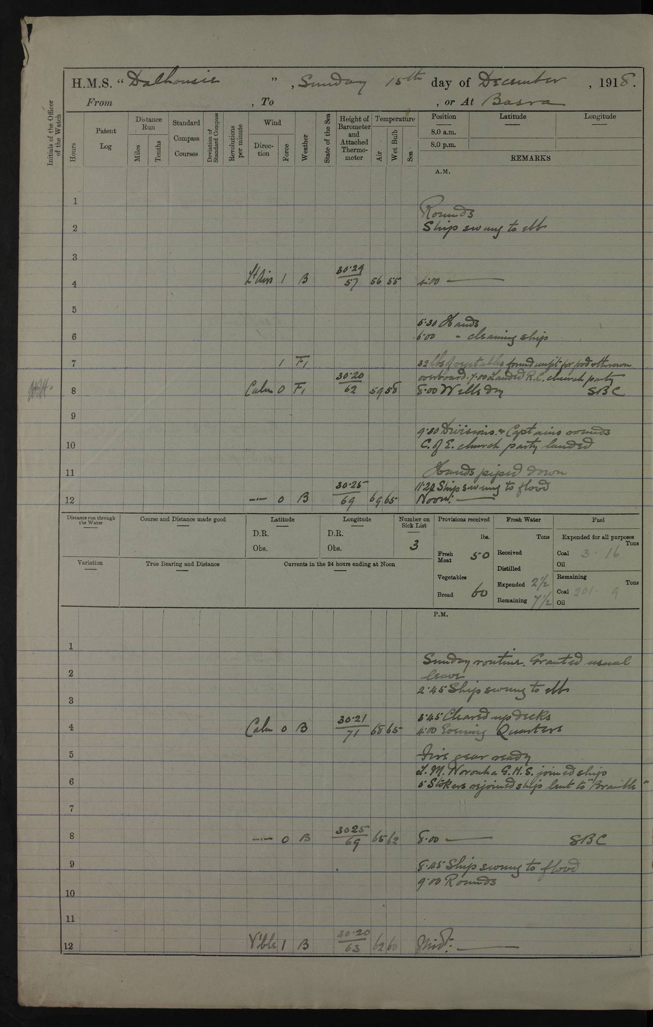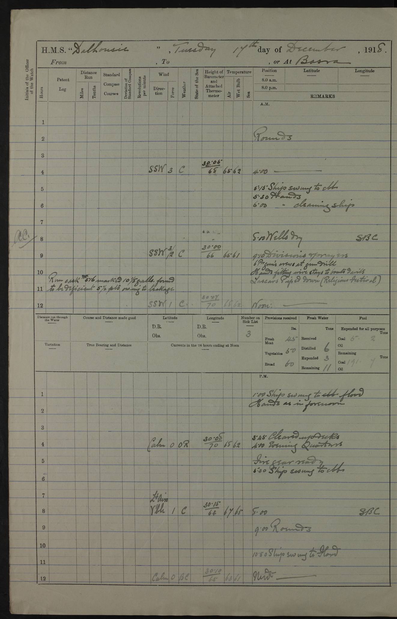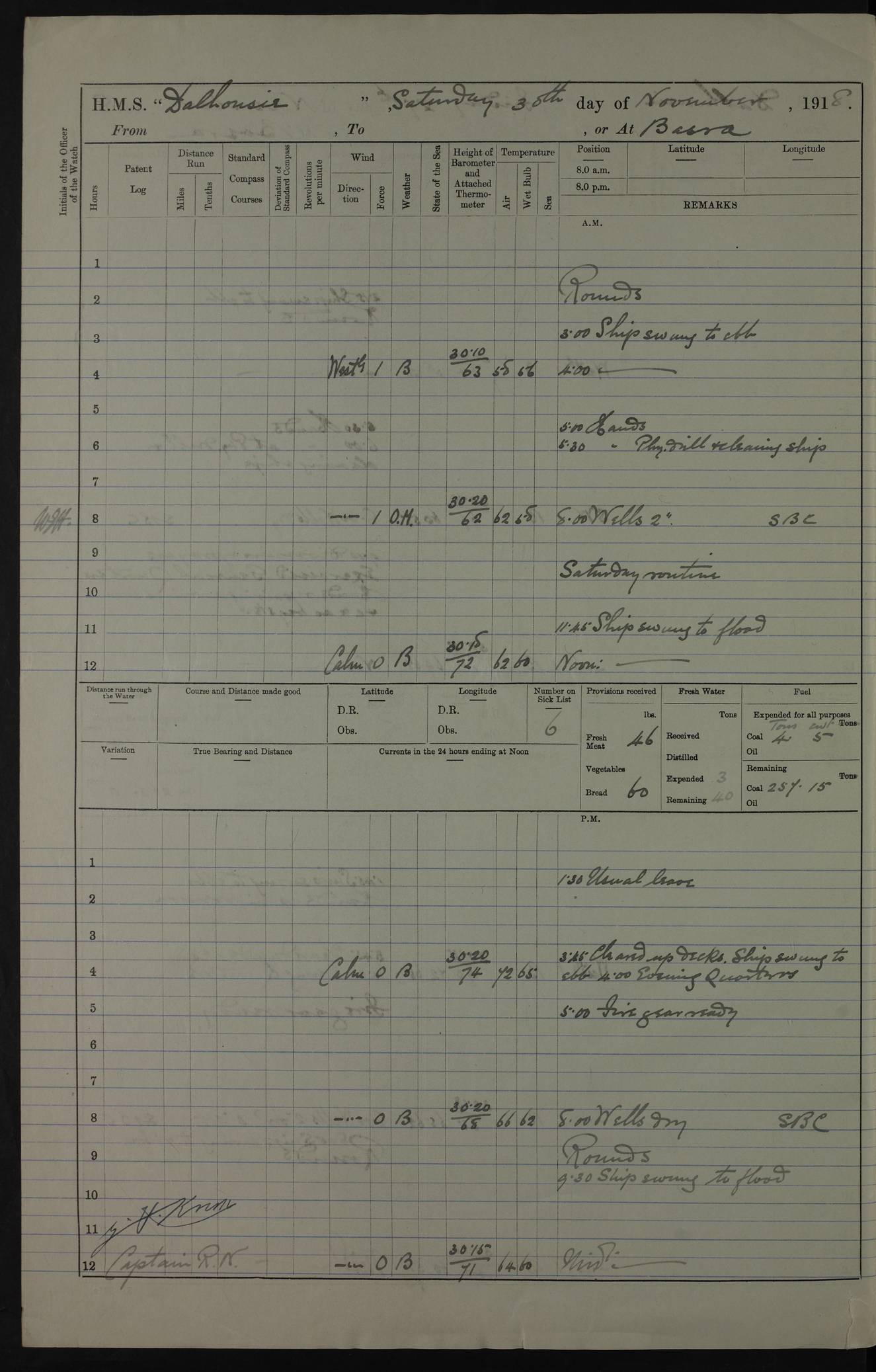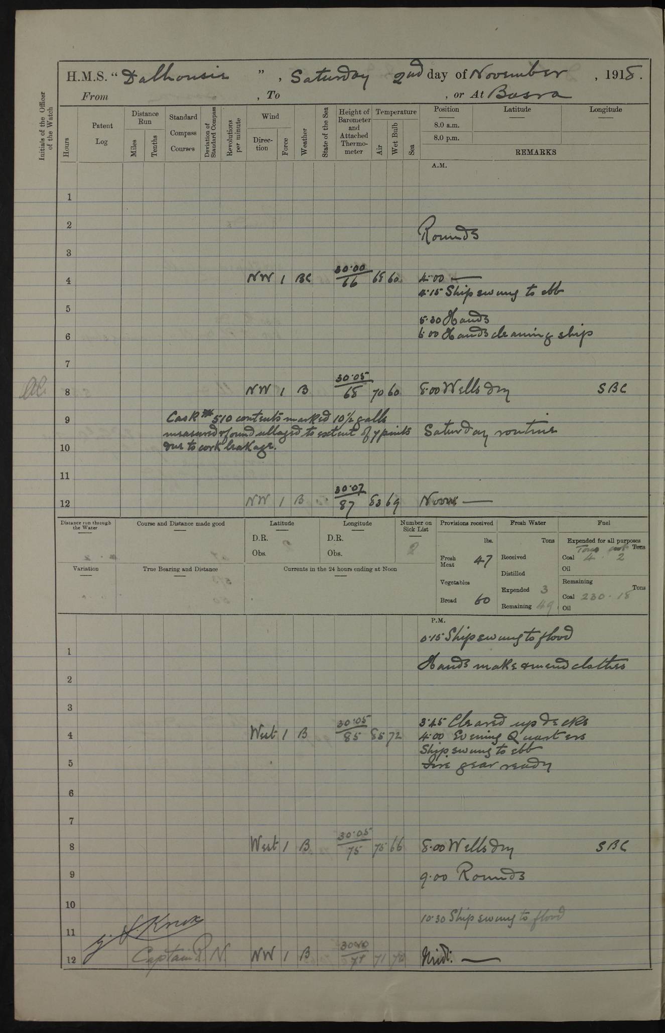 PM - Discharged To Hospital: H Widger, Engine Room Artificer - PW Harrison, Stoker Royal Navy Reserve To Motor Launch 11: J W Whitfield, Stoker 4ef4fa93e53e0a0c910056e2: (https://s3.amazonaws.com:443/oldweather/ADM53-39392/0018_0.jpg) 31 August 1916 Place: Basrah Lat 30.5269, Long 47.8407 2:00am: Rounds 5:05am: Hospital Ship SYRIA passed down 5:30am: Hands 6:00am: Morning Routine 8:00am: Wells dry – Signal Books Correct 9:30am: Divisions - Hands cleaning ship 11:00am: Drew Three Thousand Rupees from the Field treasury 12:00pm: Signal Books Correct – Issued Quinine to ship’s company 12:30pm: Piped Down 3:30pm: 4:00pm: Signal Books Correct 4:30pm: Cleared up decks 5:00pm: Evening Quarters – Leave to Watch of Naval Ratings 7:00pm: Sunset - Fire Gear in readiness 7:30pm: Liberty men returned 8:00pm: Wells dry - Signal Books Correct 9:00pm: Rounds - Signal Books Correct 11:00pm: Destroyed 19 tins Milk being unfit for use. AM – Joined From Motor Launch Depot: M. McMillan, Able Seaman From 5 Mess: T. Jackson, Petty Officer 1st From 4 Mess: T Golden, Stoker – J Tunney, Royal Navy Reserve Trawler Section From 10 Mess: J Donegan Royal Navy Reserve Trawler Section