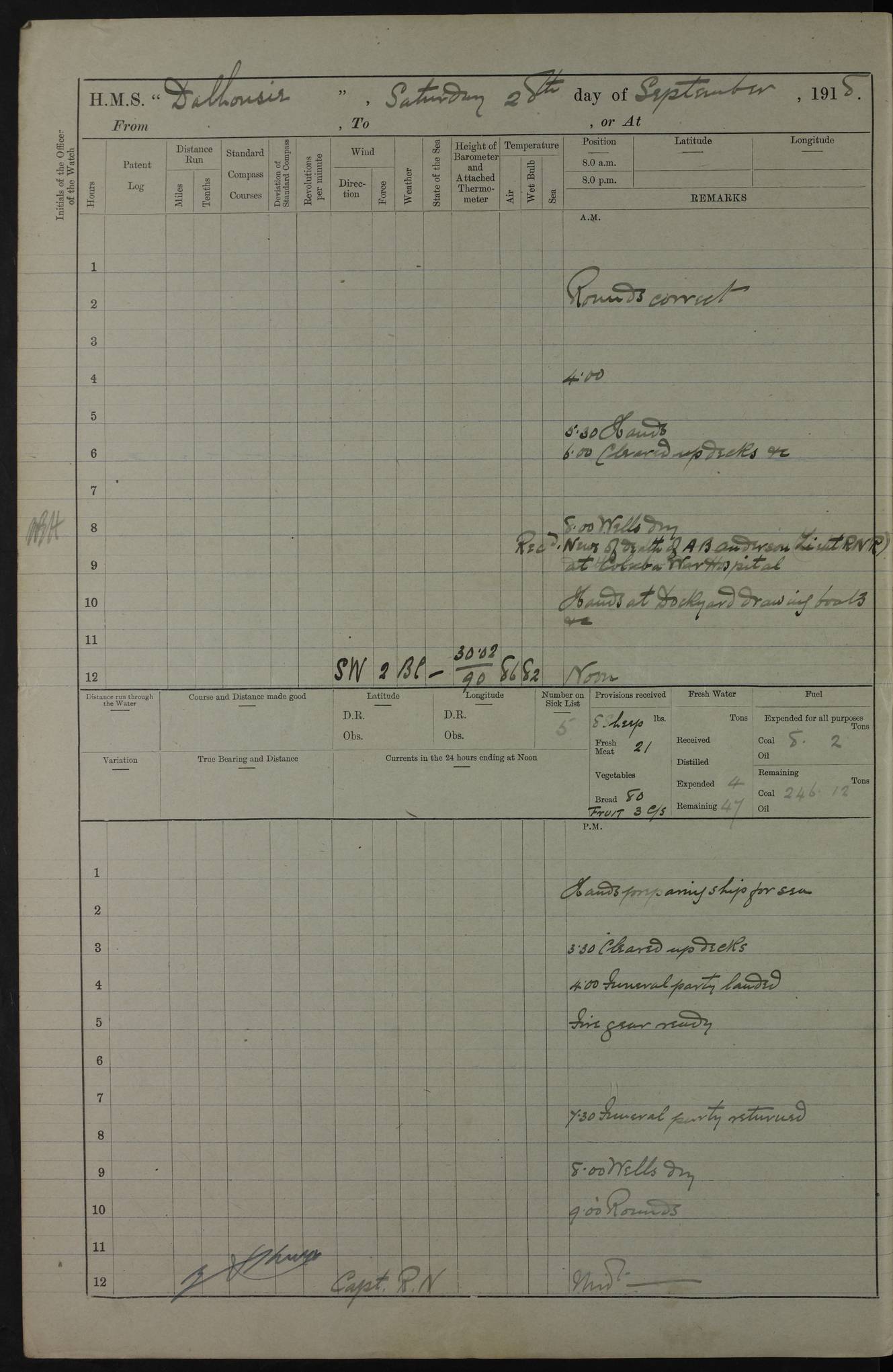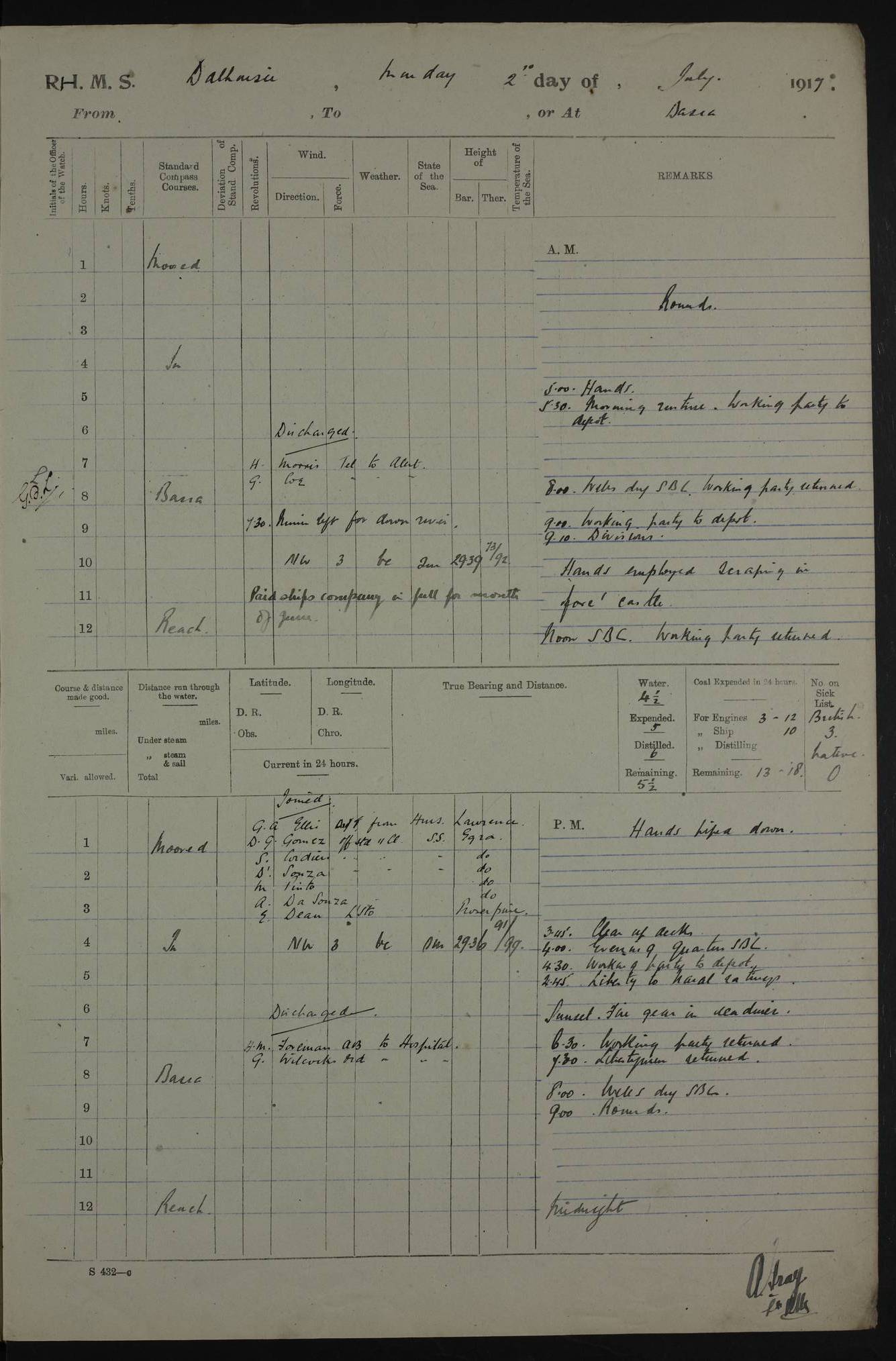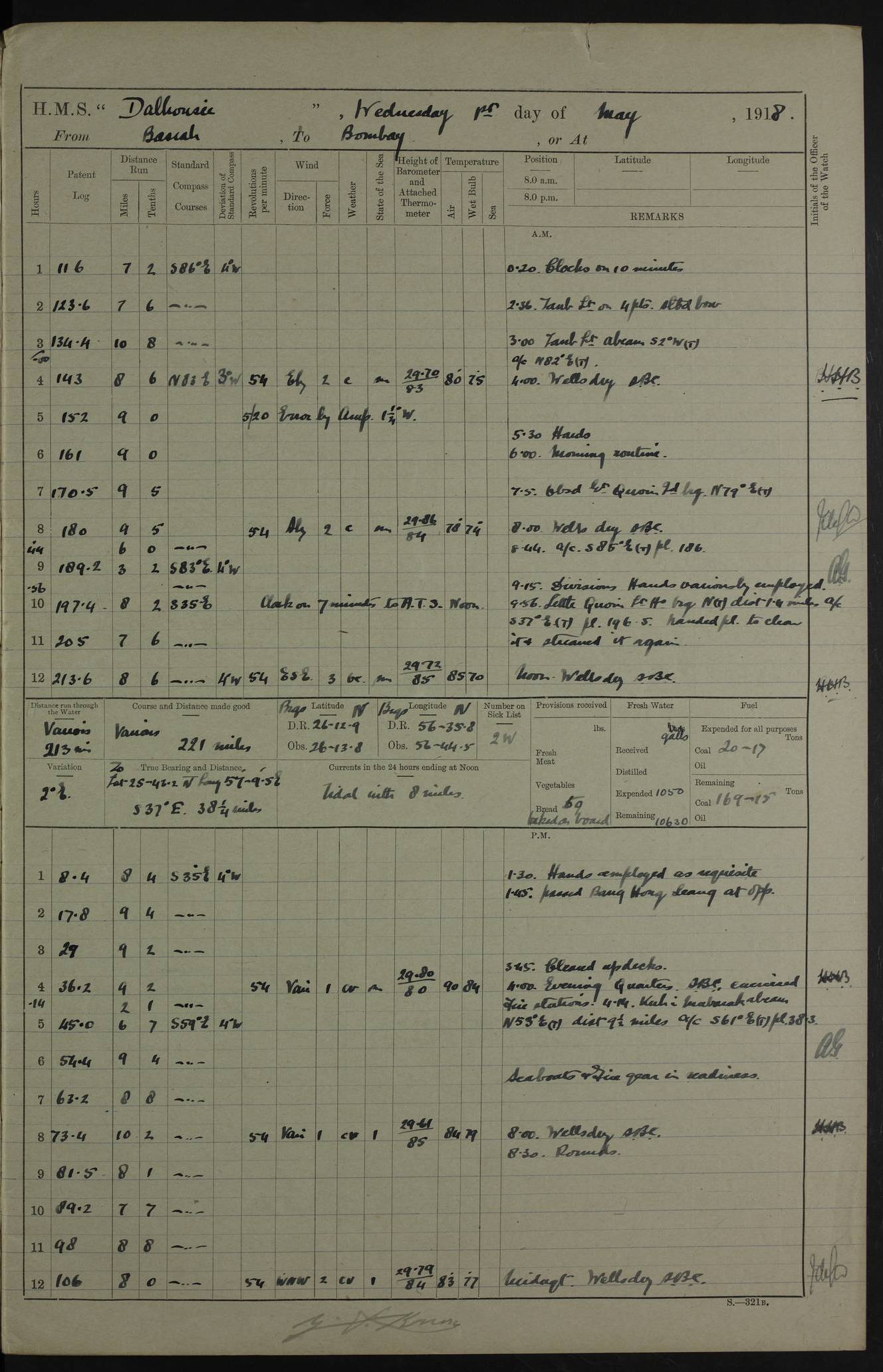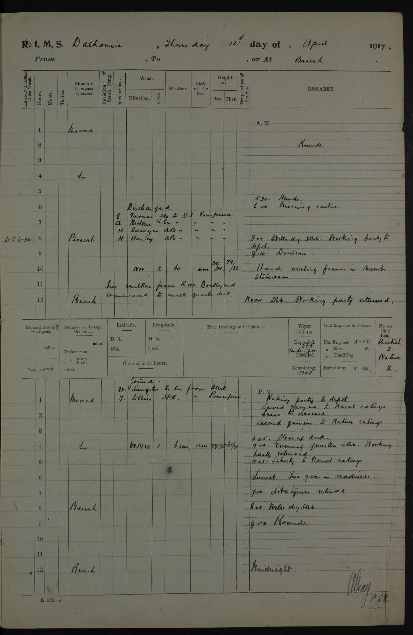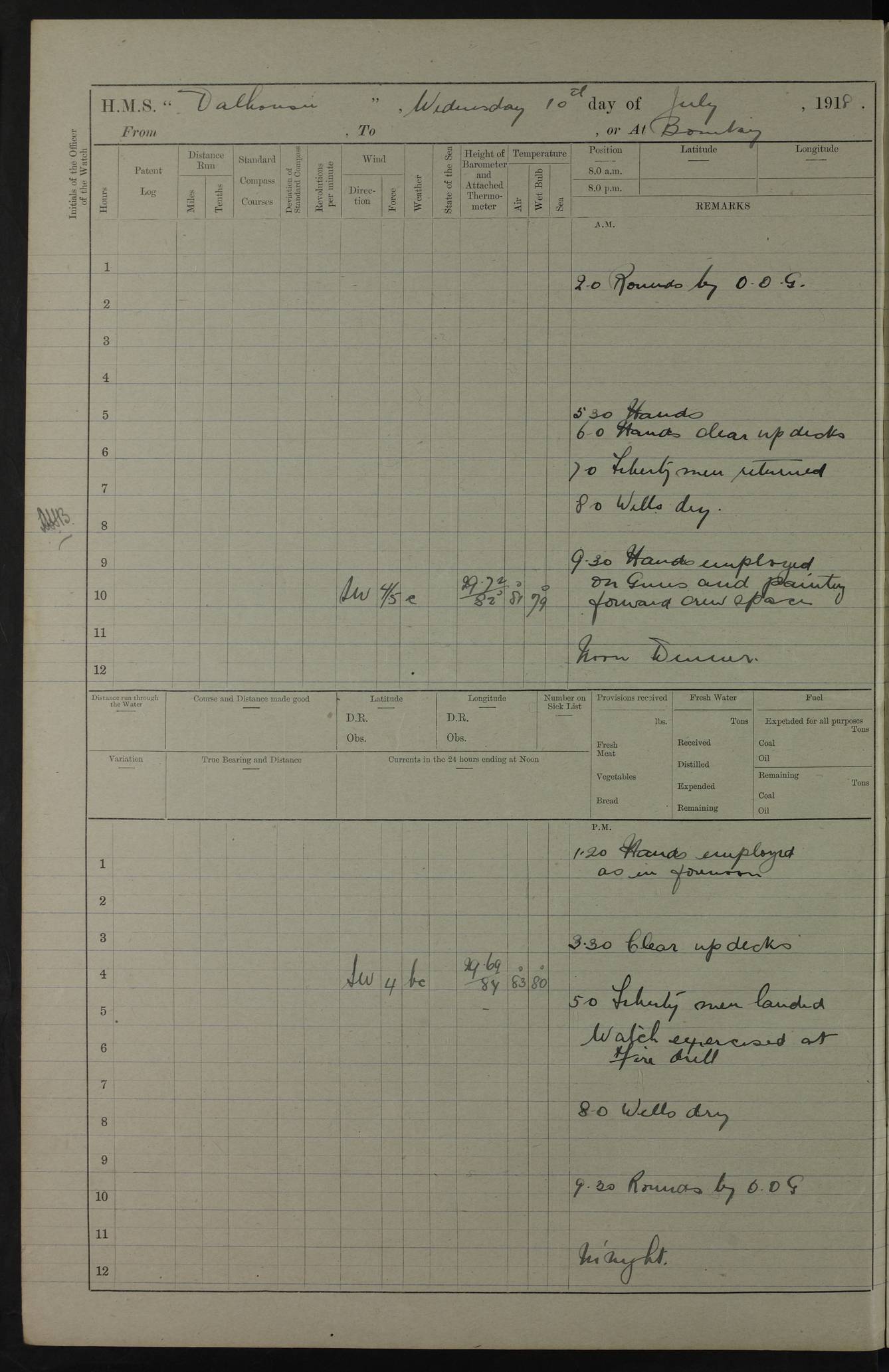 PM - Discharged To Hospital: H Widger, Engine Room Artificer - PW Harrison, Stoker Royal Navy Reserve To Motor Launch 11: J W Whitfield, Stoker 4ef4fa93e53e0a0c910056e2: (https://s3.amazonaws.com:443/oldweather/ADM53-39392/0018_0.jpg) 31 August 1916 Place: Basrah Lat 30.5269, Long 47.8407 2:00am: Rounds 5:05am: Hospital Ship SYRIA passed down 5:30am: Hands 6:00am: Morning Routine 8:00am: Wells dry – Signal Books Correct 9:30am: Divisions - Hands cleaning ship 11:00am: Drew Three Thousand Rupees from the Field treasury 12:00pm: Signal Books Correct – Issued Quinine to ship’s company 12:30pm: Piped Down 3:30pm: 4:00pm: Signal Books Correct 4:30pm: Cleared up decks 5:00pm: Evening Quarters – Leave to Watch of Naval Ratings 7:00pm: Sunset - Fire Gear in readiness 7:30pm: Liberty men returned 8:00pm: Wells dry - Signal Books Correct 9:00pm: Rounds - Signal Books Correct 11:00pm: Destroyed 19 tins Milk being unfit for use. AM – Joined From Motor Launch Depot: M. McMillan, Able Seaman From 5 Mess: T. Jackson, Petty Officer 1st From 4 Mess: T Golden, Stoker – J Tunney, Royal Navy Reserve Trawler Section From 10 Mess: J Donegan Royal Navy Reserve Trawler Section