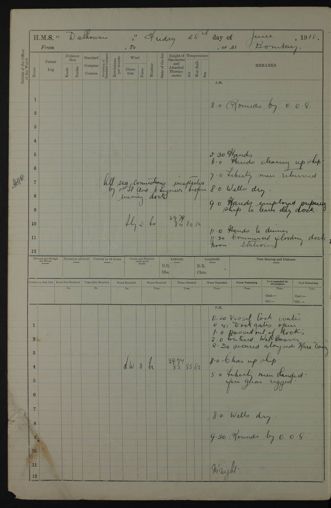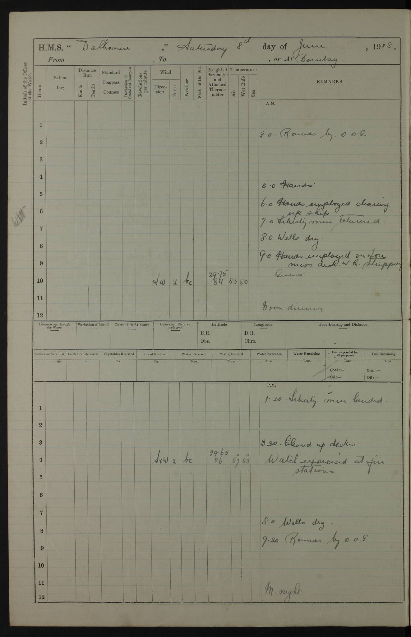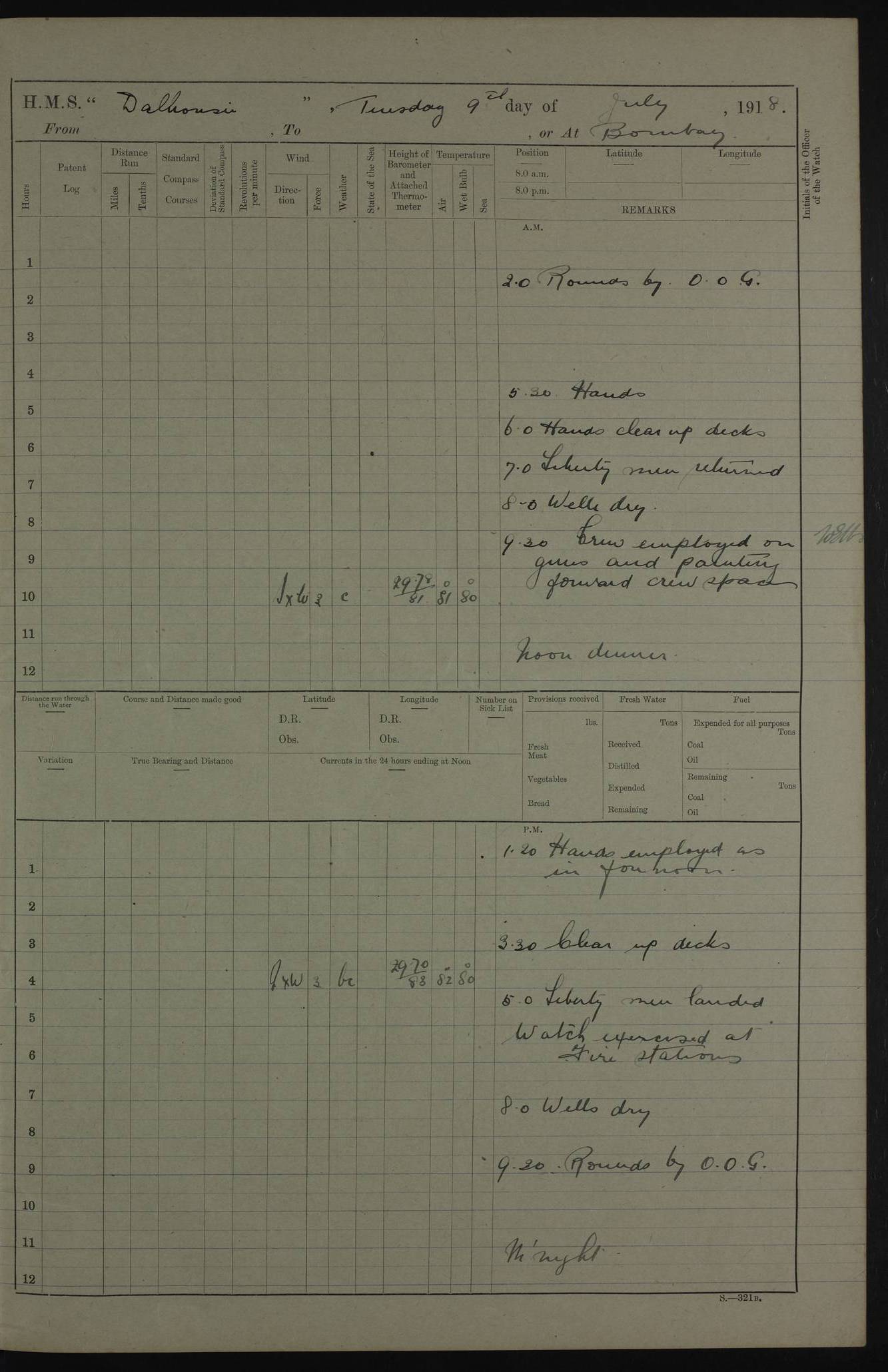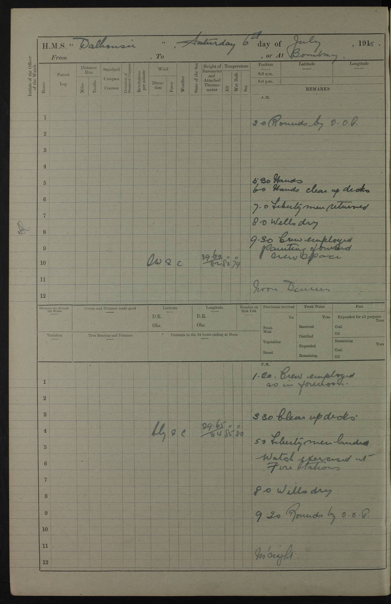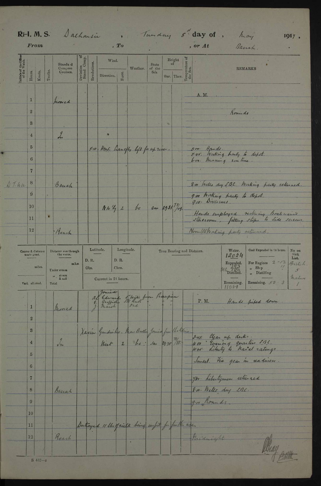 PM - Discharged To Hospital: H Widger, Engine Room Artificer - PW Harrison, Stoker Royal Navy Reserve To Motor Launch 11: J W Whitfield, Stoker 4ef4fa93e53e0a0c910056e2: (https://s3.amazonaws.com:443/oldweather/ADM53-39392/0018_0.jpg) 31 August 1916 Place: Basrah Lat 30.5269, Long 47.8407 2:00am: Rounds 5:05am: Hospital Ship SYRIA passed down 5:30am: Hands 6:00am: Morning Routine 8:00am: Wells dry – Signal Books Correct 9:30am: Divisions - Hands cleaning ship 11:00am: Drew Three Thousand Rupees from the Field treasury 12:00pm: Signal Books Correct – Issued Quinine to ship’s company 12:30pm: Piped Down 3:30pm: 4:00pm: Signal Books Correct 4:30pm: Cleared up decks 5:00pm: Evening Quarters – Leave to Watch of Naval Ratings 7:00pm: Sunset - Fire Gear in readiness 7:30pm: Liberty men returned 8:00pm: Wells dry - Signal Books Correct 9:00pm: Rounds - Signal Books Correct 11:00pm: Destroyed 19 tins Milk being unfit for use. AM – Joined From Motor Launch Depot: M. McMillan, Able Seaman From 5 Mess: T. Jackson, Petty Officer 1st From 4 Mess: T Golden, Stoker – J Tunney, Royal Navy Reserve Trawler Section From 10 Mess: J Donegan Royal Navy Reserve Trawler Section