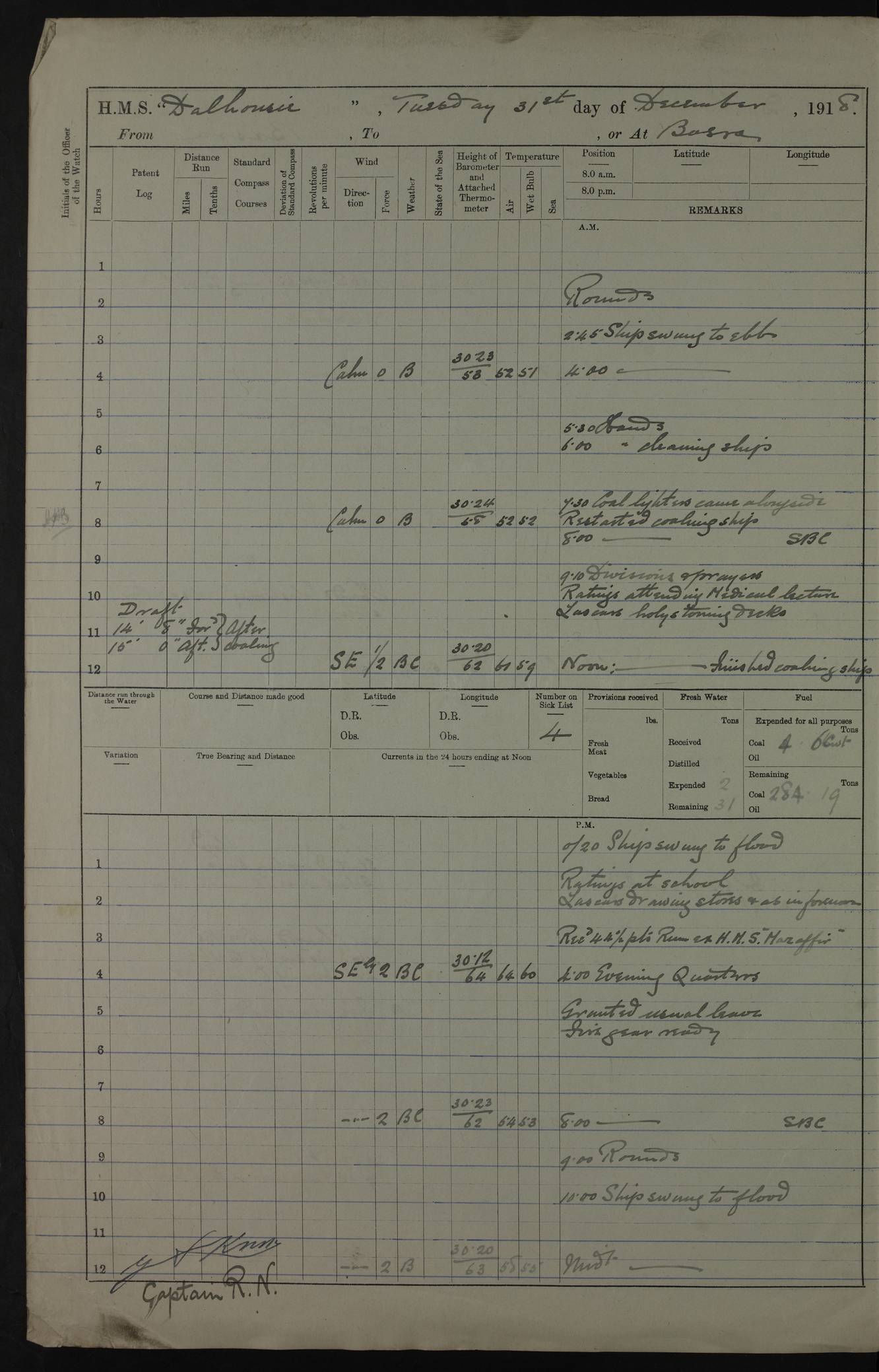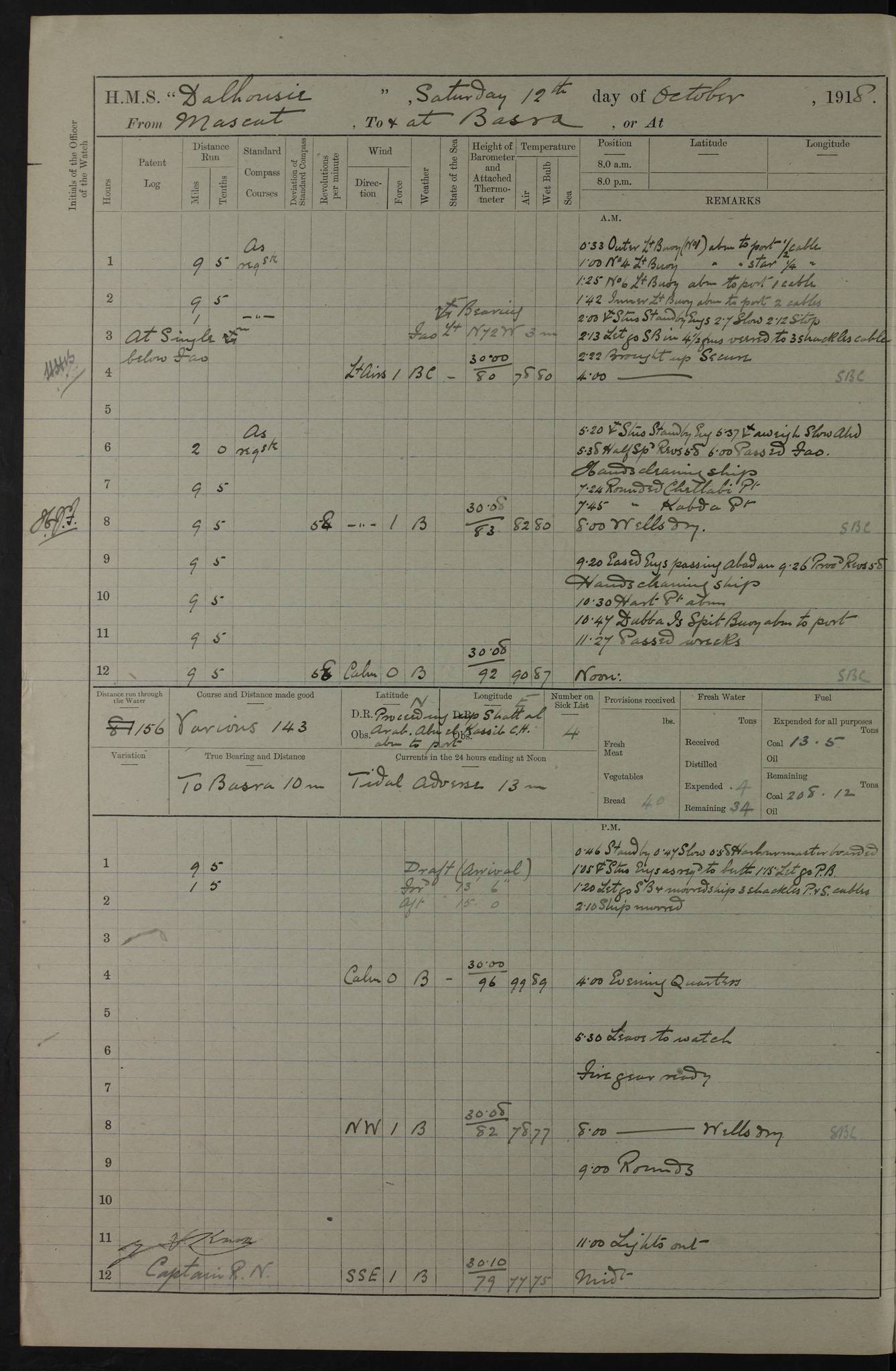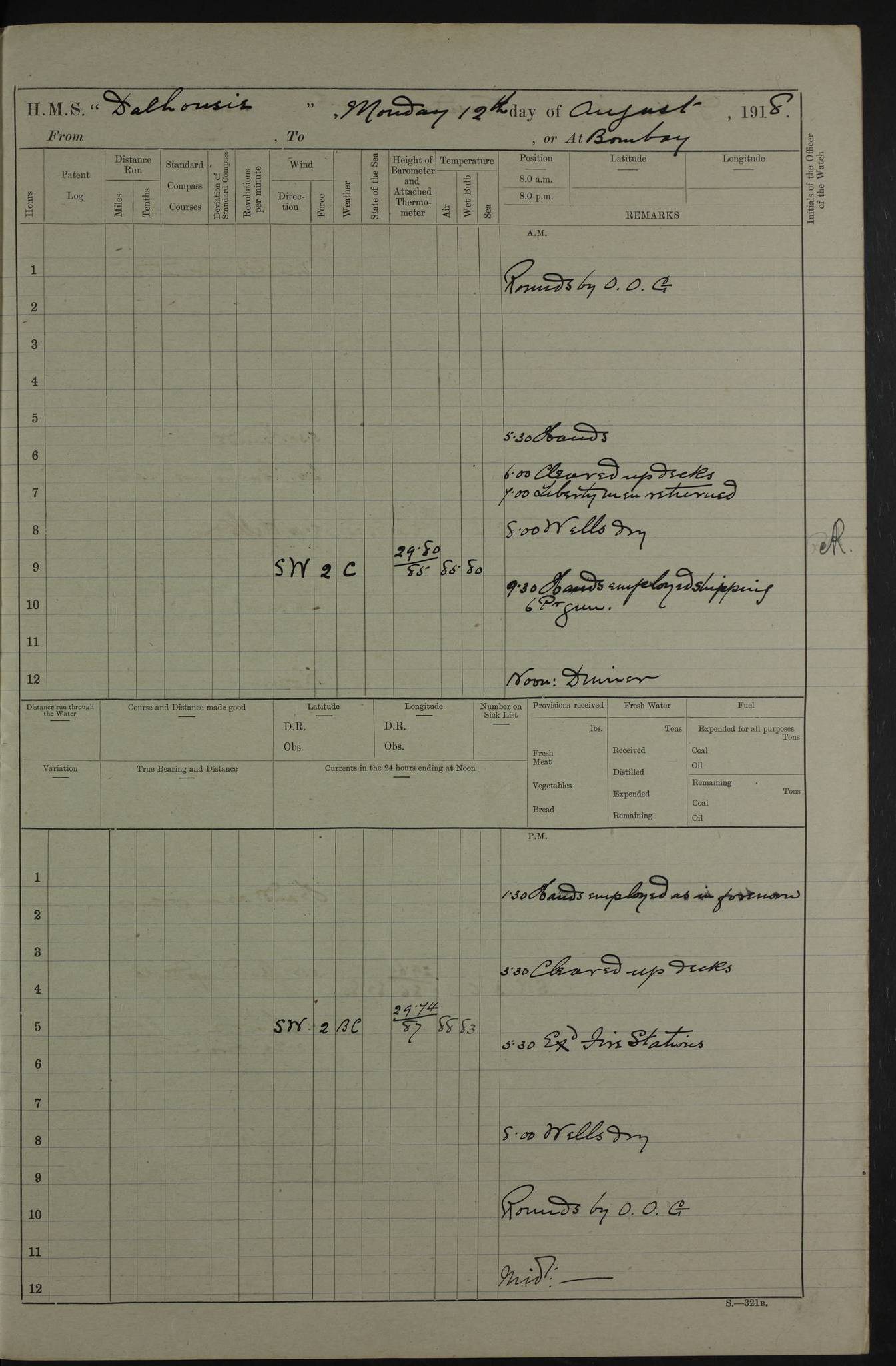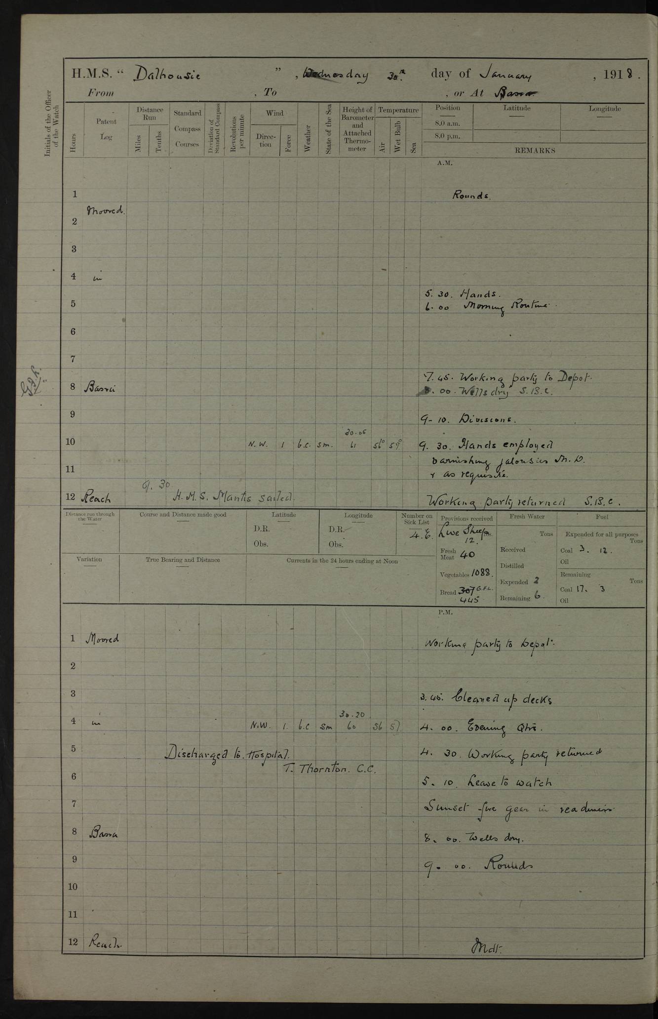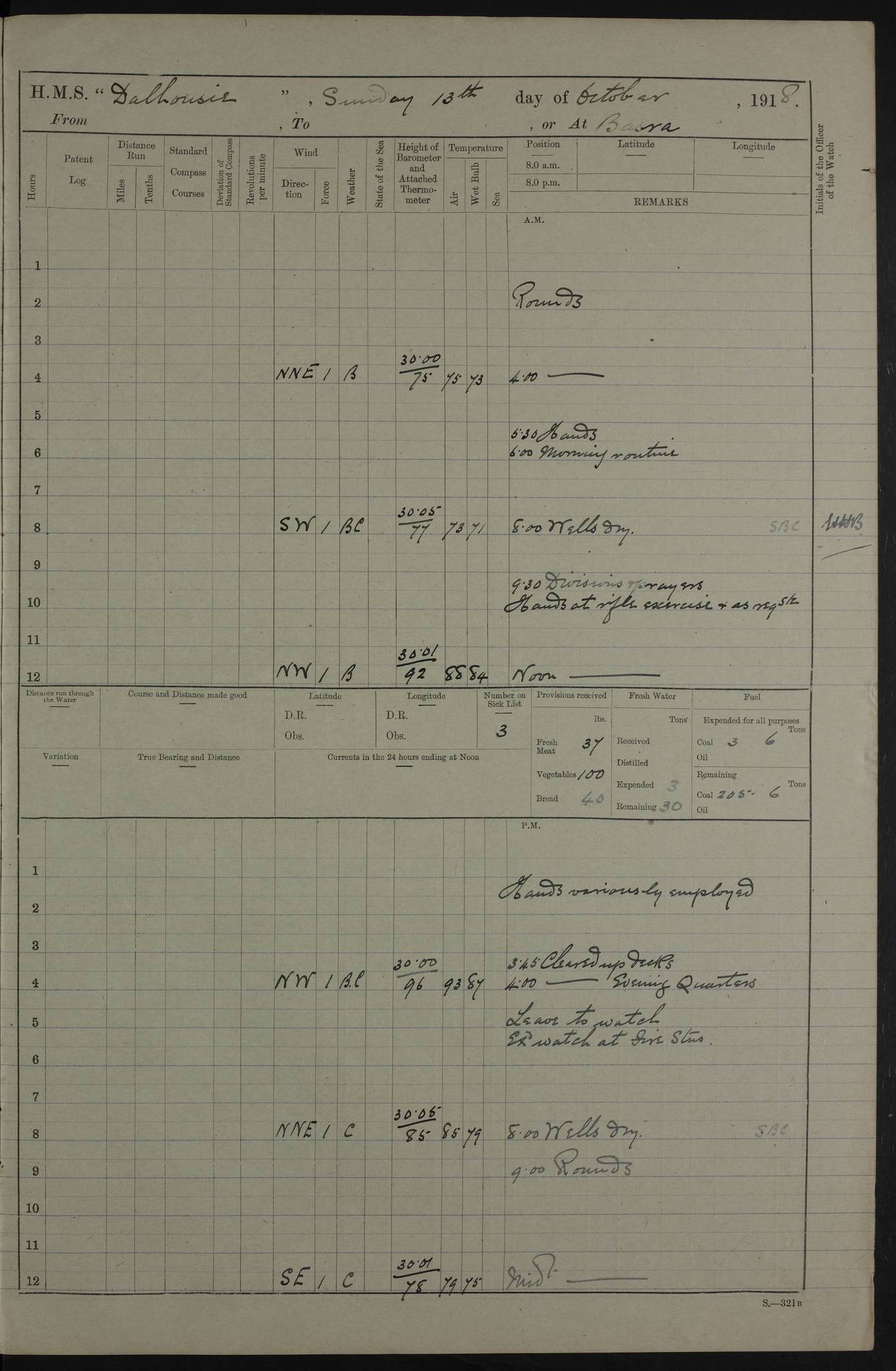 PM - Discharged To Hospital: H Widger, Engine Room Artificer - PW Harrison, Stoker Royal Navy Reserve To Motor Launch 11: J W Whitfield, Stoker 4ef4fa93e53e0a0c910056e2: (https://s3.amazonaws.com:443/oldweather/ADM53-39392/0018_0.jpg) 31 August 1916 Place: Basrah Lat 30.5269, Long 47.8407 2:00am: Rounds 5:05am: Hospital Ship SYRIA passed down 5:30am: Hands 6:00am: Morning Routine 8:00am: Wells dry – Signal Books Correct 9:30am: Divisions - Hands cleaning ship 11:00am: Drew Three Thousand Rupees from the Field treasury 12:00pm: Signal Books Correct – Issued Quinine to ship’s company 12:30pm: Piped Down 3:30pm: 4:00pm: Signal Books Correct 4:30pm: Cleared up decks 5:00pm: Evening Quarters – Leave to Watch of Naval Ratings 7:00pm: Sunset - Fire Gear in readiness 7:30pm: Liberty men returned 8:00pm: Wells dry - Signal Books Correct 9:00pm: Rounds - Signal Books Correct 11:00pm: Destroyed 19 tins Milk being unfit for use. AM – Joined From Motor Launch Depot: M. McMillan, Able Seaman From 5 Mess: T. Jackson, Petty Officer 1st From 4 Mess: T Golden, Stoker – J Tunney, Royal Navy Reserve Trawler Section From 10 Mess: J Donegan Royal Navy Reserve Trawler Section