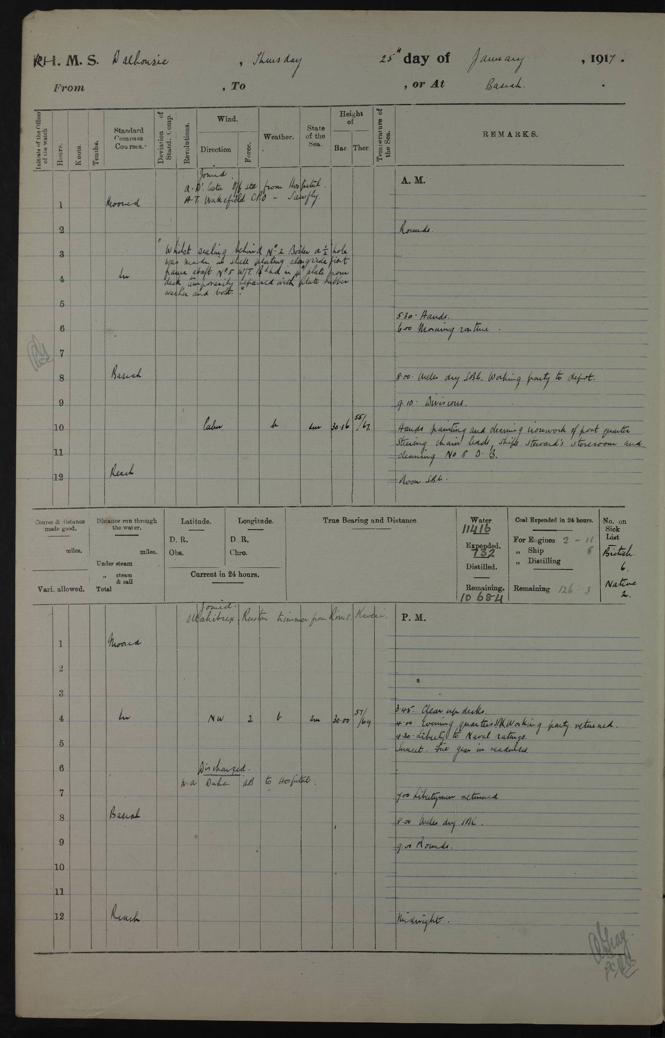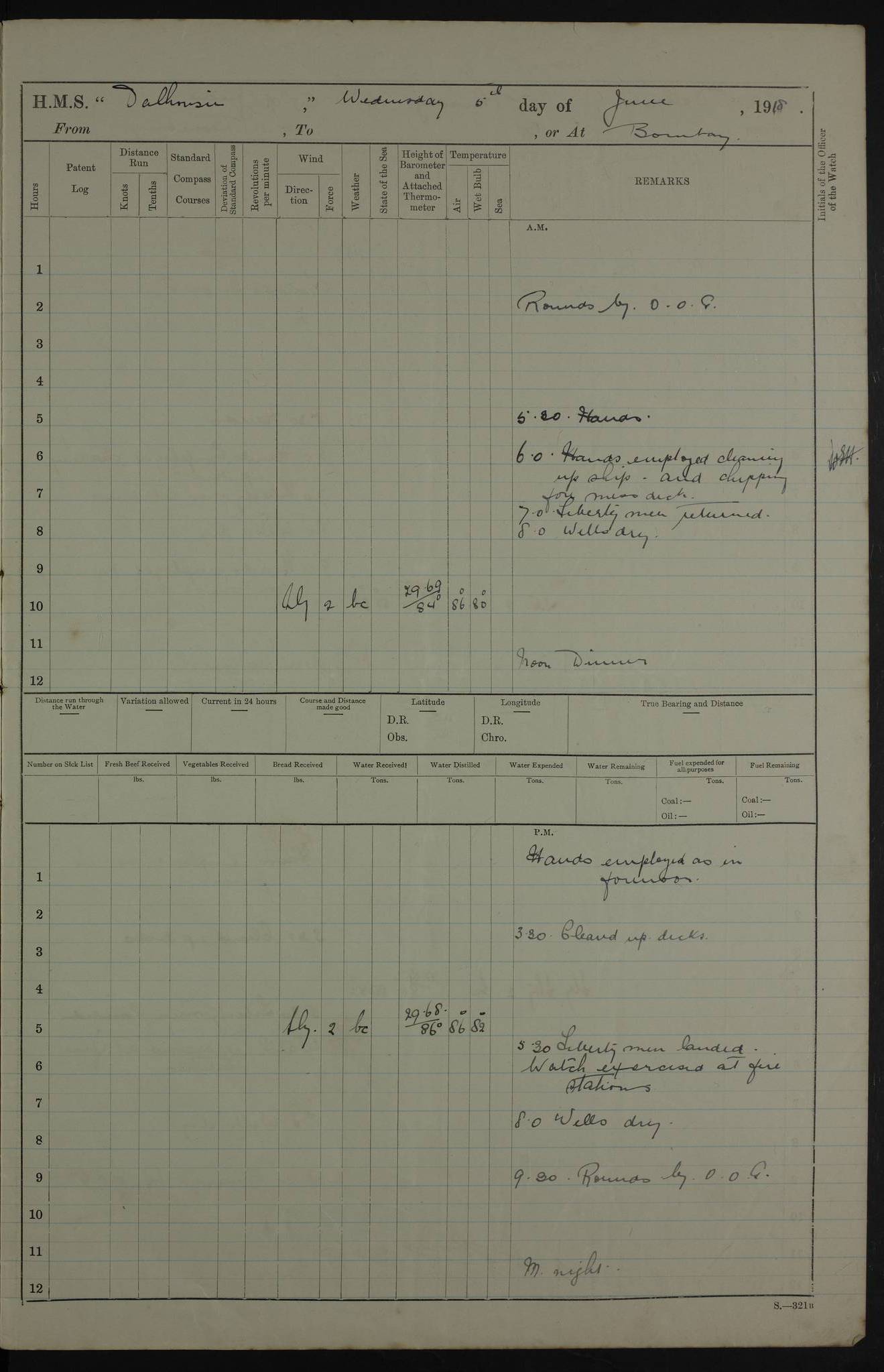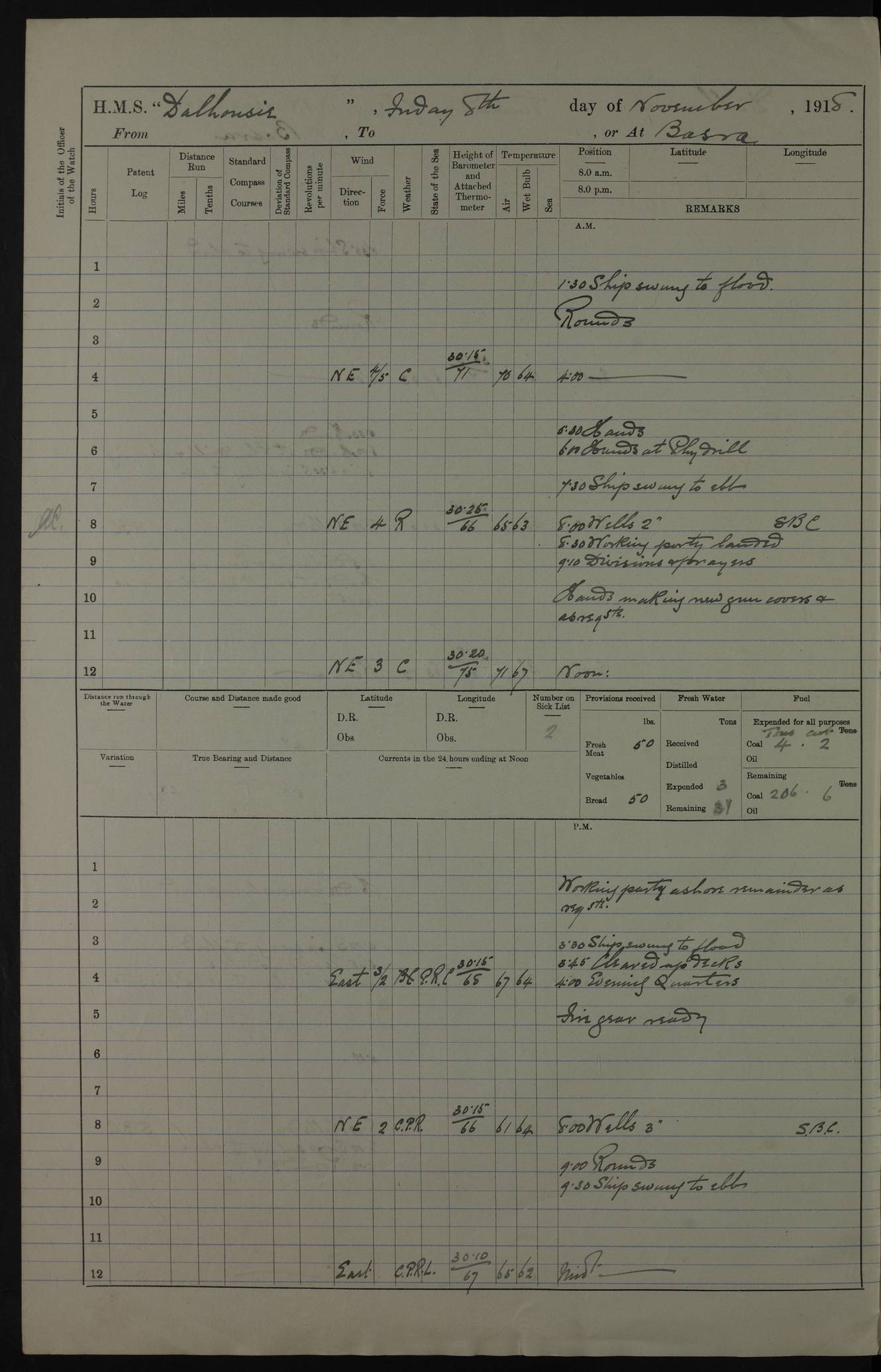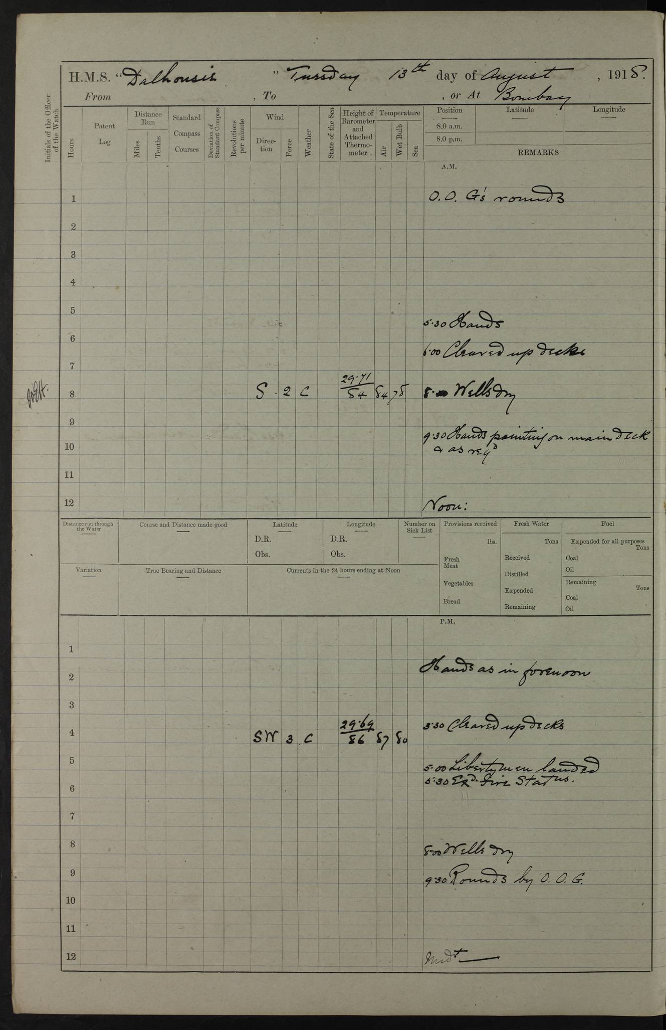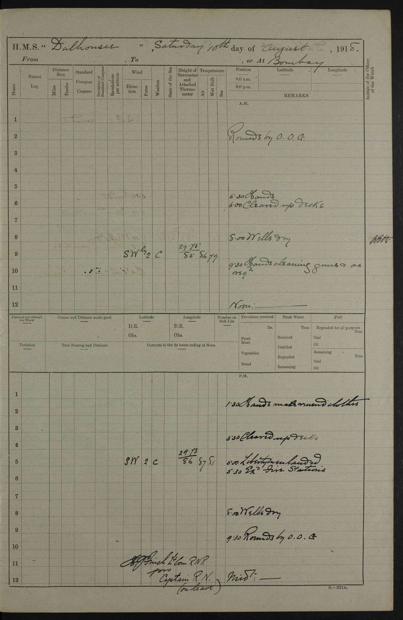 PM - Discharged To Hospital: H Widger, Engine Room Artificer - PW Harrison, Stoker Royal Navy Reserve To Motor Launch 11: J W Whitfield, Stoker 4ef4fa93e53e0a0c910056e2: (https://s3.amazonaws.com:443/oldweather/ADM53-39392/0018_0.jpg) 31 August 1916 Place: Basrah Lat 30.5269, Long 47.8407 2:00am: Rounds 5:05am: Hospital Ship SYRIA passed down 5:30am: Hands 6:00am: Morning Routine 8:00am: Wells dry – Signal Books Correct 9:30am: Divisions - Hands cleaning ship 11:00am: Drew Three Thousand Rupees from the Field treasury 12:00pm: Signal Books Correct – Issued Quinine to ship’s company 12:30pm: Piped Down 3:30pm: 4:00pm: Signal Books Correct 4:30pm: Cleared up decks 5:00pm: Evening Quarters – Leave to Watch of Naval Ratings 7:00pm: Sunset - Fire Gear in readiness 7:30pm: Liberty men returned 8:00pm: Wells dry - Signal Books Correct 9:00pm: Rounds - Signal Books Correct 11:00pm: Destroyed 19 tins Milk being unfit for use. AM – Joined From Motor Launch Depot: M. McMillan, Able Seaman From 5 Mess: T. Jackson, Petty Officer 1st From 4 Mess: T Golden, Stoker – J Tunney, Royal Navy Reserve Trawler Section From 10 Mess: J Donegan Royal Navy Reserve Trawler Section
