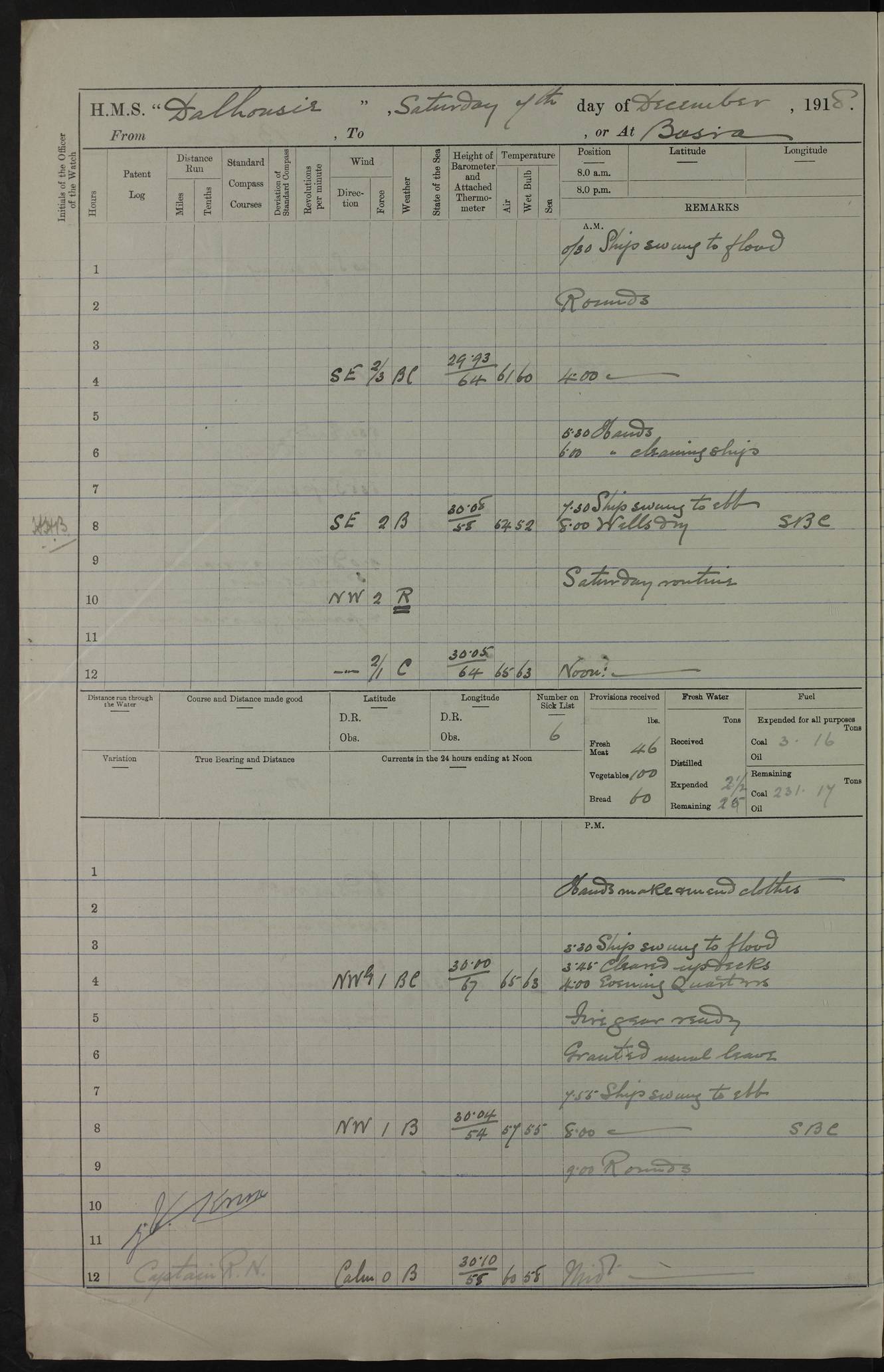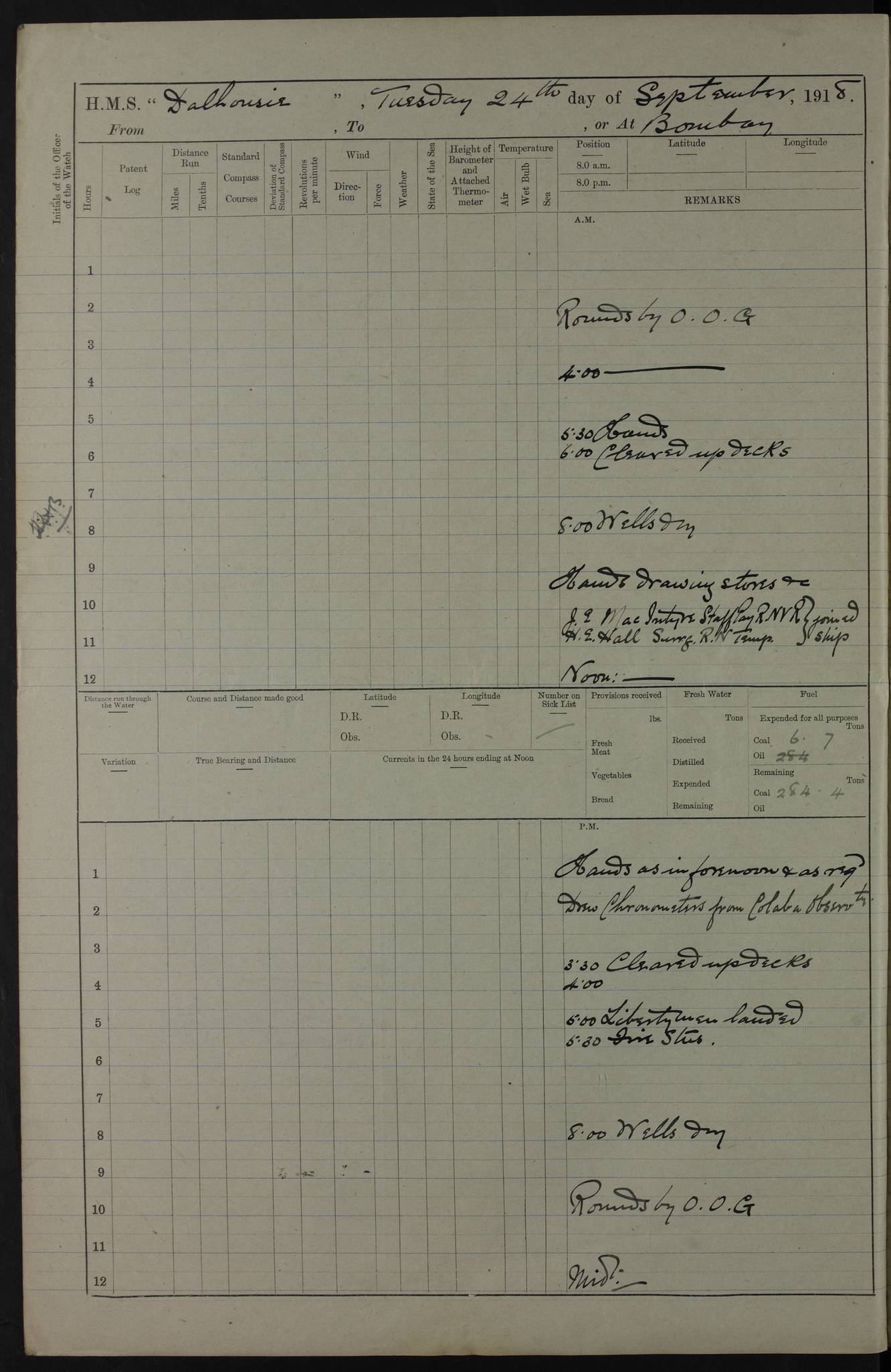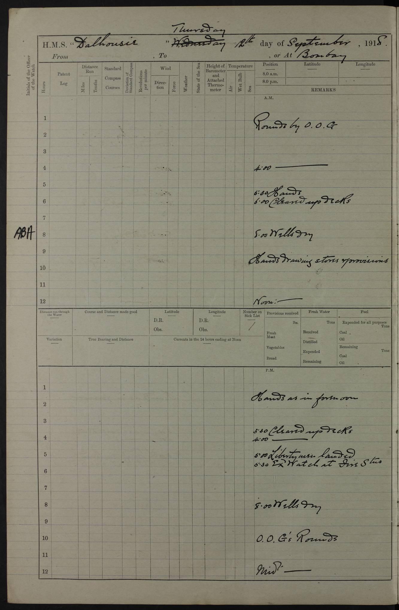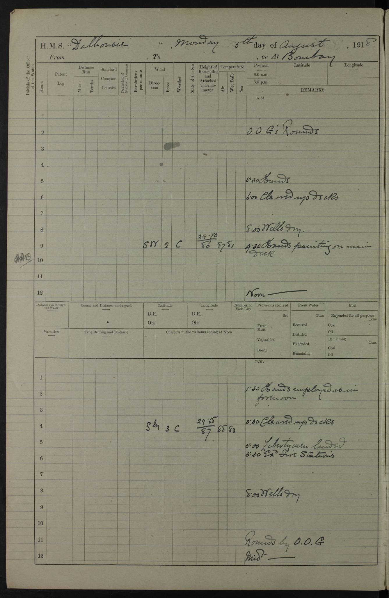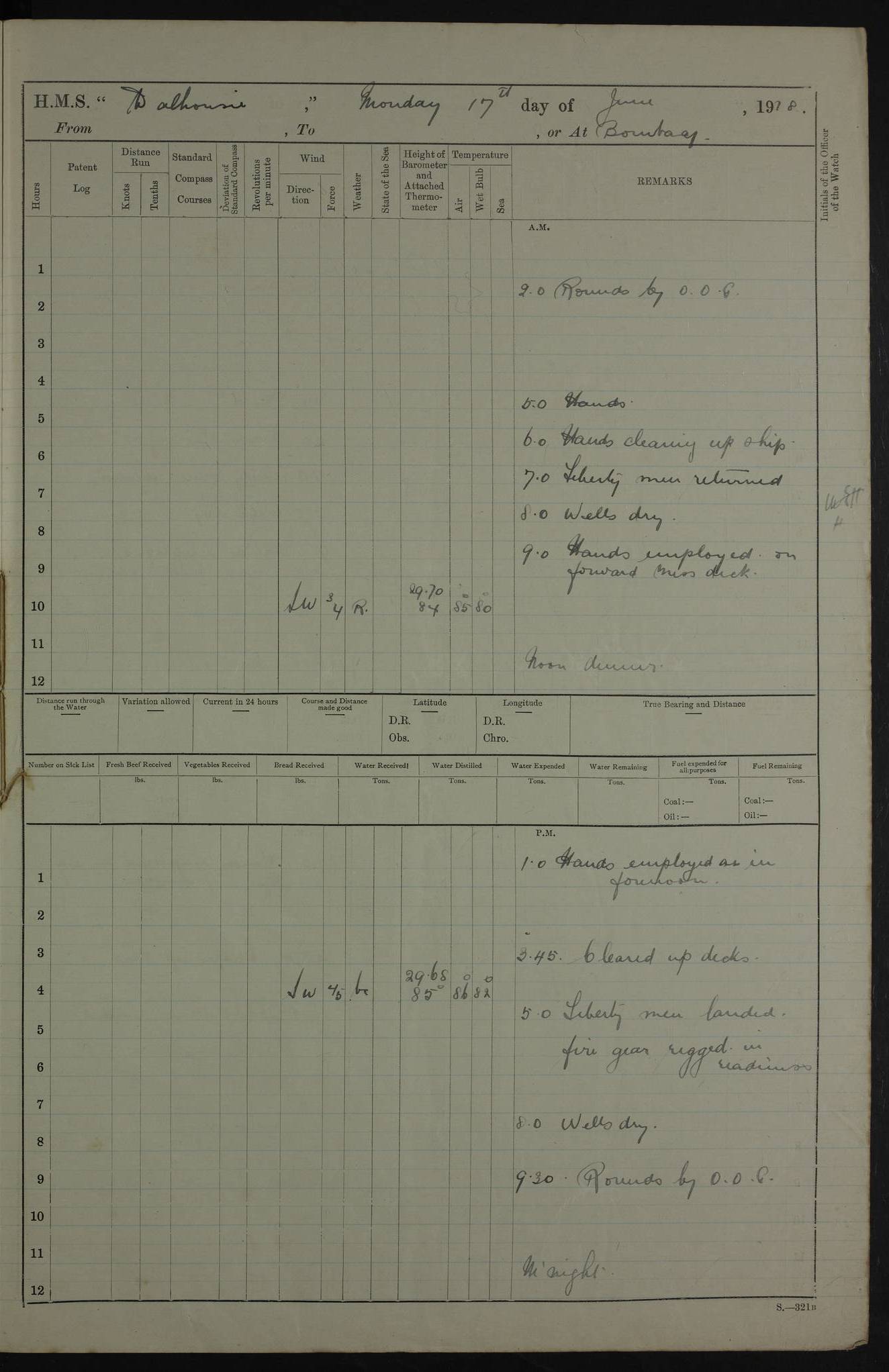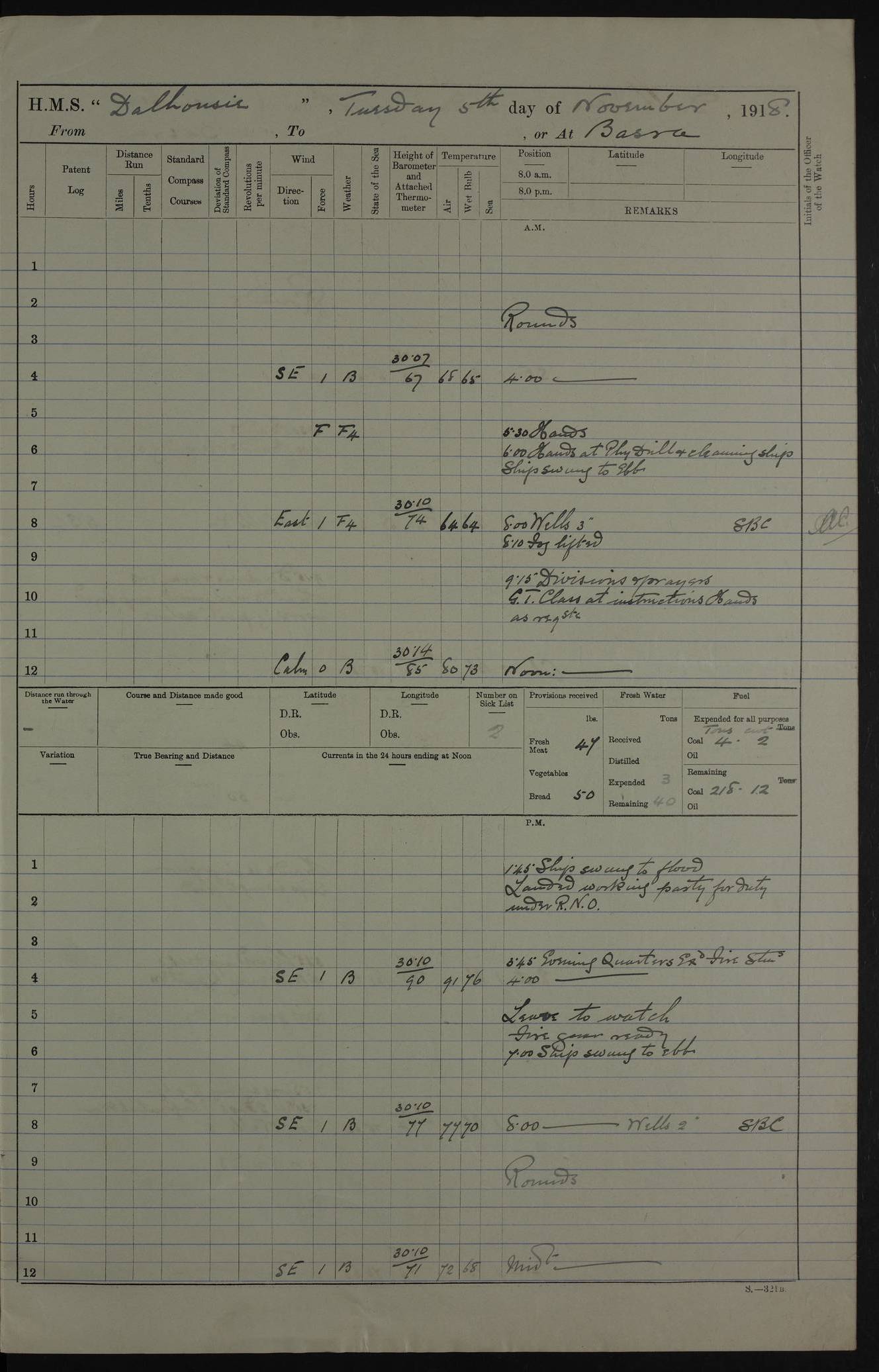 PM - Discharged To Hospital: H Widger, Engine Room Artificer - PW Harrison, Stoker Royal Navy Reserve To Motor Launch 11: J W Whitfield, Stoker 4ef4fa93e53e0a0c910056e2: (https://s3.amazonaws.com:443/oldweather/ADM53-39392/0018_0.jpg) 31 August 1916 Place: Basrah Lat 30.5269, Long 47.8407 2:00am: Rounds 5:05am: Hospital Ship SYRIA passed down 5:30am: Hands 6:00am: Morning Routine 8:00am: Wells dry – Signal Books Correct 9:30am: Divisions - Hands cleaning ship 11:00am: Drew Three Thousand Rupees from the Field treasury 12:00pm: Signal Books Correct – Issued Quinine to ship’s company 12:30pm: Piped Down 3:30pm: 4:00pm: Signal Books Correct 4:30pm: Cleared up decks 5:00pm: Evening Quarters – Leave to Watch of Naval Ratings 7:00pm: Sunset - Fire Gear in readiness 7:30pm: Liberty men returned 8:00pm: Wells dry - Signal Books Correct 9:00pm: Rounds - Signal Books Correct 11:00pm: Destroyed 19 tins Milk being unfit for use. AM – Joined From Motor Launch Depot: M. McMillan, Able Seaman From 5 Mess: T. Jackson, Petty Officer 1st From 4 Mess: T Golden, Stoker – J Tunney, Royal Navy Reserve Trawler Section From 10 Mess: J Donegan Royal Navy Reserve Trawler Section