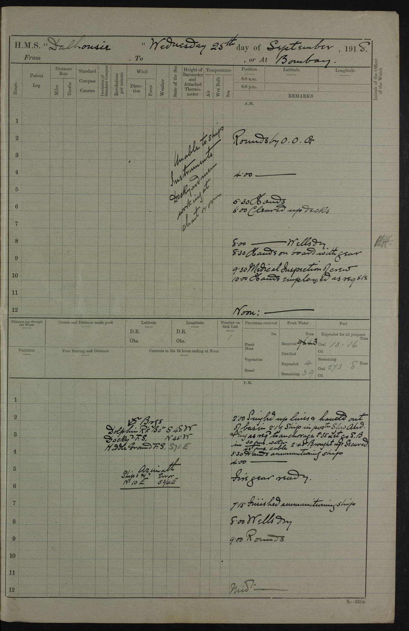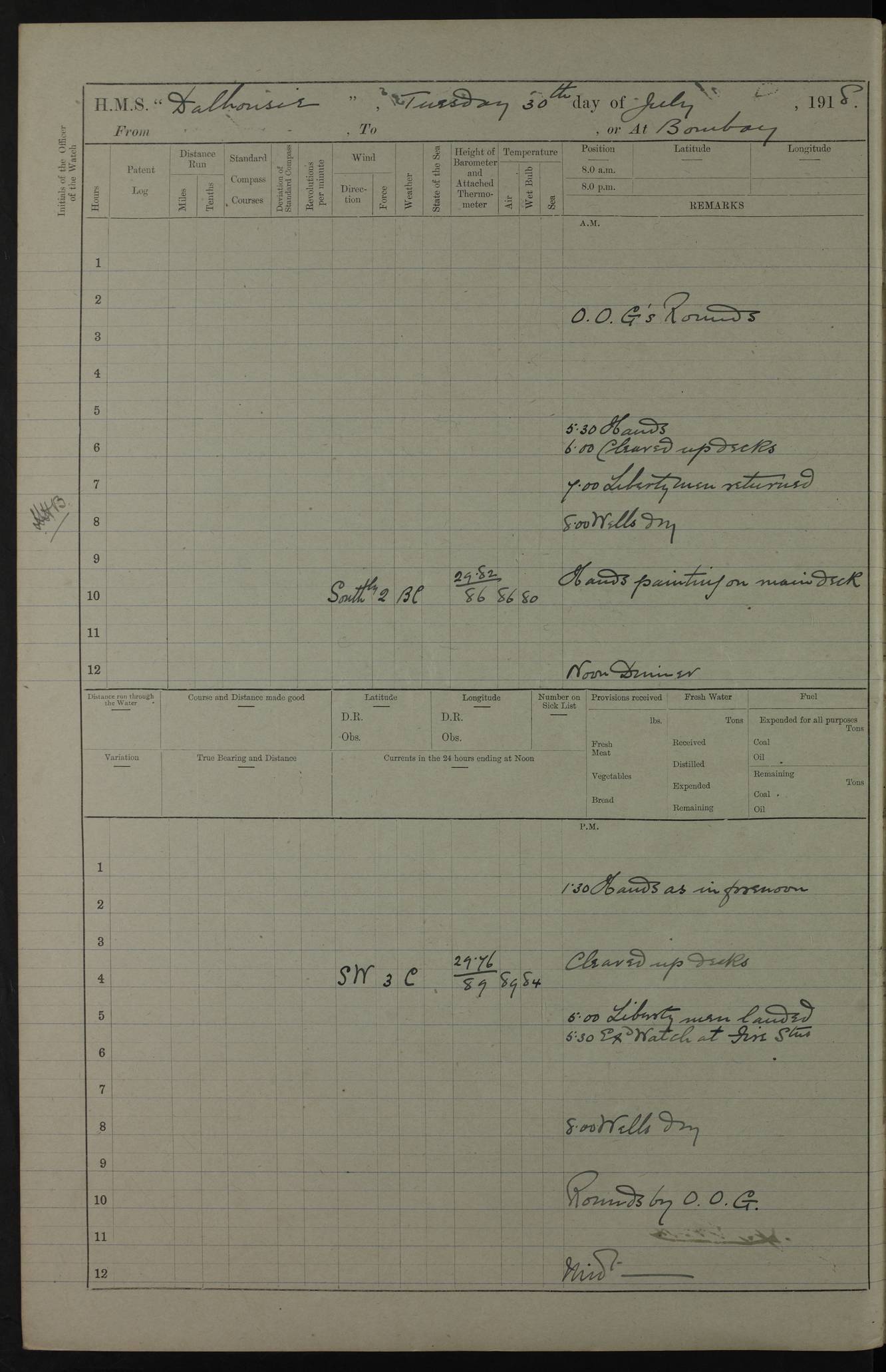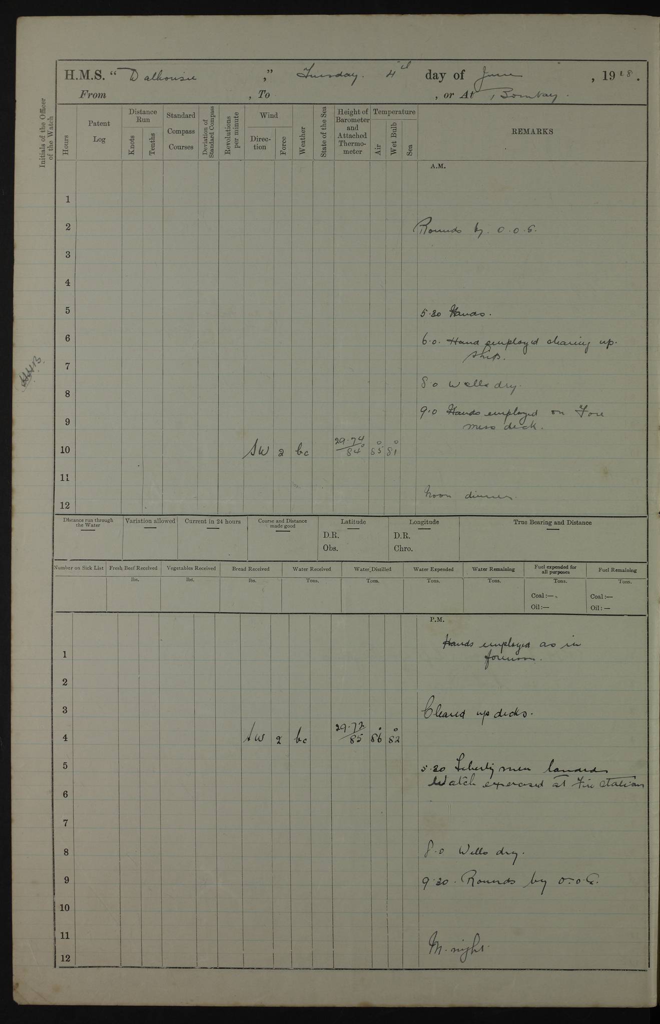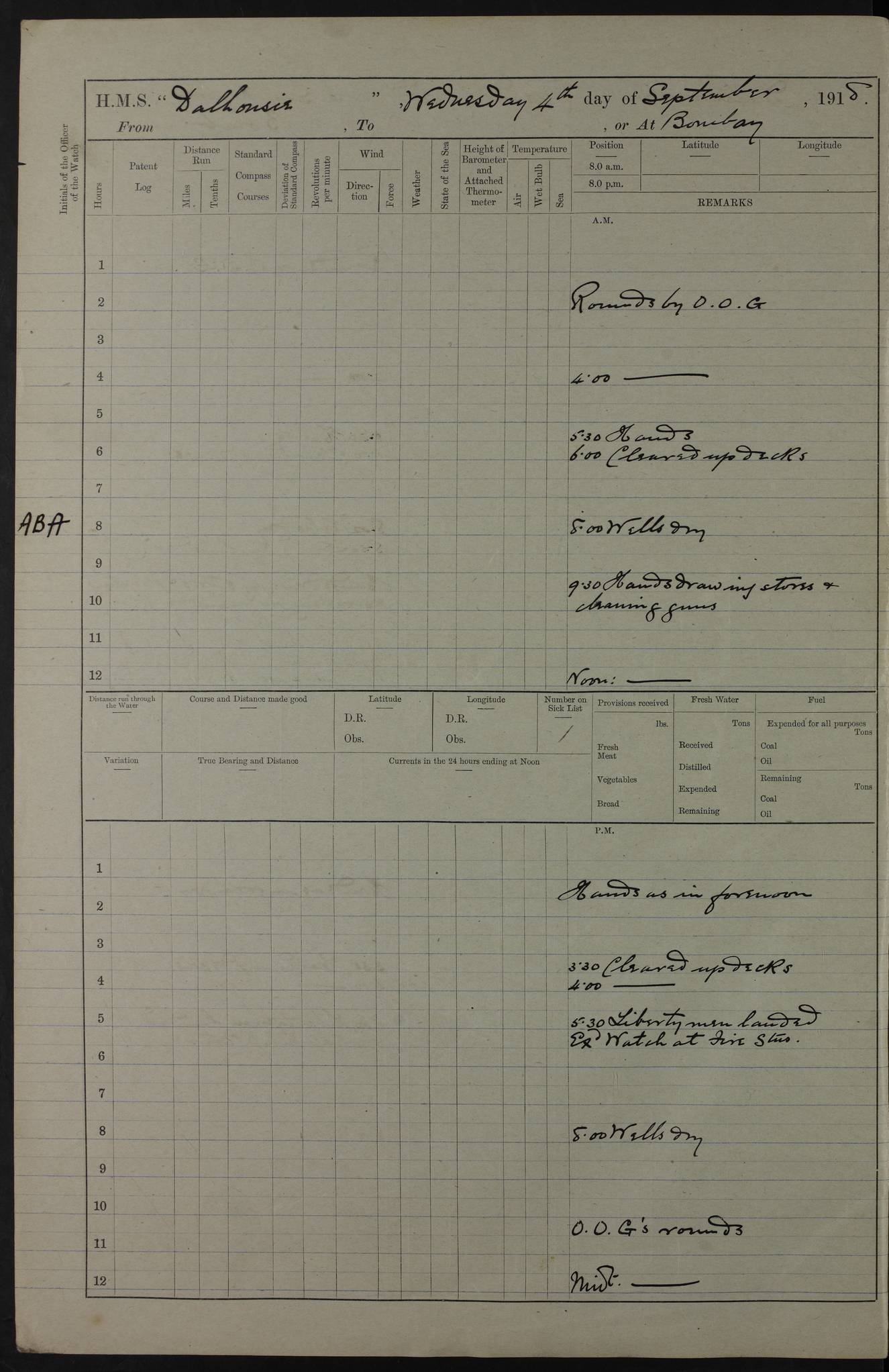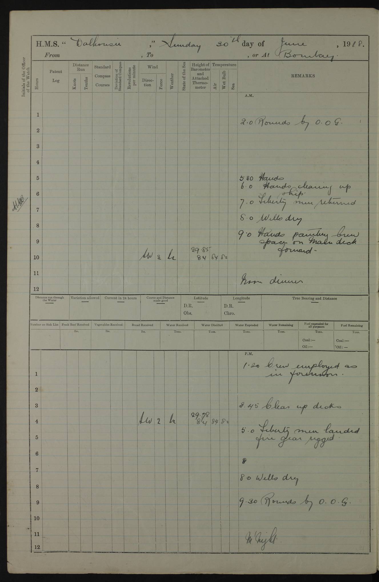 PM - Discharged To Hospital: H Widger, Engine Room Artificer - PW Harrison, Stoker Royal Navy Reserve To Motor Launch 11: J W Whitfield, Stoker 4ef4fa93e53e0a0c910056e2: (https://s3.amazonaws.com:443/oldweather/ADM53-39392/0018_0.jpg) 31 August 1916 Place: Basrah Lat 30.5269, Long 47.8407 2:00am: Rounds 5:05am: Hospital Ship SYRIA passed down 5:30am: Hands 6:00am: Morning Routine 8:00am: Wells dry – Signal Books Correct 9:30am: Divisions - Hands cleaning ship 11:00am: Drew Three Thousand Rupees from the Field treasury 12:00pm: Signal Books Correct – Issued Quinine to ship’s company 12:30pm: Piped Down 3:30pm: 4:00pm: Signal Books Correct 4:30pm: Cleared up decks 5:00pm: Evening Quarters – Leave to Watch of Naval Ratings 7:00pm: Sunset - Fire Gear in readiness 7:30pm: Liberty men returned 8:00pm: Wells dry - Signal Books Correct 9:00pm: Rounds - Signal Books Correct 11:00pm: Destroyed 19 tins Milk being unfit for use. AM – Joined From Motor Launch Depot: M. McMillan, Able Seaman From 5 Mess: T. Jackson, Petty Officer 1st From 4 Mess: T Golden, Stoker – J Tunney, Royal Navy Reserve Trawler Section From 10 Mess: J Donegan Royal Navy Reserve Trawler Section