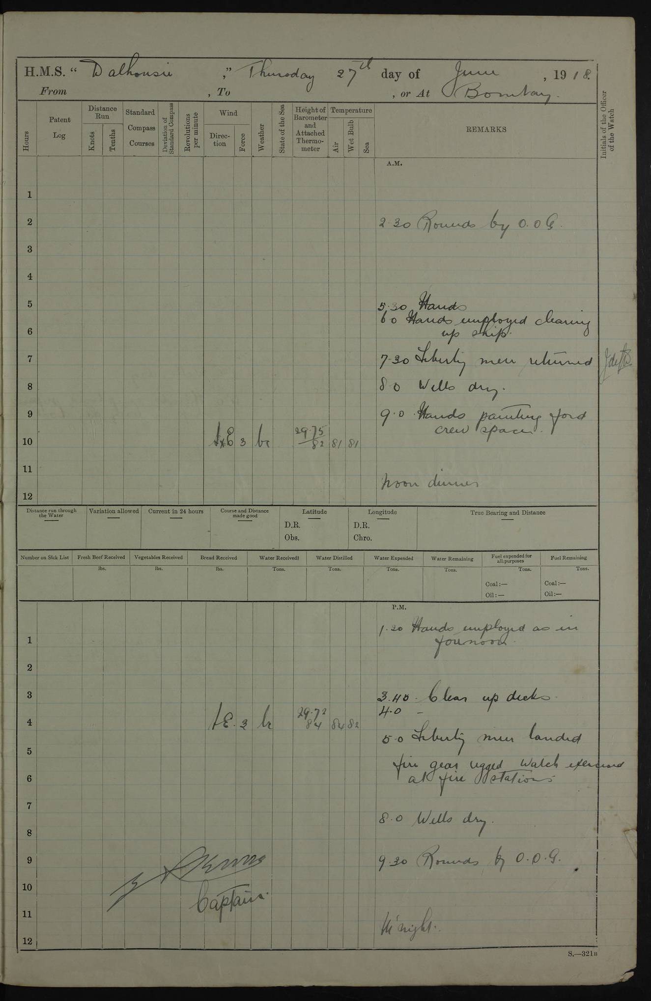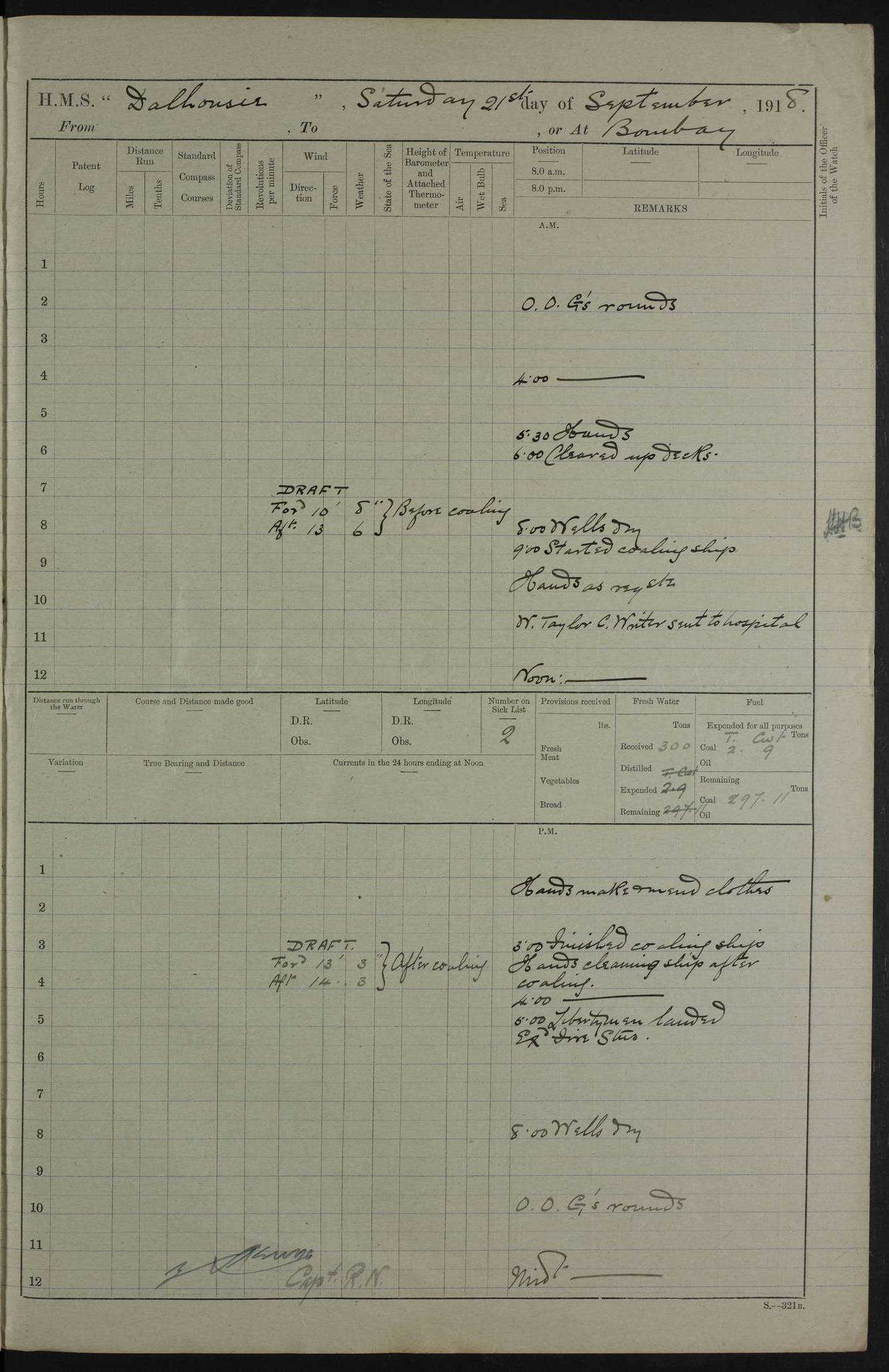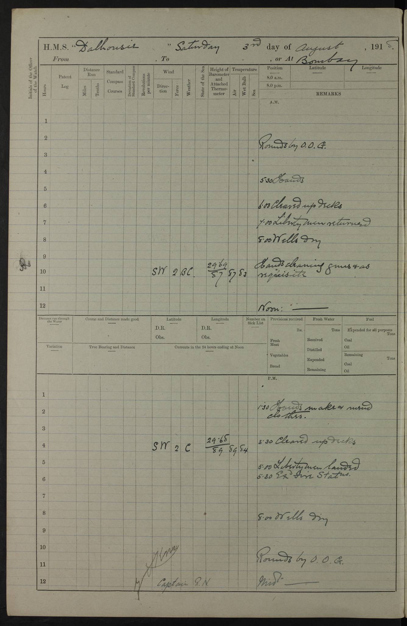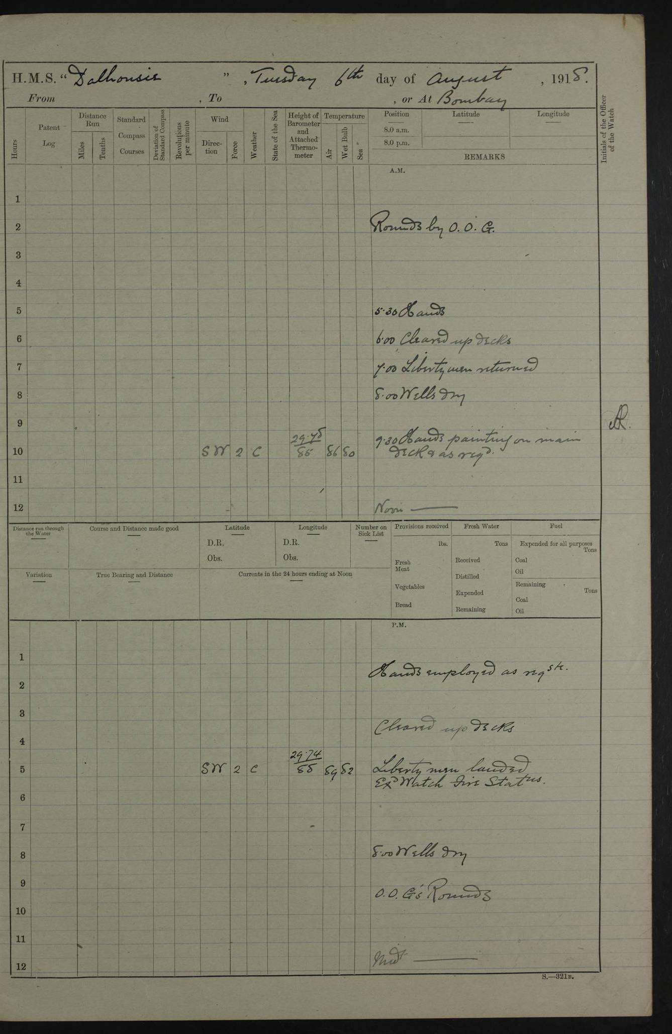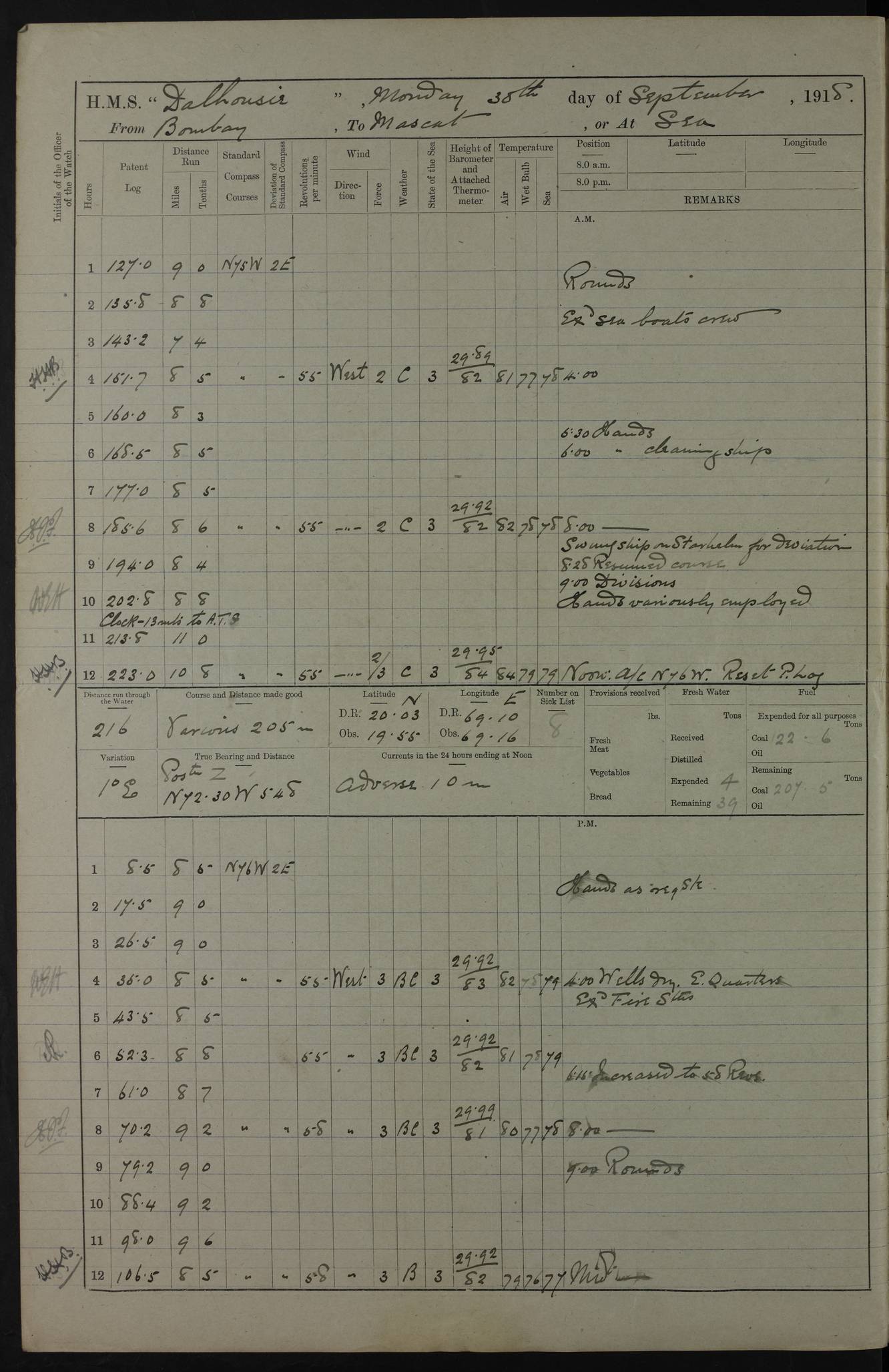 PM - Discharged To Hospital: H Widger, Engine Room Artificer - PW Harrison, Stoker Royal Navy Reserve To Motor Launch 11: J W Whitfield, Stoker 4ef4fa93e53e0a0c910056e2: (https://s3.amazonaws.com:443/oldweather/ADM53-39392/0018_0.jpg) 31 August 1916 Place: Basrah Lat 30.5269, Long 47.8407 2:00am: Rounds 5:05am: Hospital Ship SYRIA passed down 5:30am: Hands 6:00am: Morning Routine 8:00am: Wells dry – Signal Books Correct 9:30am: Divisions - Hands cleaning ship 11:00am: Drew Three Thousand Rupees from the Field treasury 12:00pm: Signal Books Correct – Issued Quinine to ship’s company 12:30pm: Piped Down 3:30pm: 4:00pm: Signal Books Correct 4:30pm: Cleared up decks 5:00pm: Evening Quarters – Leave to Watch of Naval Ratings 7:00pm: Sunset - Fire Gear in readiness 7:30pm: Liberty men returned 8:00pm: Wells dry - Signal Books Correct 9:00pm: Rounds - Signal Books Correct 11:00pm: Destroyed 19 tins Milk being unfit for use. AM – Joined From Motor Launch Depot: M. McMillan, Able Seaman From 5 Mess: T. Jackson, Petty Officer 1st From 4 Mess: T Golden, Stoker – J Tunney, Royal Navy Reserve Trawler Section From 10 Mess: J Donegan Royal Navy Reserve Trawler Section