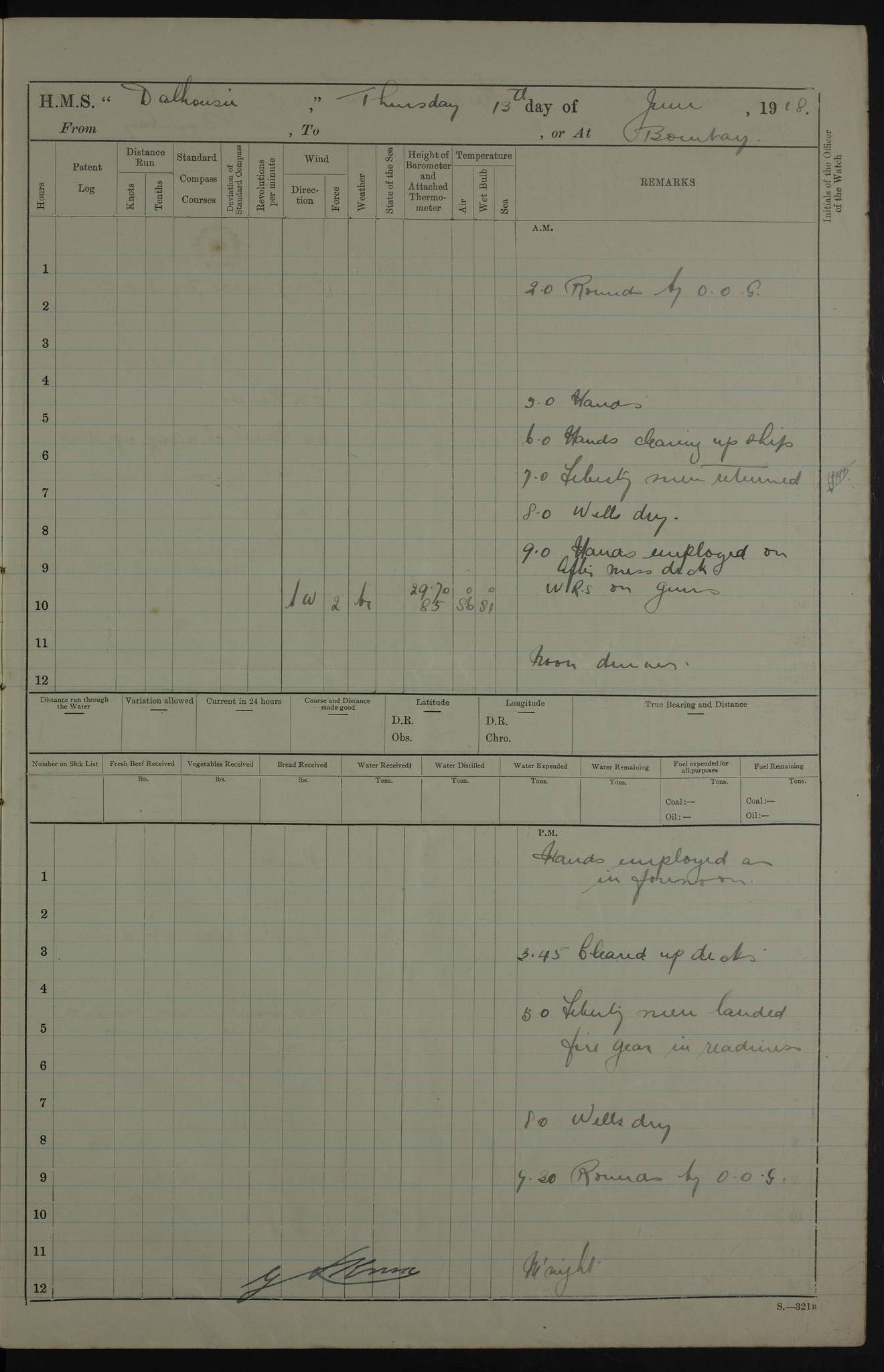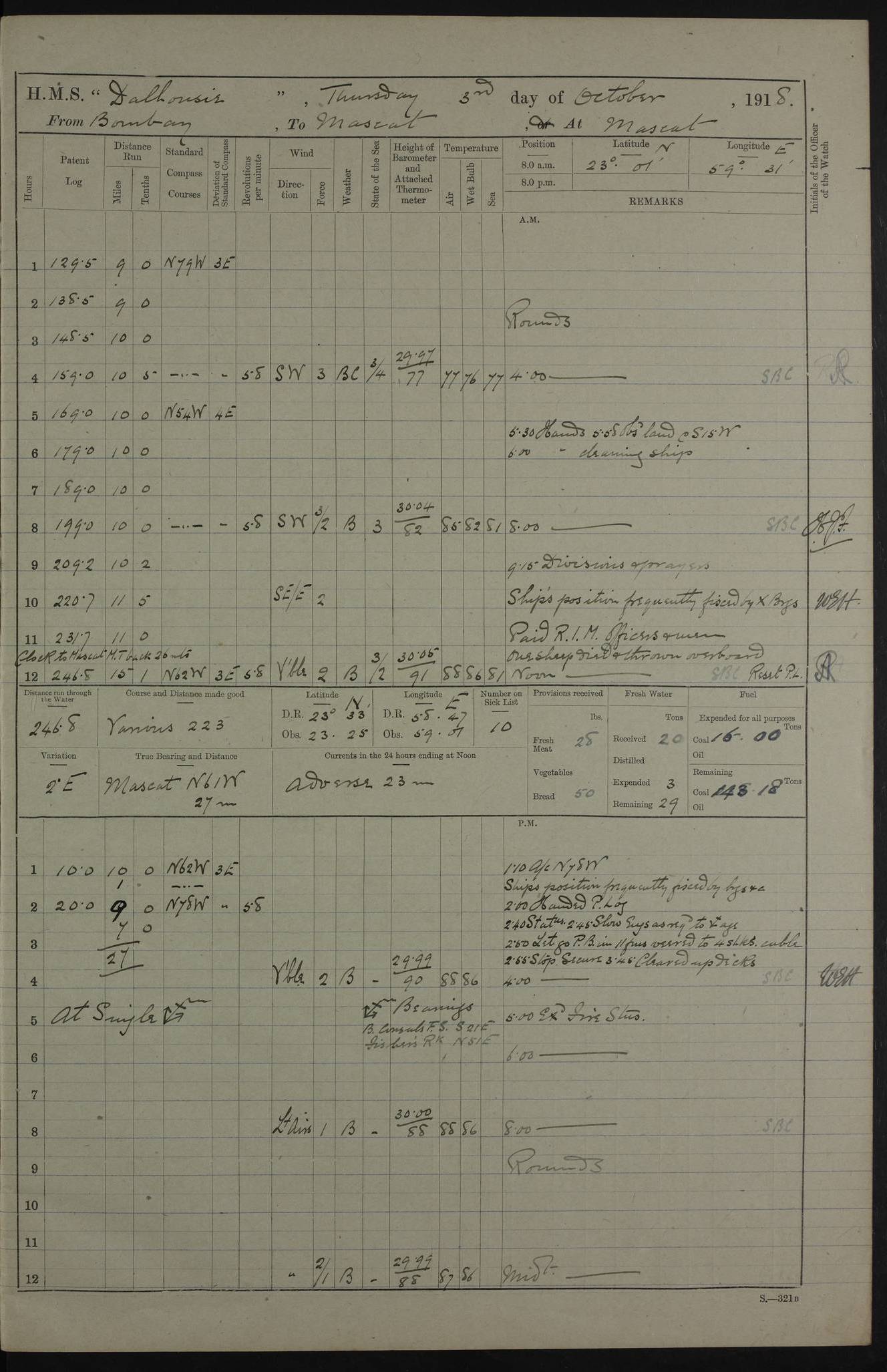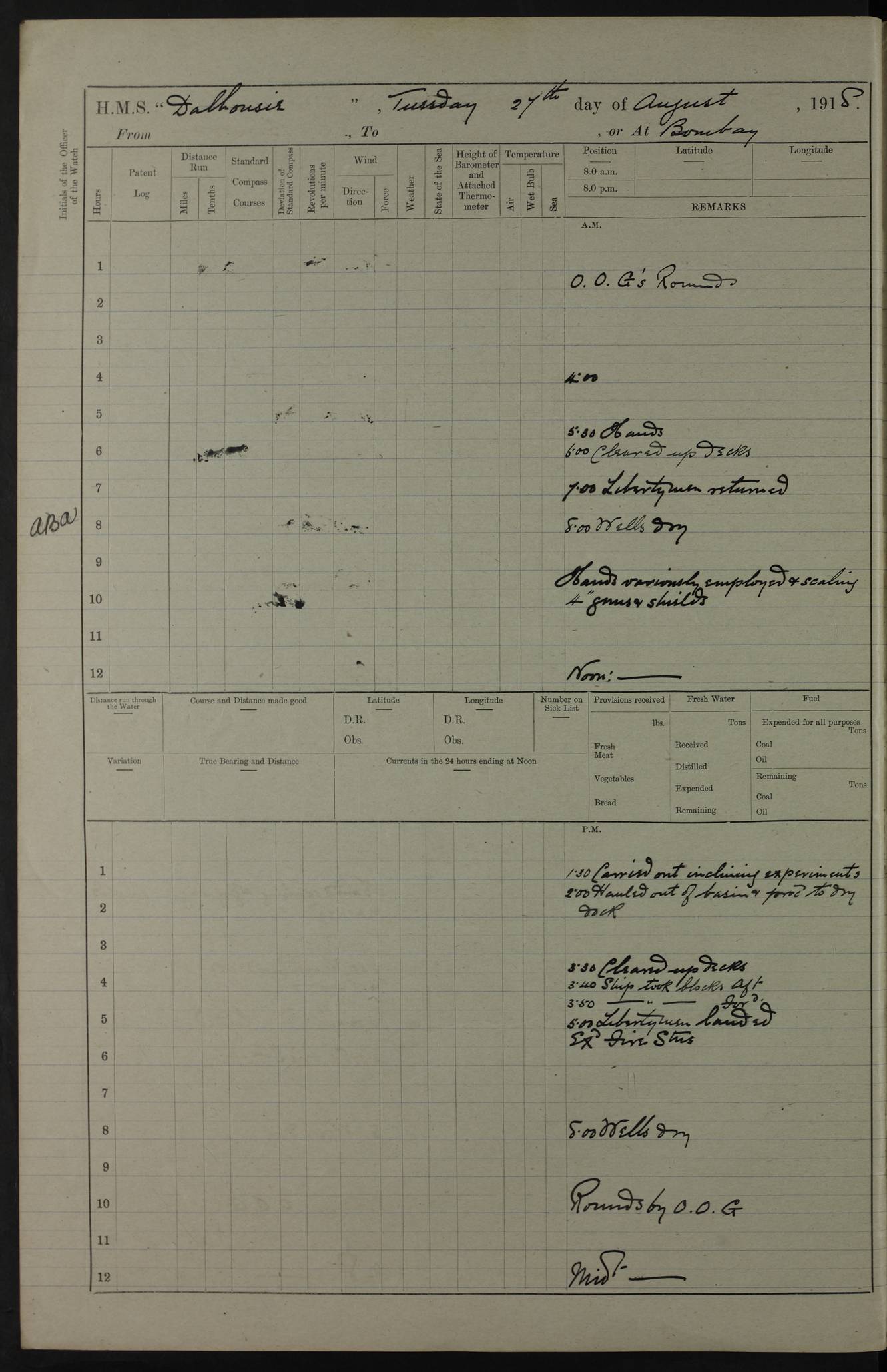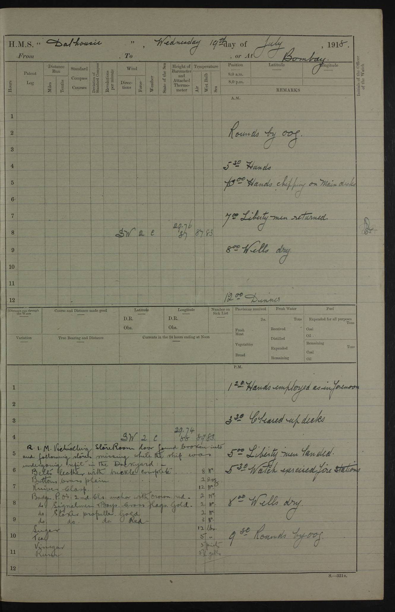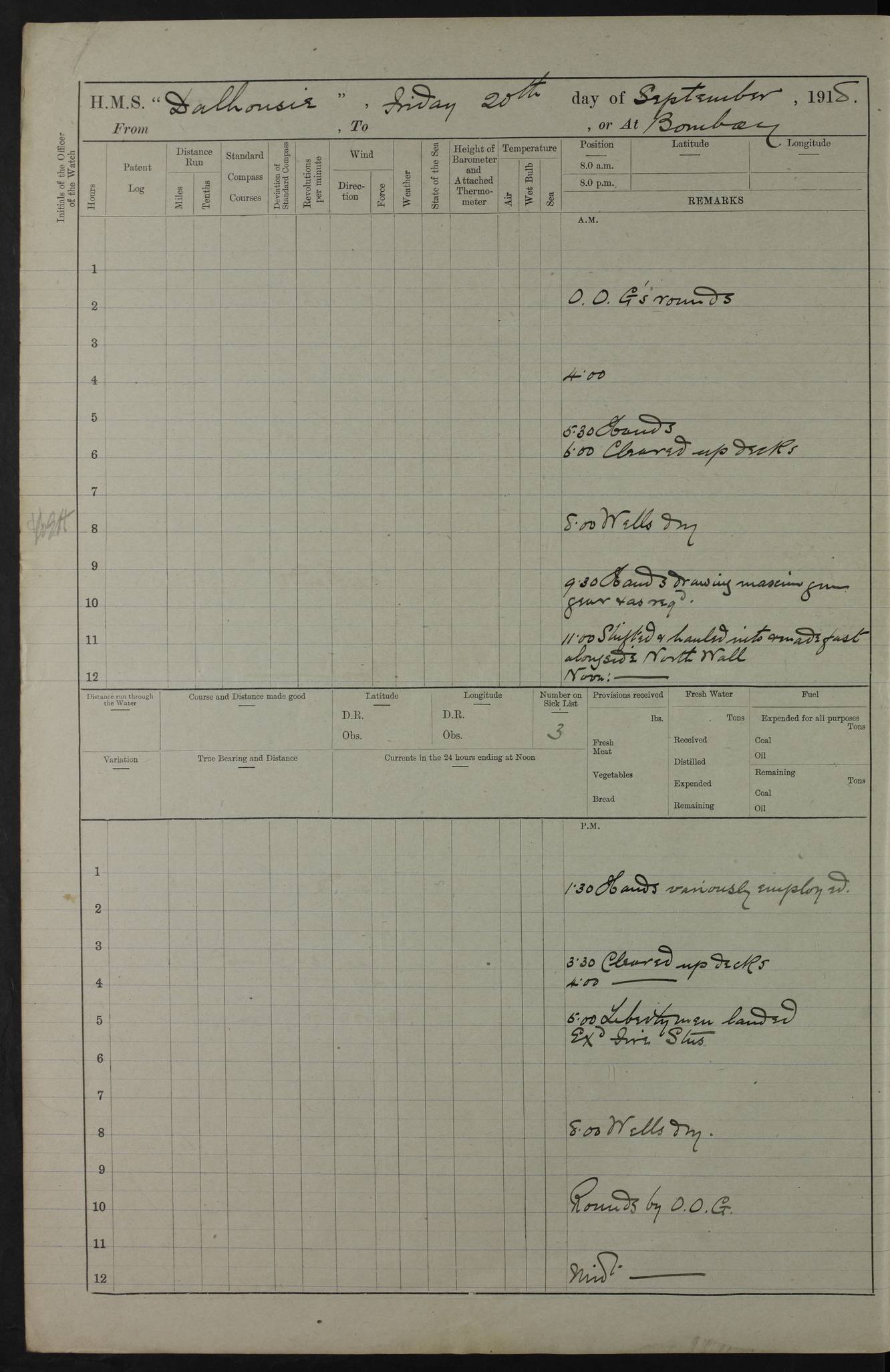 PM - Discharged To Hospital: H Widger, Engine Room Artificer - PW Harrison, Stoker Royal Navy Reserve To Motor Launch 11: J W Whitfield, Stoker 4ef4fa93e53e0a0c910056e2: (https://s3.amazonaws.com:443/oldweather/ADM53-39392/0018_0.jpg) 31 August 1916 Place: Basrah Lat 30.5269, Long 47.8407 2:00am: Rounds 5:05am: Hospital Ship SYRIA passed down 5:30am: Hands 6:00am: Morning Routine 8:00am: Wells dry – Signal Books Correct 9:30am: Divisions - Hands cleaning ship 11:00am: Drew Three Thousand Rupees from the Field treasury 12:00pm: Signal Books Correct – Issued Quinine to ship’s company 12:30pm: Piped Down 3:30pm: 4:00pm: Signal Books Correct 4:30pm: Cleared up decks 5:00pm: Evening Quarters – Leave to Watch of Naval Ratings 7:00pm: Sunset - Fire Gear in readiness 7:30pm: Liberty men returned 8:00pm: Wells dry - Signal Books Correct 9:00pm: Rounds - Signal Books Correct 11:00pm: Destroyed 19 tins Milk being unfit for use. AM – Joined From Motor Launch Depot: M. McMillan, Able Seaman From 5 Mess: T. Jackson, Petty Officer 1st From 4 Mess: T Golden, Stoker – J Tunney, Royal Navy Reserve Trawler Section From 10 Mess: J Donegan Royal Navy Reserve Trawler Section