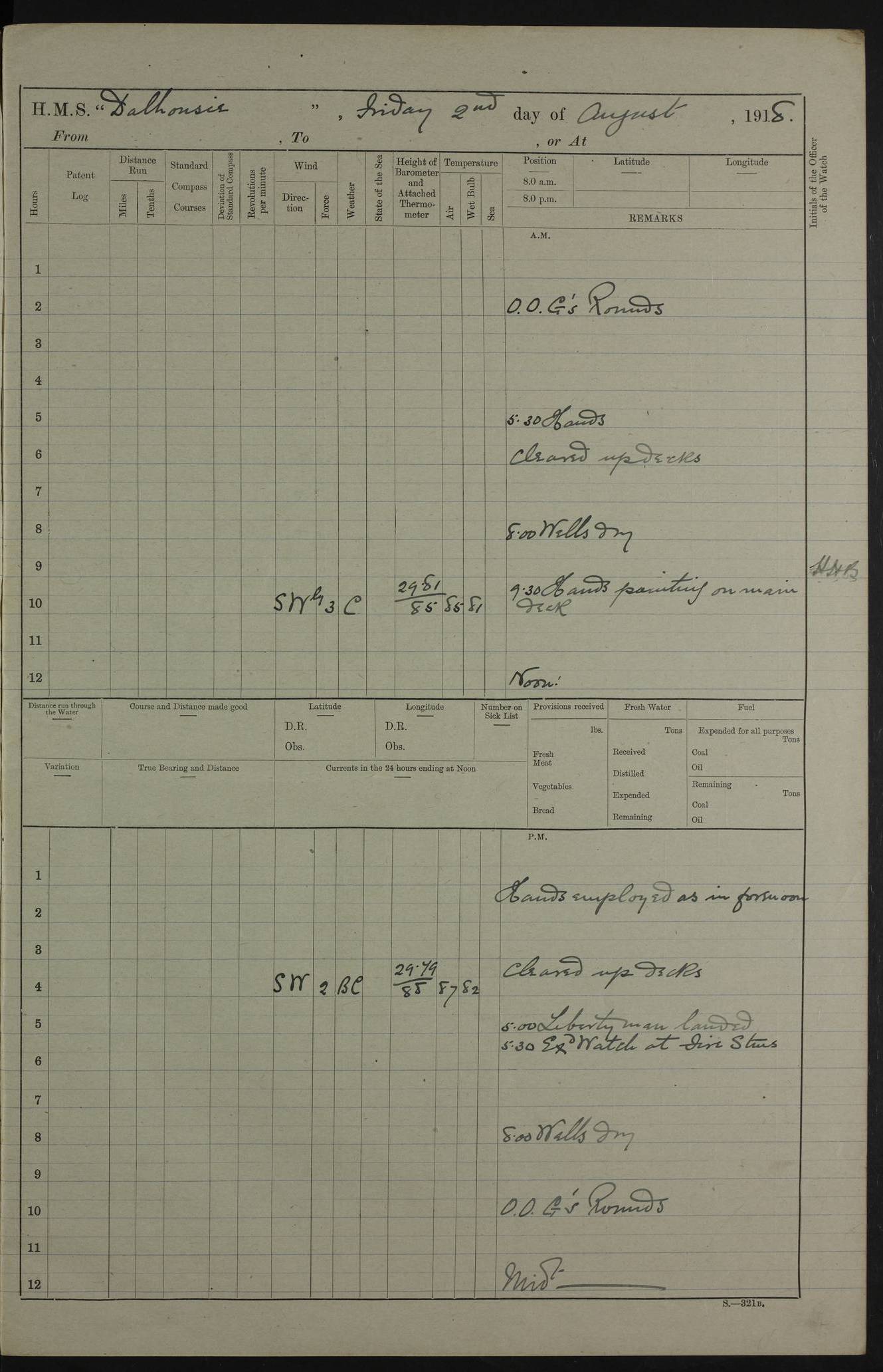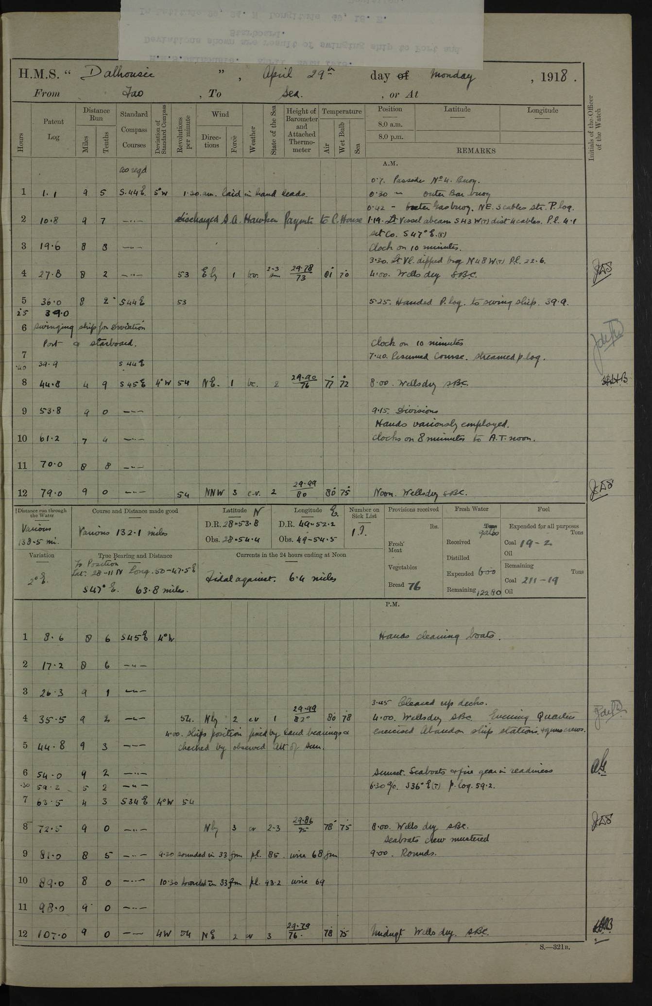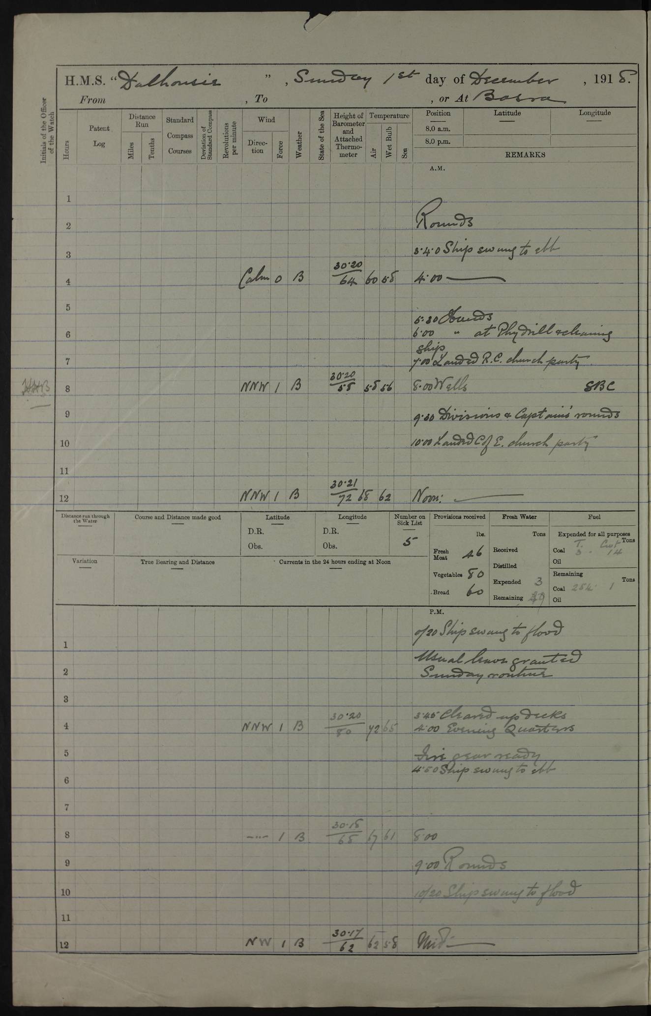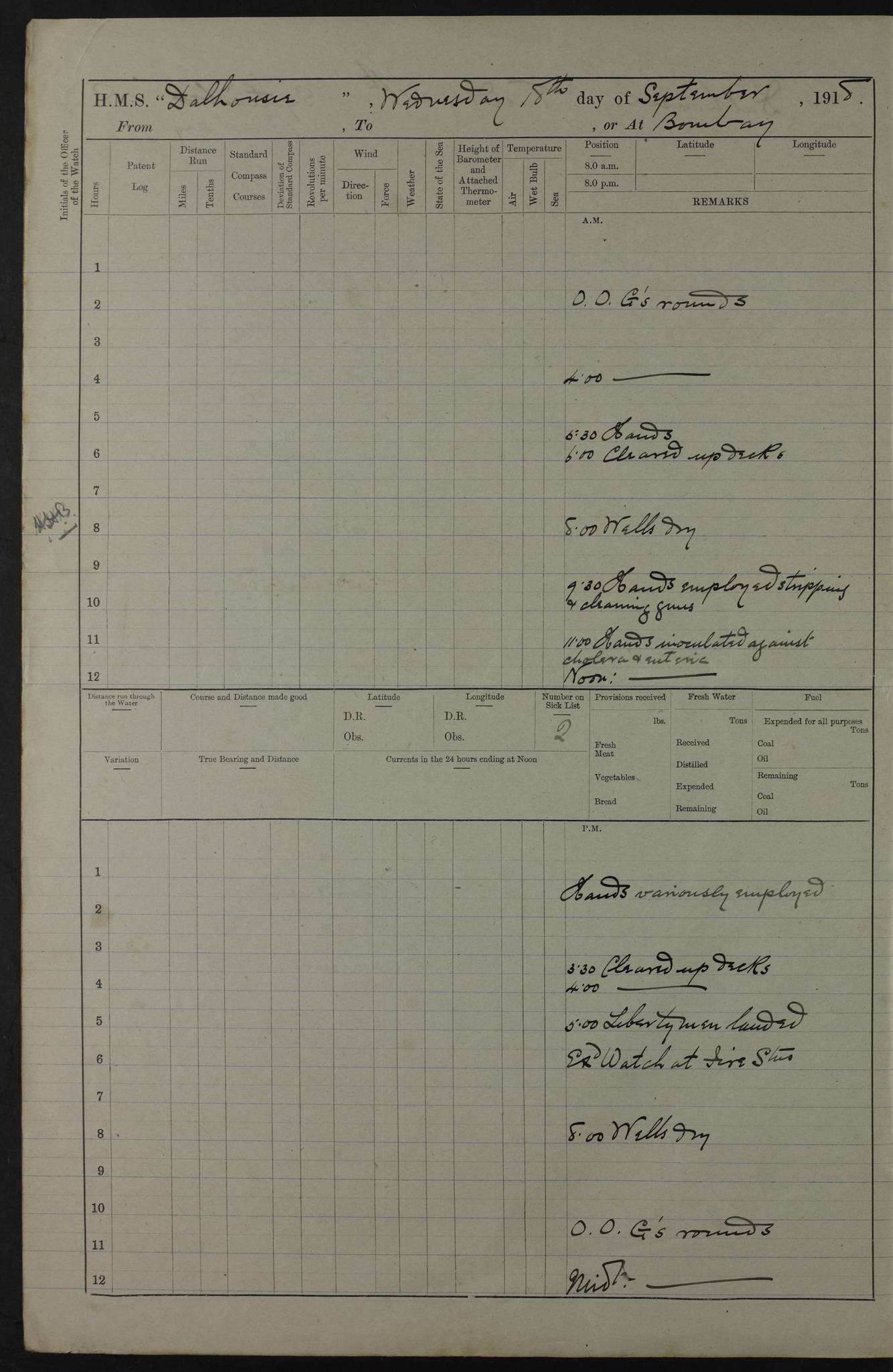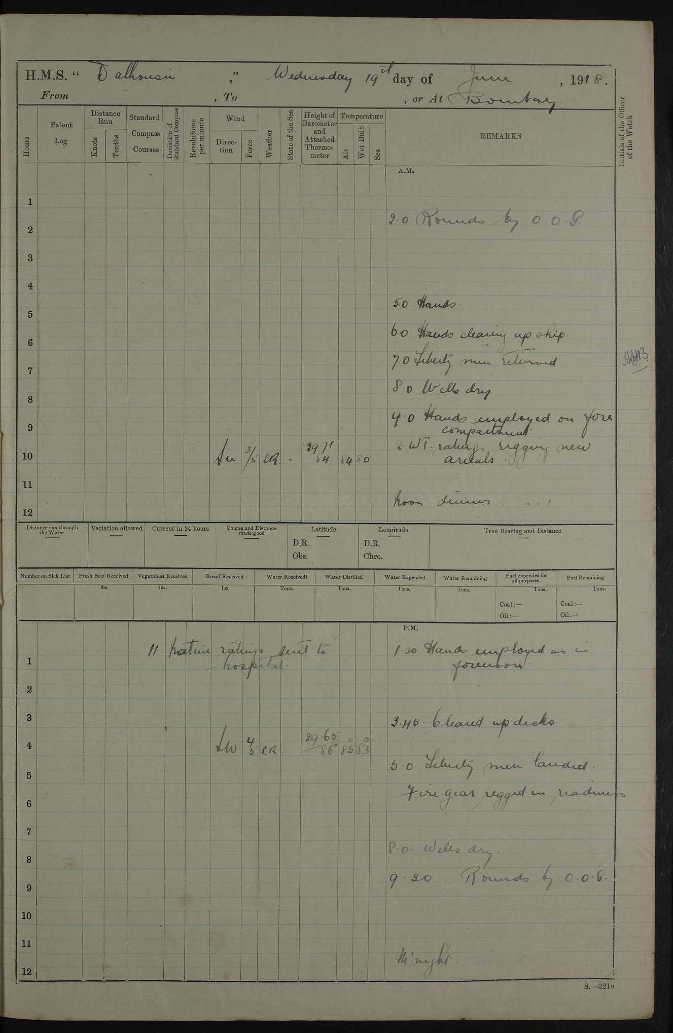 PM - Discharged To Hospital: H Widger, Engine Room Artificer - PW Harrison, Stoker Royal Navy Reserve To Motor Launch 11: J W Whitfield, Stoker 4ef4fa93e53e0a0c910056e2: (https://s3.amazonaws.com:443/oldweather/ADM53-39392/0018_0.jpg) 31 August 1916 Place: Basrah Lat 30.5269, Long 47.8407 2:00am: Rounds 5:05am: Hospital Ship SYRIA passed down 5:30am: Hands 6:00am: Morning Routine 8:00am: Wells dry – Signal Books Correct 9:30am: Divisions - Hands cleaning ship 11:00am: Drew Three Thousand Rupees from the Field treasury 12:00pm: Signal Books Correct – Issued Quinine to ship’s company 12:30pm: Piped Down 3:30pm: 4:00pm: Signal Books Correct 4:30pm: Cleared up decks 5:00pm: Evening Quarters – Leave to Watch of Naval Ratings 7:00pm: Sunset - Fire Gear in readiness 7:30pm: Liberty men returned 8:00pm: Wells dry - Signal Books Correct 9:00pm: Rounds - Signal Books Correct 11:00pm: Destroyed 19 tins Milk being unfit for use. AM – Joined From Motor Launch Depot: M. McMillan, Able Seaman From 5 Mess: T. Jackson, Petty Officer 1st From 4 Mess: T Golden, Stoker – J Tunney, Royal Navy Reserve Trawler Section From 10 Mess: J Donegan Royal Navy Reserve Trawler Section