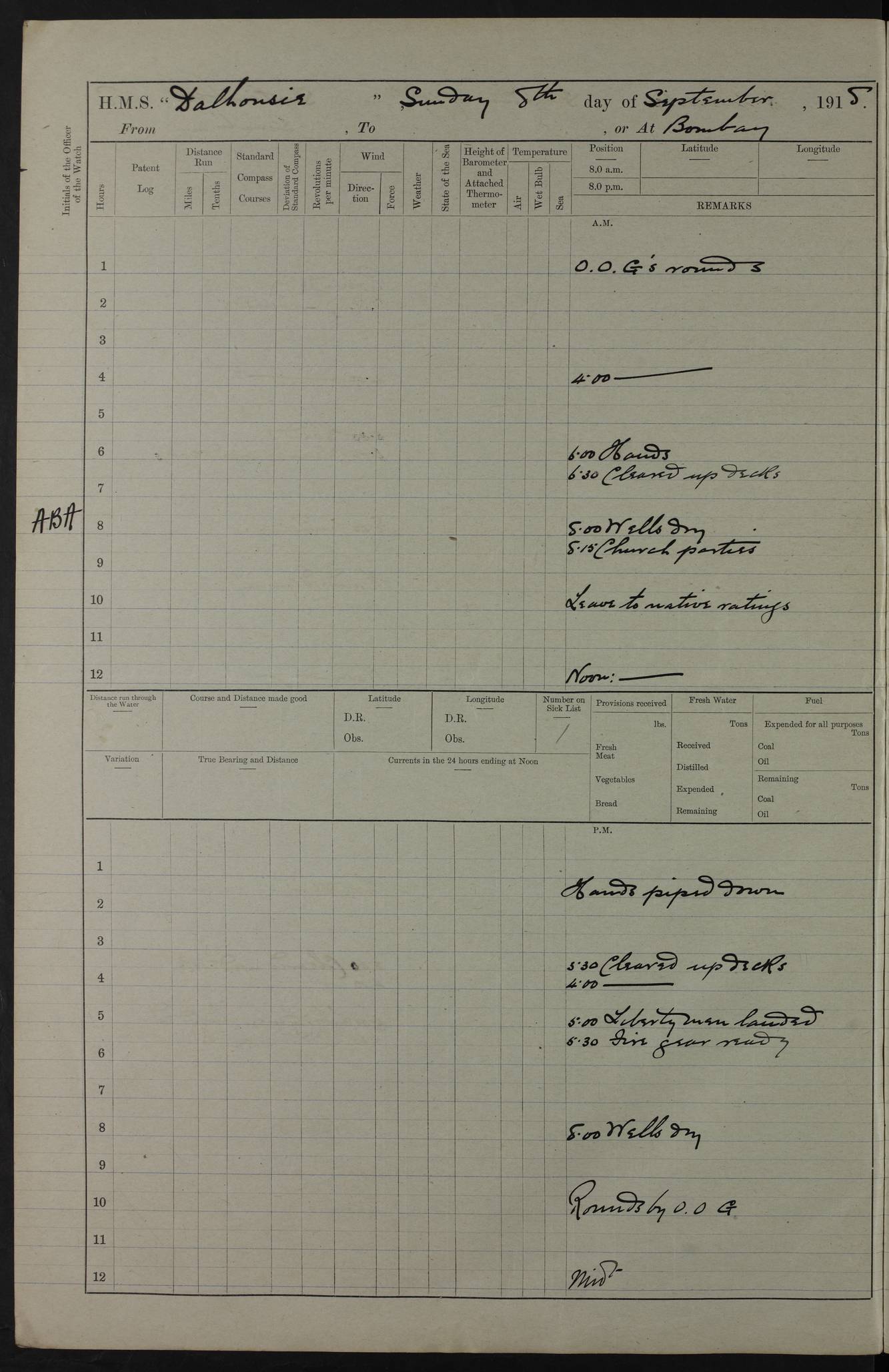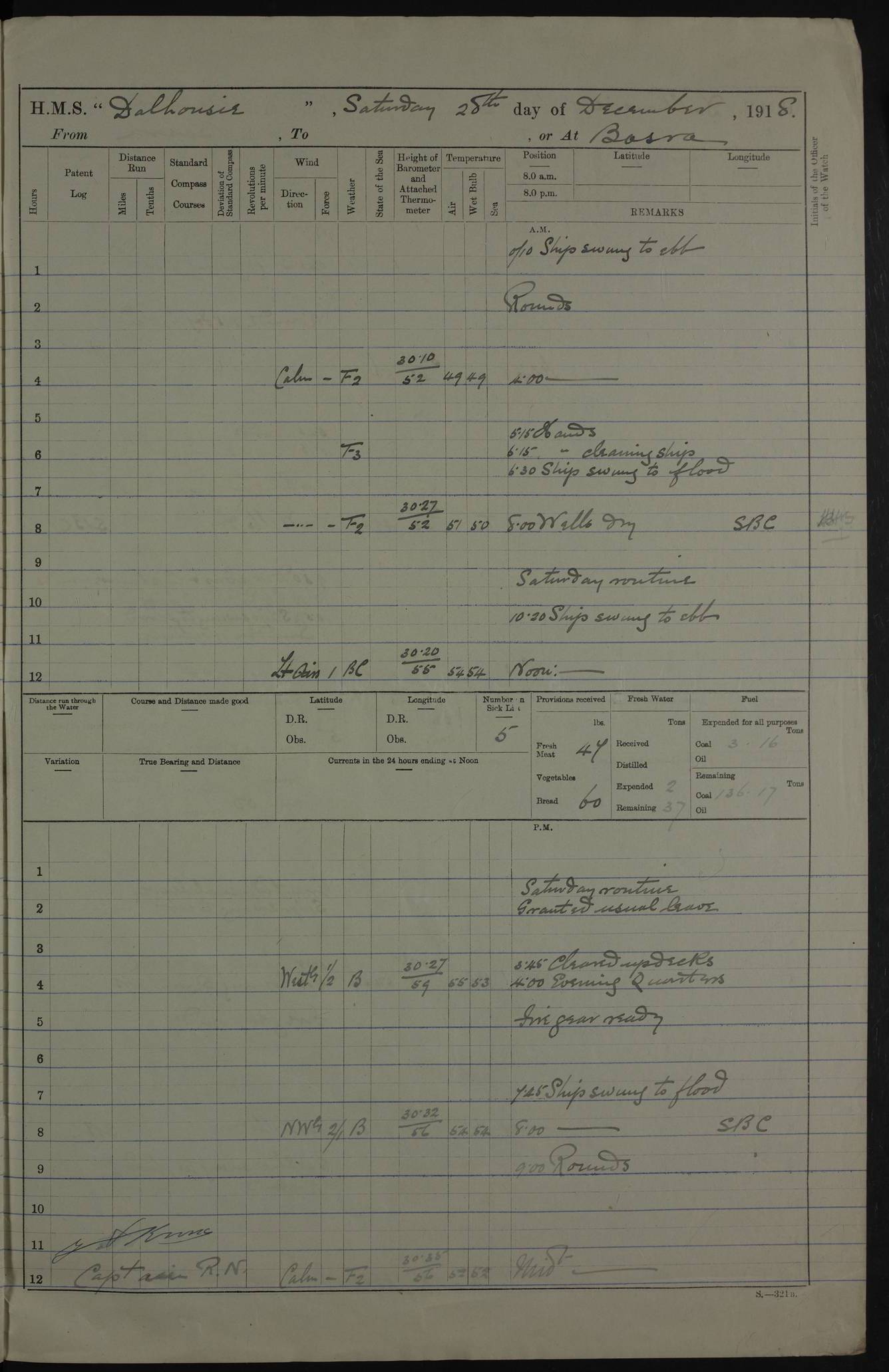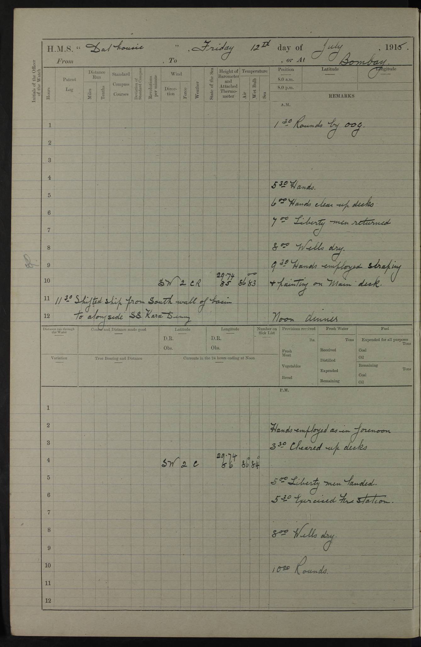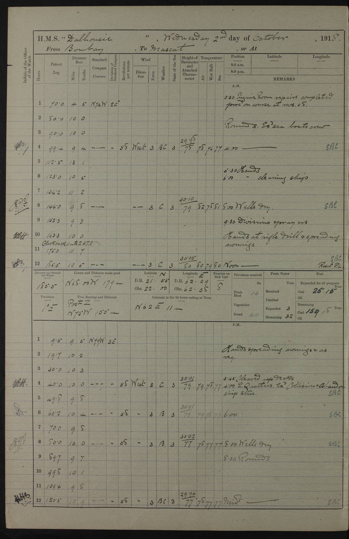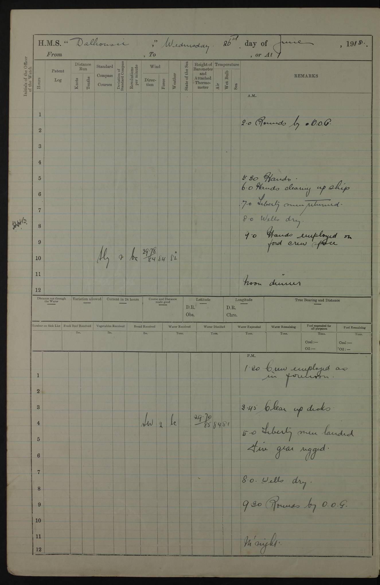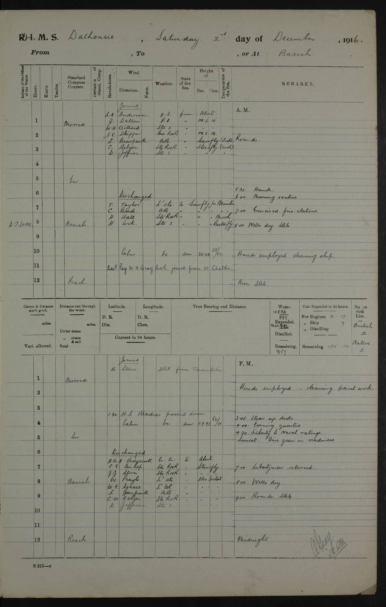 PM - Discharged To Hospital: H Widger, Engine Room Artificer - PW Harrison, Stoker Royal Navy Reserve To Motor Launch 11: J W Whitfield, Stoker 4ef4fa93e53e0a0c910056e2: (https://s3.amazonaws.com:443/oldweather/ADM53-39392/0018_0.jpg) 31 August 1916 Place: Basrah Lat 30.5269, Long 47.8407 2:00am: Rounds 5:05am: Hospital Ship SYRIA passed down 5:30am: Hands 6:00am: Morning Routine 8:00am: Wells dry – Signal Books Correct 9:30am: Divisions - Hands cleaning ship 11:00am: Drew Three Thousand Rupees from the Field treasury 12:00pm: Signal Books Correct – Issued Quinine to ship’s company 12:30pm: Piped Down 3:30pm: 4:00pm: Signal Books Correct 4:30pm: Cleared up decks 5:00pm: Evening Quarters – Leave to Watch of Naval Ratings 7:00pm: Sunset - Fire Gear in readiness 7:30pm: Liberty men returned 8:00pm: Wells dry - Signal Books Correct 9:00pm: Rounds - Signal Books Correct 11:00pm: Destroyed 19 tins Milk being unfit for use. AM – Joined From Motor Launch Depot: M. McMillan, Able Seaman From 5 Mess: T. Jackson, Petty Officer 1st From 4 Mess: T Golden, Stoker – J Tunney, Royal Navy Reserve Trawler Section From 10 Mess: J Donegan Royal Navy Reserve Trawler Section