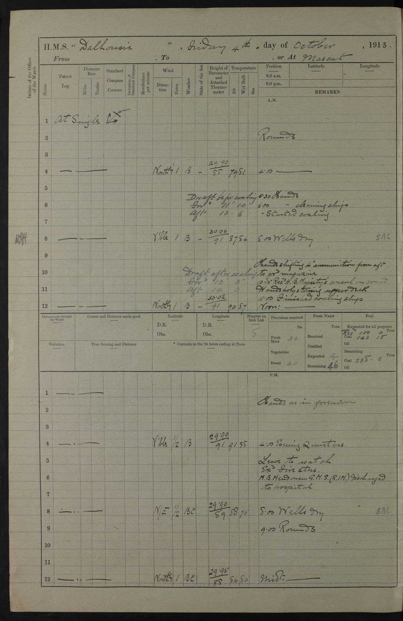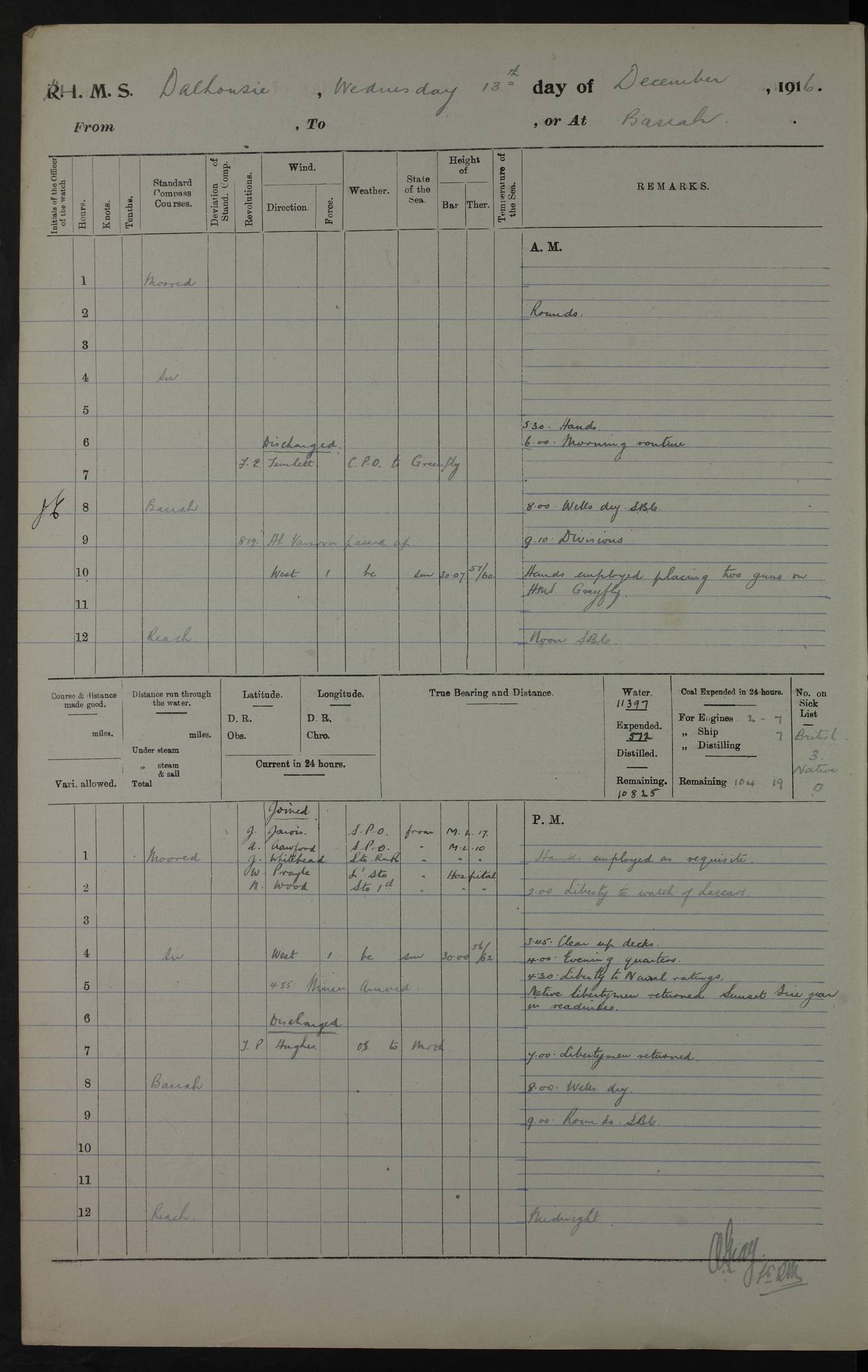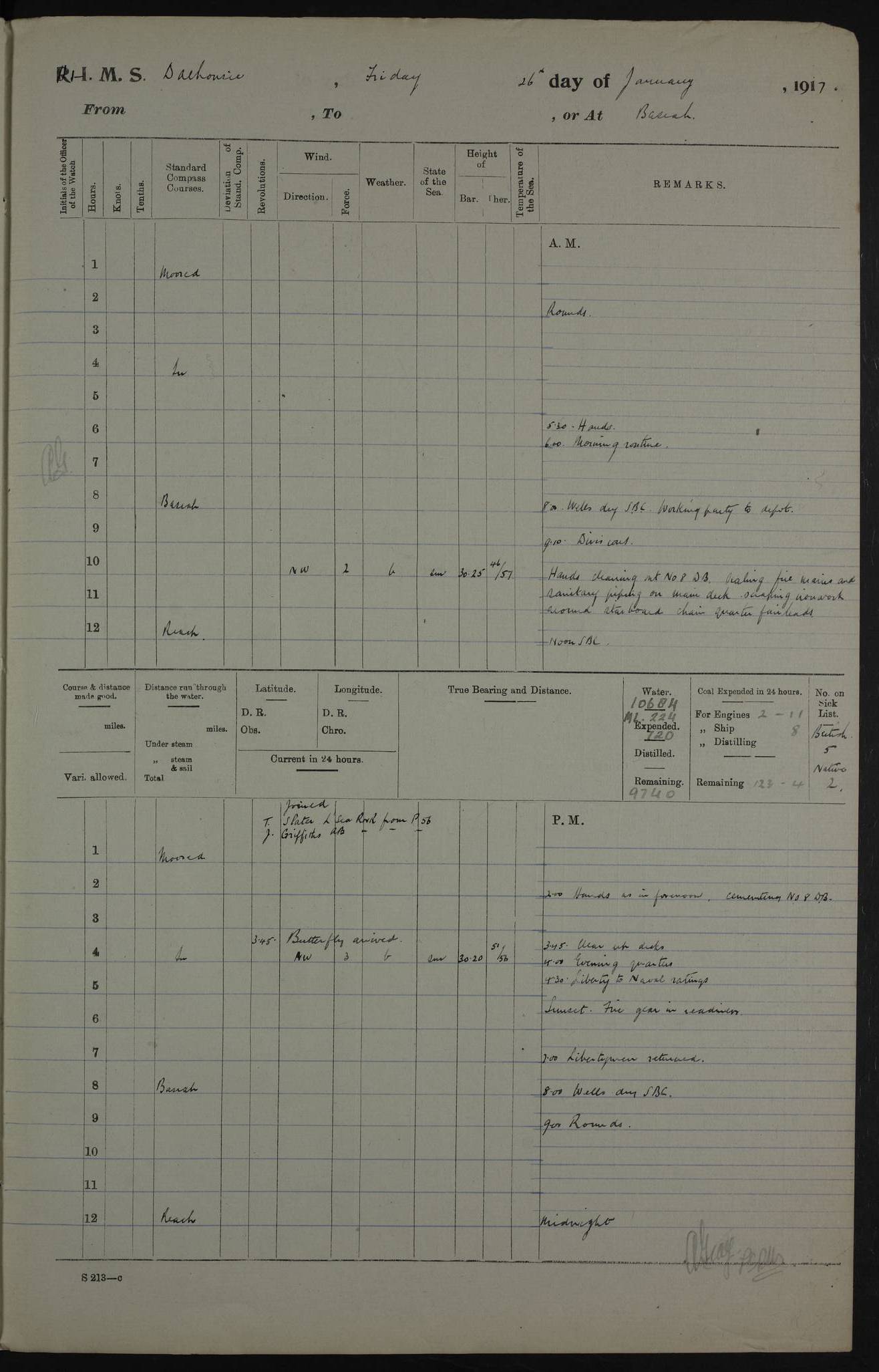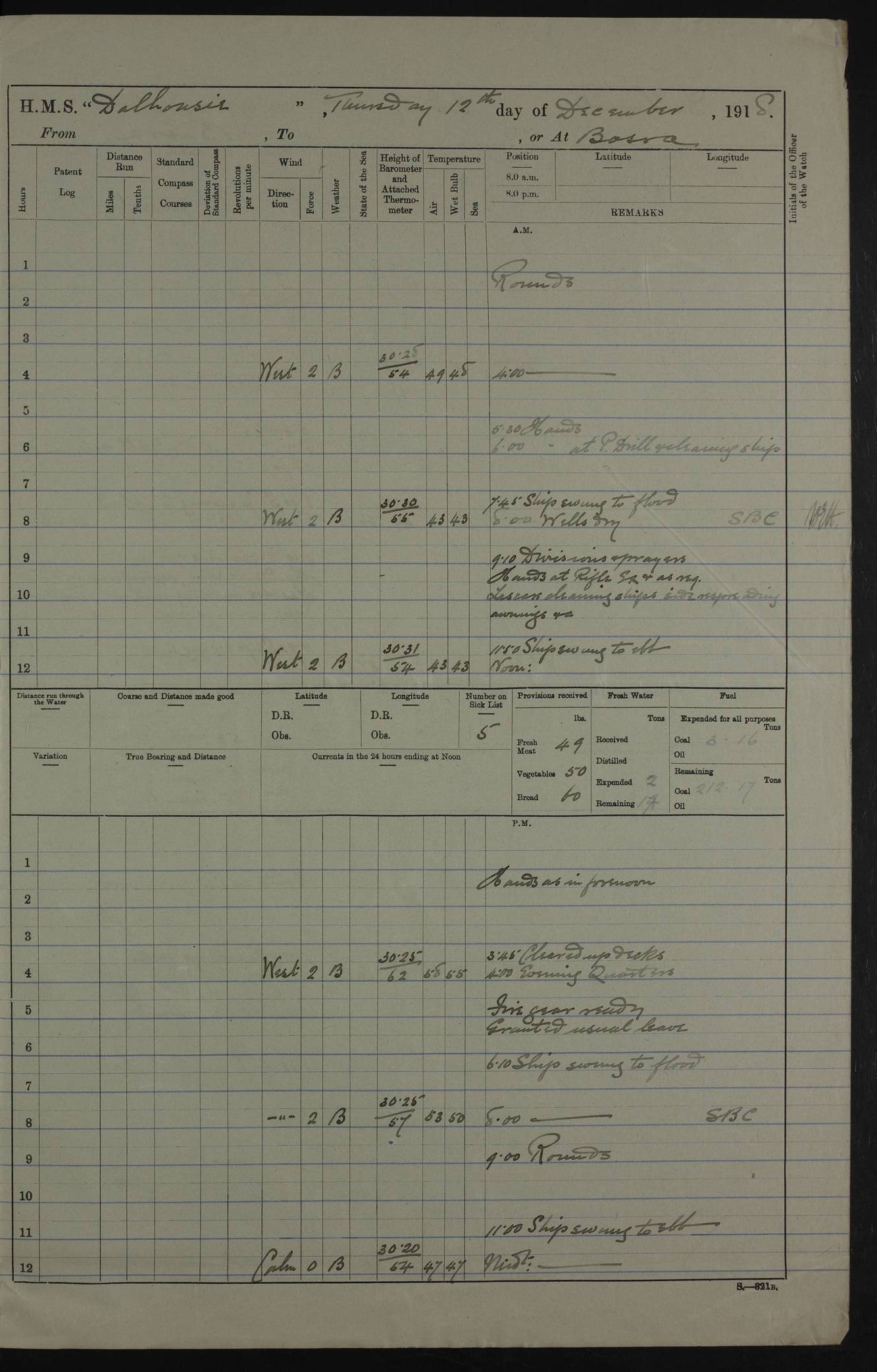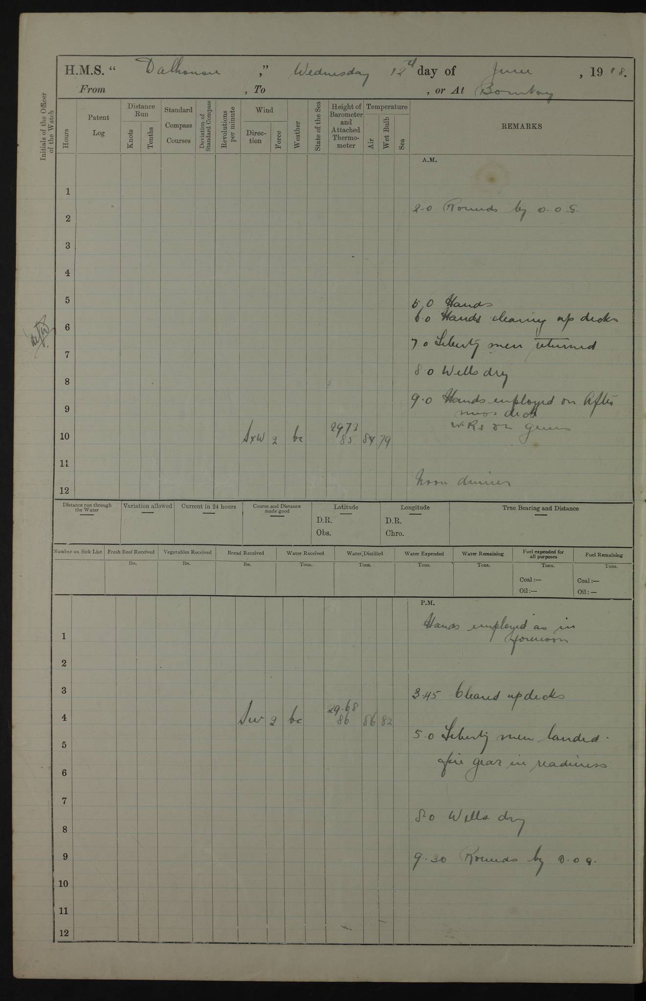 PM - Discharged To Hospital: H Widger, Engine Room Artificer - PW Harrison, Stoker Royal Navy Reserve To Motor Launch 11: J W Whitfield, Stoker 4ef4fa93e53e0a0c910056e2: (https://s3.amazonaws.com:443/oldweather/ADM53-39392/0018_0.jpg) 31 August 1916 Place: Basrah Lat 30.5269, Long 47.8407 2:00am: Rounds 5:05am: Hospital Ship SYRIA passed down 5:30am: Hands 6:00am: Morning Routine 8:00am: Wells dry – Signal Books Correct 9:30am: Divisions - Hands cleaning ship 11:00am: Drew Three Thousand Rupees from the Field treasury 12:00pm: Signal Books Correct – Issued Quinine to ship’s company 12:30pm: Piped Down 3:30pm: 4:00pm: Signal Books Correct 4:30pm: Cleared up decks 5:00pm: Evening Quarters – Leave to Watch of Naval Ratings 7:00pm: Sunset - Fire Gear in readiness 7:30pm: Liberty men returned 8:00pm: Wells dry - Signal Books Correct 9:00pm: Rounds - Signal Books Correct 11:00pm: Destroyed 19 tins Milk being unfit for use. AM – Joined From Motor Launch Depot: M. McMillan, Able Seaman From 5 Mess: T. Jackson, Petty Officer 1st From 4 Mess: T Golden, Stoker – J Tunney, Royal Navy Reserve Trawler Section From 10 Mess: J Donegan Royal Navy Reserve Trawler Section