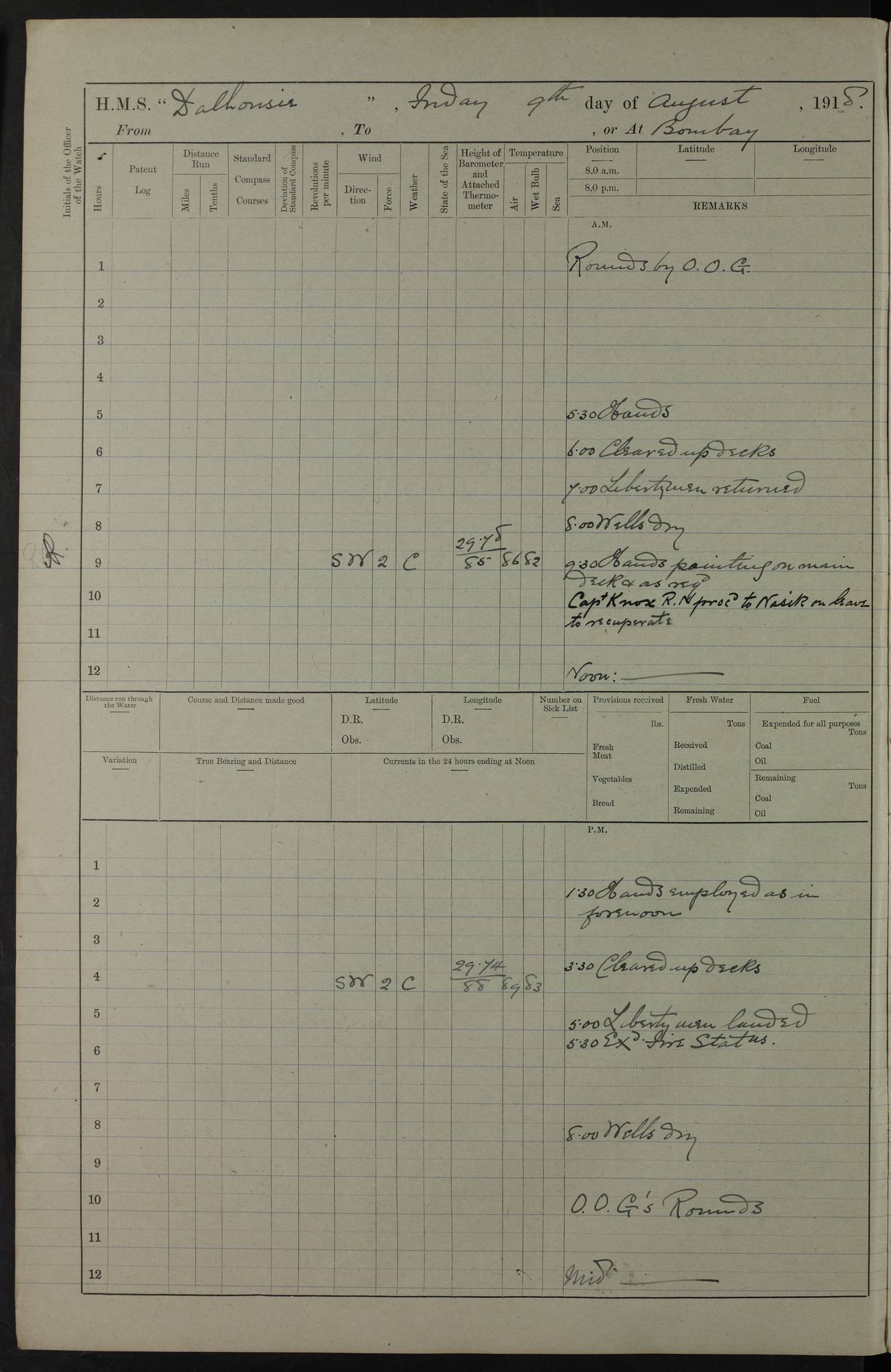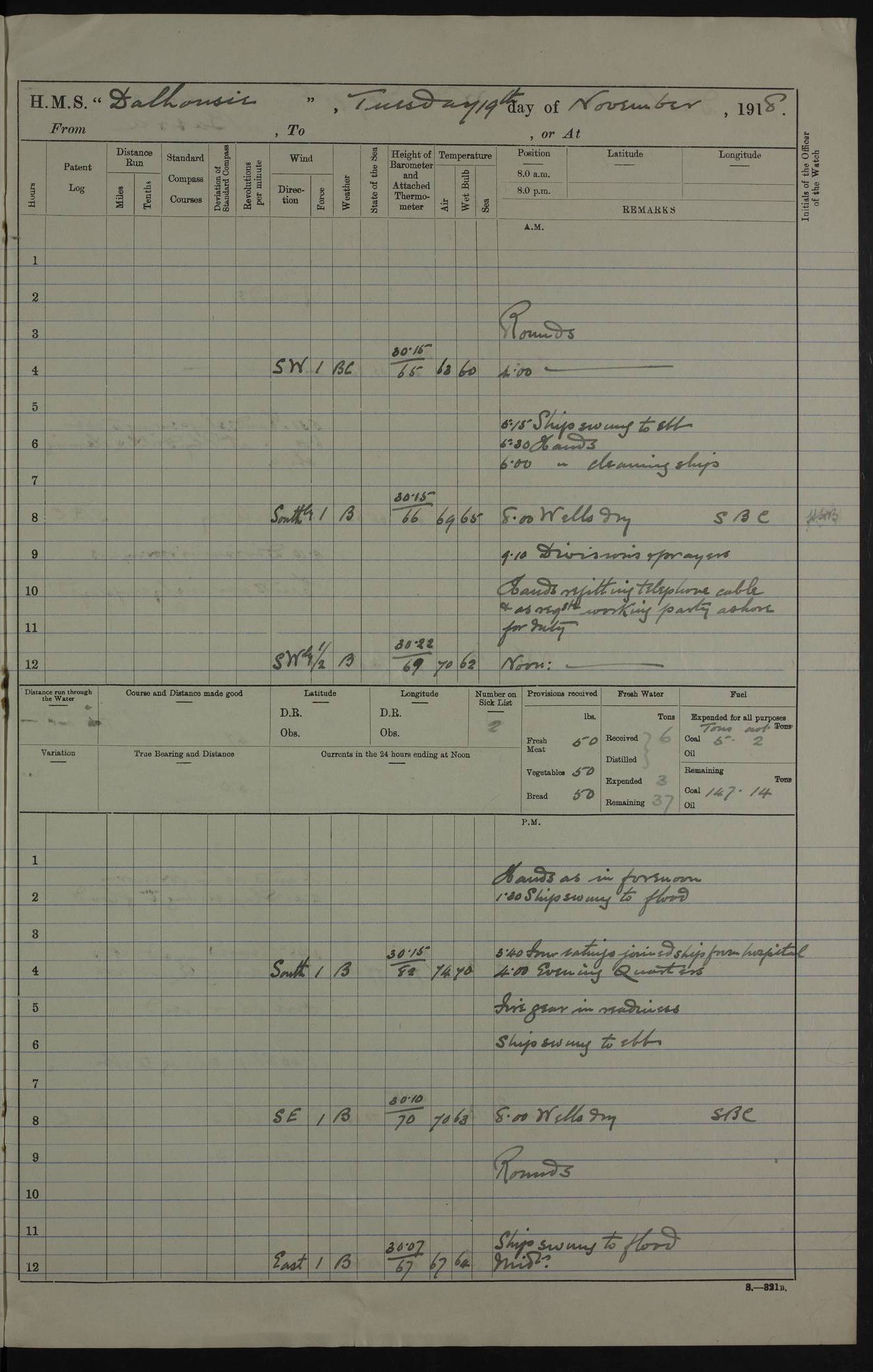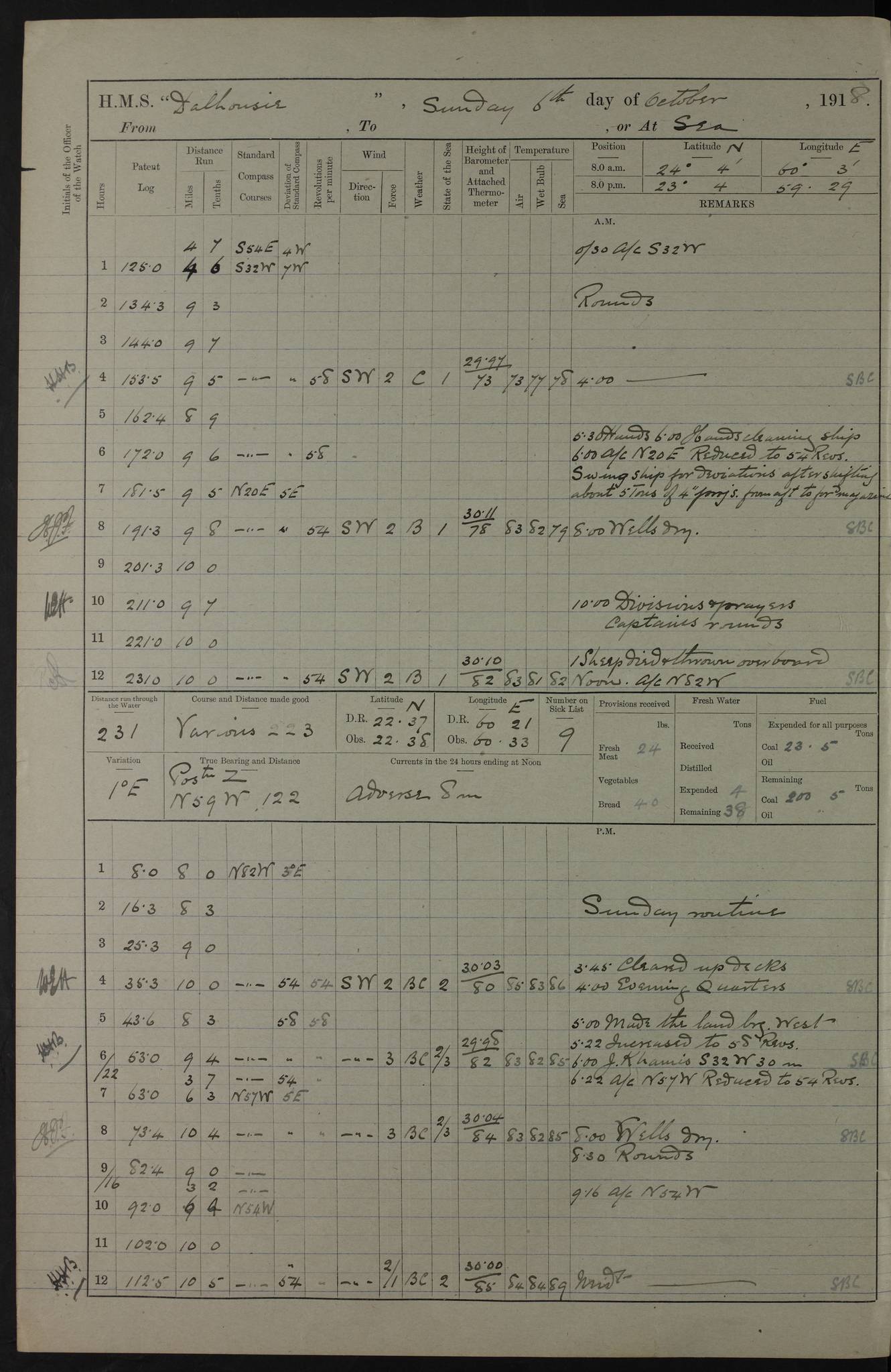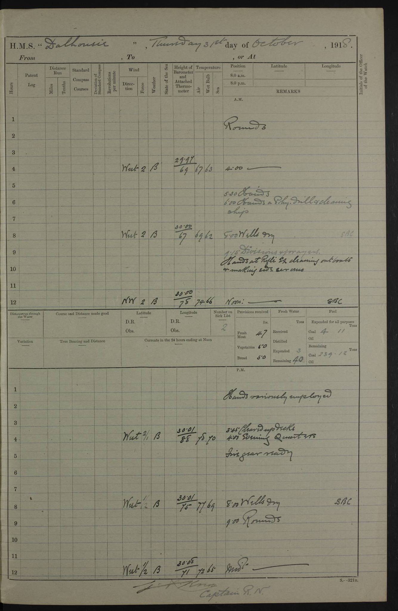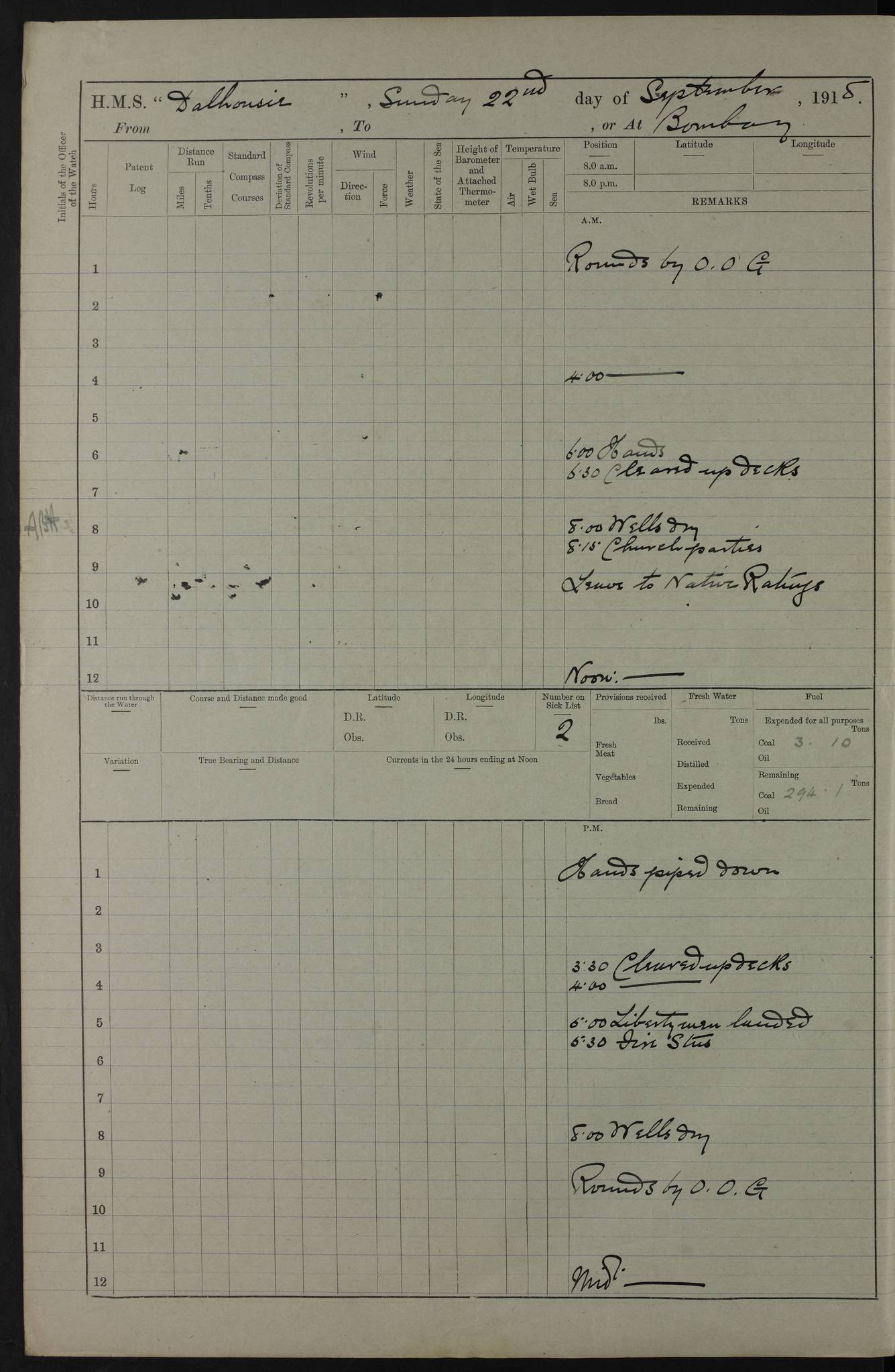 PM - Discharged To Hospital: H Widger, Engine Room Artificer - PW Harrison, Stoker Royal Navy Reserve To Motor Launch 11: J W Whitfield, Stoker 4ef4fa93e53e0a0c910056e2: (https://s3.amazonaws.com:443/oldweather/ADM53-39392/0018_0.jpg) 31 August 1916 Place: Basrah Lat 30.5269, Long 47.8407 2:00am: Rounds 5:05am: Hospital Ship SYRIA passed down 5:30am: Hands 6:00am: Morning Routine 8:00am: Wells dry – Signal Books Correct 9:30am: Divisions - Hands cleaning ship 11:00am: Drew Three Thousand Rupees from the Field treasury 12:00pm: Signal Books Correct – Issued Quinine to ship’s company 12:30pm: Piped Down 3:30pm: 4:00pm: Signal Books Correct 4:30pm: Cleared up decks 5:00pm: Evening Quarters – Leave to Watch of Naval Ratings 7:00pm: Sunset - Fire Gear in readiness 7:30pm: Liberty men returned 8:00pm: Wells dry - Signal Books Correct 9:00pm: Rounds - Signal Books Correct 11:00pm: Destroyed 19 tins Milk being unfit for use. AM – Joined From Motor Launch Depot: M. McMillan, Able Seaman From 5 Mess: T. Jackson, Petty Officer 1st From 4 Mess: T Golden, Stoker – J Tunney, Royal Navy Reserve Trawler Section From 10 Mess: J Donegan Royal Navy Reserve Trawler Section
