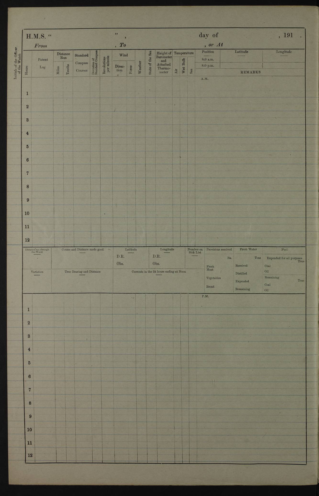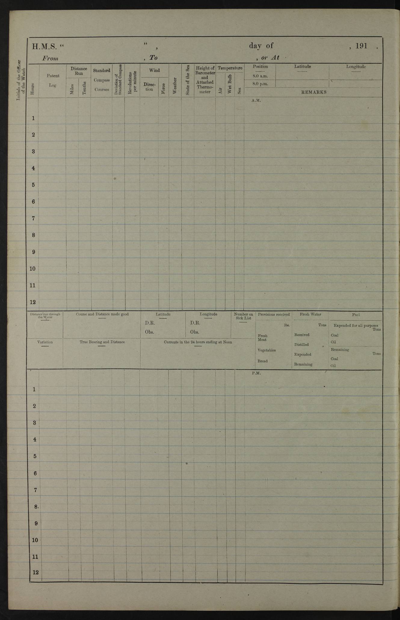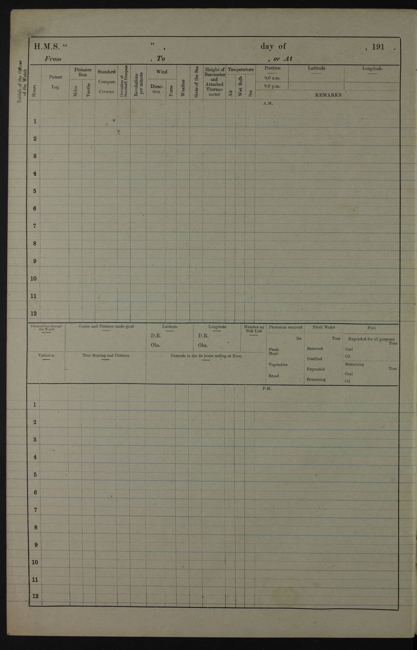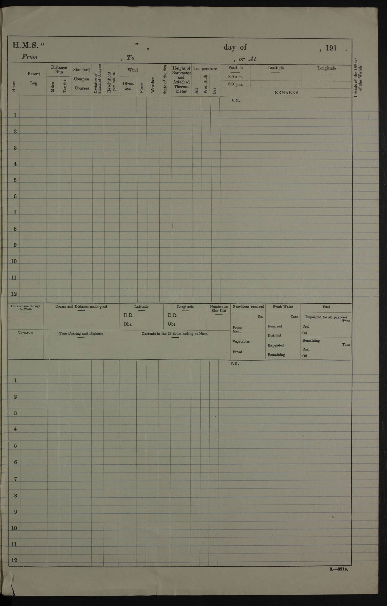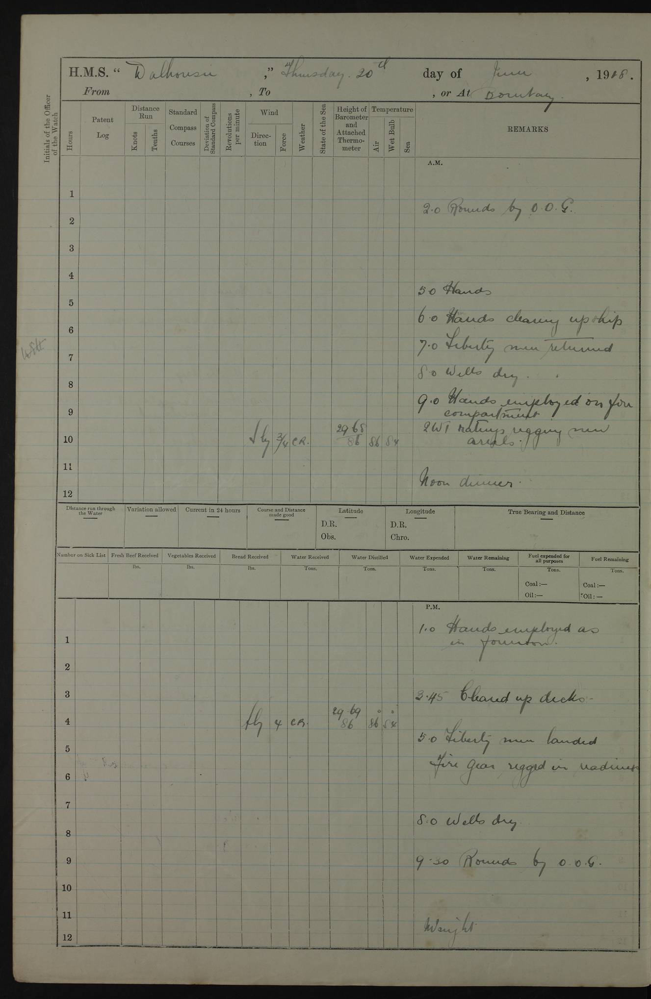 PM - Discharged To Hospital: H Widger, Engine Room Artificer - PW Harrison, Stoker Royal Navy Reserve To Motor Launch 11: J W Whitfield, Stoker 4ef4fa93e53e0a0c910056e2: (https://s3.amazonaws.com:443/oldweather/ADM53-39392/0018_0.jpg) 31 August 1916 Place: Basrah Lat 30.5269, Long 47.8407 2:00am: Rounds 5:05am: Hospital Ship SYRIA passed down 5:30am: Hands 6:00am: Morning Routine 8:00am: Wells dry – Signal Books Correct 9:30am: Divisions - Hands cleaning ship 11:00am: Drew Three Thousand Rupees from the Field treasury 12:00pm: Signal Books Correct – Issued Quinine to ship’s company 12:30pm: Piped Down 3:30pm: 4:00pm: Signal Books Correct 4:30pm: Cleared up decks 5:00pm: Evening Quarters – Leave to Watch of Naval Ratings 7:00pm: Sunset - Fire Gear in readiness 7:30pm: Liberty men returned 8:00pm: Wells dry - Signal Books Correct 9:00pm: Rounds - Signal Books Correct 11:00pm: Destroyed 19 tins Milk being unfit for use. AM – Joined From Motor Launch Depot: M. McMillan, Able Seaman From 5 Mess: T. Jackson, Petty Officer 1st From 4 Mess: T Golden, Stoker – J Tunney, Royal Navy Reserve Trawler Section From 10 Mess: J Donegan Royal Navy Reserve Trawler Section