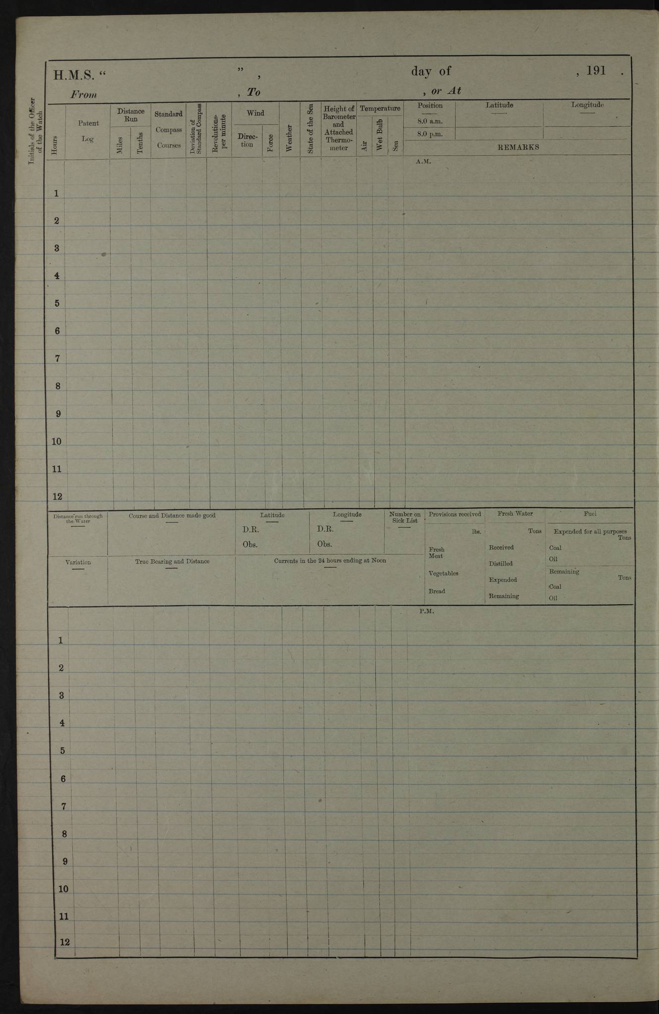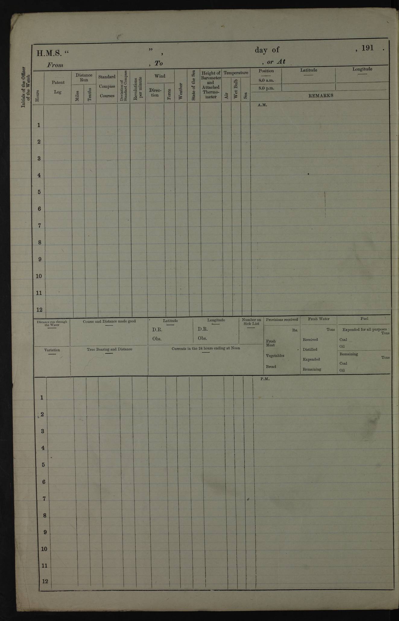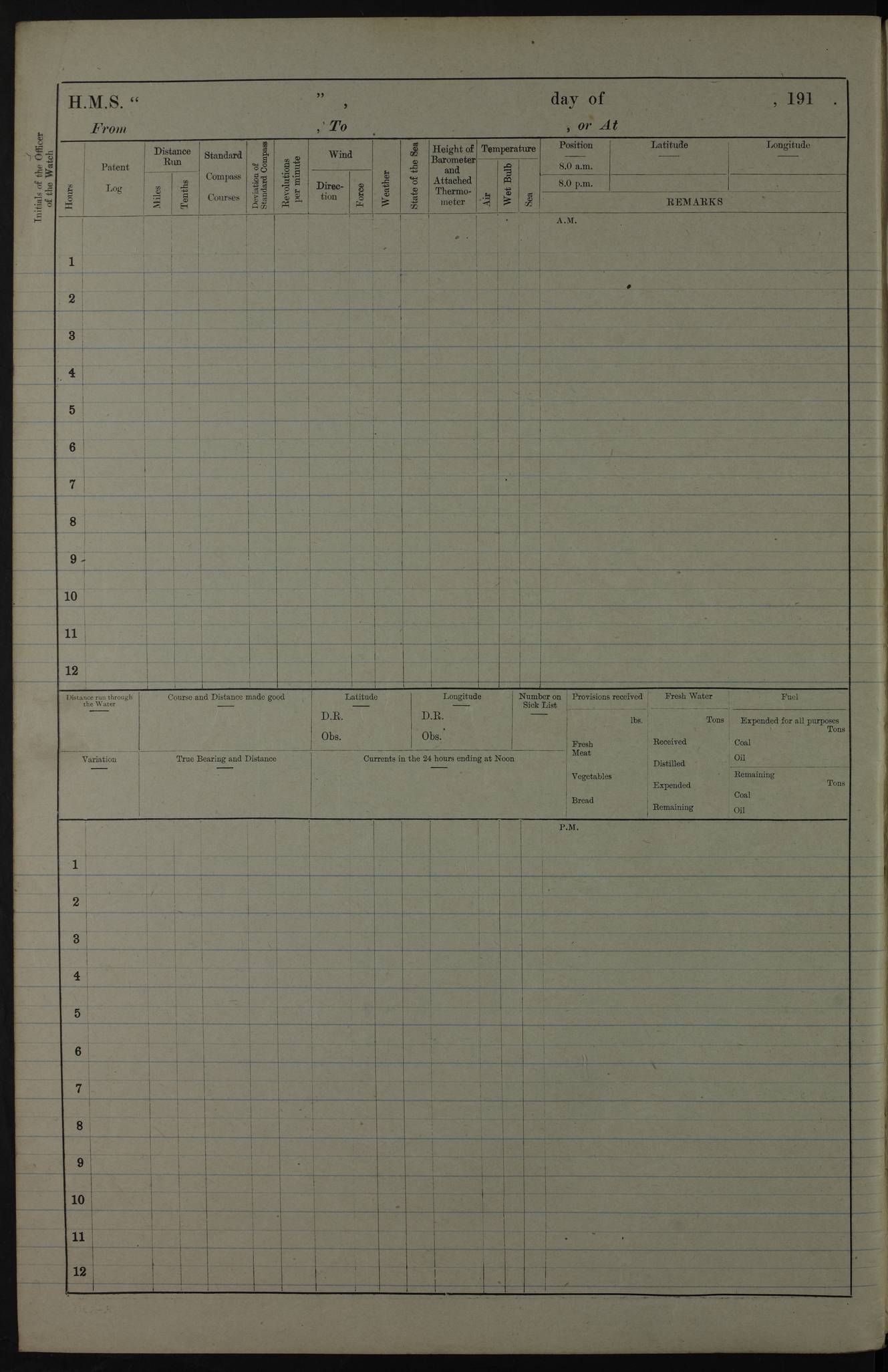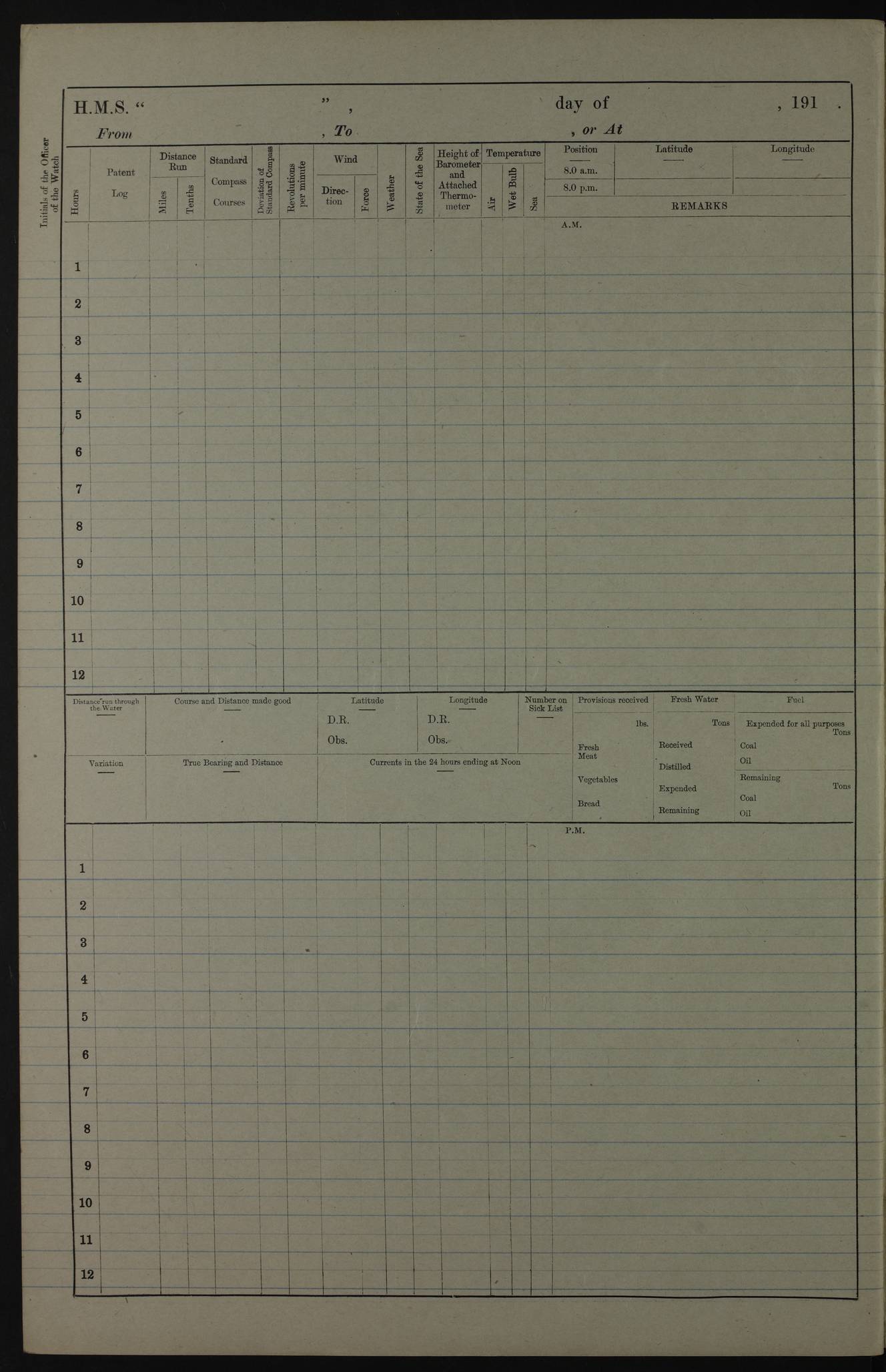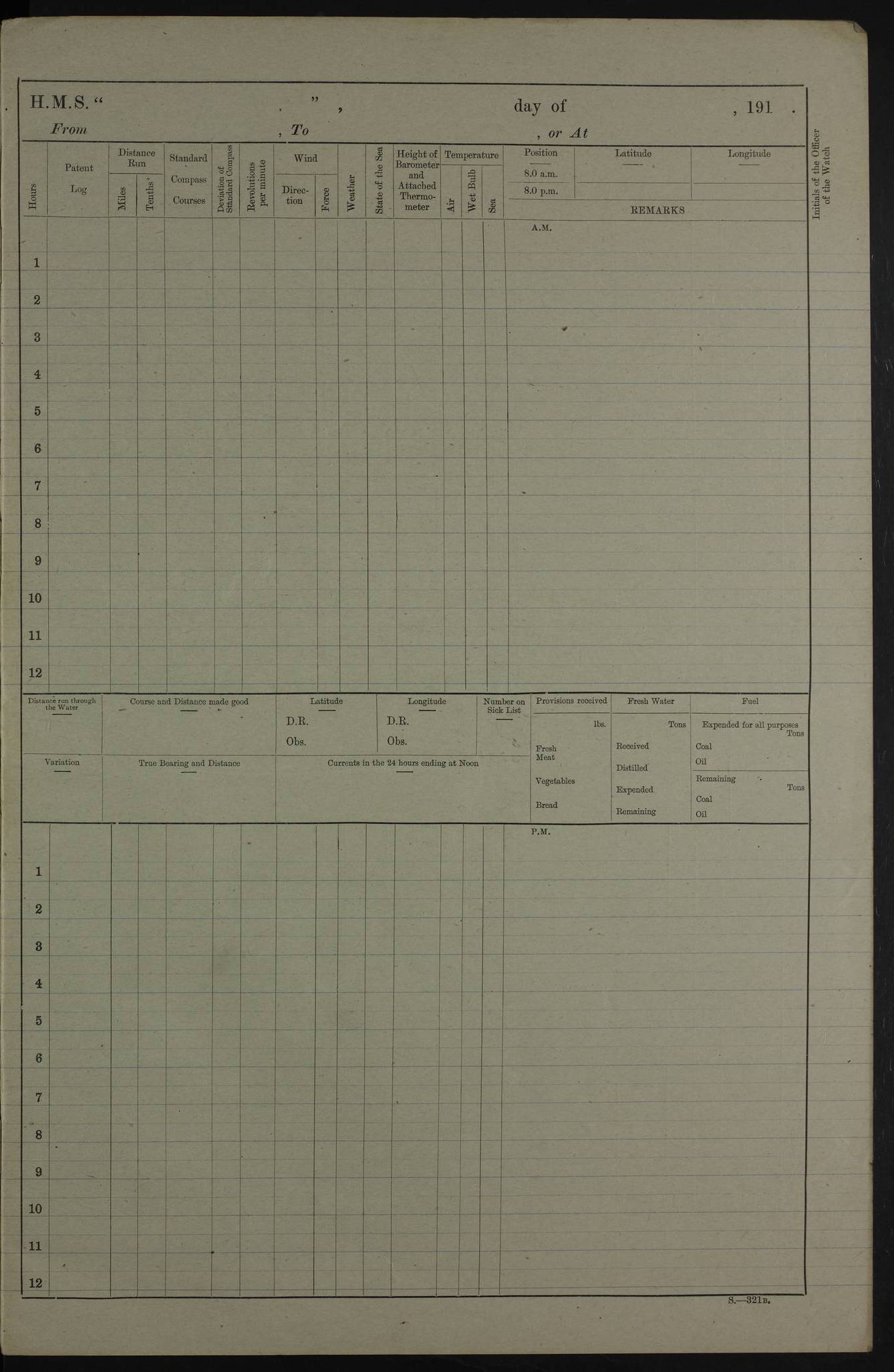 PM - Discharged To Hospital: H Widger, Engine Room Artificer - PW Harrison, Stoker Royal Navy Reserve To Motor Launch 11: J W Whitfield, Stoker 4ef4fa93e53e0a0c910056e2: (https://s3.amazonaws.com:443/oldweather/ADM53-39392/0018_0.jpg) 31 August 1916 Place: Basrah Lat 30.5269, Long 47.8407 2:00am: Rounds 5:05am: Hospital Ship SYRIA passed down 5:30am: Hands 6:00am: Morning Routine 8:00am: Wells dry – Signal Books Correct 9:30am: Divisions - Hands cleaning ship 11:00am: Drew Three Thousand Rupees from the Field treasury 12:00pm: Signal Books Correct – Issued Quinine to ship’s company 12:30pm: Piped Down 3:30pm: 4:00pm: Signal Books Correct 4:30pm: Cleared up decks 5:00pm: Evening Quarters – Leave to Watch of Naval Ratings 7:00pm: Sunset - Fire Gear in readiness 7:30pm: Liberty men returned 8:00pm: Wells dry - Signal Books Correct 9:00pm: Rounds - Signal Books Correct 11:00pm: Destroyed 19 tins Milk being unfit for use. AM – Joined From Motor Launch Depot: M. McMillan, Able Seaman From 5 Mess: T. Jackson, Petty Officer 1st From 4 Mess: T Golden, Stoker – J Tunney, Royal Navy Reserve Trawler Section From 10 Mess: J Donegan Royal Navy Reserve Trawler Section
