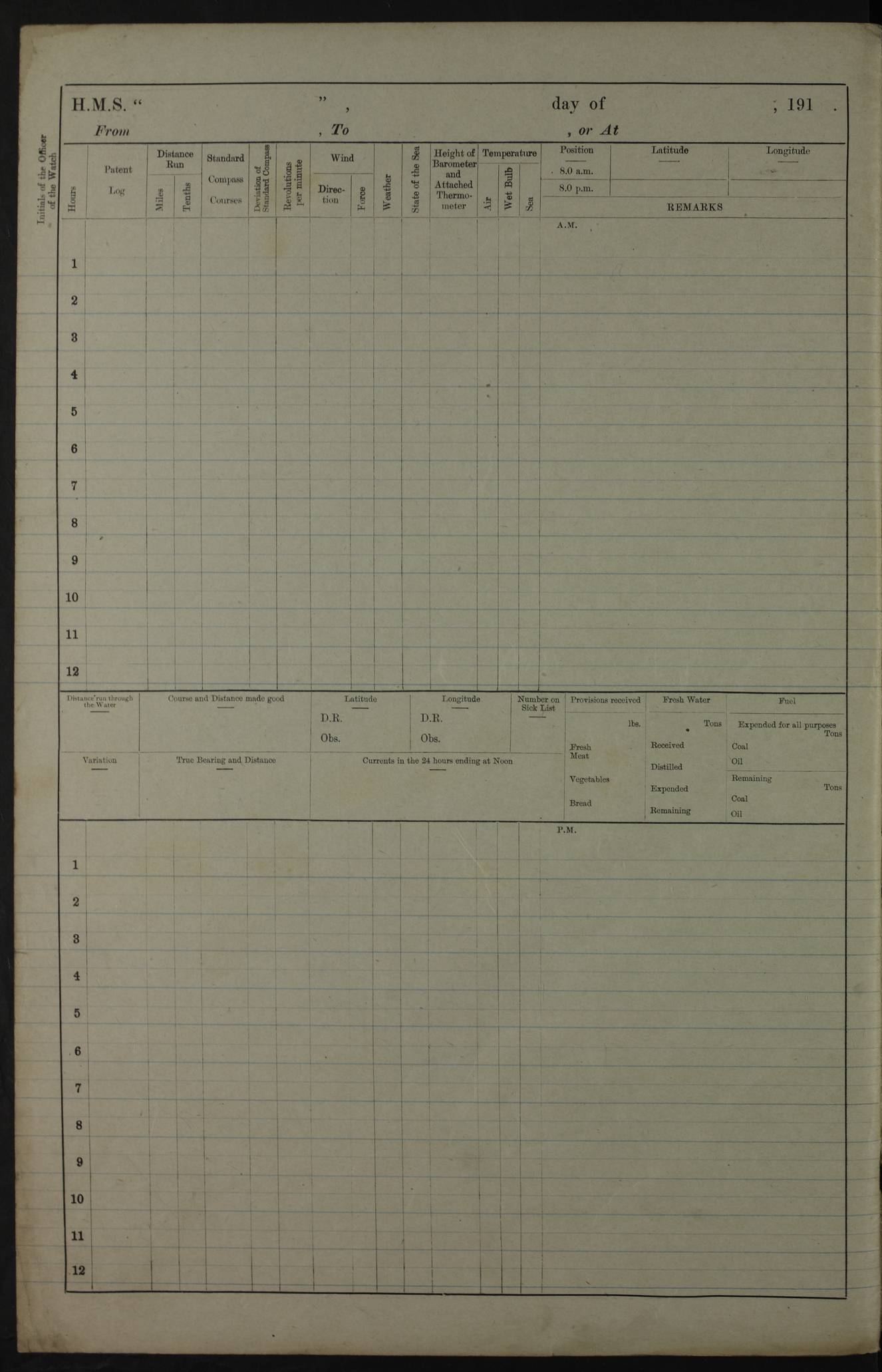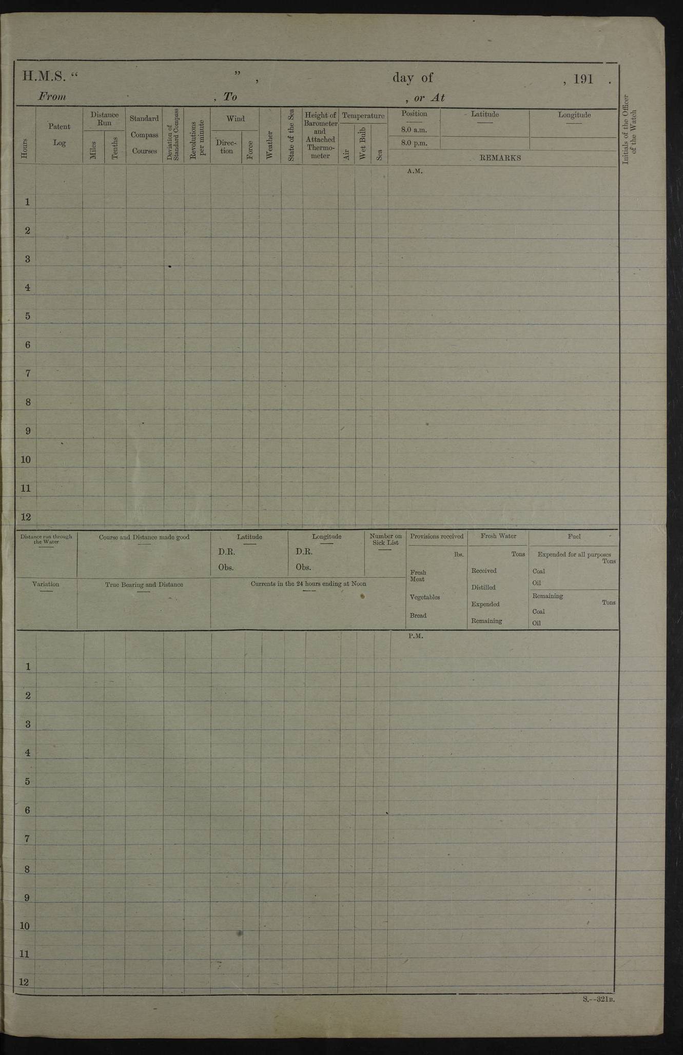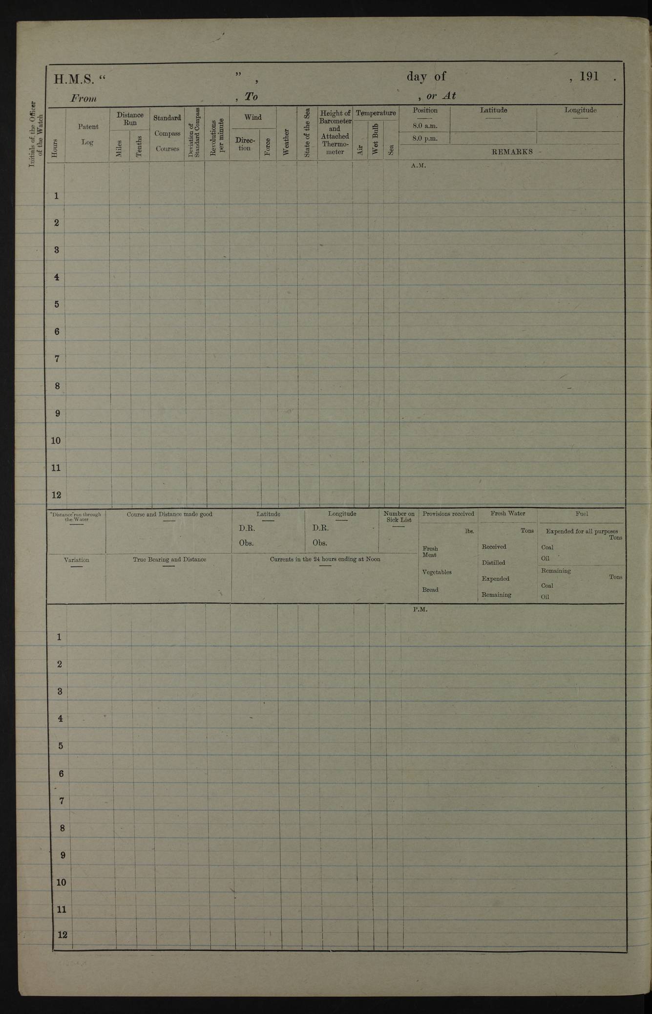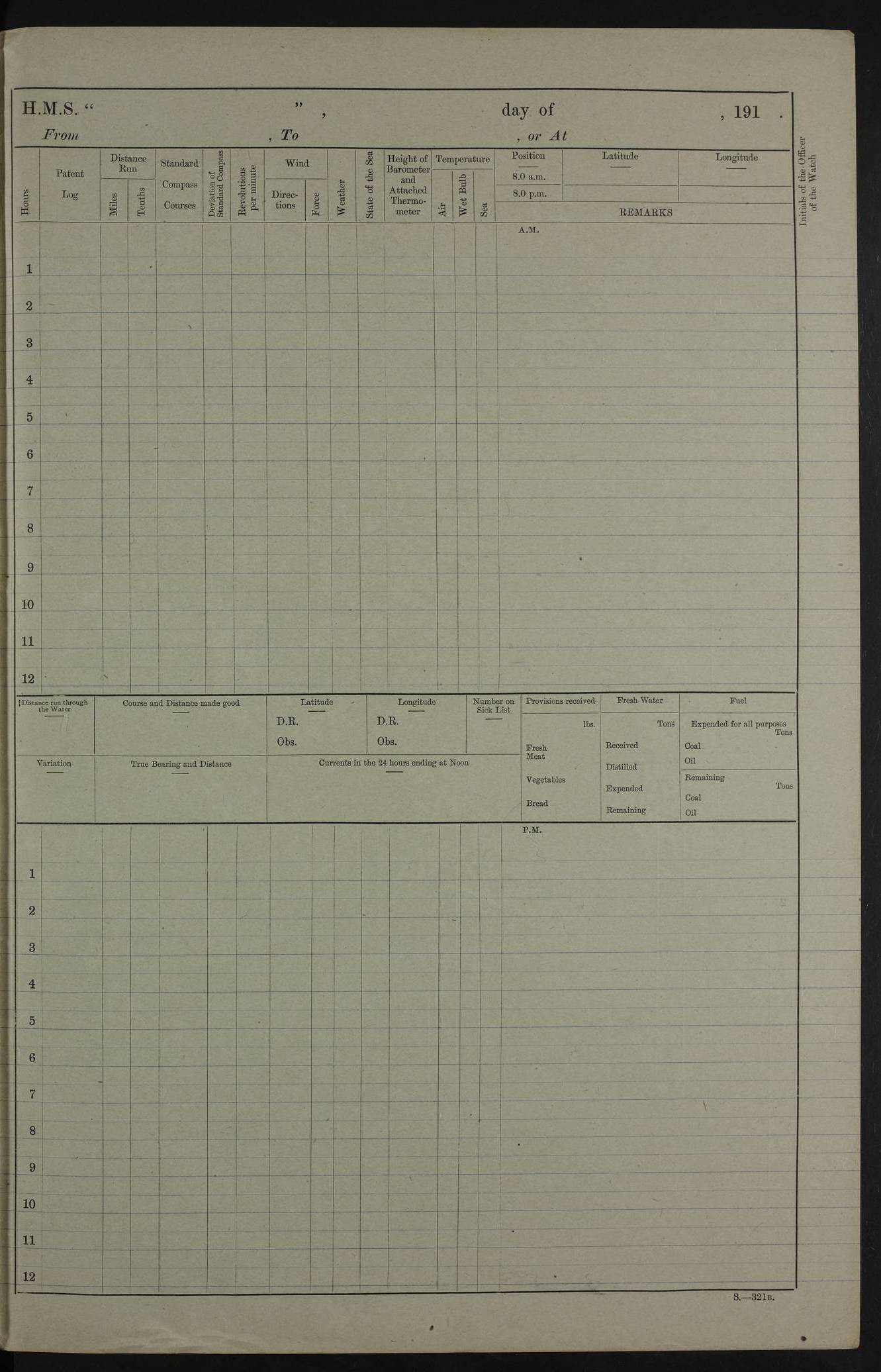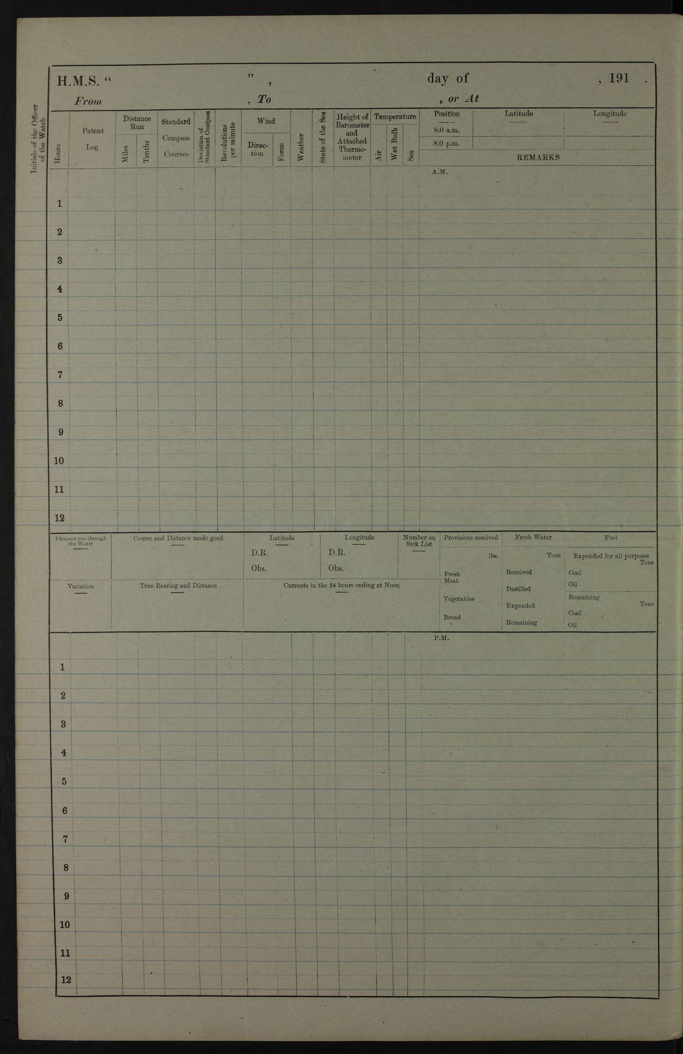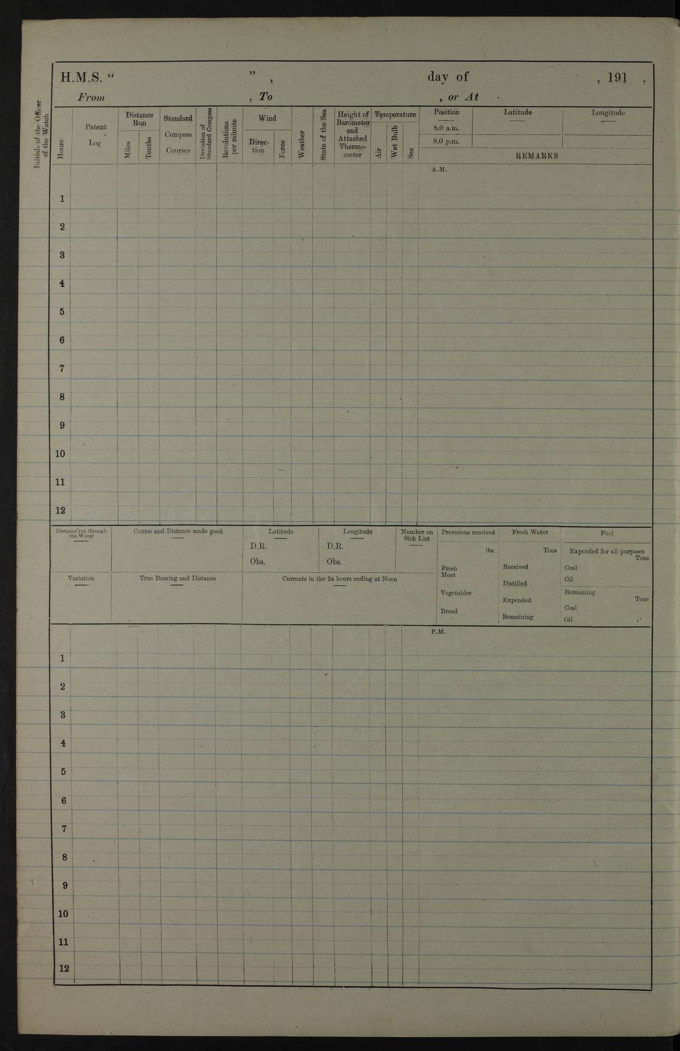 PM - Discharged To Hospital: H Widger, Engine Room Artificer - PW Harrison, Stoker Royal Navy Reserve To Motor Launch 11: J W Whitfield, Stoker 4ef4fa93e53e0a0c910056e2: (https://s3.amazonaws.com:443/oldweather/ADM53-39392/0018_0.jpg) 31 August 1916 Place: Basrah Lat 30.5269, Long 47.8407 2:00am: Rounds 5:05am: Hospital Ship SYRIA passed down 5:30am: Hands 6:00am: Morning Routine 8:00am: Wells dry – Signal Books Correct 9:30am: Divisions - Hands cleaning ship 11:00am: Drew Three Thousand Rupees from the Field treasury 12:00pm: Signal Books Correct – Issued Quinine to ship’s company 12:30pm: Piped Down 3:30pm: 4:00pm: Signal Books Correct 4:30pm: Cleared up decks 5:00pm: Evening Quarters – Leave to Watch of Naval Ratings 7:00pm: Sunset - Fire Gear in readiness 7:30pm: Liberty men returned 8:00pm: Wells dry - Signal Books Correct 9:00pm: Rounds - Signal Books Correct 11:00pm: Destroyed 19 tins Milk being unfit for use. AM – Joined From Motor Launch Depot: M. McMillan, Able Seaman From 5 Mess: T. Jackson, Petty Officer 1st From 4 Mess: T Golden, Stoker – J Tunney, Royal Navy Reserve Trawler Section From 10 Mess: J Donegan Royal Navy Reserve Trawler Section