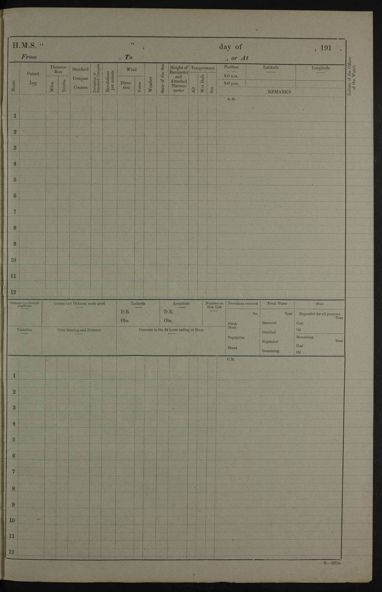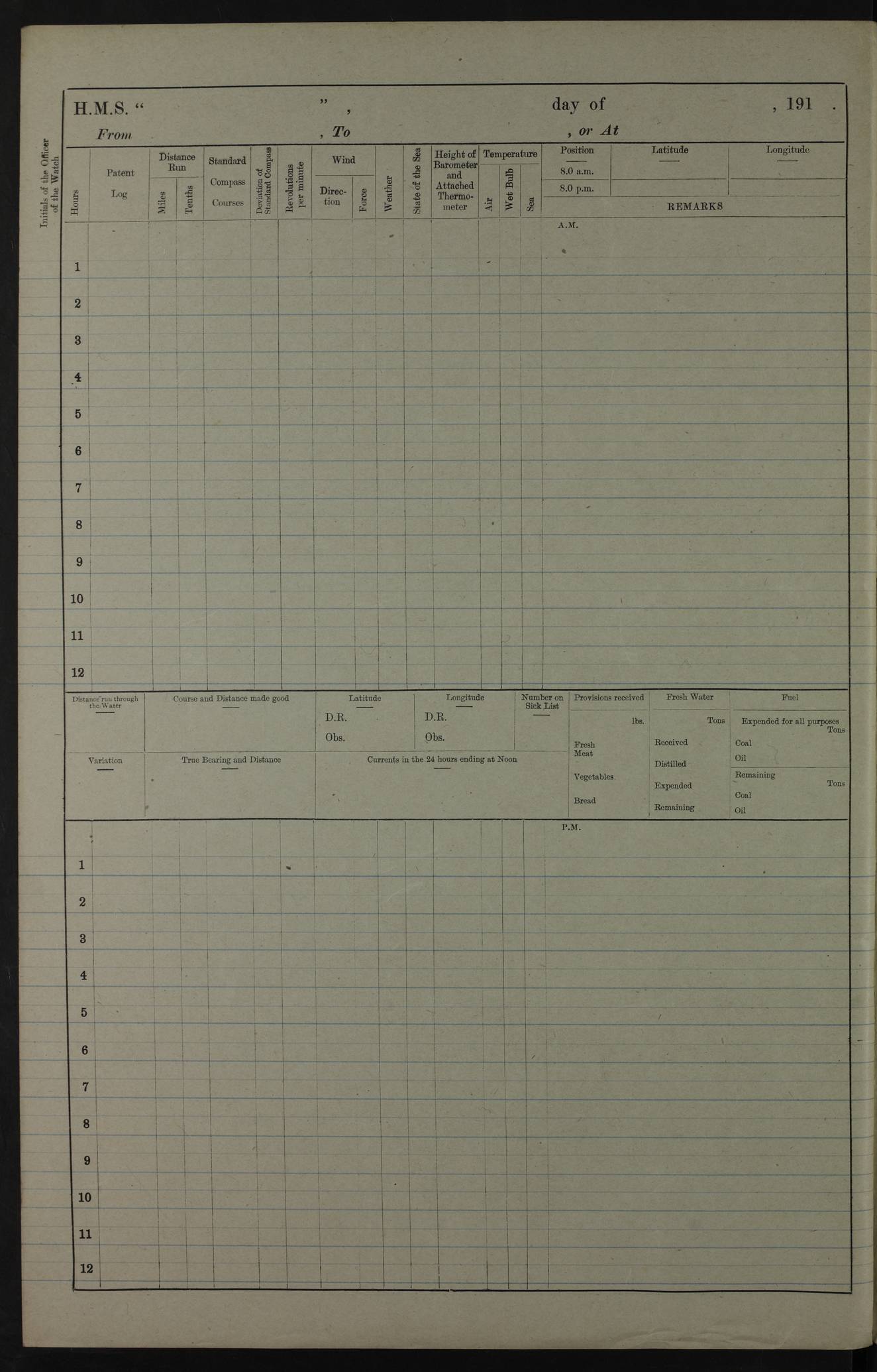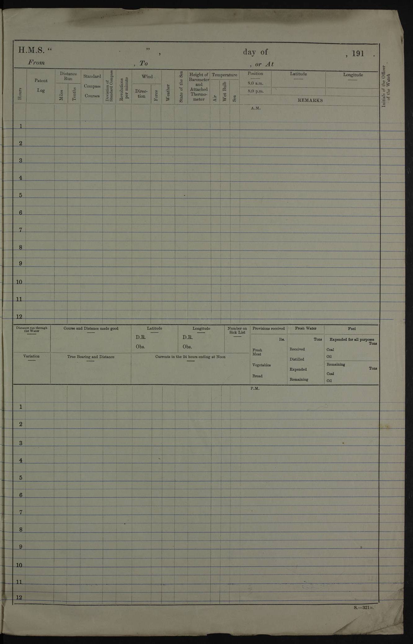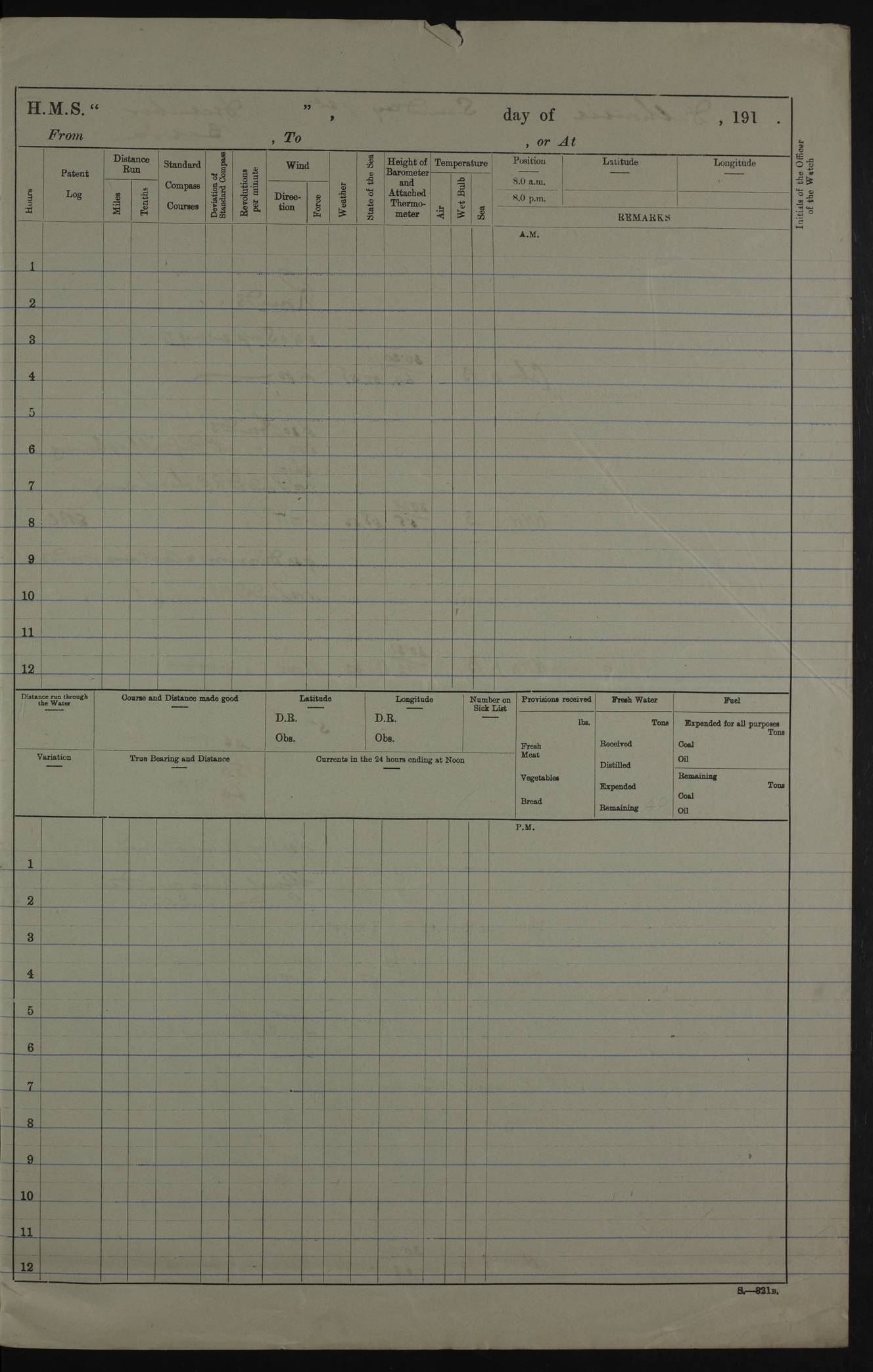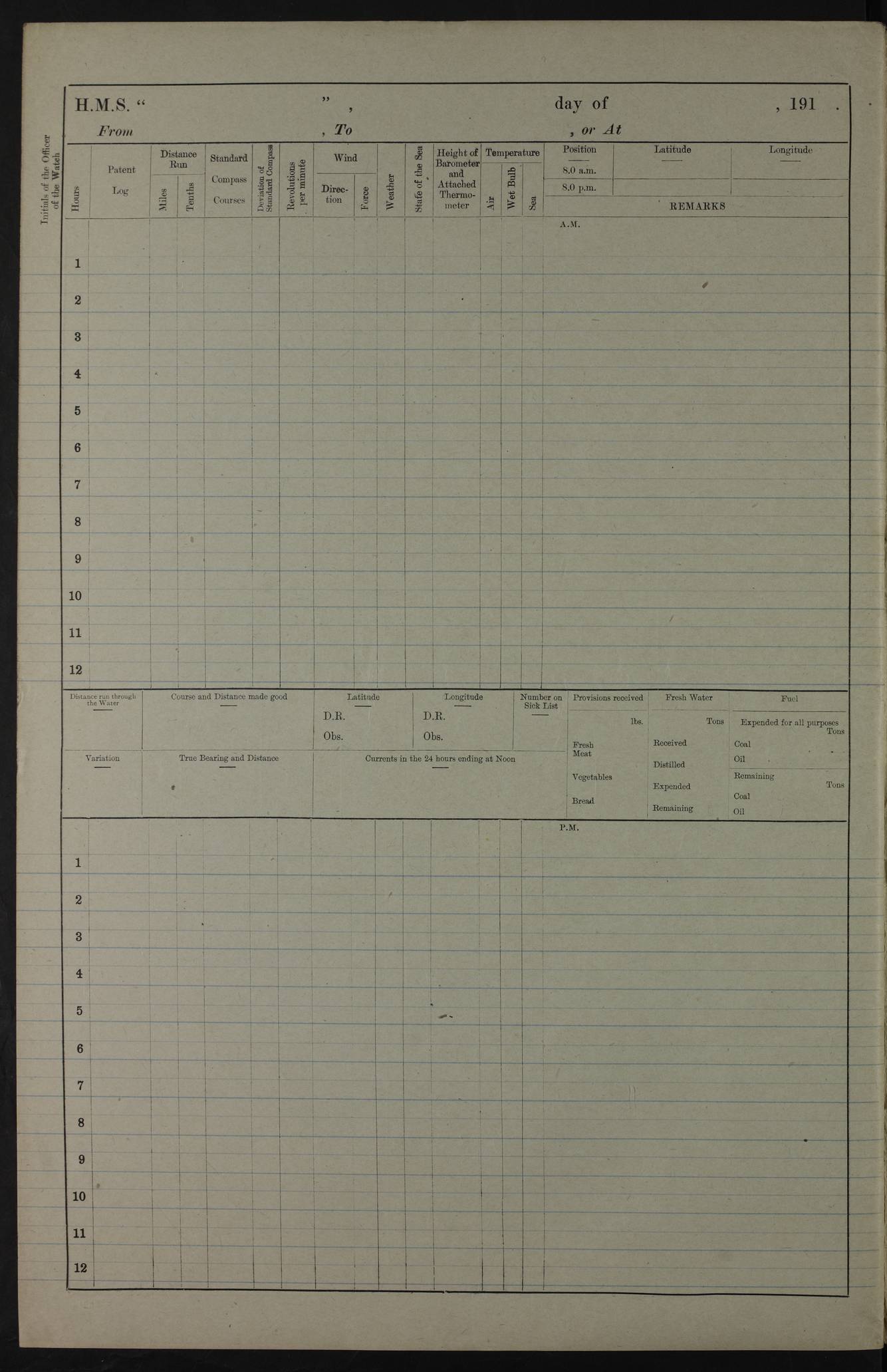 PM - Discharged To Hospital: H Widger, Engine Room Artificer - PW Harrison, Stoker Royal Navy Reserve To Motor Launch 11: J W Whitfield, Stoker 4ef4fa93e53e0a0c910056e2: (https://s3.amazonaws.com:443/oldweather/ADM53-39392/0018_0.jpg) 31 August 1916 Place: Basrah Lat 30.5269, Long 47.8407 2:00am: Rounds 5:05am: Hospital Ship SYRIA passed down 5:30am: Hands 6:00am: Morning Routine 8:00am: Wells dry – Signal Books Correct 9:30am: Divisions - Hands cleaning ship 11:00am: Drew Three Thousand Rupees from the Field treasury 12:00pm: Signal Books Correct – Issued Quinine to ship’s company 12:30pm: Piped Down 3:30pm: 4:00pm: Signal Books Correct 4:30pm: Cleared up decks 5:00pm: Evening Quarters – Leave to Watch of Naval Ratings 7:00pm: Sunset - Fire Gear in readiness 7:30pm: Liberty men returned 8:00pm: Wells dry - Signal Books Correct 9:00pm: Rounds - Signal Books Correct 11:00pm: Destroyed 19 tins Milk being unfit for use. AM – Joined From Motor Launch Depot: M. McMillan, Able Seaman From 5 Mess: T. Jackson, Petty Officer 1st From 4 Mess: T Golden, Stoker – J Tunney, Royal Navy Reserve Trawler Section From 10 Mess: J Donegan Royal Navy Reserve Trawler Section