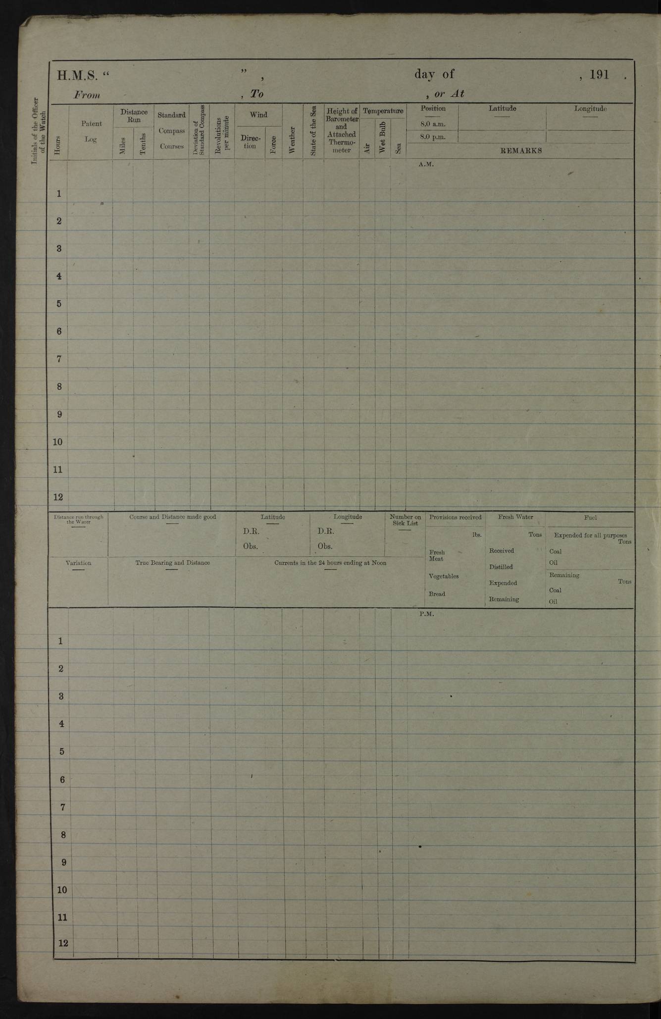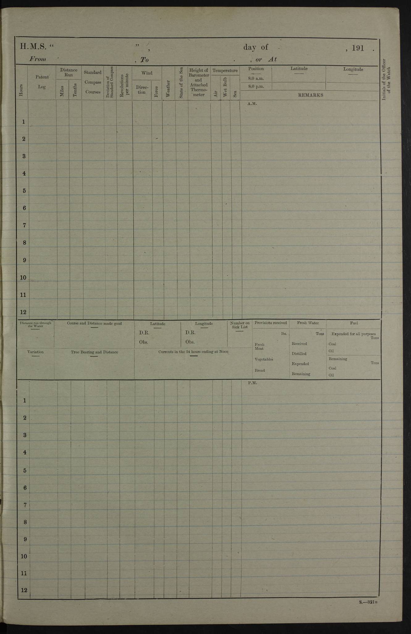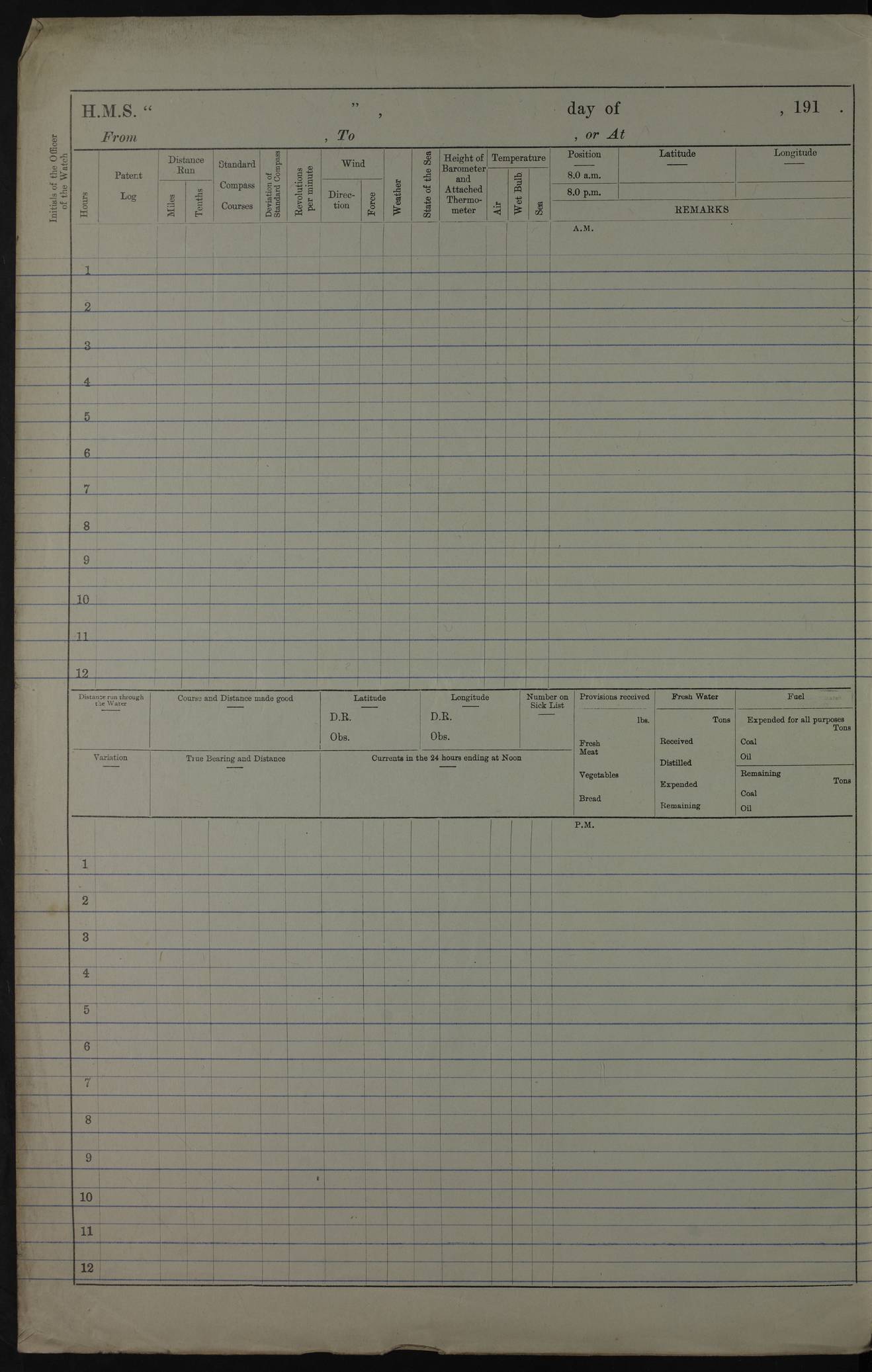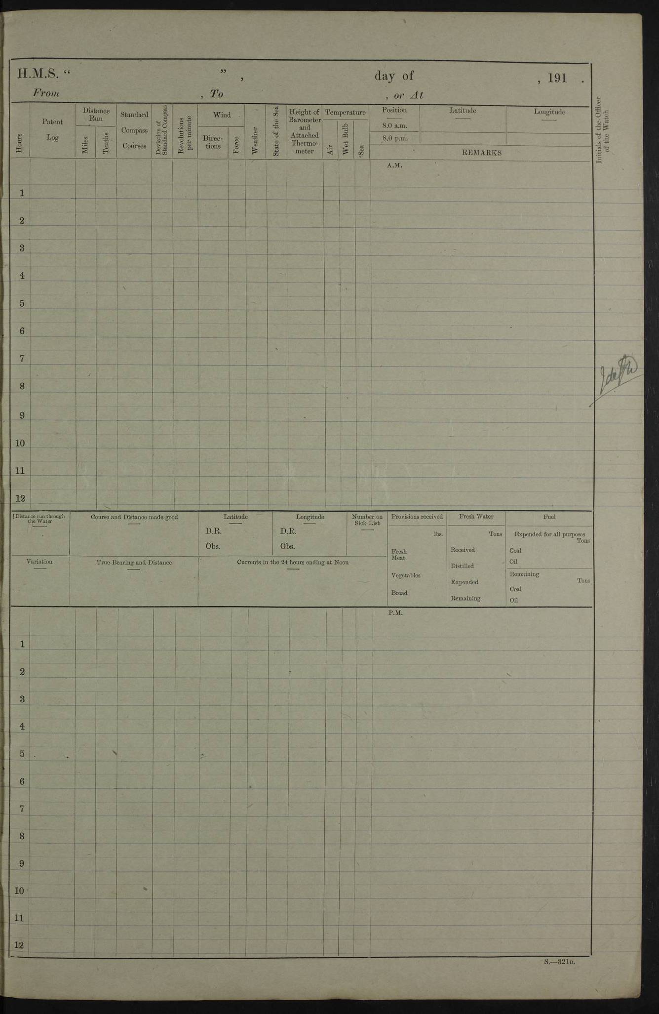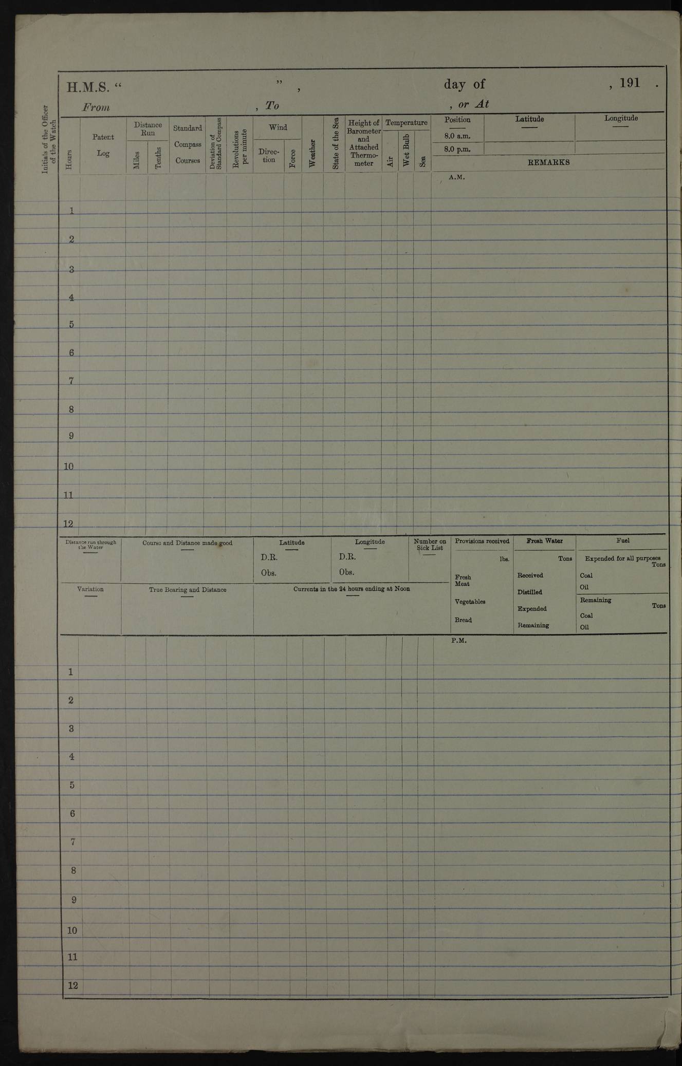 PM - Discharged To Hospital: H Widger, Engine Room Artificer - PW Harrison, Stoker Royal Navy Reserve To Motor Launch 11: J W Whitfield, Stoker 4ef4fa93e53e0a0c910056e2: (https://s3.amazonaws.com:443/oldweather/ADM53-39392/0018_0.jpg) 31 August 1916 Place: Basrah Lat 30.5269, Long 47.8407 2:00am: Rounds 5:05am: Hospital Ship SYRIA passed down 5:30am: Hands 6:00am: Morning Routine 8:00am: Wells dry – Signal Books Correct 9:30am: Divisions - Hands cleaning ship 11:00am: Drew Three Thousand Rupees from the Field treasury 12:00pm: Signal Books Correct – Issued Quinine to ship’s company 12:30pm: Piped Down 3:30pm: 4:00pm: Signal Books Correct 4:30pm: Cleared up decks 5:00pm: Evening Quarters – Leave to Watch of Naval Ratings 7:00pm: Sunset - Fire Gear in readiness 7:30pm: Liberty men returned 8:00pm: Wells dry - Signal Books Correct 9:00pm: Rounds - Signal Books Correct 11:00pm: Destroyed 19 tins Milk being unfit for use. AM – Joined From Motor Launch Depot: M. McMillan, Able Seaman From 5 Mess: T. Jackson, Petty Officer 1st From 4 Mess: T Golden, Stoker – J Tunney, Royal Navy Reserve Trawler Section From 10 Mess: J Donegan Royal Navy Reserve Trawler Section