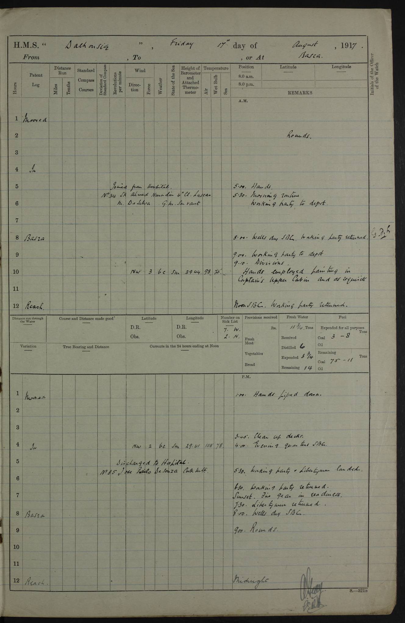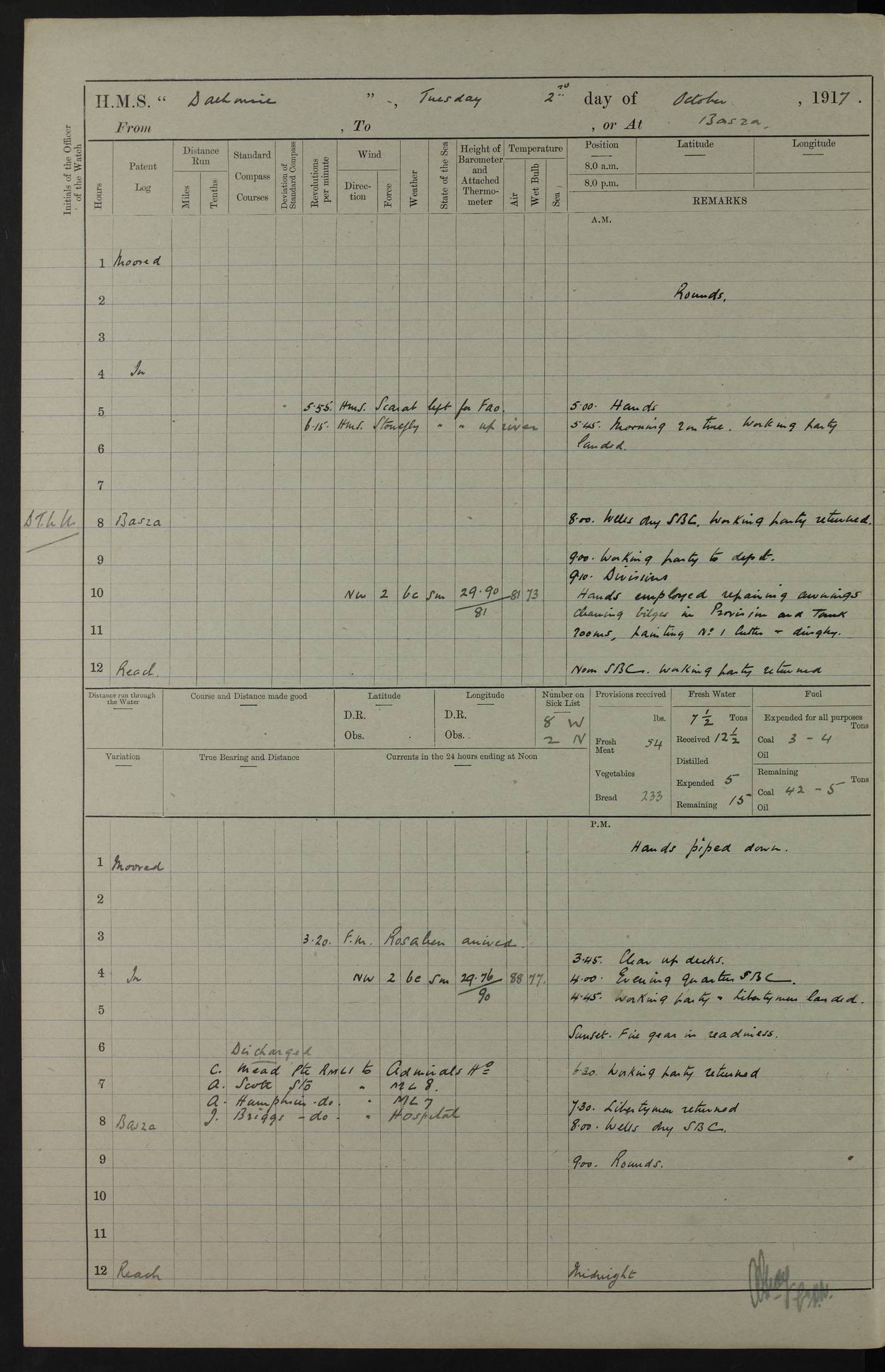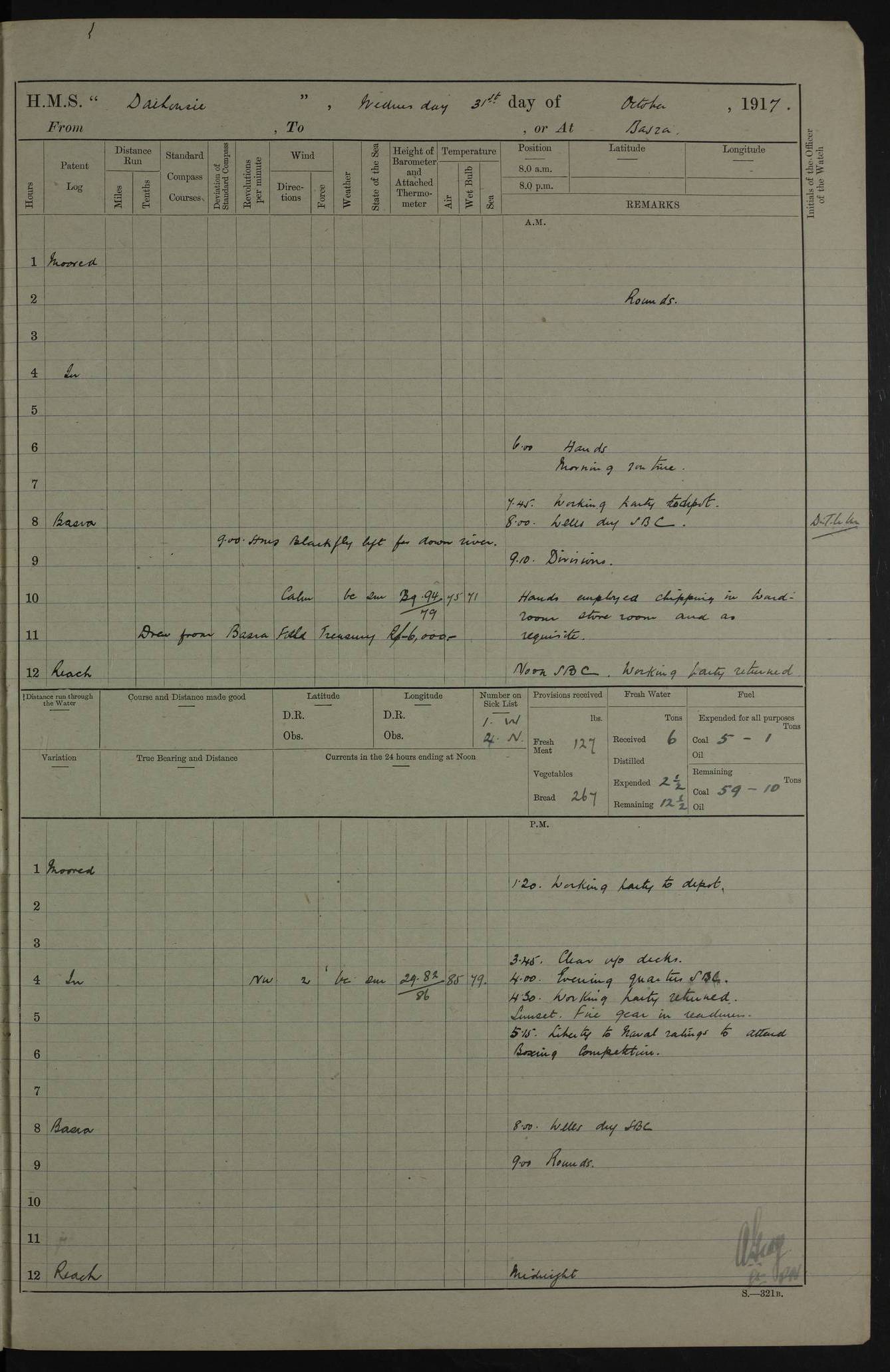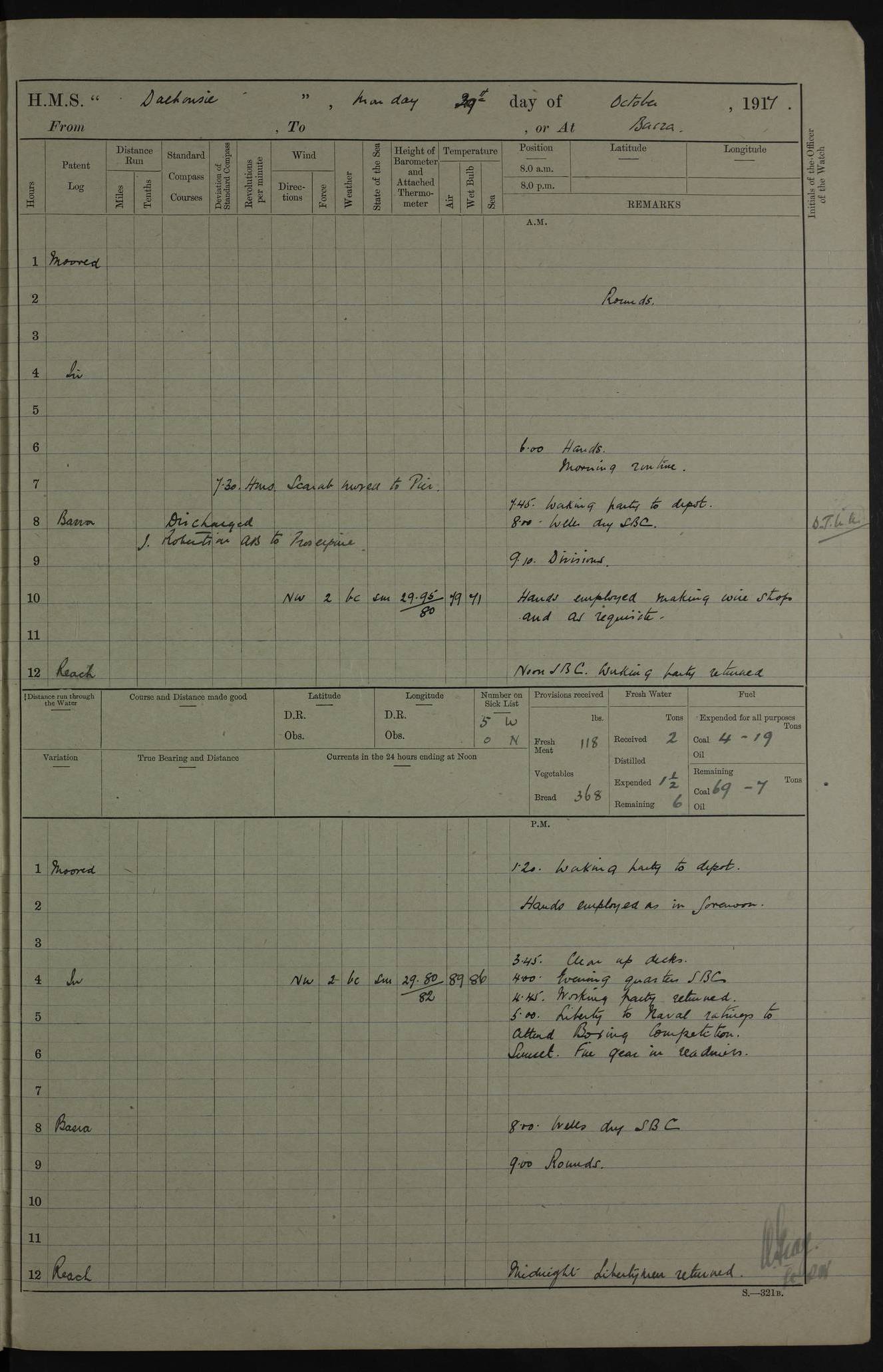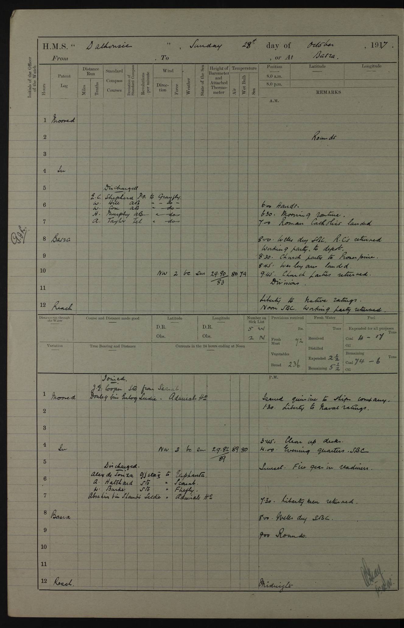 4ef4fafce53e0a0c91005931: (https://s3.amazonaws.com:443/oldweather/ADM53-39406/0015_1.jpg) 27 October 1917 Place: Basrah Lat 30.5269, Long 47.8407 2:00am: Rounds 6:00am: Hands - Morning Routine 7:00am: Exercised Fire stations 7:45am: Working party to Depot 8:00am: Wells dry - Signal Books correct 10:00am: Hands employed cleaning ship 12:00pm: Signal Books correct – Working party returned 1:00pm: Hands piped down 1:30pm: Liberty to Naval Ratings 3:45pm: Cleared up decks 4:00pm: Evening Quarters – Signal Books correct 5:15pm: Liberty to Naval Ratings 6:00pm: Sunset - Fire Gear in readiness 7:30pm: Liberty men returned 8:00pm: Wells dry - Signal Books correct 9:00pm: Rounds – Signal Books correct AM – Discharged To BARALA: W Denyer, Able Seaman - A Childs, Able Seaman - H Beckham Seaman - N Murray Seaman PM - Discharged To SCARAB: A Bushill, Senior Petty Officer - H Garth, Signalman To TARANTULA: G Campbell, Ship’s Steward Assistant 4ef4fafde53e0a0c91005932: (https://s3.amazonaws.com:443/oldweather/ADM53-39406/0016_0.jpg) 28 October 1917 Place: Basrah Lat 30.5269, Long 47.8407 2:00am: Rounds 5:30am: Hands 6:00am: Morning Routine 7:00am: Roman Catholic Church party landed 8:00am: Wells dry – Signal Books correct – Roman Catholics returned - Working party to Depot 8:30am: Church of England party to PROSERPINE 8:45am: Wesleyans landed 9:45am: Church parties returned - Divisions 10:30am: Liberty to Native Ratings 12:00pm: Signal Books correct – Working party returned 1:00pm: Issued Quinine to Naval Ratings- Issued Quinine to Native Ratings 1:30pm: Liberty to Naval ratings 3:45pm: Cleared up decks 4:00pm: Evening Quarters – Signal Books correct 5:15pm: Liberty to Naval Ratings 6:00pm: Sunset - Fire Gear in readiness 7:30pm: Liberty men returned 8:00pm: Wells dry - Signal Books correct 9:00pm: Rounds – Signal Books correct AM – Discharged To GRAYFLY: E.C. Shepherd, Petty Officer - W Hill, Able Seaman - Q Cox, Able Seaman - H Murphy, Able Seaman - A Taylor Telegrapher PM – Joined From SCARAB: J.G. Cooper, Stoker From Admiral’s House: Dounleg bin Eulog, Seedie PM - Discharged To ELEPHANTA: Alex de Souza, Officer's Steward To SCARAB: A Hatchard, Stoker To FIREFLY: W Burke, Stoker To Admiral’s House: Abrahim bin Shambi, Seedie