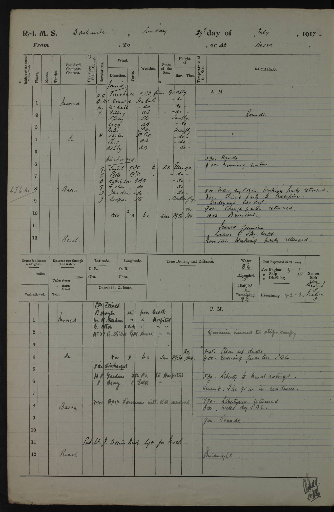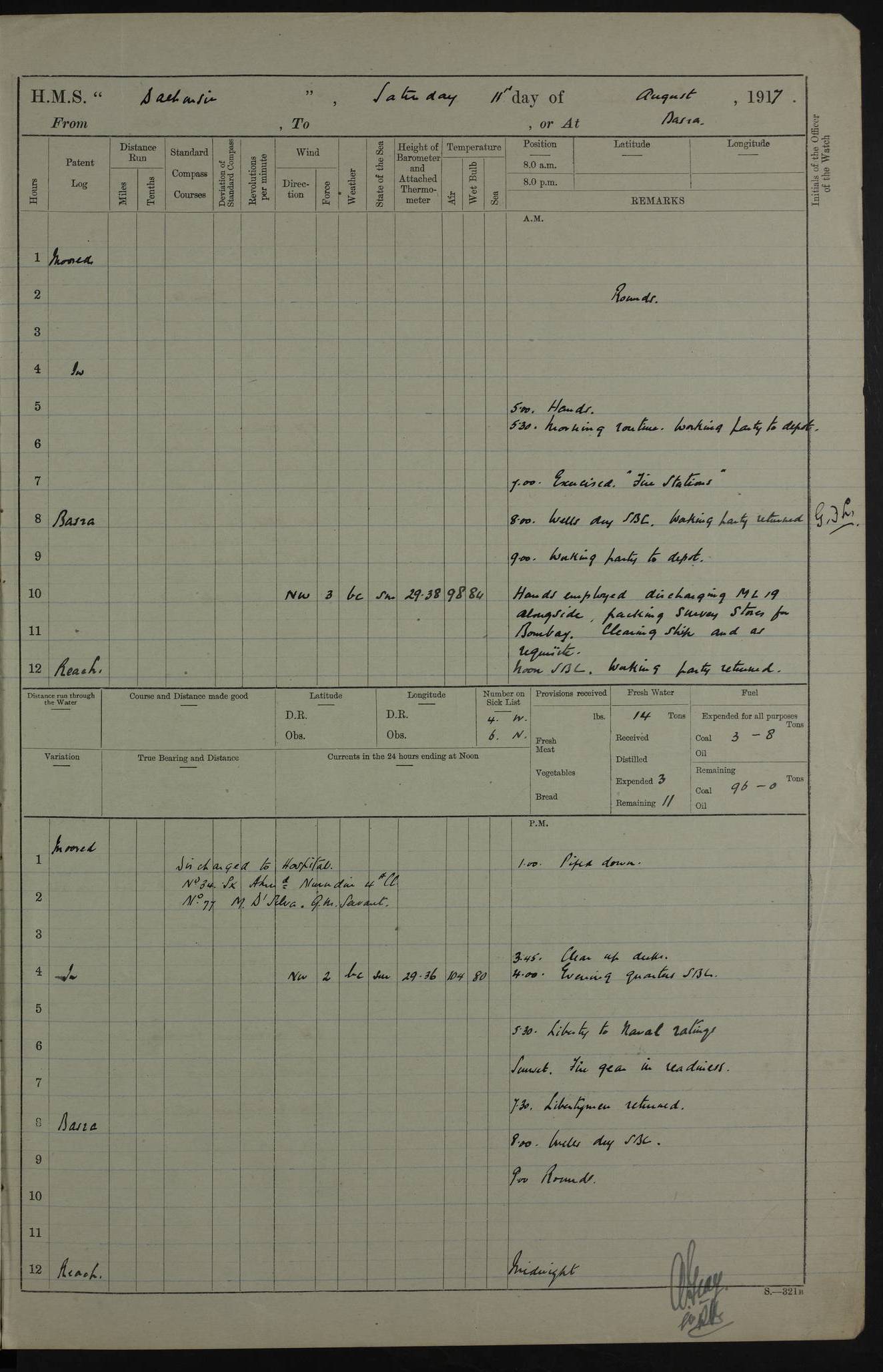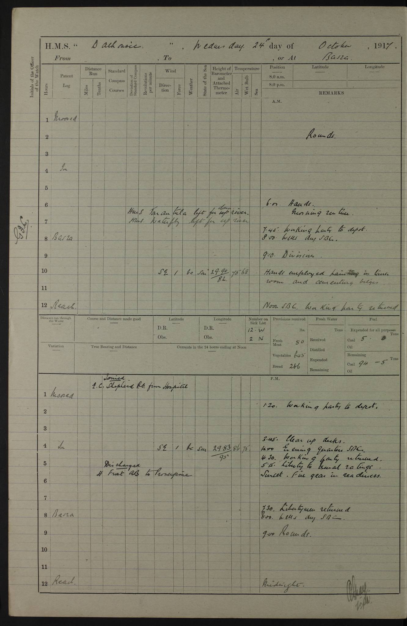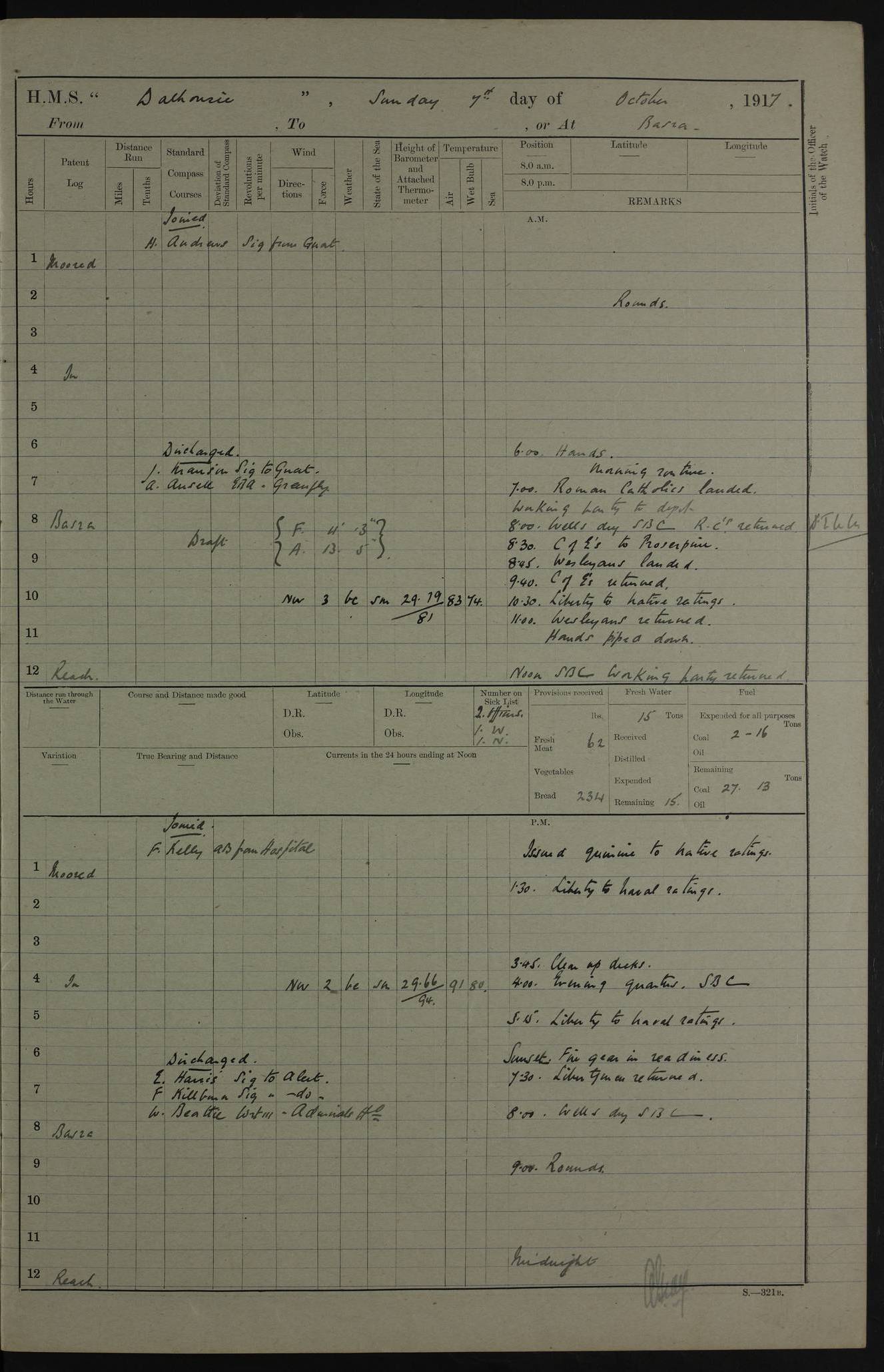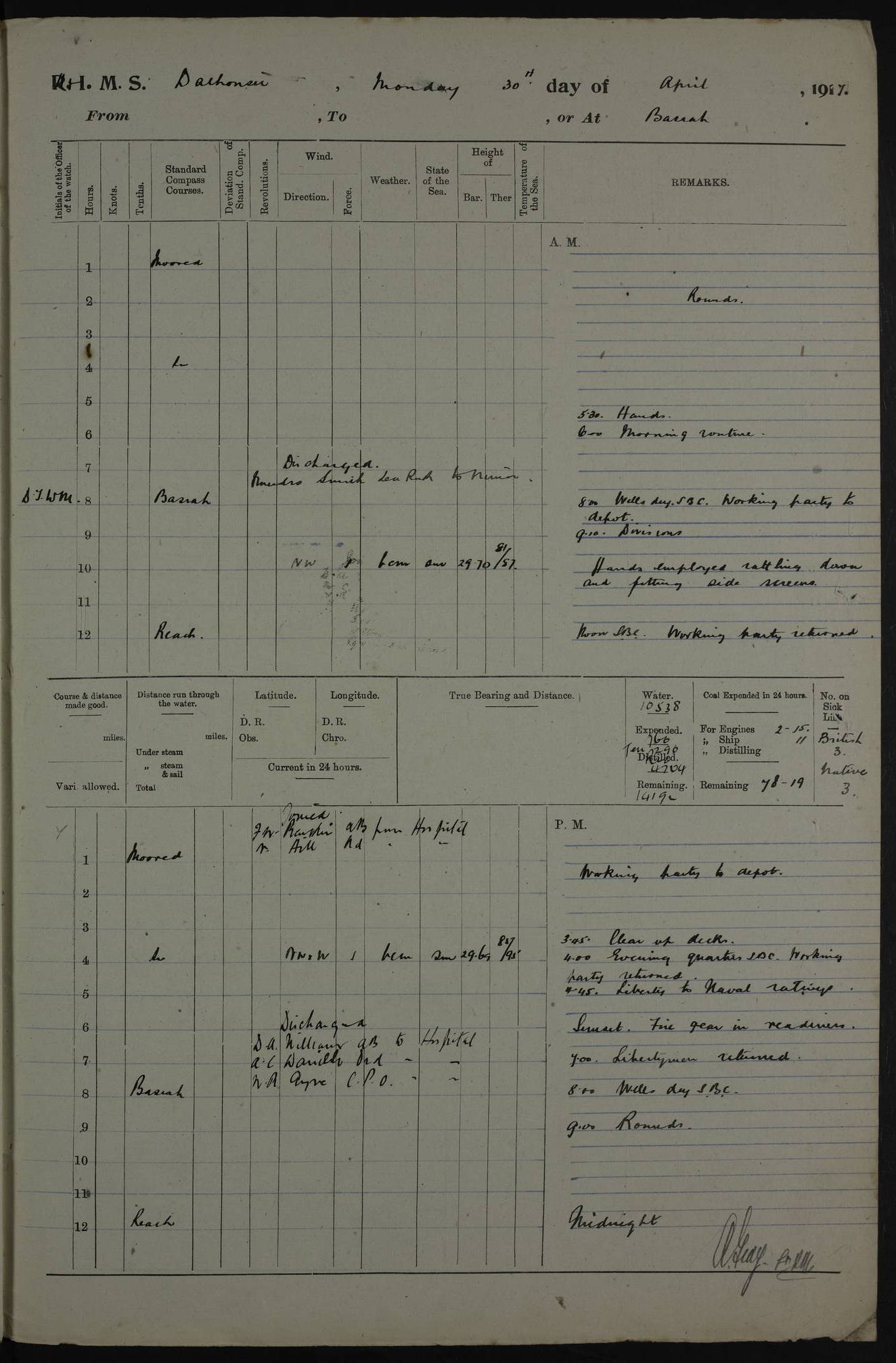 4ef4fafce53e0a0c91005931: (https://s3.amazonaws.com:443/oldweather/ADM53-39406/0015_1.jpg) 27 October 1917 Place: Basrah Lat 30.5269, Long 47.8407 2:00am: Rounds 6:00am: Hands - Morning Routine 7:00am: Exercised Fire stations 7:45am: Working party to Depot 8:00am: Wells dry - Signal Books correct 10:00am: Hands employed cleaning ship 12:00pm: Signal Books correct – Working party returned 1:00pm: Hands piped down 1:30pm: Liberty to Naval Ratings 3:45pm: Cleared up decks 4:00pm: Evening Quarters – Signal Books correct 5:15pm: Liberty to Naval Ratings 6:00pm: Sunset - Fire Gear in readiness 7:30pm: Liberty men returned 8:00pm: Wells dry - Signal Books correct 9:00pm: Rounds – Signal Books correct AM – Discharged To BARALA: W Denyer, Able Seaman - A Childs, Able Seaman - H Beckham Seaman - N Murray Seaman PM - Discharged To SCARAB: A Bushill, Senior Petty Officer - H Garth, Signalman To TARANTULA: G Campbell, Ship’s Steward Assistant 4ef4fafde53e0a0c91005932: (https://s3.amazonaws.com:443/oldweather/ADM53-39406/0016_0.jpg) 28 October 1917 Place: Basrah Lat 30.5269, Long 47.8407 2:00am: Rounds 5:30am: Hands 6:00am: Morning Routine 7:00am: Roman Catholic Church party landed 8:00am: Wells dry – Signal Books correct – Roman Catholics returned - Working party to Depot 8:30am: Church of England party to PROSERPINE 8:45am: Wesleyans landed 9:45am: Church parties returned - Divisions 10:30am: Liberty to Native Ratings 12:00pm: Signal Books correct – Working party returned 1:00pm: Issued Quinine to Naval Ratings- Issued Quinine to Native Ratings 1:30pm: Liberty to Naval ratings 3:45pm: Cleared up decks 4:00pm: Evening Quarters – Signal Books correct 5:15pm: Liberty to Naval Ratings 6:00pm: Sunset - Fire Gear in readiness 7:30pm: Liberty men returned 8:00pm: Wells dry - Signal Books correct 9:00pm: Rounds – Signal Books correct AM – Discharged To GRAYFLY: E.C. Shepherd, Petty Officer - W Hill, Able Seaman - Q Cox, Able Seaman - H Murphy, Able Seaman - A Taylor Telegrapher PM – Joined From SCARAB: J.G. Cooper, Stoker From Admiral’s House: Dounleg bin Eulog, Seedie PM - Discharged To ELEPHANTA: Alex de Souza, Officer's Steward To SCARAB: A Hatchard, Stoker To FIREFLY: W Burke, Stoker To Admiral’s House: Abrahim bin Shambi, Seedie