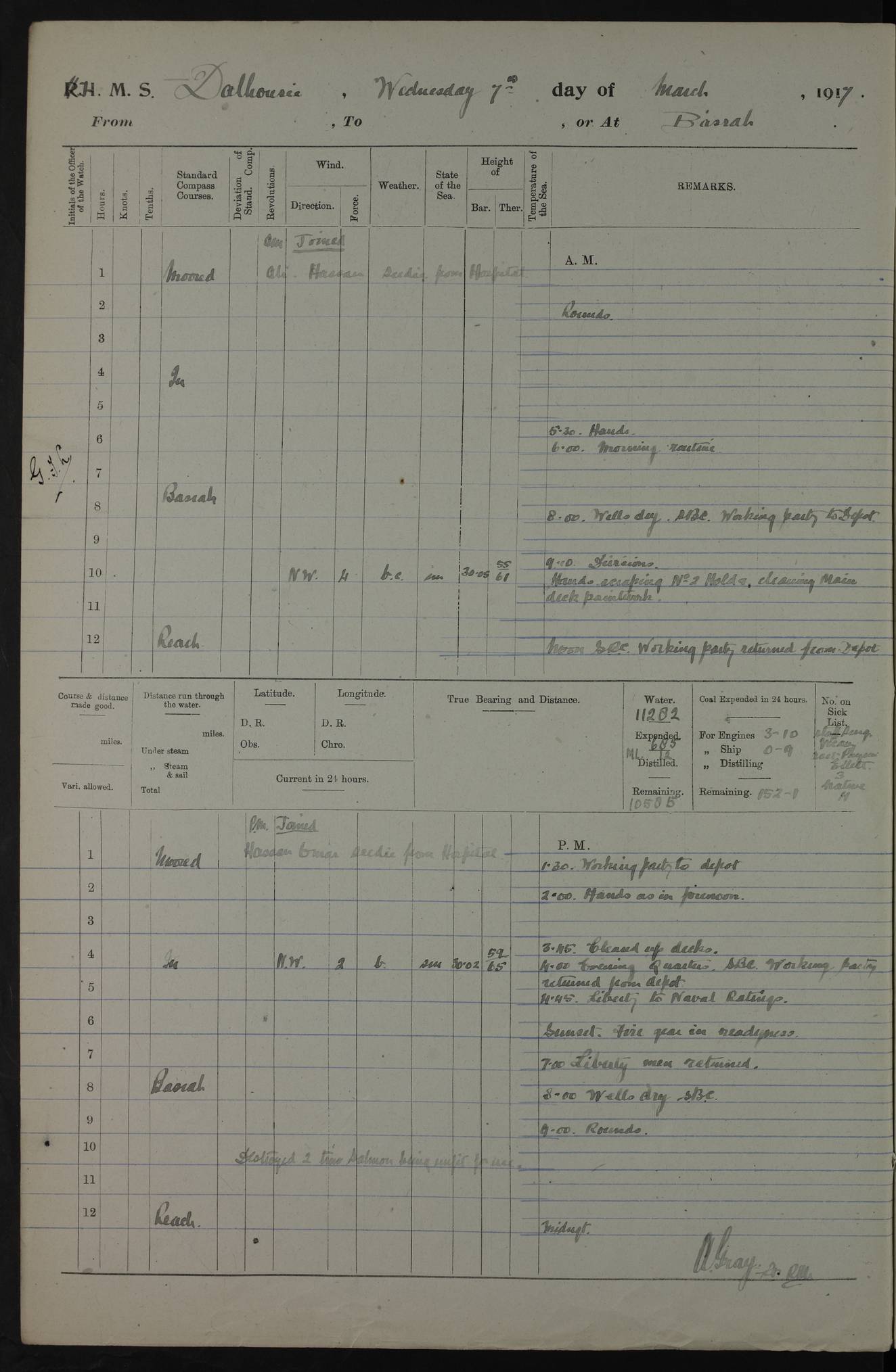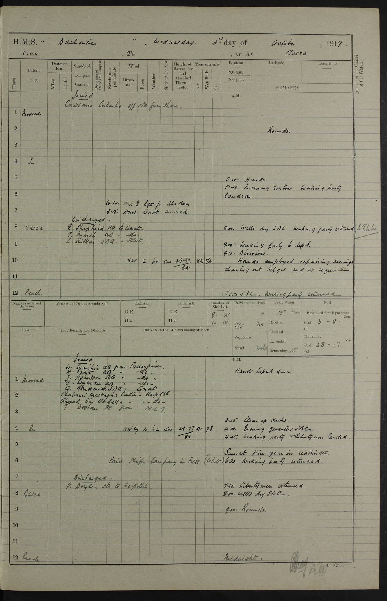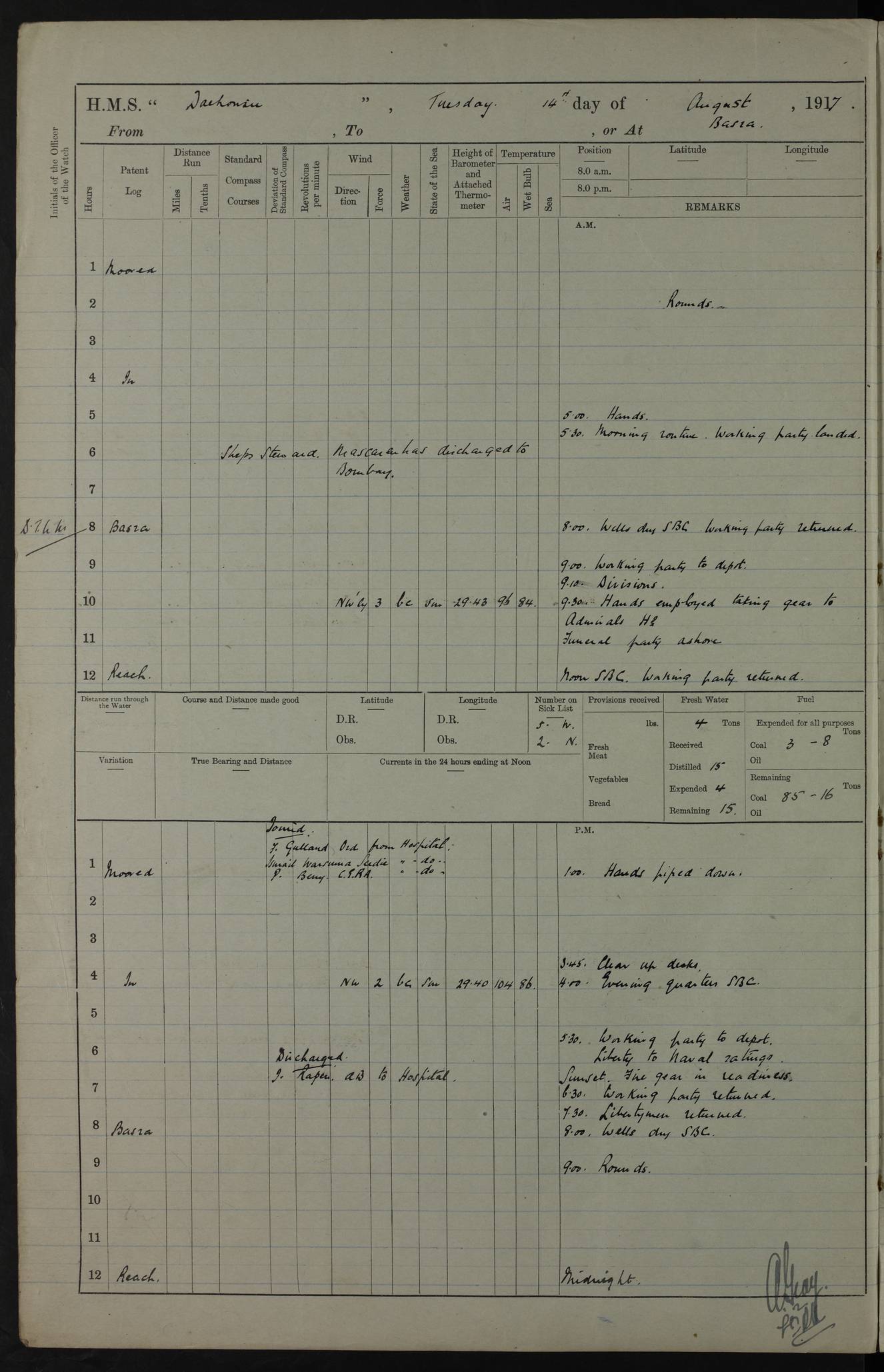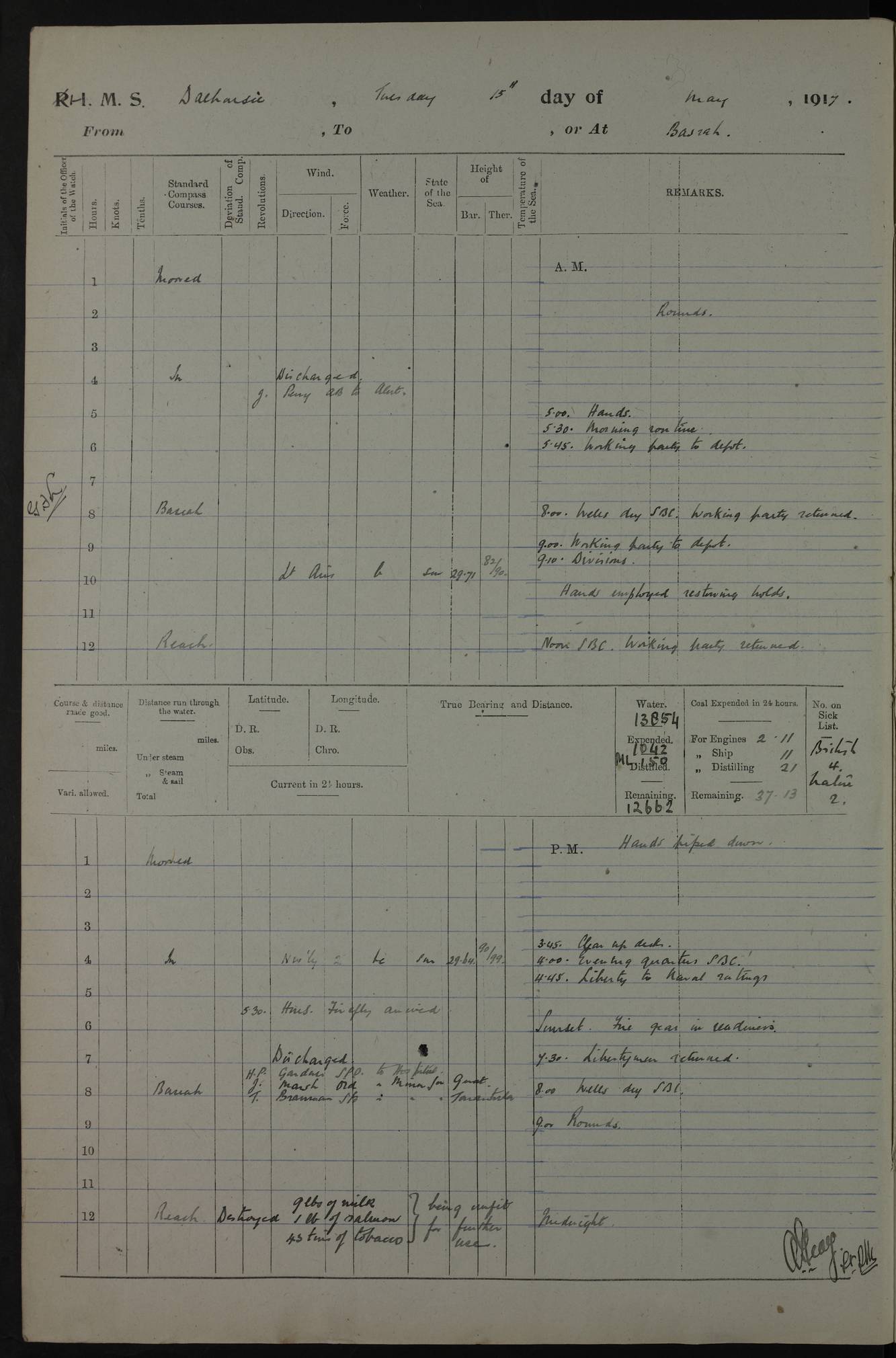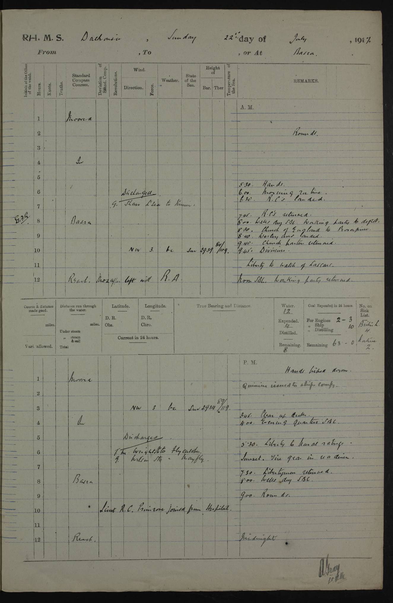 4ef4fafce53e0a0c91005931: (https://s3.amazonaws.com:443/oldweather/ADM53-39406/0015_1.jpg) 27 October 1917 Place: Basrah Lat 30.5269, Long 47.8407 2:00am: Rounds 6:00am: Hands - Morning Routine 7:00am: Exercised Fire stations 7:45am: Working party to Depot 8:00am: Wells dry - Signal Books correct 10:00am: Hands employed cleaning ship 12:00pm: Signal Books correct – Working party returned 1:00pm: Hands piped down 1:30pm: Liberty to Naval Ratings 3:45pm: Cleared up decks 4:00pm: Evening Quarters – Signal Books correct 5:15pm: Liberty to Naval Ratings 6:00pm: Sunset - Fire Gear in readiness 7:30pm: Liberty men returned 8:00pm: Wells dry - Signal Books correct 9:00pm: Rounds – Signal Books correct AM – Discharged To BARALA: W Denyer, Able Seaman - A Childs, Able Seaman - H Beckham Seaman - N Murray Seaman PM - Discharged To SCARAB: A Bushill, Senior Petty Officer - H Garth, Signalman To TARANTULA: G Campbell, Ship’s Steward Assistant 4ef4fafde53e0a0c91005932: (https://s3.amazonaws.com:443/oldweather/ADM53-39406/0016_0.jpg) 28 October 1917 Place: Basrah Lat 30.5269, Long 47.8407 2:00am: Rounds 5:30am: Hands 6:00am: Morning Routine 7:00am: Roman Catholic Church party landed 8:00am: Wells dry – Signal Books correct – Roman Catholics returned - Working party to Depot 8:30am: Church of England party to PROSERPINE 8:45am: Wesleyans landed 9:45am: Church parties returned - Divisions 10:30am: Liberty to Native Ratings 12:00pm: Signal Books correct – Working party returned 1:00pm: Issued Quinine to Naval Ratings- Issued Quinine to Native Ratings 1:30pm: Liberty to Naval ratings 3:45pm: Cleared up decks 4:00pm: Evening Quarters – Signal Books correct 5:15pm: Liberty to Naval Ratings 6:00pm: Sunset - Fire Gear in readiness 7:30pm: Liberty men returned 8:00pm: Wells dry - Signal Books correct 9:00pm: Rounds – Signal Books correct AM – Discharged To GRAYFLY: E.C. Shepherd, Petty Officer - W Hill, Able Seaman - Q Cox, Able Seaman - H Murphy, Able Seaman - A Taylor Telegrapher PM – Joined From SCARAB: J.G. Cooper, Stoker From Admiral’s House: Dounleg bin Eulog, Seedie PM - Discharged To ELEPHANTA: Alex de Souza, Officer's Steward To SCARAB: A Hatchard, Stoker To FIREFLY: W Burke, Stoker To Admiral’s House: Abrahim bin Shambi, Seedie