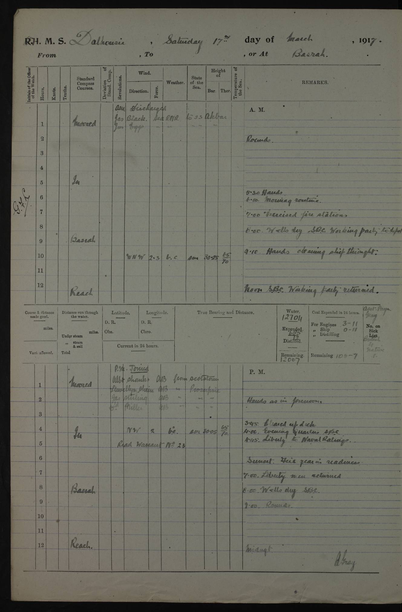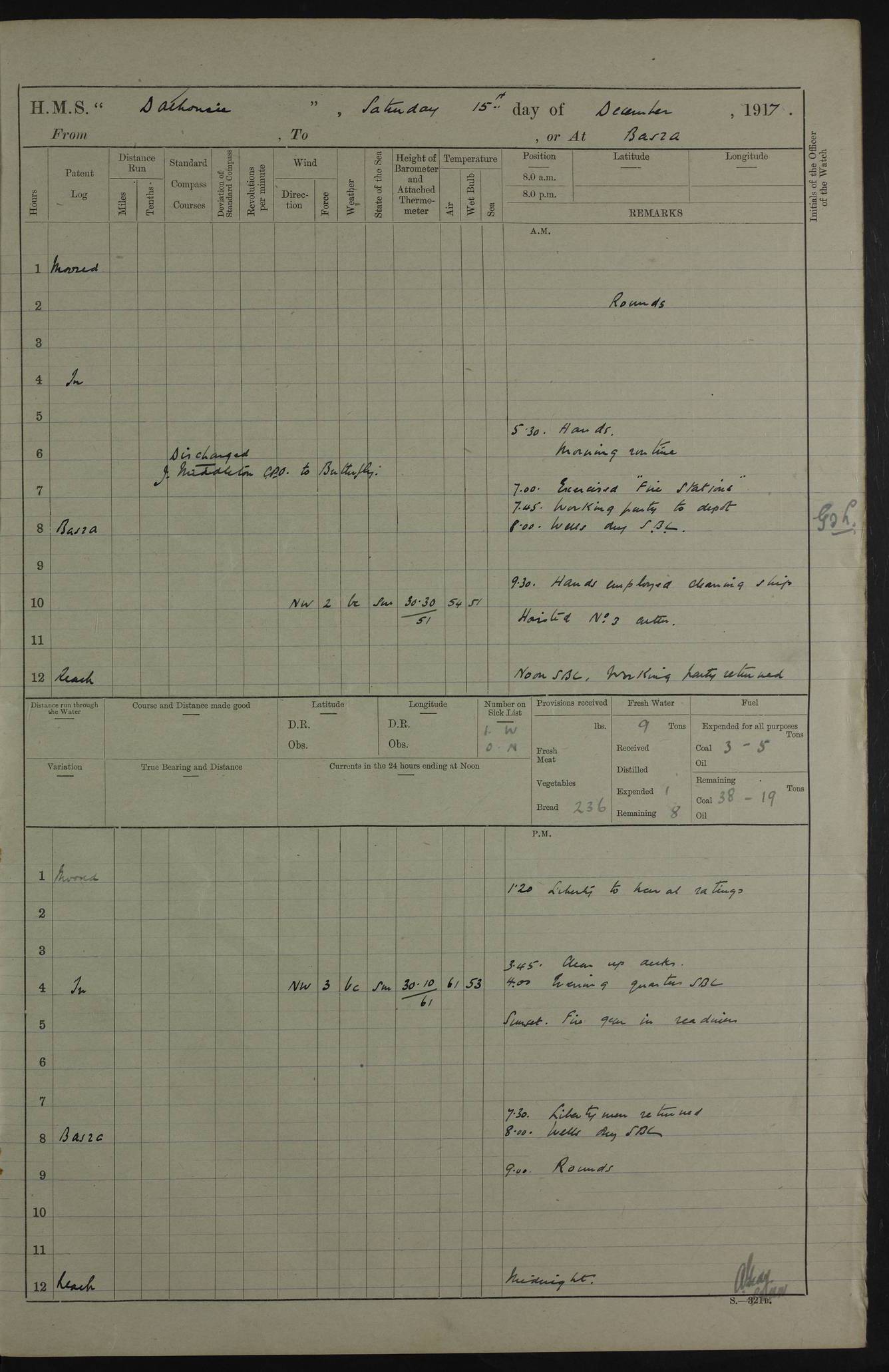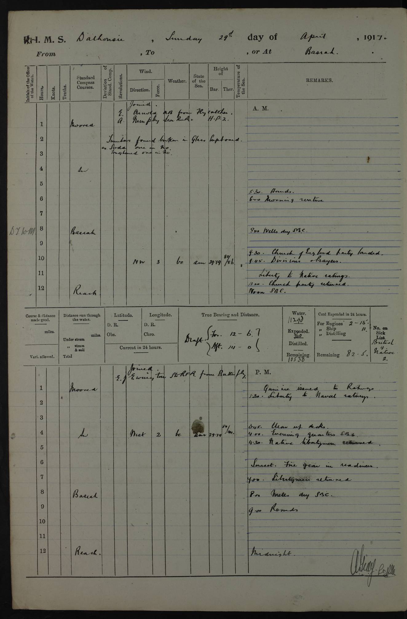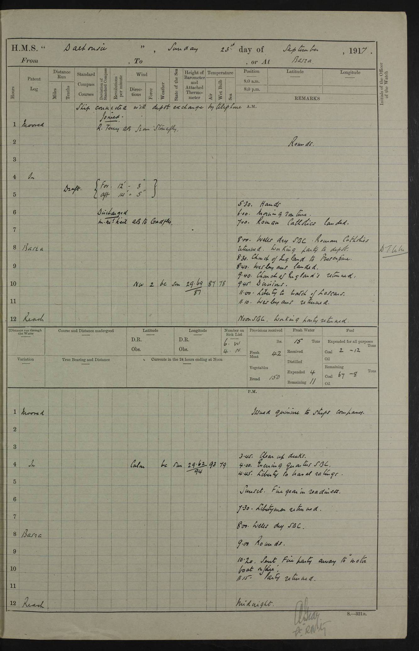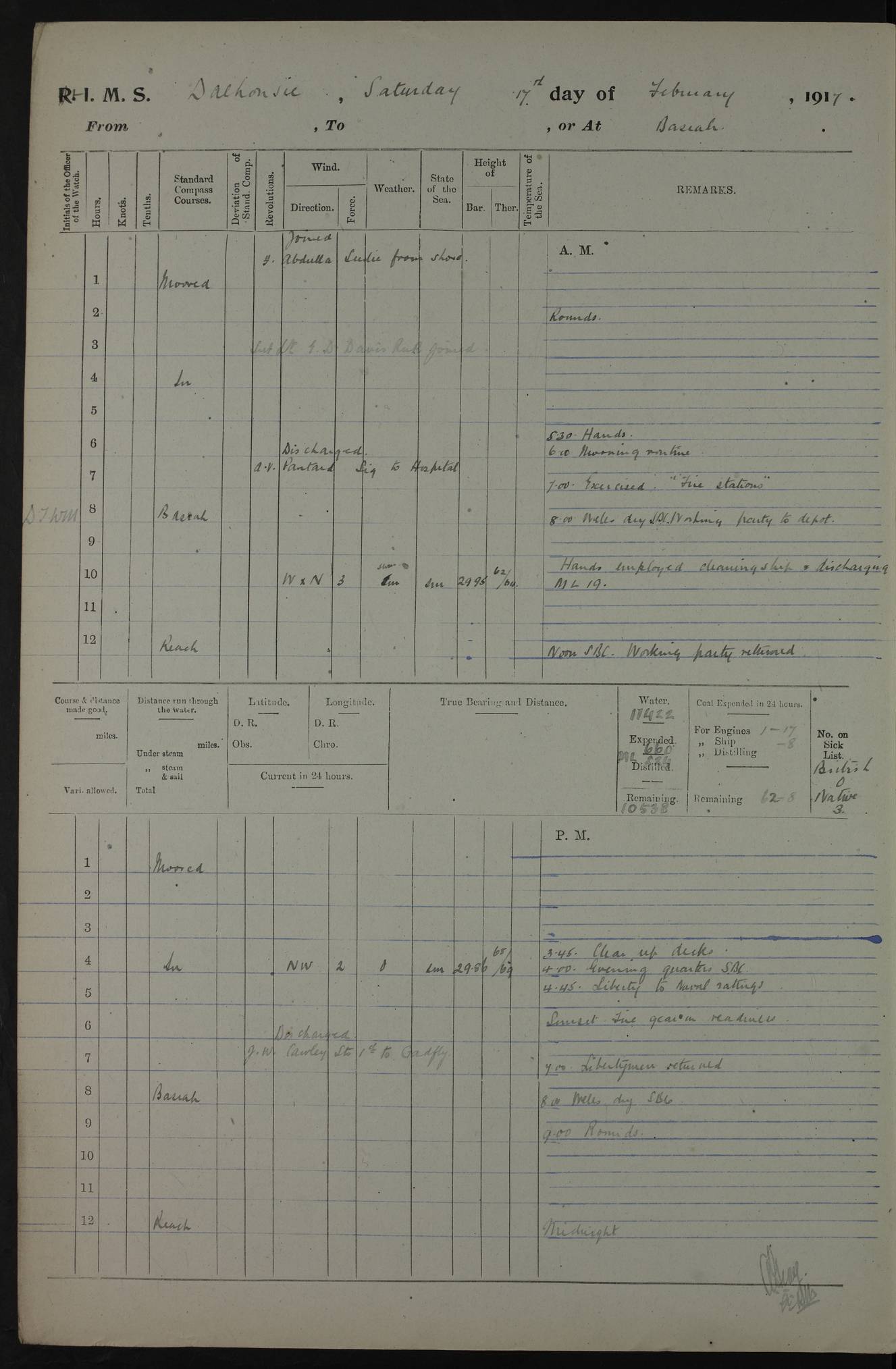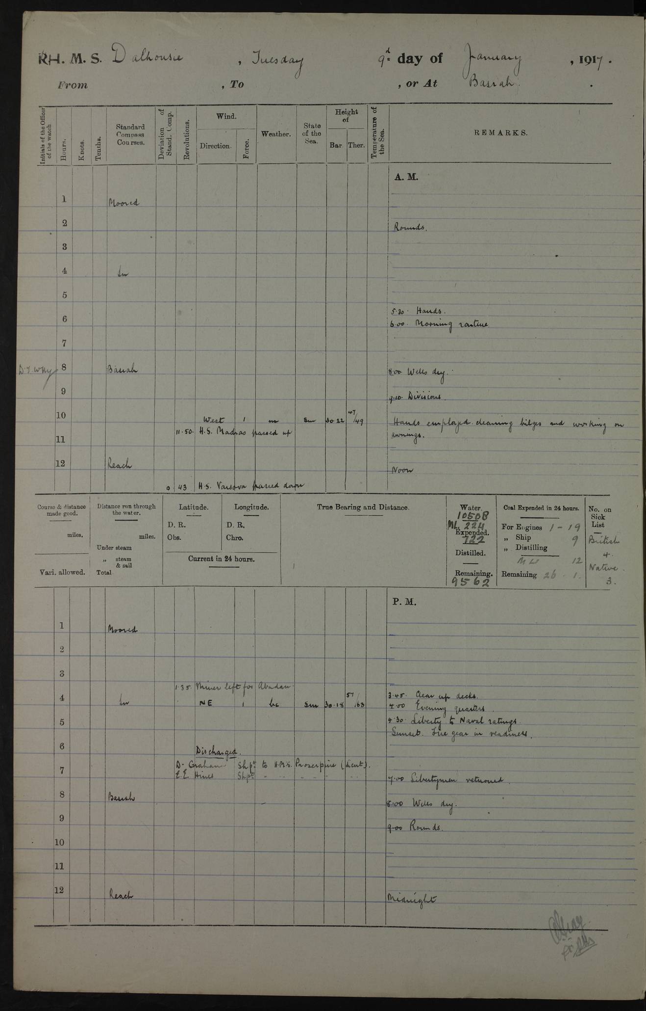 4ef4fafce53e0a0c91005931: (https://s3.amazonaws.com:443/oldweather/ADM53-39406/0015_1.jpg) 27 October 1917 Place: Basrah Lat 30.5269, Long 47.8407 2:00am: Rounds 6:00am: Hands - Morning Routine 7:00am: Exercised Fire stations 7:45am: Working party to Depot 8:00am: Wells dry - Signal Books correct 10:00am: Hands employed cleaning ship 12:00pm: Signal Books correct – Working party returned 1:00pm: Hands piped down 1:30pm: Liberty to Naval Ratings 3:45pm: Cleared up decks 4:00pm: Evening Quarters – Signal Books correct 5:15pm: Liberty to Naval Ratings 6:00pm: Sunset - Fire Gear in readiness 7:30pm: Liberty men returned 8:00pm: Wells dry - Signal Books correct 9:00pm: Rounds – Signal Books correct AM – Discharged To BARALA: W Denyer, Able Seaman - A Childs, Able Seaman - H Beckham Seaman - N Murray Seaman PM - Discharged To SCARAB: A Bushill, Senior Petty Officer - H Garth, Signalman To TARANTULA: G Campbell, Ship’s Steward Assistant 4ef4fafde53e0a0c91005932: (https://s3.amazonaws.com:443/oldweather/ADM53-39406/0016_0.jpg) 28 October 1917 Place: Basrah Lat 30.5269, Long 47.8407 2:00am: Rounds 5:30am: Hands 6:00am: Morning Routine 7:00am: Roman Catholic Church party landed 8:00am: Wells dry – Signal Books correct – Roman Catholics returned - Working party to Depot 8:30am: Church of England party to PROSERPINE 8:45am: Wesleyans landed 9:45am: Church parties returned - Divisions 10:30am: Liberty to Native Ratings 12:00pm: Signal Books correct – Working party returned 1:00pm: Issued Quinine to Naval Ratings- Issued Quinine to Native Ratings 1:30pm: Liberty to Naval ratings 3:45pm: Cleared up decks 4:00pm: Evening Quarters – Signal Books correct 5:15pm: Liberty to Naval Ratings 6:00pm: Sunset - Fire Gear in readiness 7:30pm: Liberty men returned 8:00pm: Wells dry - Signal Books correct 9:00pm: Rounds – Signal Books correct AM – Discharged To GRAYFLY: E.C. Shepherd, Petty Officer - W Hill, Able Seaman - Q Cox, Able Seaman - H Murphy, Able Seaman - A Taylor Telegrapher PM – Joined From SCARAB: J.G. Cooper, Stoker From Admiral’s House: Dounleg bin Eulog, Seedie PM - Discharged To ELEPHANTA: Alex de Souza, Officer's Steward To SCARAB: A Hatchard, Stoker To FIREFLY: W Burke, Stoker To Admiral’s House: Abrahim bin Shambi, Seedie