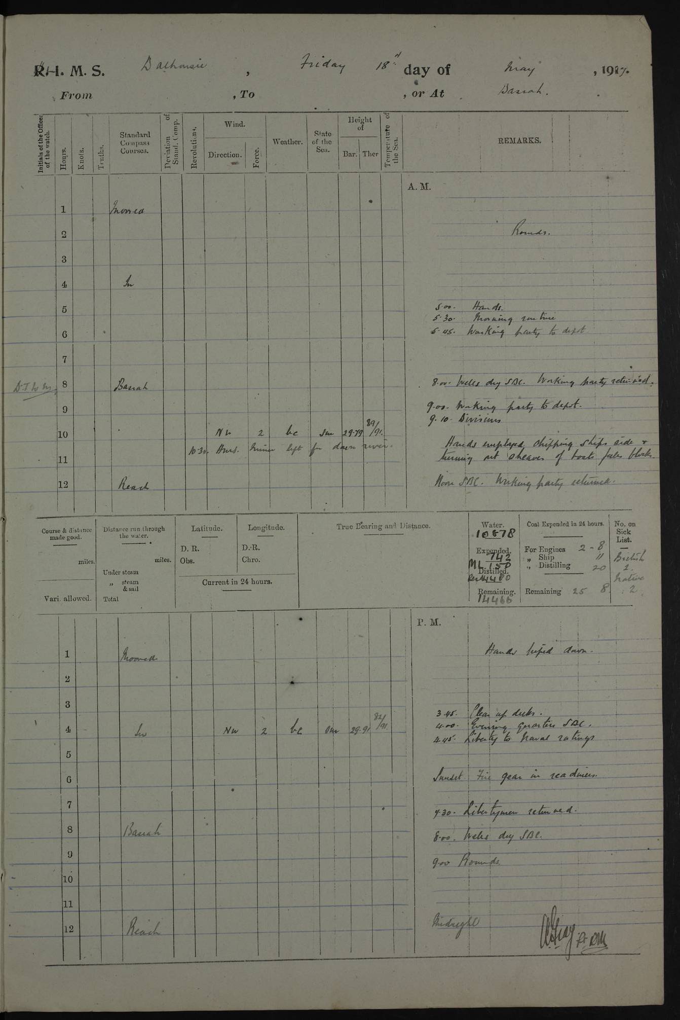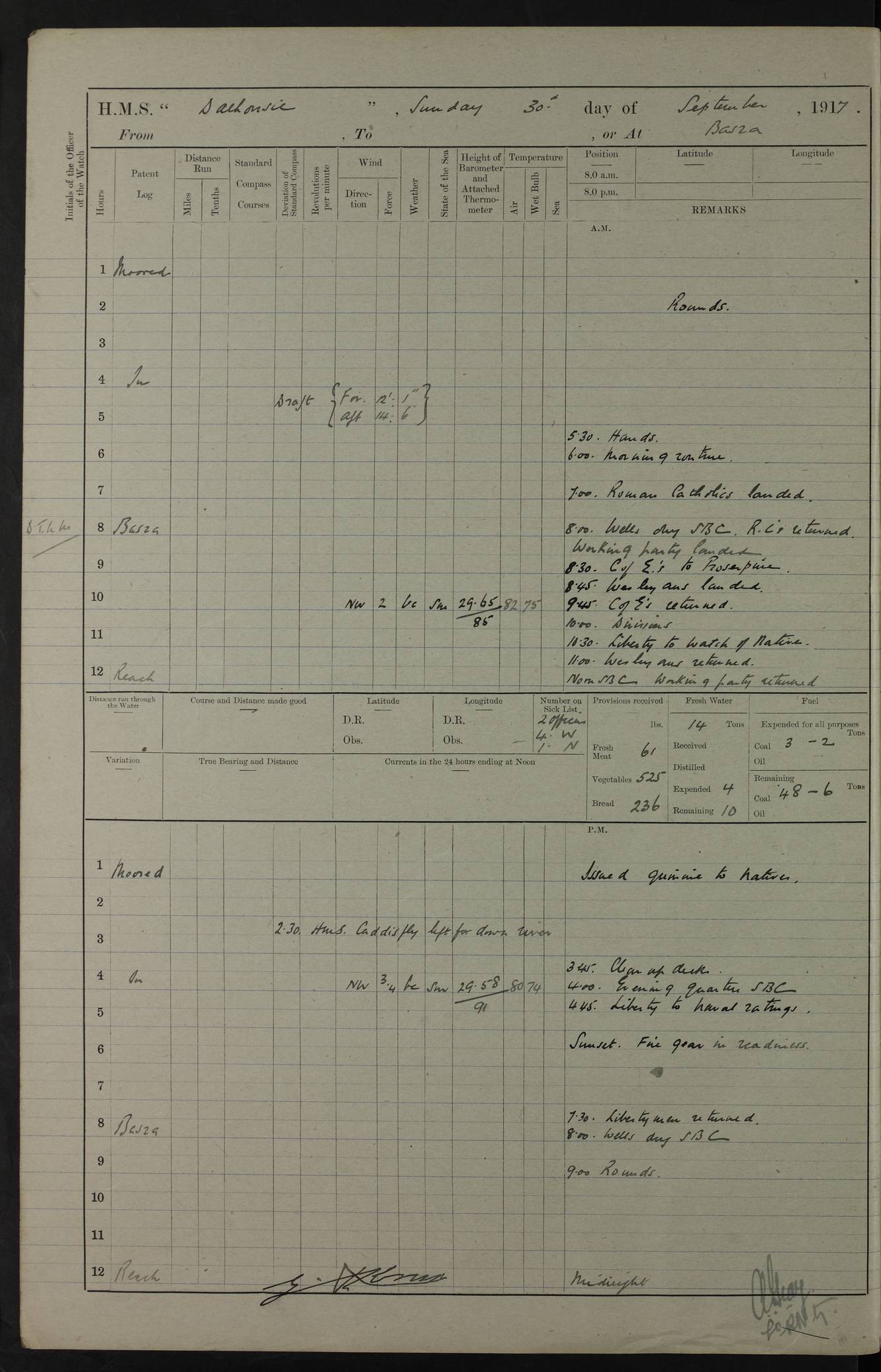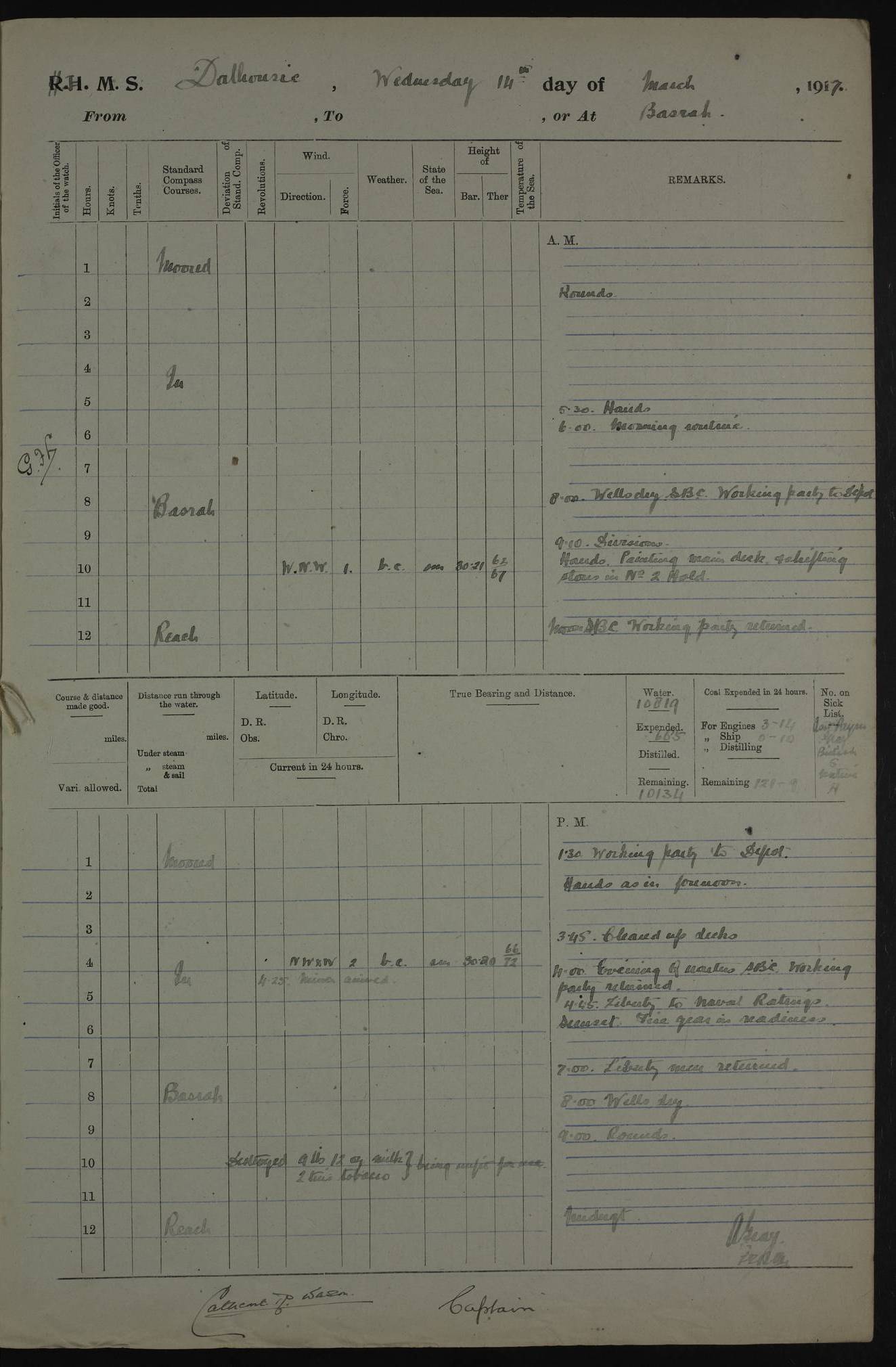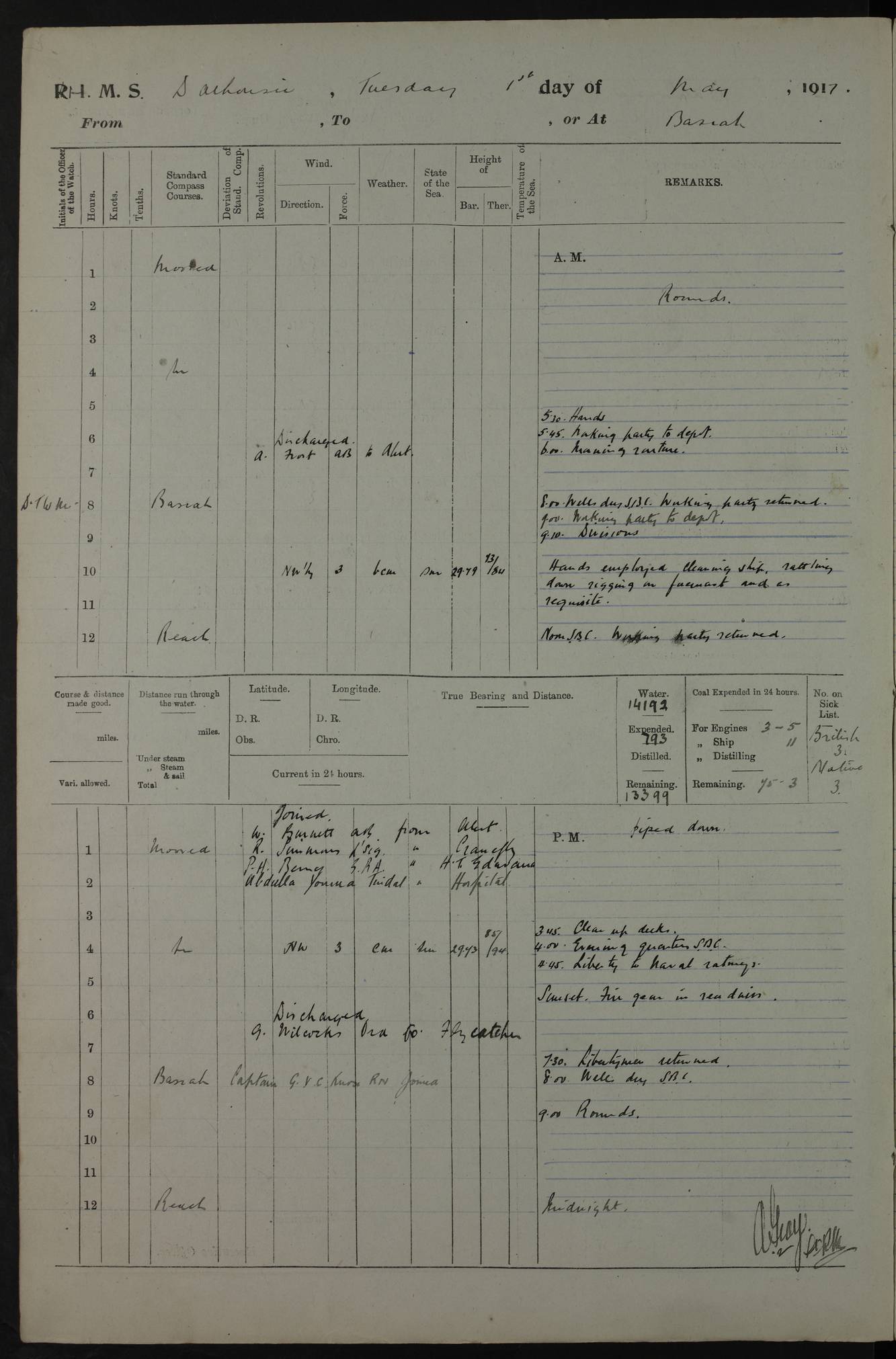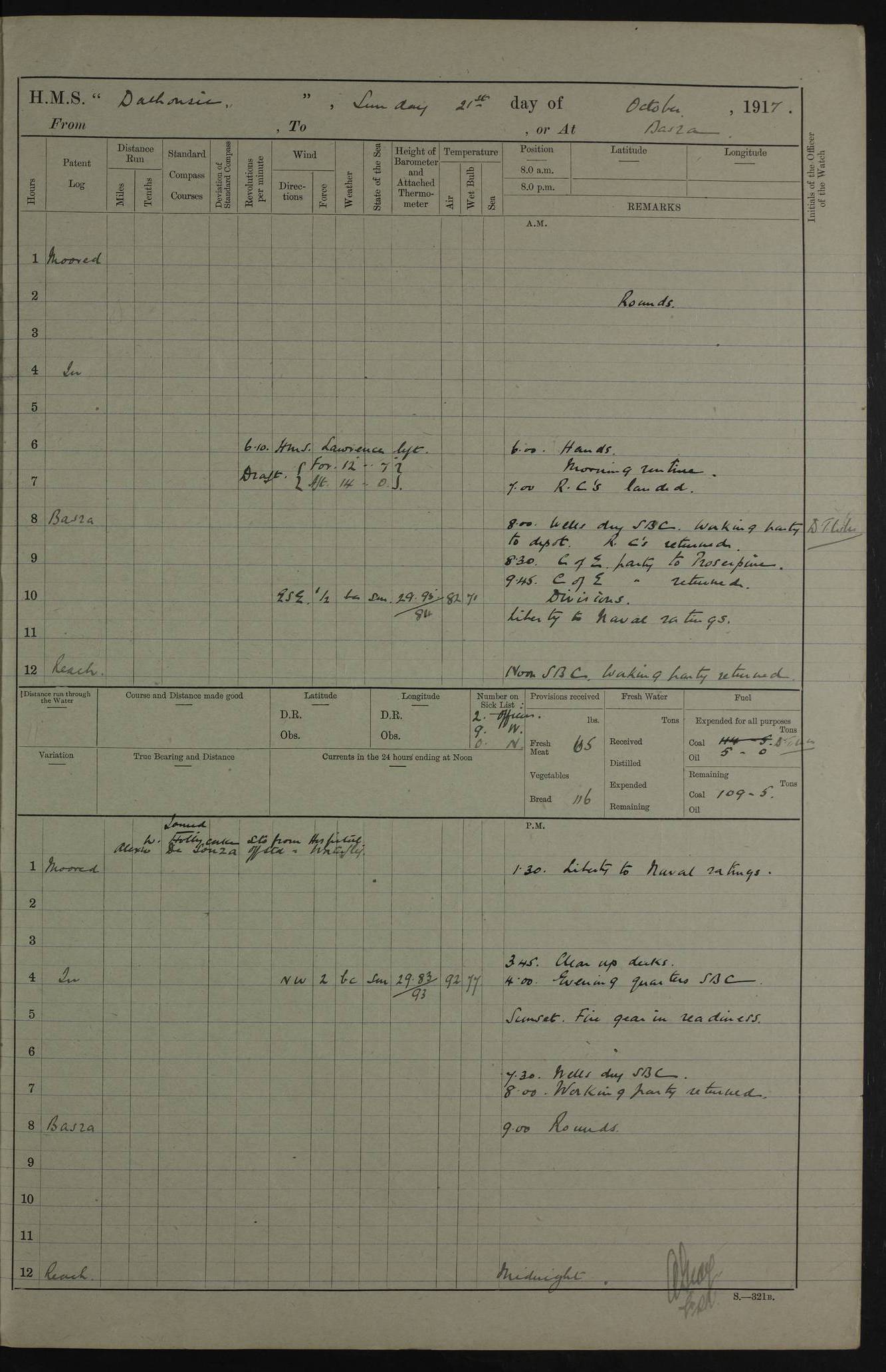 4ef4fafce53e0a0c91005931: (https://s3.amazonaws.com:443/oldweather/ADM53-39406/0015_1.jpg) 27 October 1917 Place: Basrah Lat 30.5269, Long 47.8407 2:00am: Rounds 6:00am: Hands - Morning Routine 7:00am: Exercised Fire stations 7:45am: Working party to Depot 8:00am: Wells dry - Signal Books correct 10:00am: Hands employed cleaning ship 12:00pm: Signal Books correct – Working party returned 1:00pm: Hands piped down 1:30pm: Liberty to Naval Ratings 3:45pm: Cleared up decks 4:00pm: Evening Quarters – Signal Books correct 5:15pm: Liberty to Naval Ratings 6:00pm: Sunset - Fire Gear in readiness 7:30pm: Liberty men returned 8:00pm: Wells dry - Signal Books correct 9:00pm: Rounds – Signal Books correct AM – Discharged To BARALA: W Denyer, Able Seaman - A Childs, Able Seaman - H Beckham Seaman - N Murray Seaman PM - Discharged To SCARAB: A Bushill, Senior Petty Officer - H Garth, Signalman To TARANTULA: G Campbell, Ship’s Steward Assistant 4ef4fafde53e0a0c91005932: (https://s3.amazonaws.com:443/oldweather/ADM53-39406/0016_0.jpg) 28 October 1917 Place: Basrah Lat 30.5269, Long 47.8407 2:00am: Rounds 5:30am: Hands 6:00am: Morning Routine 7:00am: Roman Catholic Church party landed 8:00am: Wells dry – Signal Books correct – Roman Catholics returned - Working party to Depot 8:30am: Church of England party to PROSERPINE 8:45am: Wesleyans landed 9:45am: Church parties returned - Divisions 10:30am: Liberty to Native Ratings 12:00pm: Signal Books correct – Working party returned 1:00pm: Issued Quinine to Naval Ratings- Issued Quinine to Native Ratings 1:30pm: Liberty to Naval ratings 3:45pm: Cleared up decks 4:00pm: Evening Quarters – Signal Books correct 5:15pm: Liberty to Naval Ratings 6:00pm: Sunset - Fire Gear in readiness 7:30pm: Liberty men returned 8:00pm: Wells dry - Signal Books correct 9:00pm: Rounds – Signal Books correct AM – Discharged To GRAYFLY: E.C. Shepherd, Petty Officer - W Hill, Able Seaman - Q Cox, Able Seaman - H Murphy, Able Seaman - A Taylor Telegrapher PM – Joined From SCARAB: J.G. Cooper, Stoker From Admiral’s House: Dounleg bin Eulog, Seedie PM - Discharged To ELEPHANTA: Alex de Souza, Officer's Steward To SCARAB: A Hatchard, Stoker To FIREFLY: W Burke, Stoker To Admiral’s House: Abrahim bin Shambi, Seedie