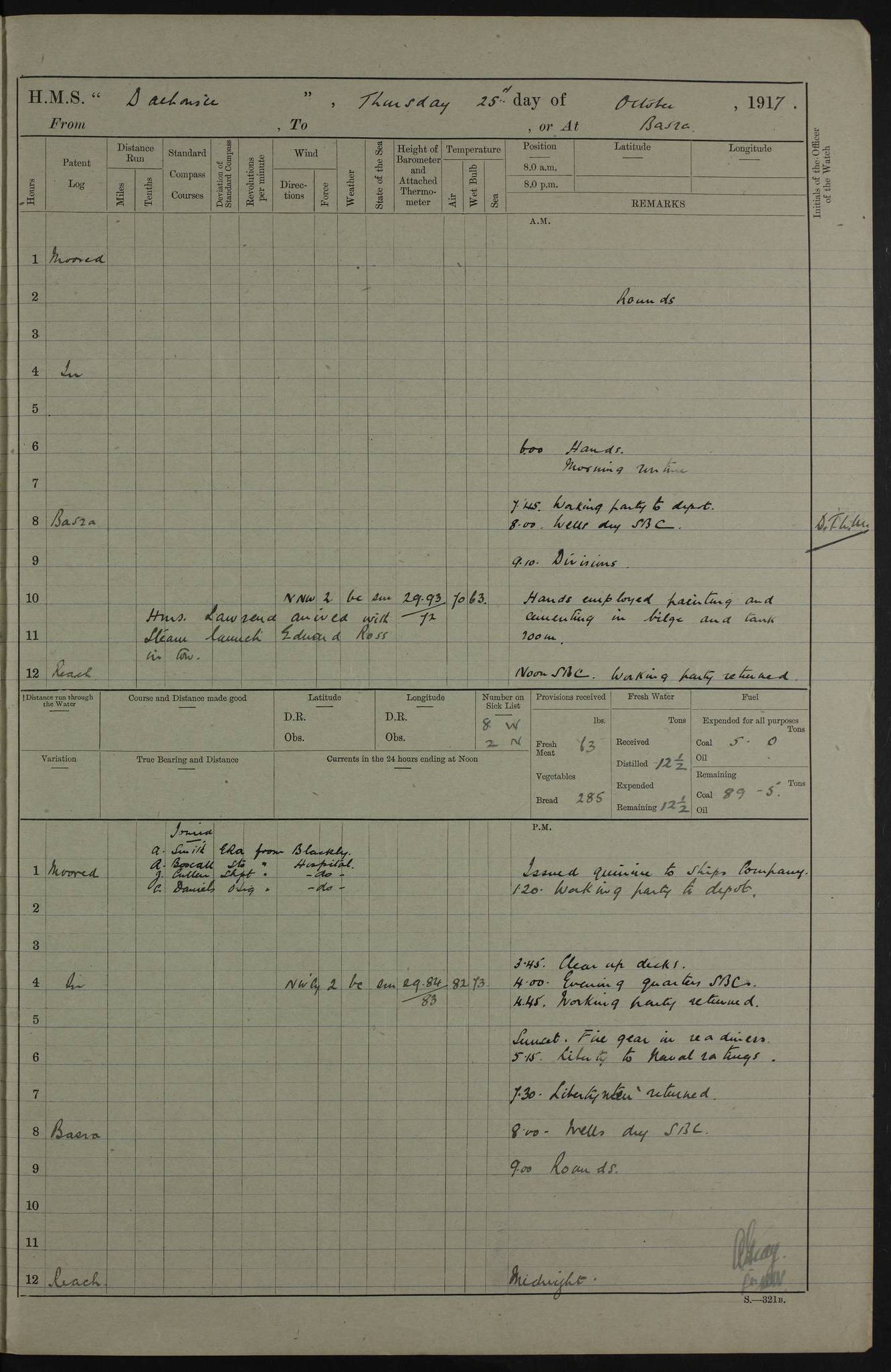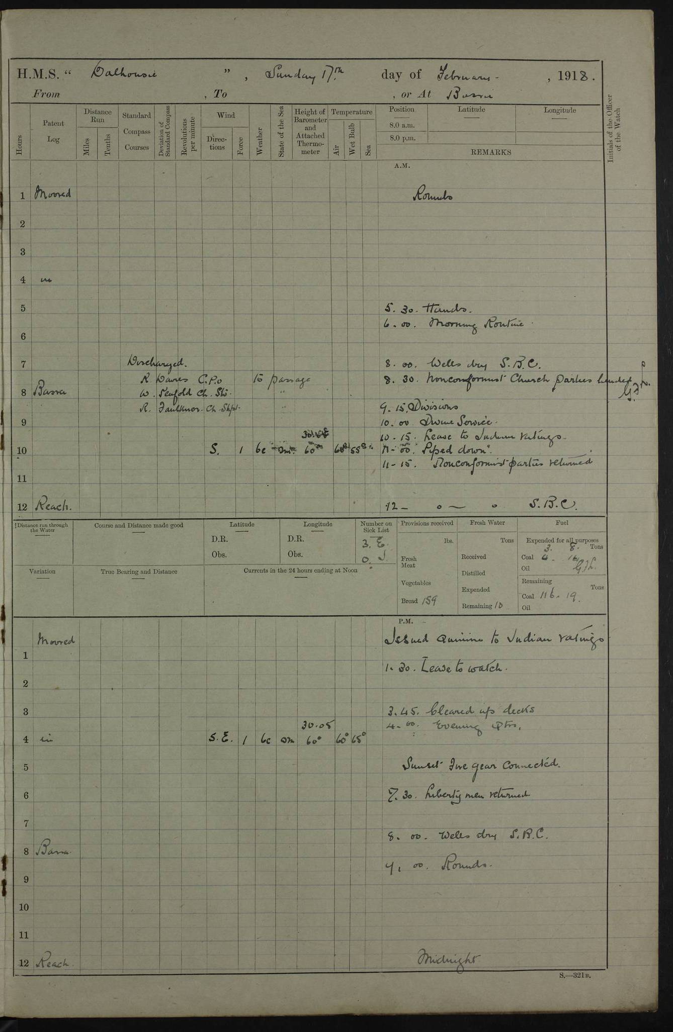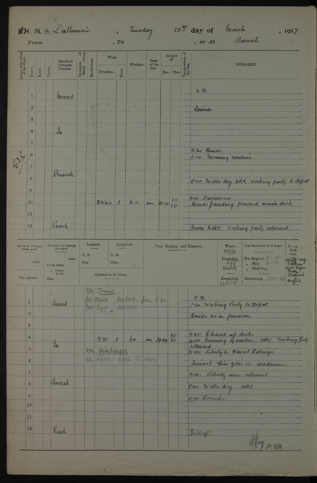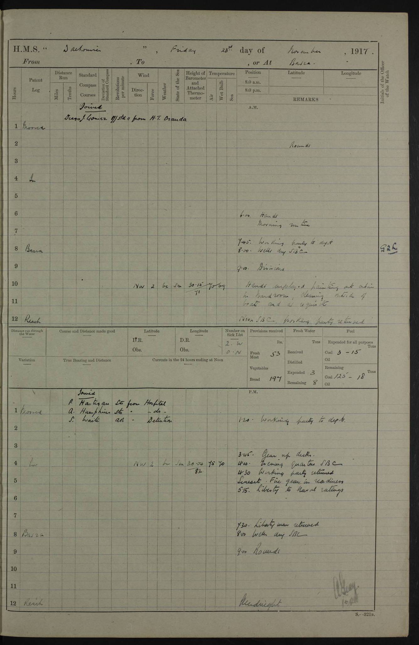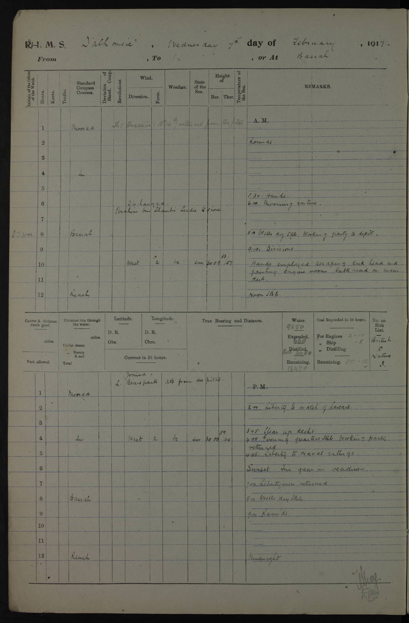 4ef4fafce53e0a0c91005931: (https://s3.amazonaws.com:443/oldweather/ADM53-39406/0015_1.jpg) 27 October 1917 Place: Basrah Lat 30.5269, Long 47.8407 2:00am: Rounds 6:00am: Hands - Morning Routine 7:00am: Exercised Fire stations 7:45am: Working party to Depot 8:00am: Wells dry - Signal Books correct 10:00am: Hands employed cleaning ship 12:00pm: Signal Books correct – Working party returned 1:00pm: Hands piped down 1:30pm: Liberty to Naval Ratings 3:45pm: Cleared up decks 4:00pm: Evening Quarters – Signal Books correct 5:15pm: Liberty to Naval Ratings 6:00pm: Sunset - Fire Gear in readiness 7:30pm: Liberty men returned 8:00pm: Wells dry - Signal Books correct 9:00pm: Rounds – Signal Books correct AM – Discharged To BARALA: W Denyer, Able Seaman - A Childs, Able Seaman - H Beckham Seaman - N Murray Seaman PM - Discharged To SCARAB: A Bushill, Senior Petty Officer - H Garth, Signalman To TARANTULA: G Campbell, Ship’s Steward Assistant 4ef4fafde53e0a0c91005932: (https://s3.amazonaws.com:443/oldweather/ADM53-39406/0016_0.jpg) 28 October 1917 Place: Basrah Lat 30.5269, Long 47.8407 2:00am: Rounds 5:30am: Hands 6:00am: Morning Routine 7:00am: Roman Catholic Church party landed 8:00am: Wells dry – Signal Books correct – Roman Catholics returned - Working party to Depot 8:30am: Church of England party to PROSERPINE 8:45am: Wesleyans landed 9:45am: Church parties returned - Divisions 10:30am: Liberty to Native Ratings 12:00pm: Signal Books correct – Working party returned 1:00pm: Issued Quinine to Naval Ratings- Issued Quinine to Native Ratings 1:30pm: Liberty to Naval ratings 3:45pm: Cleared up decks 4:00pm: Evening Quarters – Signal Books correct 5:15pm: Liberty to Naval Ratings 6:00pm: Sunset - Fire Gear in readiness 7:30pm: Liberty men returned 8:00pm: Wells dry - Signal Books correct 9:00pm: Rounds – Signal Books correct AM – Discharged To GRAYFLY: E.C. Shepherd, Petty Officer - W Hill, Able Seaman - Q Cox, Able Seaman - H Murphy, Able Seaman - A Taylor Telegrapher PM – Joined From SCARAB: J.G. Cooper, Stoker From Admiral’s House: Dounleg bin Eulog, Seedie PM - Discharged To ELEPHANTA: Alex de Souza, Officer's Steward To SCARAB: A Hatchard, Stoker To FIREFLY: W Burke, Stoker To Admiral’s House: Abrahim bin Shambi, Seedie