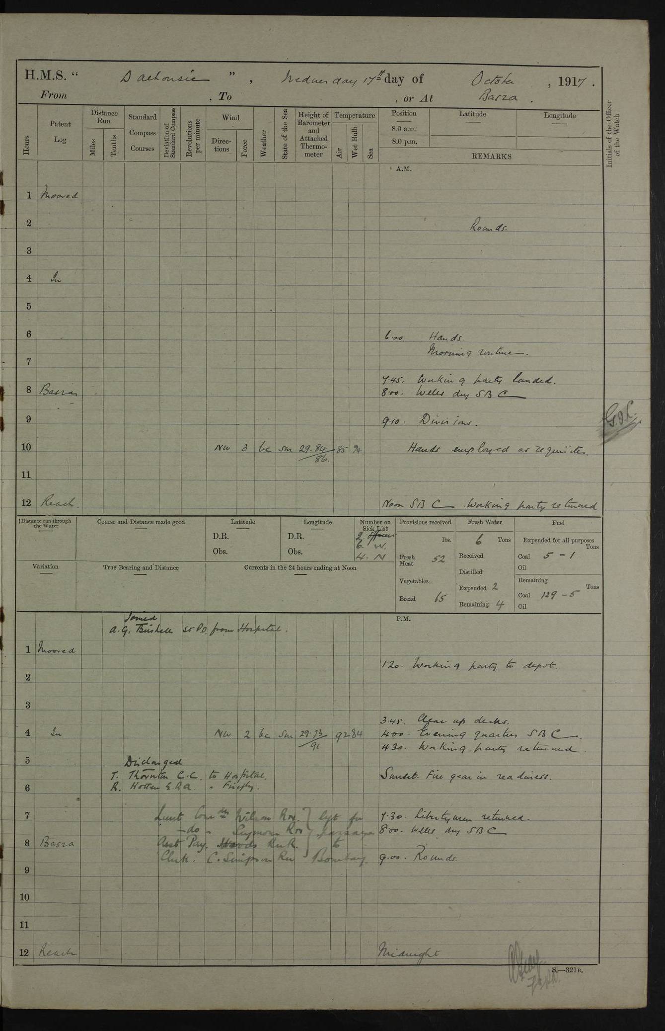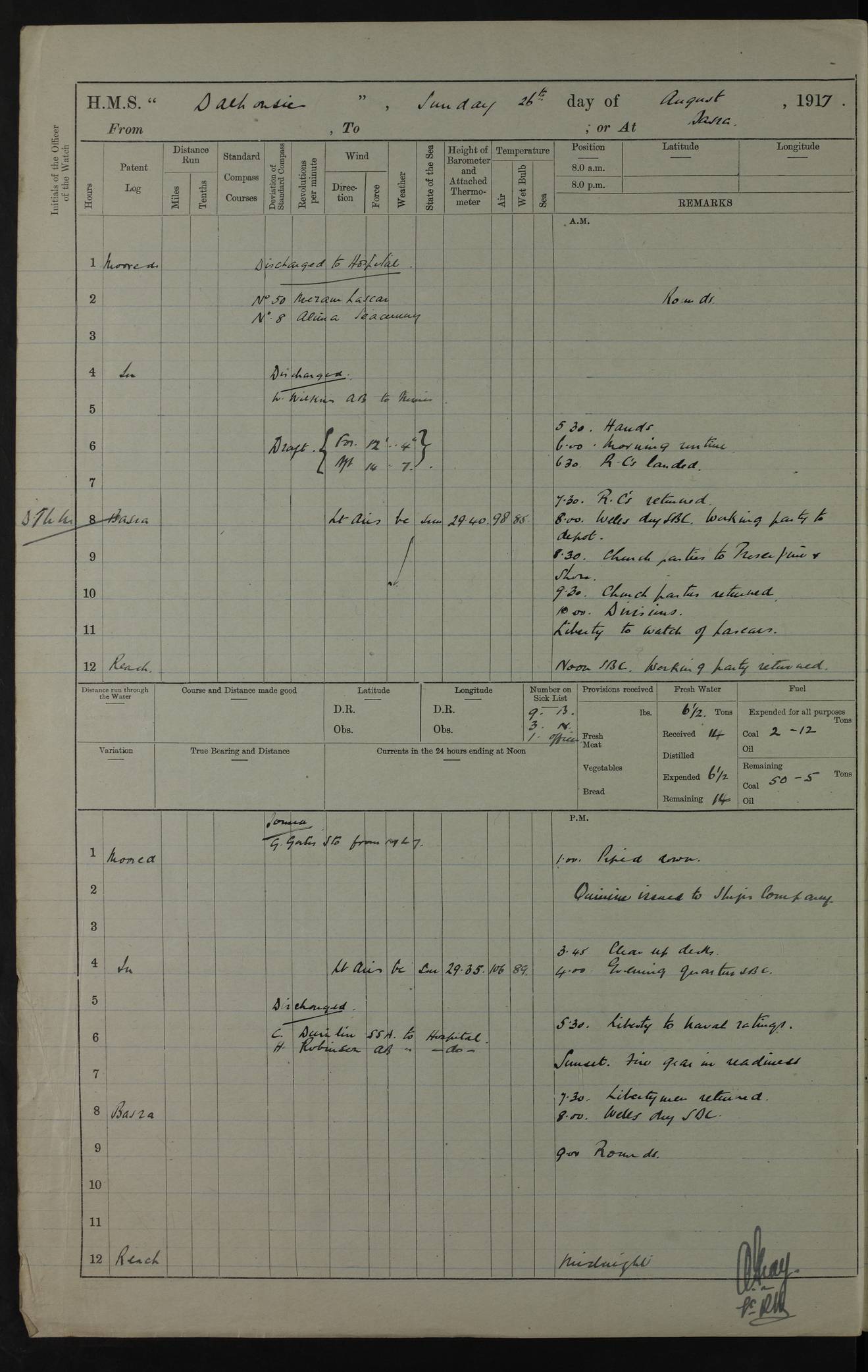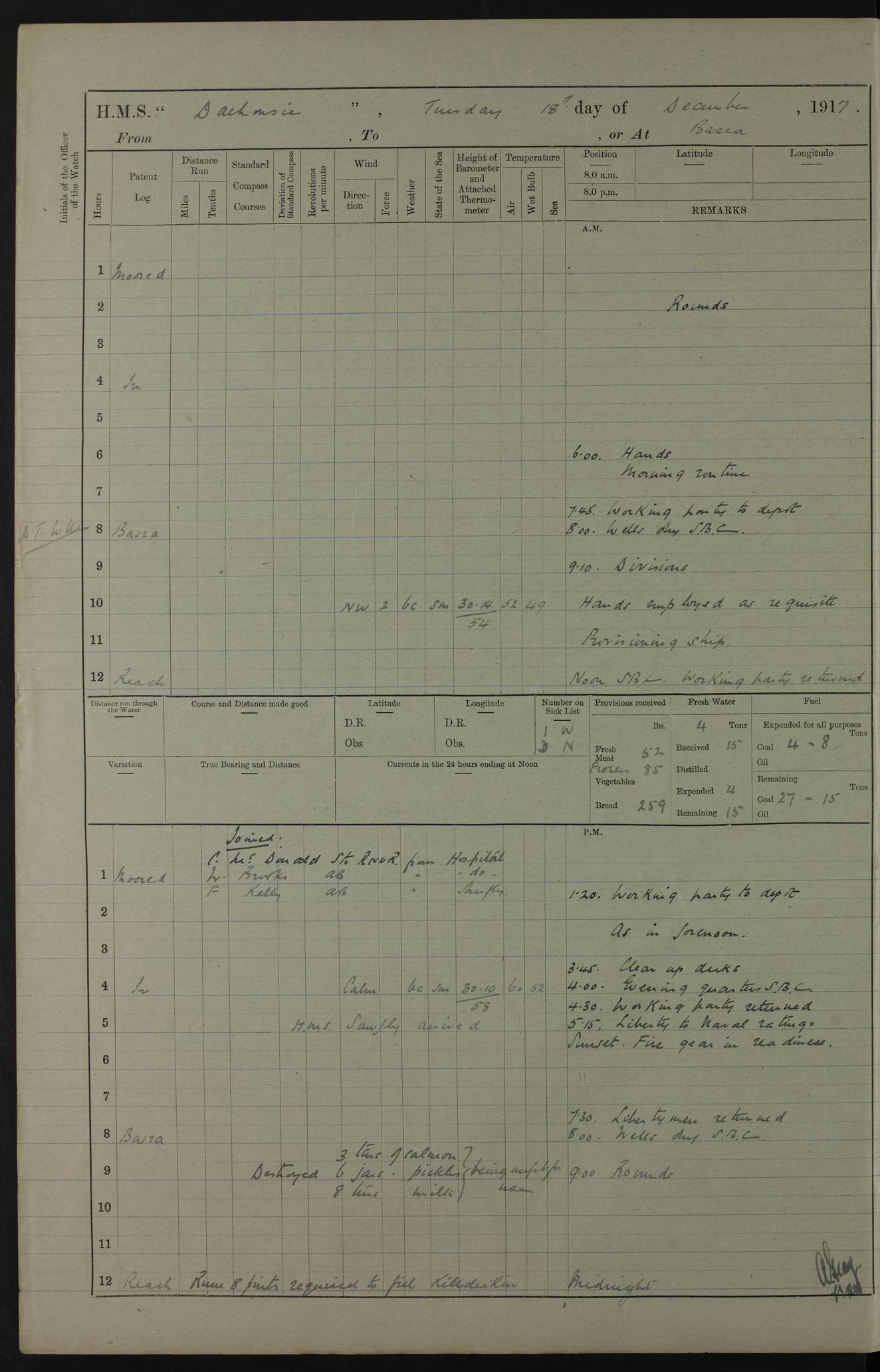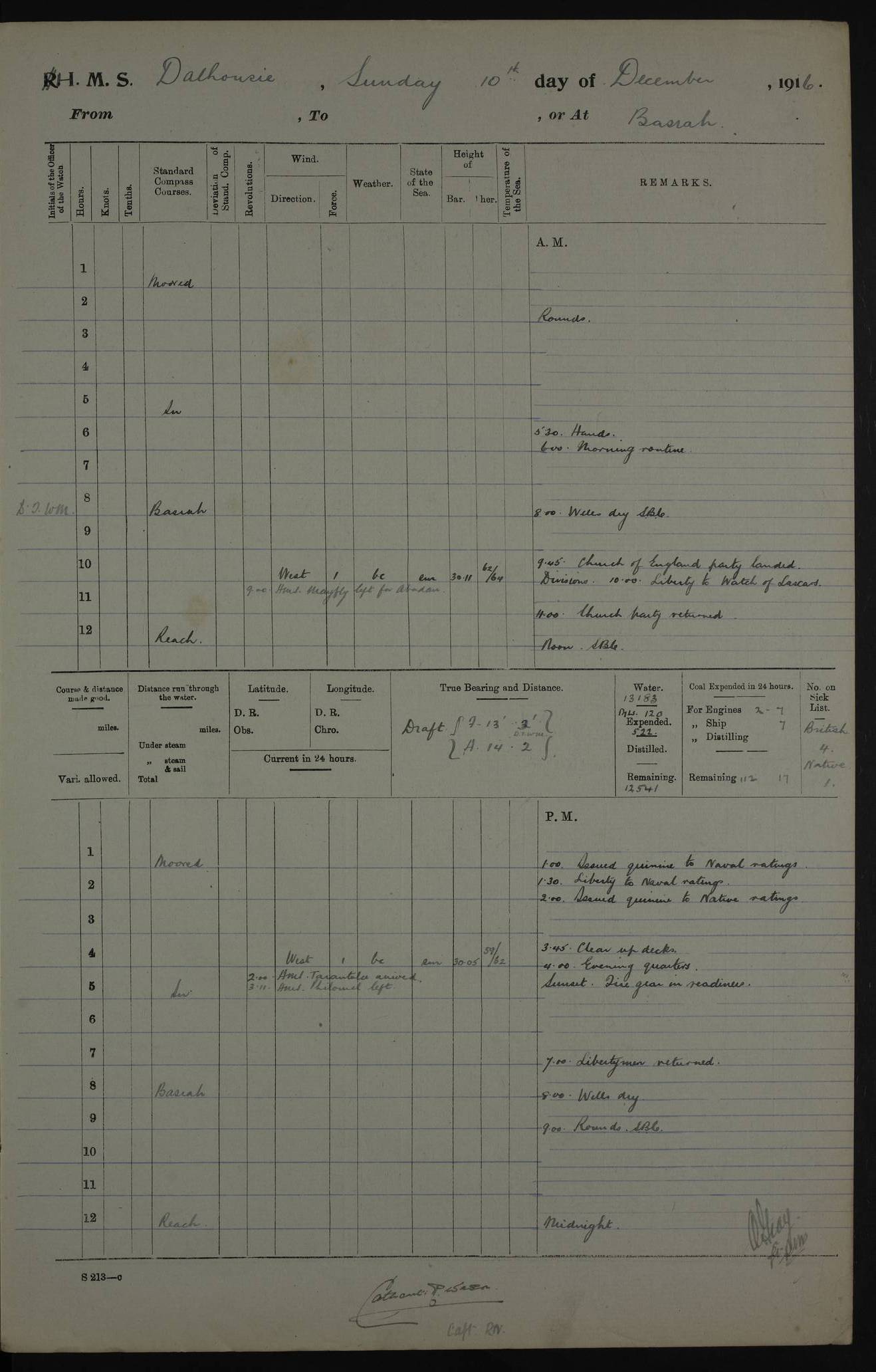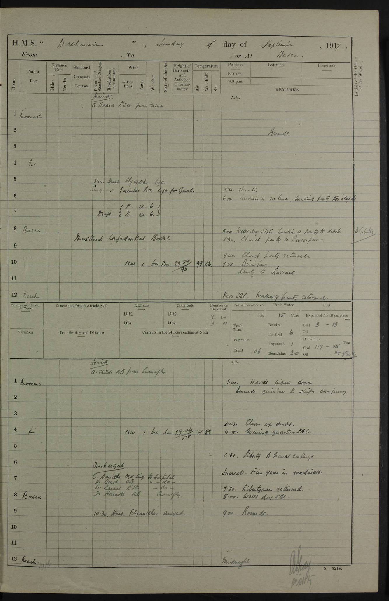 4ef4fafce53e0a0c91005931: (https://s3.amazonaws.com:443/oldweather/ADM53-39406/0015_1.jpg) 27 October 1917 Place: Basrah Lat 30.5269, Long 47.8407 2:00am: Rounds 6:00am: Hands - Morning Routine 7:00am: Exercised Fire stations 7:45am: Working party to Depot 8:00am: Wells dry - Signal Books correct 10:00am: Hands employed cleaning ship 12:00pm: Signal Books correct – Working party returned 1:00pm: Hands piped down 1:30pm: Liberty to Naval Ratings 3:45pm: Cleared up decks 4:00pm: Evening Quarters – Signal Books correct 5:15pm: Liberty to Naval Ratings 6:00pm: Sunset - Fire Gear in readiness 7:30pm: Liberty men returned 8:00pm: Wells dry - Signal Books correct 9:00pm: Rounds – Signal Books correct AM – Discharged To BARALA: W Denyer, Able Seaman - A Childs, Able Seaman - H Beckham Seaman - N Murray Seaman PM - Discharged To SCARAB: A Bushill, Senior Petty Officer - H Garth, Signalman To TARANTULA: G Campbell, Ship’s Steward Assistant 4ef4fafde53e0a0c91005932: (https://s3.amazonaws.com:443/oldweather/ADM53-39406/0016_0.jpg) 28 October 1917 Place: Basrah Lat 30.5269, Long 47.8407 2:00am: Rounds 5:30am: Hands 6:00am: Morning Routine 7:00am: Roman Catholic Church party landed 8:00am: Wells dry – Signal Books correct – Roman Catholics returned - Working party to Depot 8:30am: Church of England party to PROSERPINE 8:45am: Wesleyans landed 9:45am: Church parties returned - Divisions 10:30am: Liberty to Native Ratings 12:00pm: Signal Books correct – Working party returned 1:00pm: Issued Quinine to Naval Ratings- Issued Quinine to Native Ratings 1:30pm: Liberty to Naval ratings 3:45pm: Cleared up decks 4:00pm: Evening Quarters – Signal Books correct 5:15pm: Liberty to Naval Ratings 6:00pm: Sunset - Fire Gear in readiness 7:30pm: Liberty men returned 8:00pm: Wells dry - Signal Books correct 9:00pm: Rounds – Signal Books correct AM – Discharged To GRAYFLY: E.C. Shepherd, Petty Officer - W Hill, Able Seaman - Q Cox, Able Seaman - H Murphy, Able Seaman - A Taylor Telegrapher PM – Joined From SCARAB: J.G. Cooper, Stoker From Admiral’s House: Dounleg bin Eulog, Seedie PM - Discharged To ELEPHANTA: Alex de Souza, Officer's Steward To SCARAB: A Hatchard, Stoker To FIREFLY: W Burke, Stoker To Admiral’s House: Abrahim bin Shambi, Seedie
