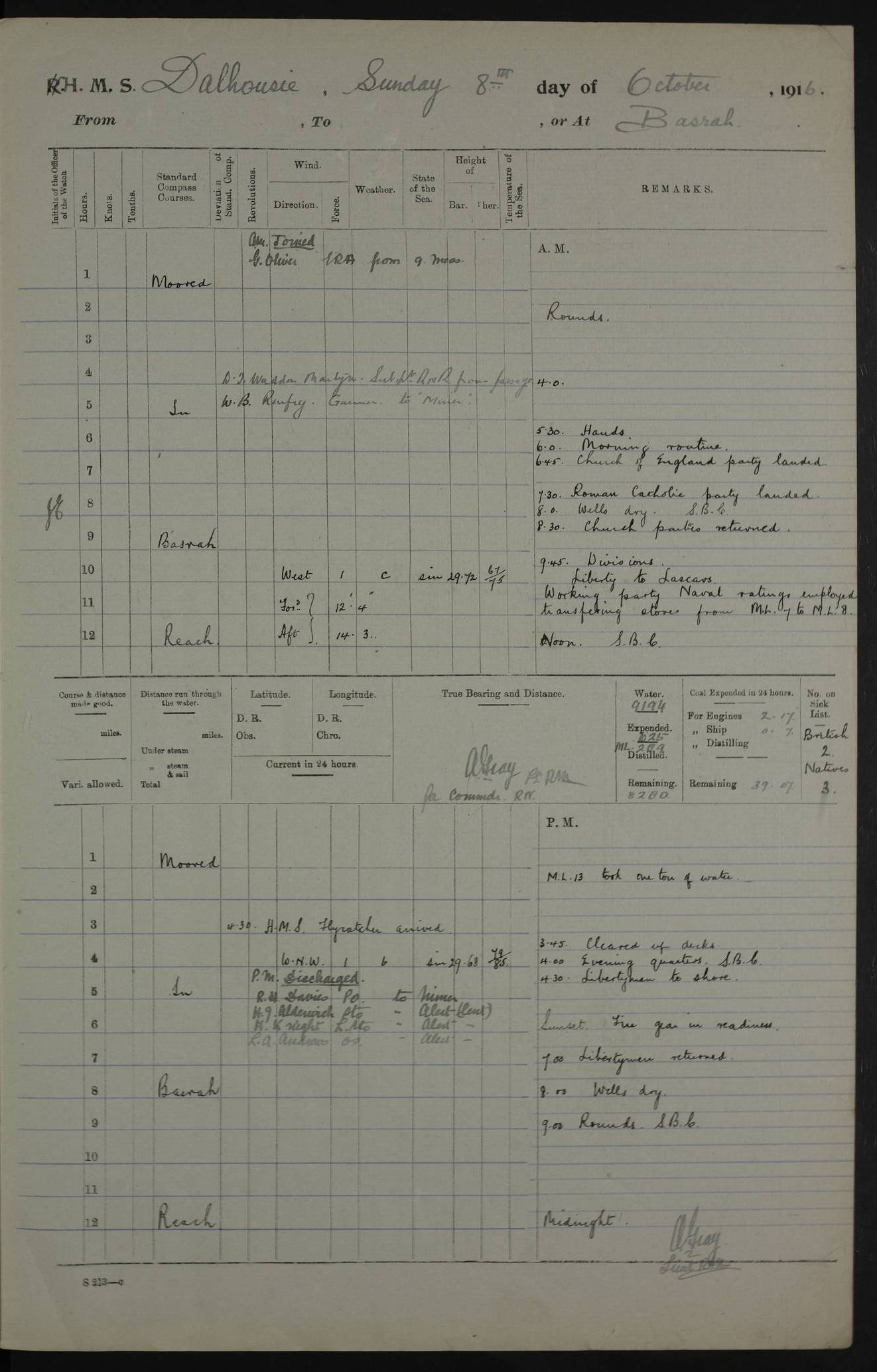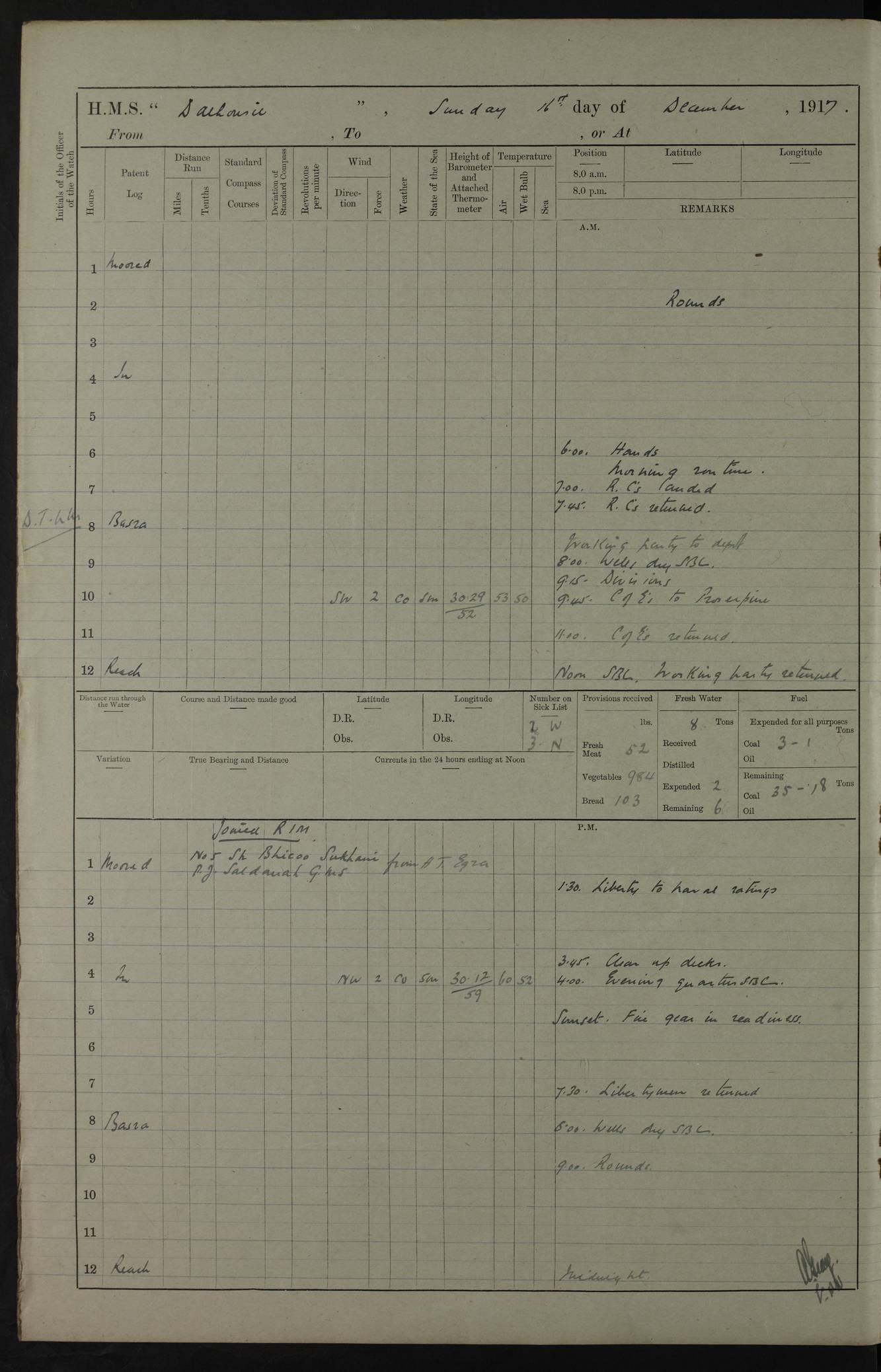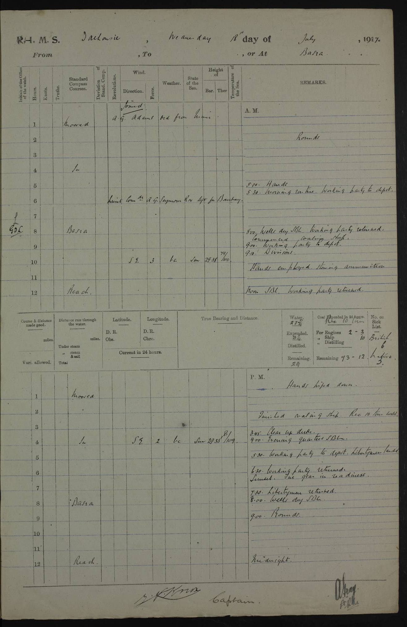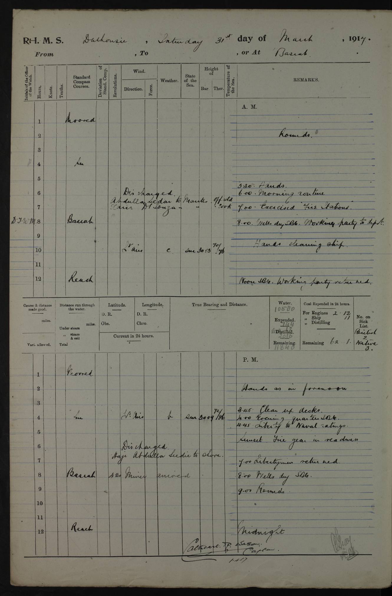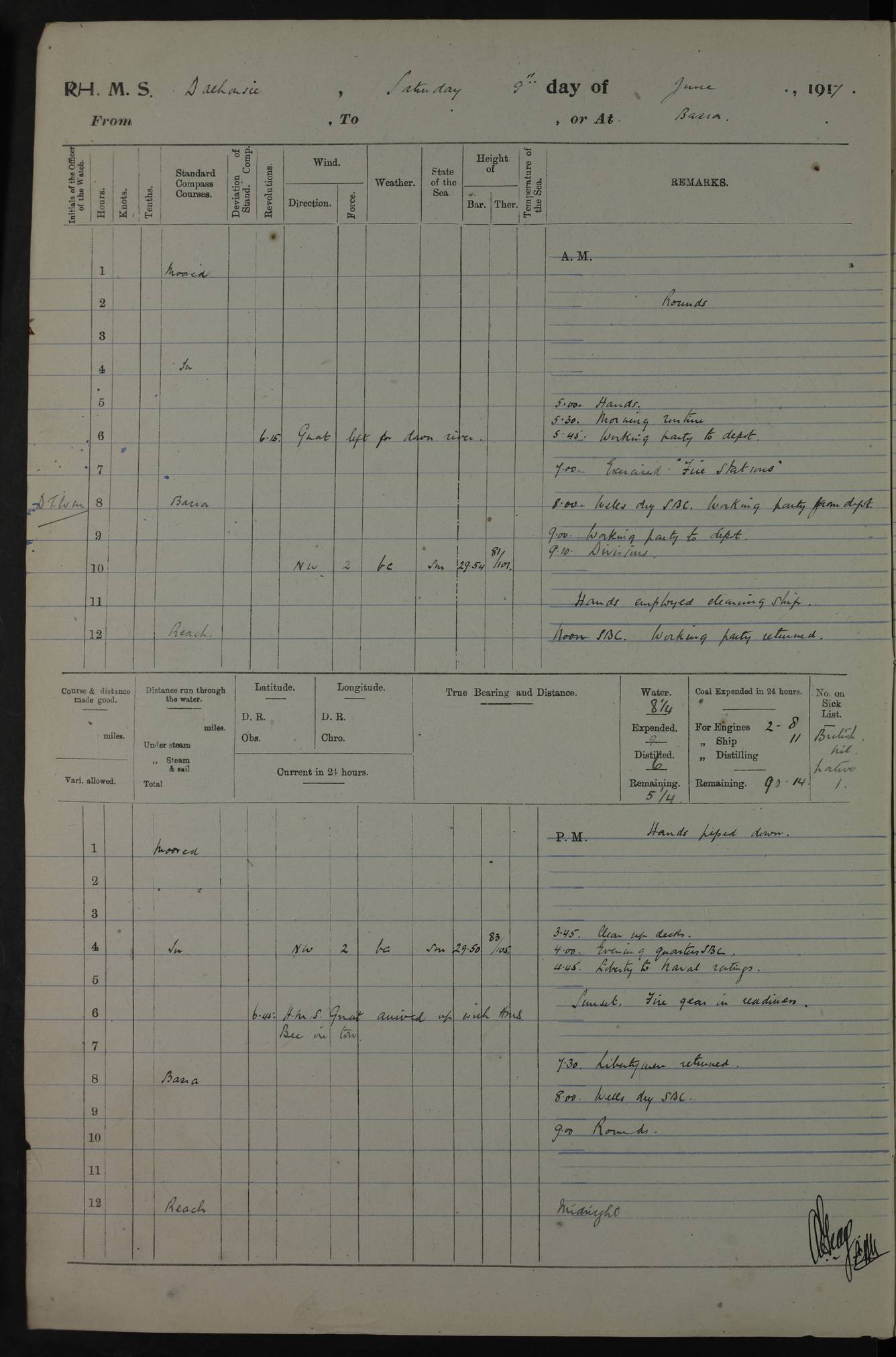 4ef4fafce53e0a0c91005931: (https://s3.amazonaws.com:443/oldweather/ADM53-39406/0015_1.jpg) 27 October 1917 Place: Basrah Lat 30.5269, Long 47.8407 2:00am: Rounds 6:00am: Hands - Morning Routine 7:00am: Exercised Fire stations 7:45am: Working party to Depot 8:00am: Wells dry - Signal Books correct 10:00am: Hands employed cleaning ship 12:00pm: Signal Books correct – Working party returned 1:00pm: Hands piped down 1:30pm: Liberty to Naval Ratings 3:45pm: Cleared up decks 4:00pm: Evening Quarters – Signal Books correct 5:15pm: Liberty to Naval Ratings 6:00pm: Sunset - Fire Gear in readiness 7:30pm: Liberty men returned 8:00pm: Wells dry - Signal Books correct 9:00pm: Rounds – Signal Books correct AM – Discharged To BARALA: W Denyer, Able Seaman - A Childs, Able Seaman - H Beckham Seaman - N Murray Seaman PM - Discharged To SCARAB: A Bushill, Senior Petty Officer - H Garth, Signalman To TARANTULA: G Campbell, Ship’s Steward Assistant 4ef4fafde53e0a0c91005932: (https://s3.amazonaws.com:443/oldweather/ADM53-39406/0016_0.jpg) 28 October 1917 Place: Basrah Lat 30.5269, Long 47.8407 2:00am: Rounds 5:30am: Hands 6:00am: Morning Routine 7:00am: Roman Catholic Church party landed 8:00am: Wells dry – Signal Books correct – Roman Catholics returned - Working party to Depot 8:30am: Church of England party to PROSERPINE 8:45am: Wesleyans landed 9:45am: Church parties returned - Divisions 10:30am: Liberty to Native Ratings 12:00pm: Signal Books correct – Working party returned 1:00pm: Issued Quinine to Naval Ratings- Issued Quinine to Native Ratings 1:30pm: Liberty to Naval ratings 3:45pm: Cleared up decks 4:00pm: Evening Quarters – Signal Books correct 5:15pm: Liberty to Naval Ratings 6:00pm: Sunset - Fire Gear in readiness 7:30pm: Liberty men returned 8:00pm: Wells dry - Signal Books correct 9:00pm: Rounds – Signal Books correct AM – Discharged To GRAYFLY: E.C. Shepherd, Petty Officer - W Hill, Able Seaman - Q Cox, Able Seaman - H Murphy, Able Seaman - A Taylor Telegrapher PM – Joined From SCARAB: J.G. Cooper, Stoker From Admiral’s House: Dounleg bin Eulog, Seedie PM - Discharged To ELEPHANTA: Alex de Souza, Officer's Steward To SCARAB: A Hatchard, Stoker To FIREFLY: W Burke, Stoker To Admiral’s House: Abrahim bin Shambi, Seedie