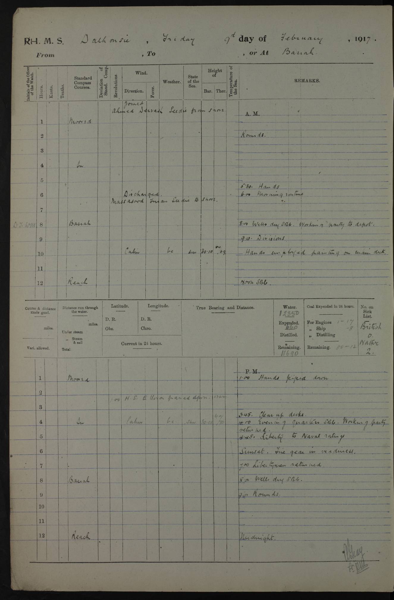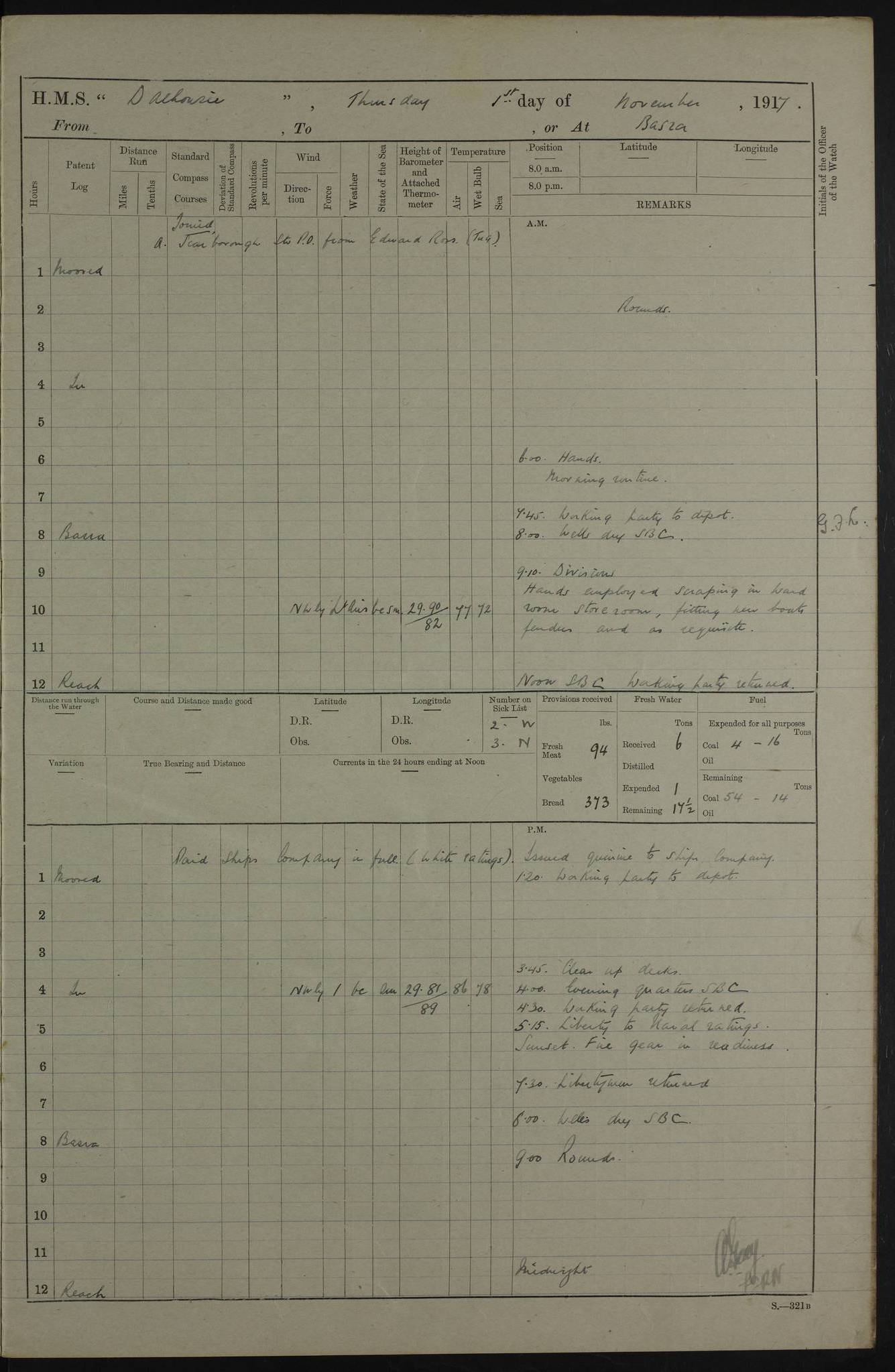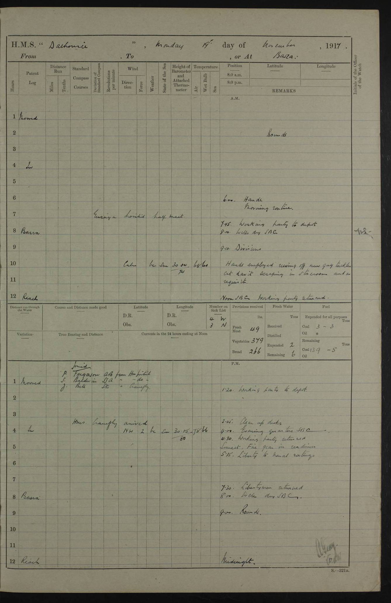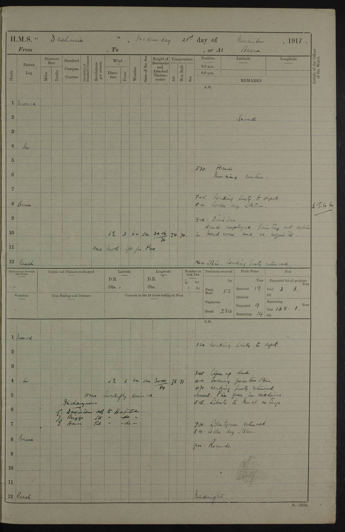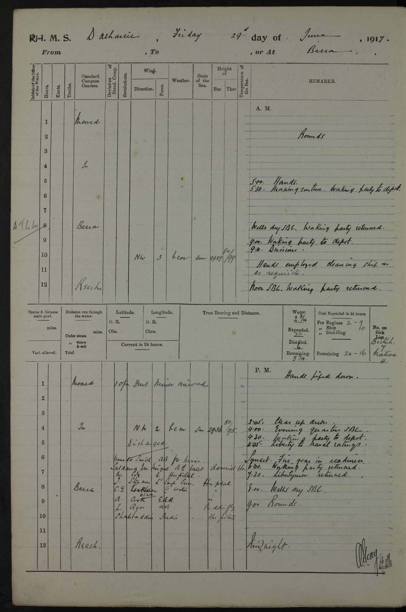 4ef4fafce53e0a0c91005931: (https://s3.amazonaws.com:443/oldweather/ADM53-39406/0015_1.jpg) 27 October 1917 Place: Basrah Lat 30.5269, Long 47.8407 2:00am: Rounds 6:00am: Hands - Morning Routine 7:00am: Exercised Fire stations 7:45am: Working party to Depot 8:00am: Wells dry - Signal Books correct 10:00am: Hands employed cleaning ship 12:00pm: Signal Books correct – Working party returned 1:00pm: Hands piped down 1:30pm: Liberty to Naval Ratings 3:45pm: Cleared up decks 4:00pm: Evening Quarters – Signal Books correct 5:15pm: Liberty to Naval Ratings 6:00pm: Sunset - Fire Gear in readiness 7:30pm: Liberty men returned 8:00pm: Wells dry - Signal Books correct 9:00pm: Rounds – Signal Books correct AM – Discharged To BARALA: W Denyer, Able Seaman - A Childs, Able Seaman - H Beckham Seaman - N Murray Seaman PM - Discharged To SCARAB: A Bushill, Senior Petty Officer - H Garth, Signalman To TARANTULA: G Campbell, Ship’s Steward Assistant 4ef4fafde53e0a0c91005932: (https://s3.amazonaws.com:443/oldweather/ADM53-39406/0016_0.jpg) 28 October 1917 Place: Basrah Lat 30.5269, Long 47.8407 2:00am: Rounds 5:30am: Hands 6:00am: Morning Routine 7:00am: Roman Catholic Church party landed 8:00am: Wells dry – Signal Books correct – Roman Catholics returned - Working party to Depot 8:30am: Church of England party to PROSERPINE 8:45am: Wesleyans landed 9:45am: Church parties returned - Divisions 10:30am: Liberty to Native Ratings 12:00pm: Signal Books correct – Working party returned 1:00pm: Issued Quinine to Naval Ratings- Issued Quinine to Native Ratings 1:30pm: Liberty to Naval ratings 3:45pm: Cleared up decks 4:00pm: Evening Quarters – Signal Books correct 5:15pm: Liberty to Naval Ratings 6:00pm: Sunset - Fire Gear in readiness 7:30pm: Liberty men returned 8:00pm: Wells dry - Signal Books correct 9:00pm: Rounds – Signal Books correct AM – Discharged To GRAYFLY: E.C. Shepherd, Petty Officer - W Hill, Able Seaman - Q Cox, Able Seaman - H Murphy, Able Seaman - A Taylor Telegrapher PM – Joined From SCARAB: J.G. Cooper, Stoker From Admiral’s House: Dounleg bin Eulog, Seedie PM - Discharged To ELEPHANTA: Alex de Souza, Officer's Steward To SCARAB: A Hatchard, Stoker To FIREFLY: W Burke, Stoker To Admiral’s House: Abrahim bin Shambi, Seedie