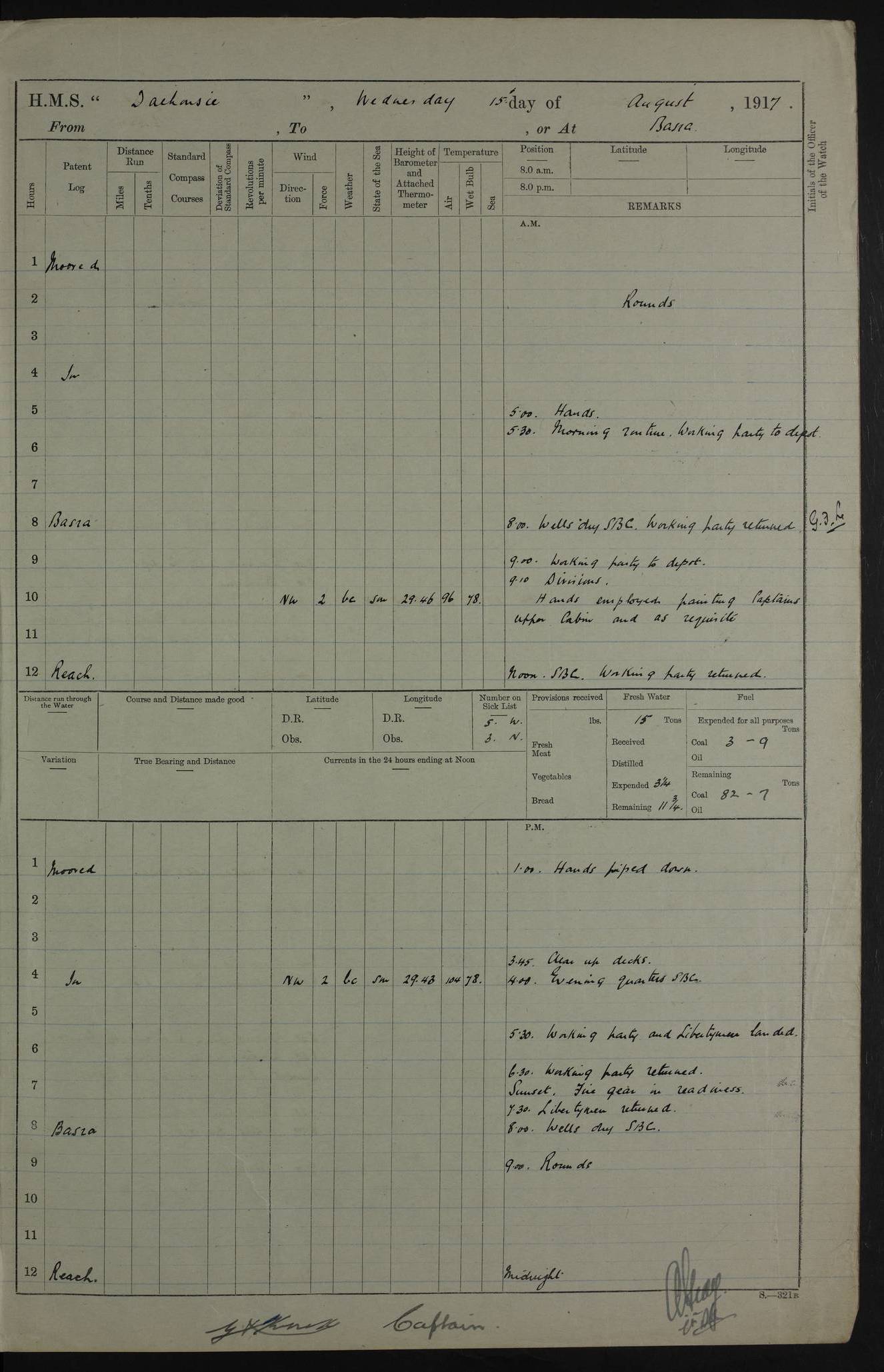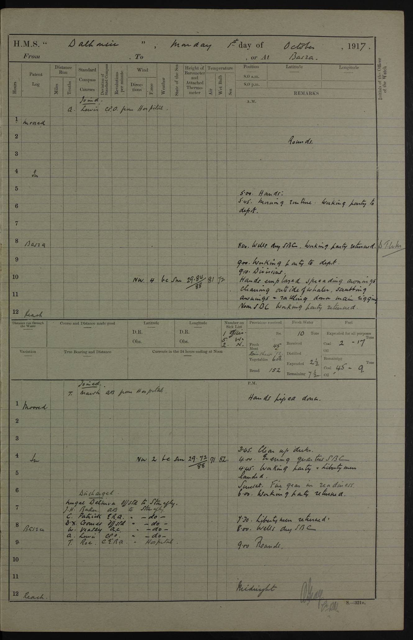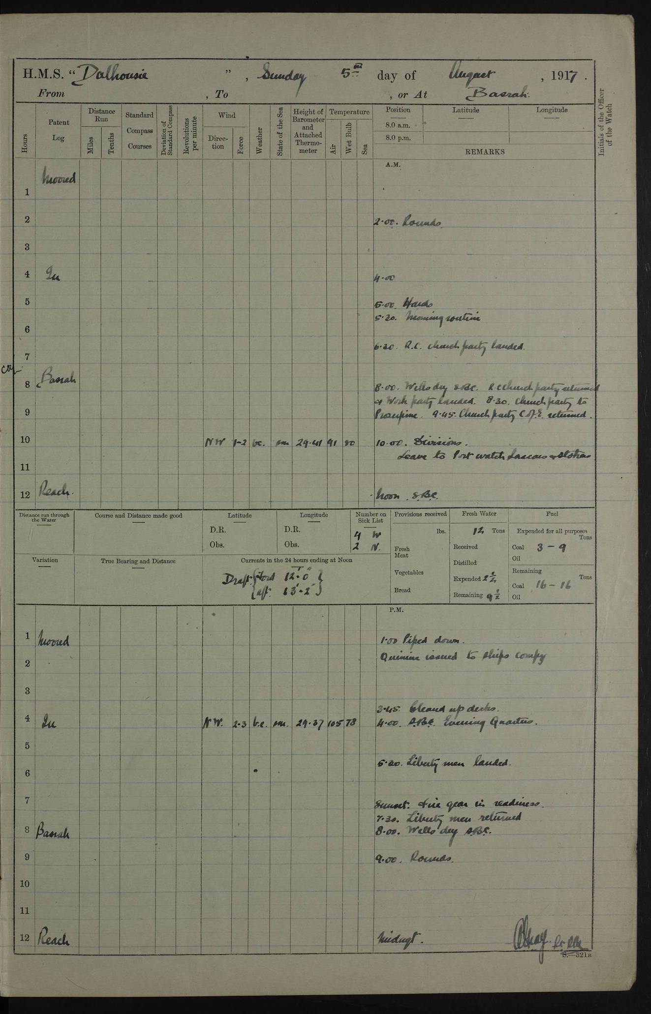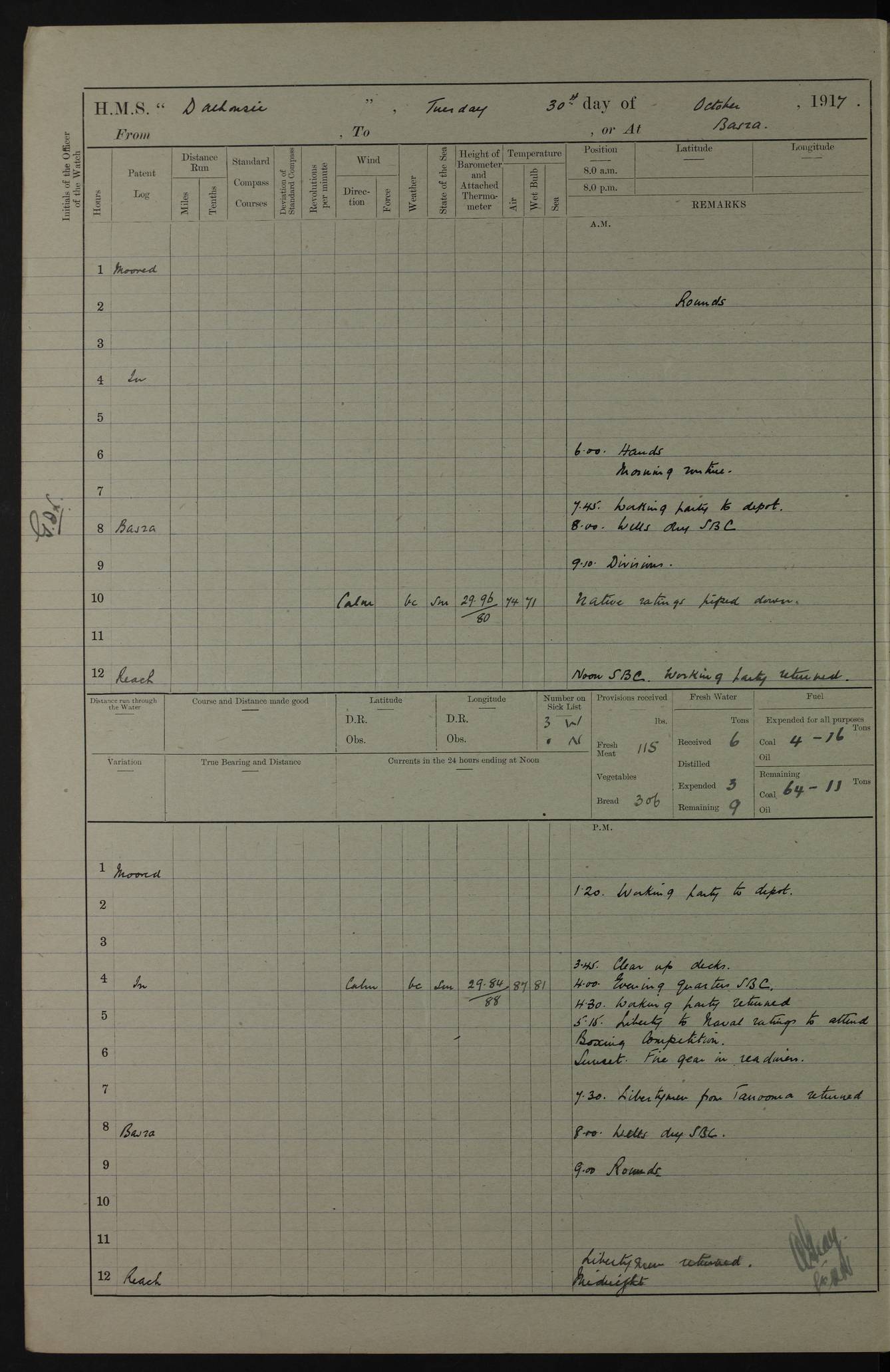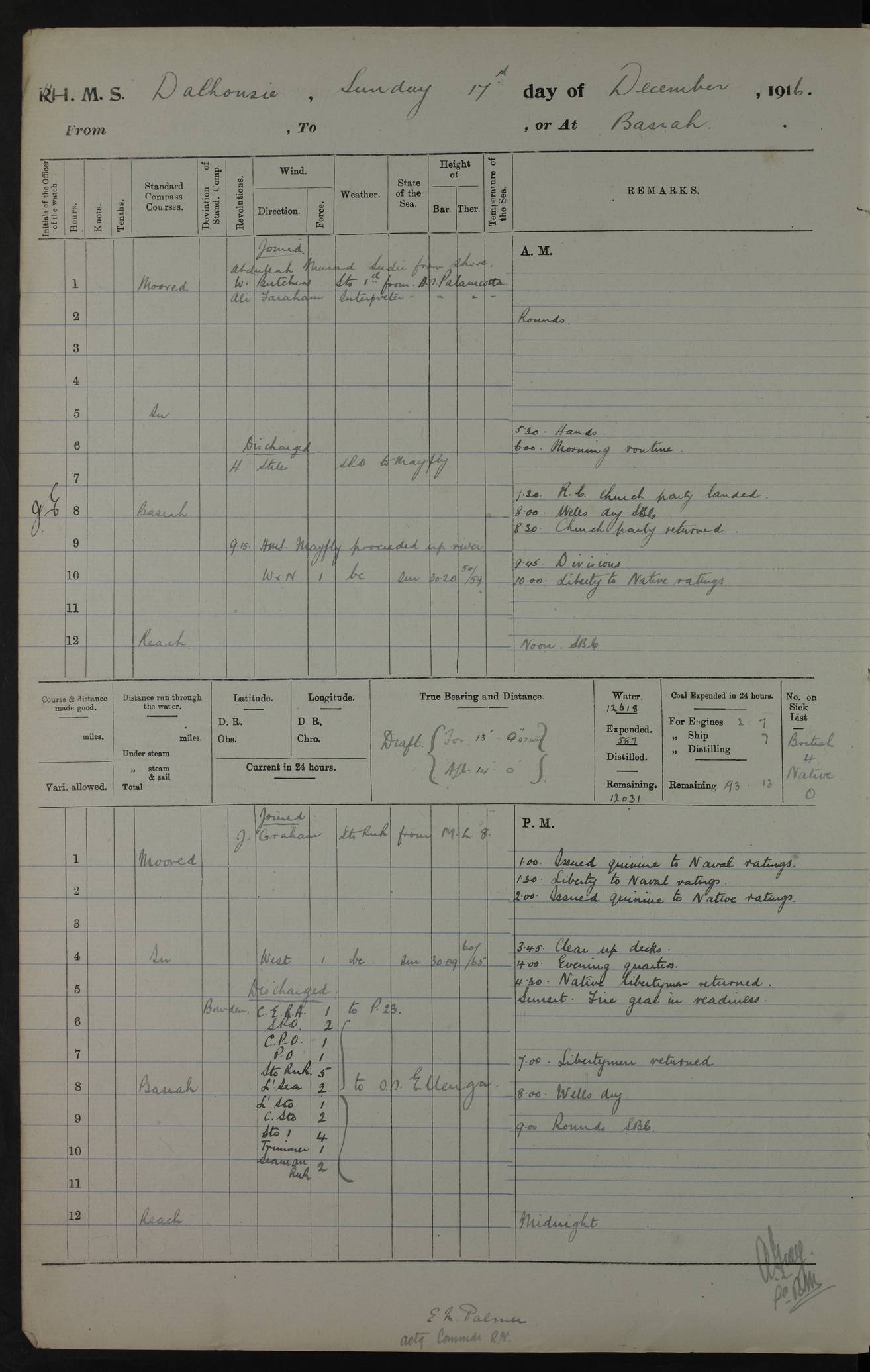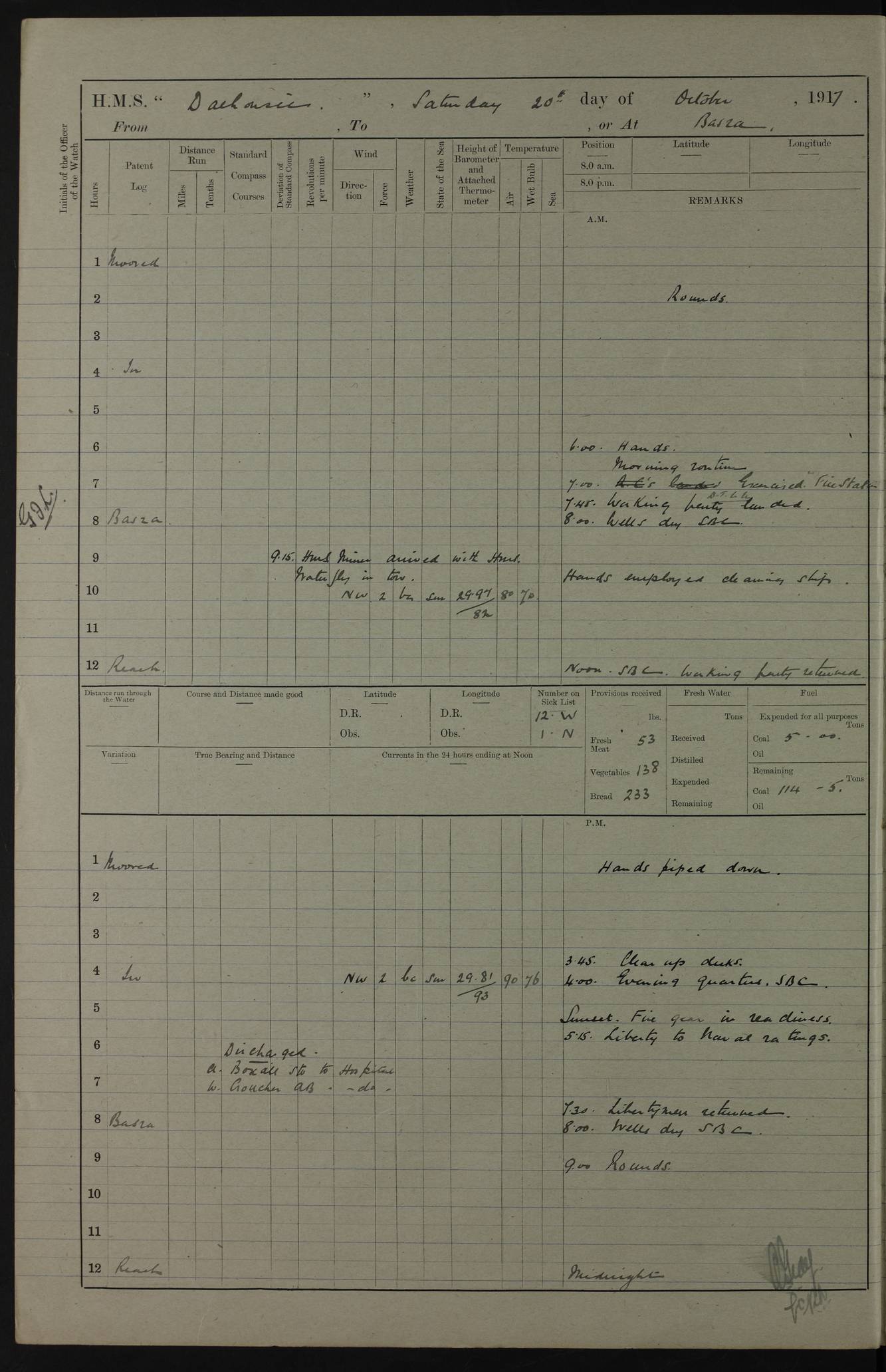 4ef4fafce53e0a0c91005931: (https://s3.amazonaws.com:443/oldweather/ADM53-39406/0015_1.jpg) 27 October 1917 Place: Basrah Lat 30.5269, Long 47.8407 2:00am: Rounds 6:00am: Hands - Morning Routine 7:00am: Exercised Fire stations 7:45am: Working party to Depot 8:00am: Wells dry - Signal Books correct 10:00am: Hands employed cleaning ship 12:00pm: Signal Books correct – Working party returned 1:00pm: Hands piped down 1:30pm: Liberty to Naval Ratings 3:45pm: Cleared up decks 4:00pm: Evening Quarters – Signal Books correct 5:15pm: Liberty to Naval Ratings 6:00pm: Sunset - Fire Gear in readiness 7:30pm: Liberty men returned 8:00pm: Wells dry - Signal Books correct 9:00pm: Rounds – Signal Books correct AM – Discharged To BARALA: W Denyer, Able Seaman - A Childs, Able Seaman - H Beckham Seaman - N Murray Seaman PM - Discharged To SCARAB: A Bushill, Senior Petty Officer - H Garth, Signalman To TARANTULA: G Campbell, Ship’s Steward Assistant 4ef4fafde53e0a0c91005932: (https://s3.amazonaws.com:443/oldweather/ADM53-39406/0016_0.jpg) 28 October 1917 Place: Basrah Lat 30.5269, Long 47.8407 2:00am: Rounds 5:30am: Hands 6:00am: Morning Routine 7:00am: Roman Catholic Church party landed 8:00am: Wells dry – Signal Books correct – Roman Catholics returned - Working party to Depot 8:30am: Church of England party to PROSERPINE 8:45am: Wesleyans landed 9:45am: Church parties returned - Divisions 10:30am: Liberty to Native Ratings 12:00pm: Signal Books correct – Working party returned 1:00pm: Issued Quinine to Naval Ratings- Issued Quinine to Native Ratings 1:30pm: Liberty to Naval ratings 3:45pm: Cleared up decks 4:00pm: Evening Quarters – Signal Books correct 5:15pm: Liberty to Naval Ratings 6:00pm: Sunset - Fire Gear in readiness 7:30pm: Liberty men returned 8:00pm: Wells dry - Signal Books correct 9:00pm: Rounds – Signal Books correct AM – Discharged To GRAYFLY: E.C. Shepherd, Petty Officer - W Hill, Able Seaman - Q Cox, Able Seaman - H Murphy, Able Seaman - A Taylor Telegrapher PM – Joined From SCARAB: J.G. Cooper, Stoker From Admiral’s House: Dounleg bin Eulog, Seedie PM - Discharged To ELEPHANTA: Alex de Souza, Officer's Steward To SCARAB: A Hatchard, Stoker To FIREFLY: W Burke, Stoker To Admiral’s House: Abrahim bin Shambi, Seedie