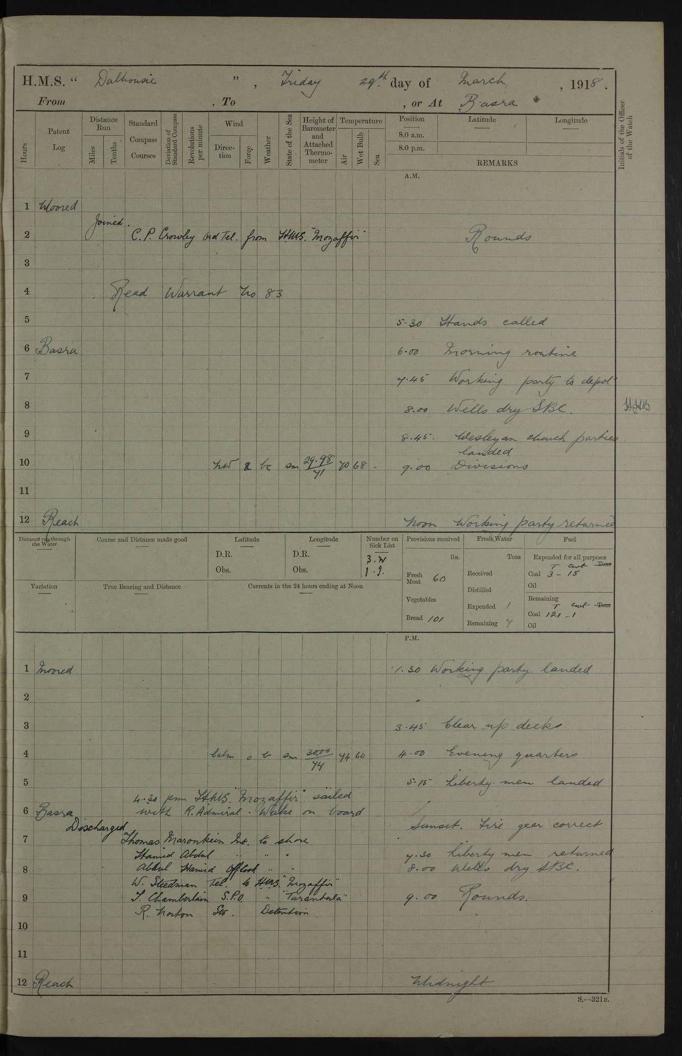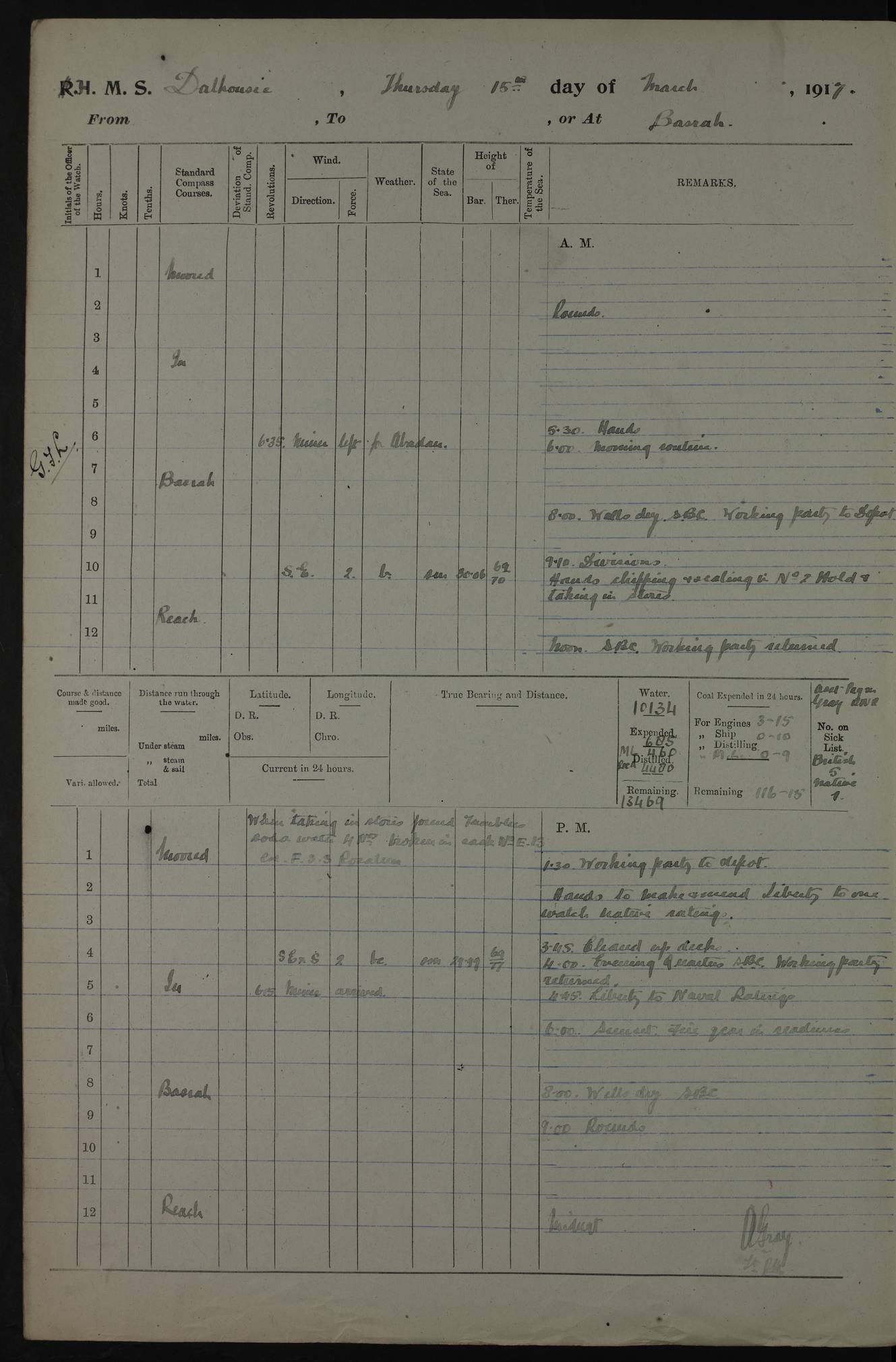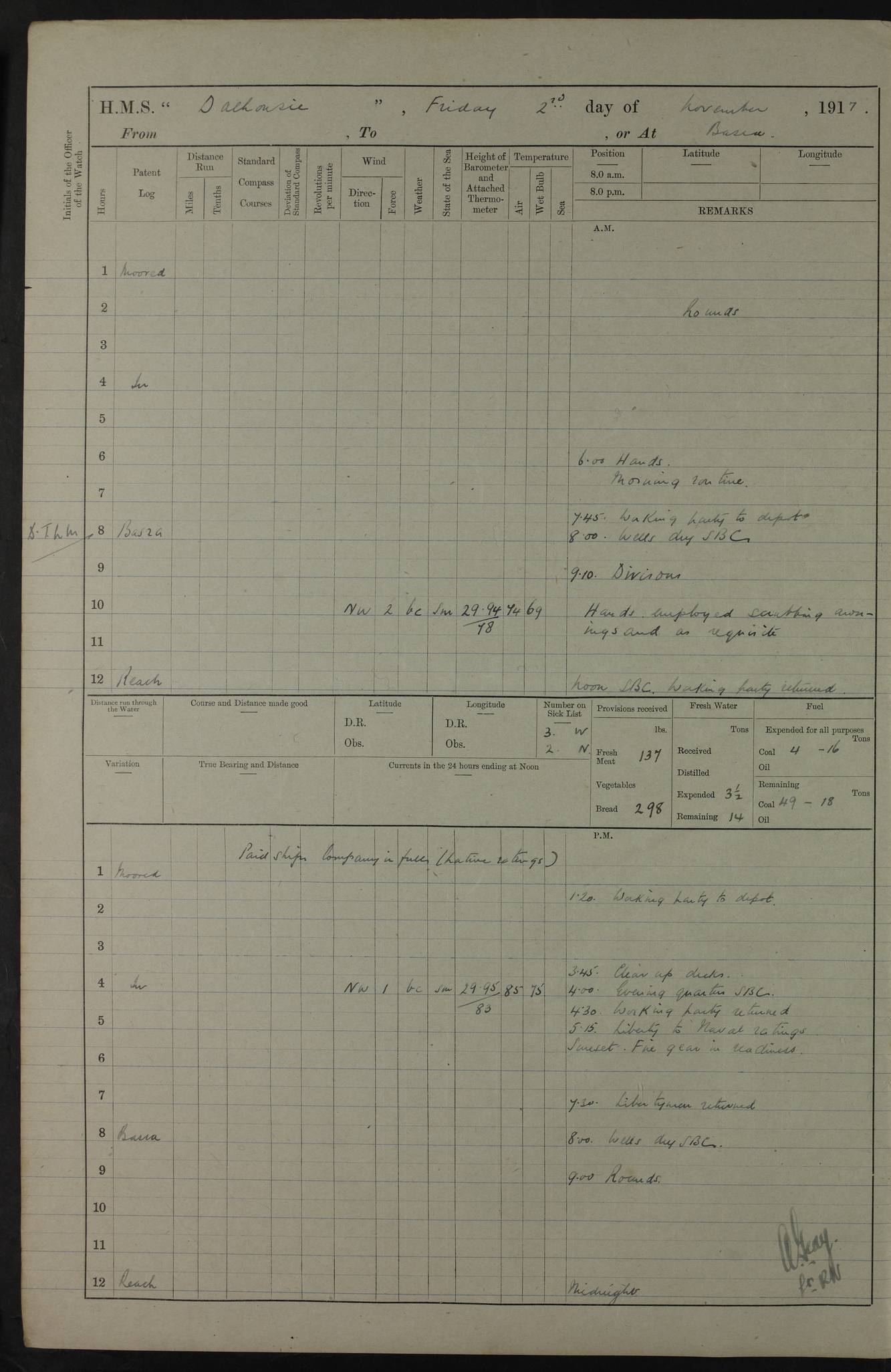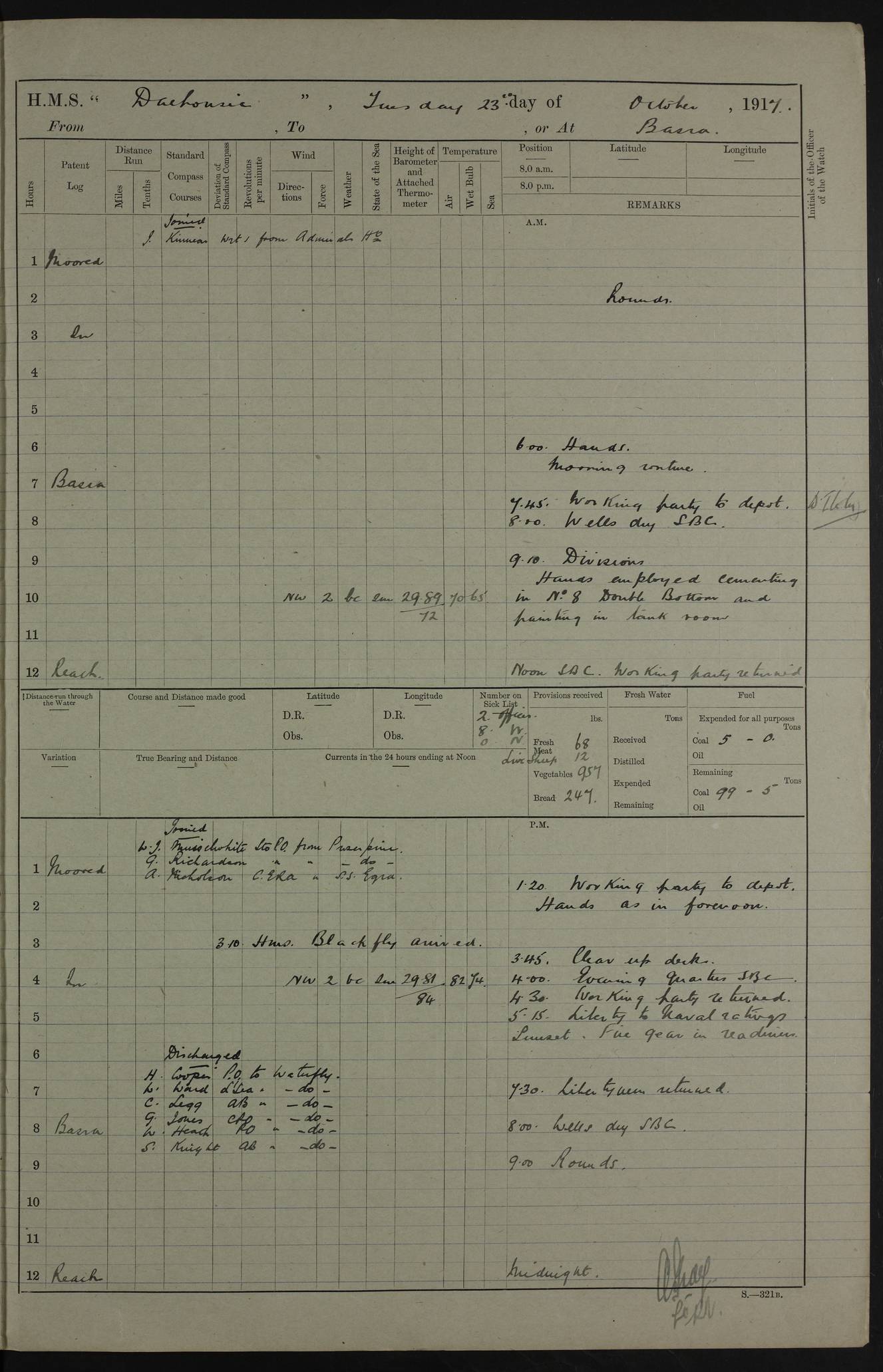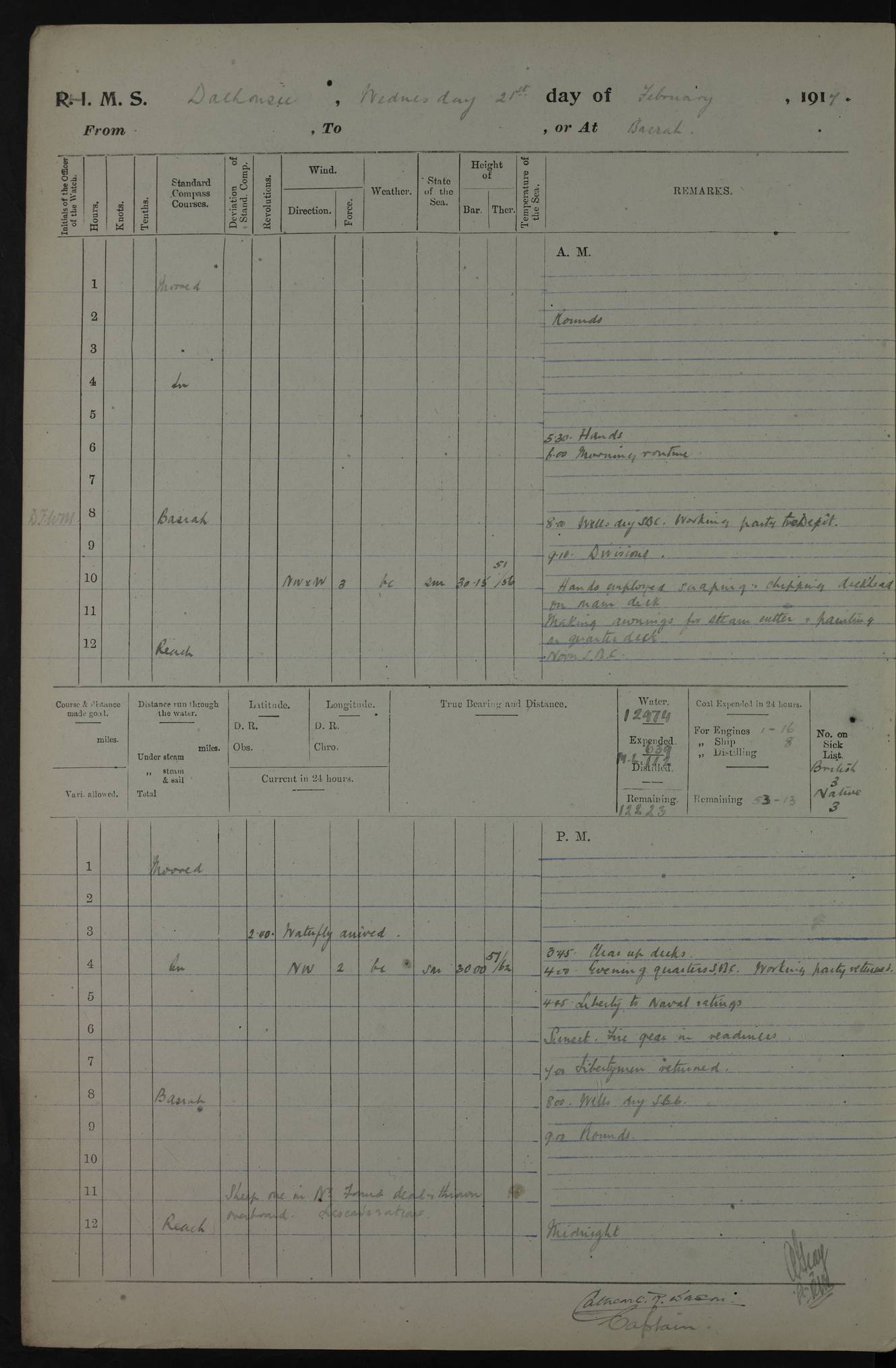 4ef4fafce53e0a0c91005931: (https://s3.amazonaws.com:443/oldweather/ADM53-39406/0015_1.jpg) 27 October 1917 Place: Basrah Lat 30.5269, Long 47.8407 2:00am: Rounds 6:00am: Hands - Morning Routine 7:00am: Exercised Fire stations 7:45am: Working party to Depot 8:00am: Wells dry - Signal Books correct 10:00am: Hands employed cleaning ship 12:00pm: Signal Books correct – Working party returned 1:00pm: Hands piped down 1:30pm: Liberty to Naval Ratings 3:45pm: Cleared up decks 4:00pm: Evening Quarters – Signal Books correct 5:15pm: Liberty to Naval Ratings 6:00pm: Sunset - Fire Gear in readiness 7:30pm: Liberty men returned 8:00pm: Wells dry - Signal Books correct 9:00pm: Rounds – Signal Books correct AM – Discharged To BARALA: W Denyer, Able Seaman - A Childs, Able Seaman - H Beckham Seaman - N Murray Seaman PM - Discharged To SCARAB: A Bushill, Senior Petty Officer - H Garth, Signalman To TARANTULA: G Campbell, Ship’s Steward Assistant 4ef4fafde53e0a0c91005932: (https://s3.amazonaws.com:443/oldweather/ADM53-39406/0016_0.jpg) 28 October 1917 Place: Basrah Lat 30.5269, Long 47.8407 2:00am: Rounds 5:30am: Hands 6:00am: Morning Routine 7:00am: Roman Catholic Church party landed 8:00am: Wells dry – Signal Books correct – Roman Catholics returned - Working party to Depot 8:30am: Church of England party to PROSERPINE 8:45am: Wesleyans landed 9:45am: Church parties returned - Divisions 10:30am: Liberty to Native Ratings 12:00pm: Signal Books correct – Working party returned 1:00pm: Issued Quinine to Naval Ratings- Issued Quinine to Native Ratings 1:30pm: Liberty to Naval ratings 3:45pm: Cleared up decks 4:00pm: Evening Quarters – Signal Books correct 5:15pm: Liberty to Naval Ratings 6:00pm: Sunset - Fire Gear in readiness 7:30pm: Liberty men returned 8:00pm: Wells dry - Signal Books correct 9:00pm: Rounds – Signal Books correct AM – Discharged To GRAYFLY: E.C. Shepherd, Petty Officer - W Hill, Able Seaman - Q Cox, Able Seaman - H Murphy, Able Seaman - A Taylor Telegrapher PM – Joined From SCARAB: J.G. Cooper, Stoker From Admiral’s House: Dounleg bin Eulog, Seedie PM - Discharged To ELEPHANTA: Alex de Souza, Officer's Steward To SCARAB: A Hatchard, Stoker To FIREFLY: W Burke, Stoker To Admiral’s House: Abrahim bin Shambi, Seedie