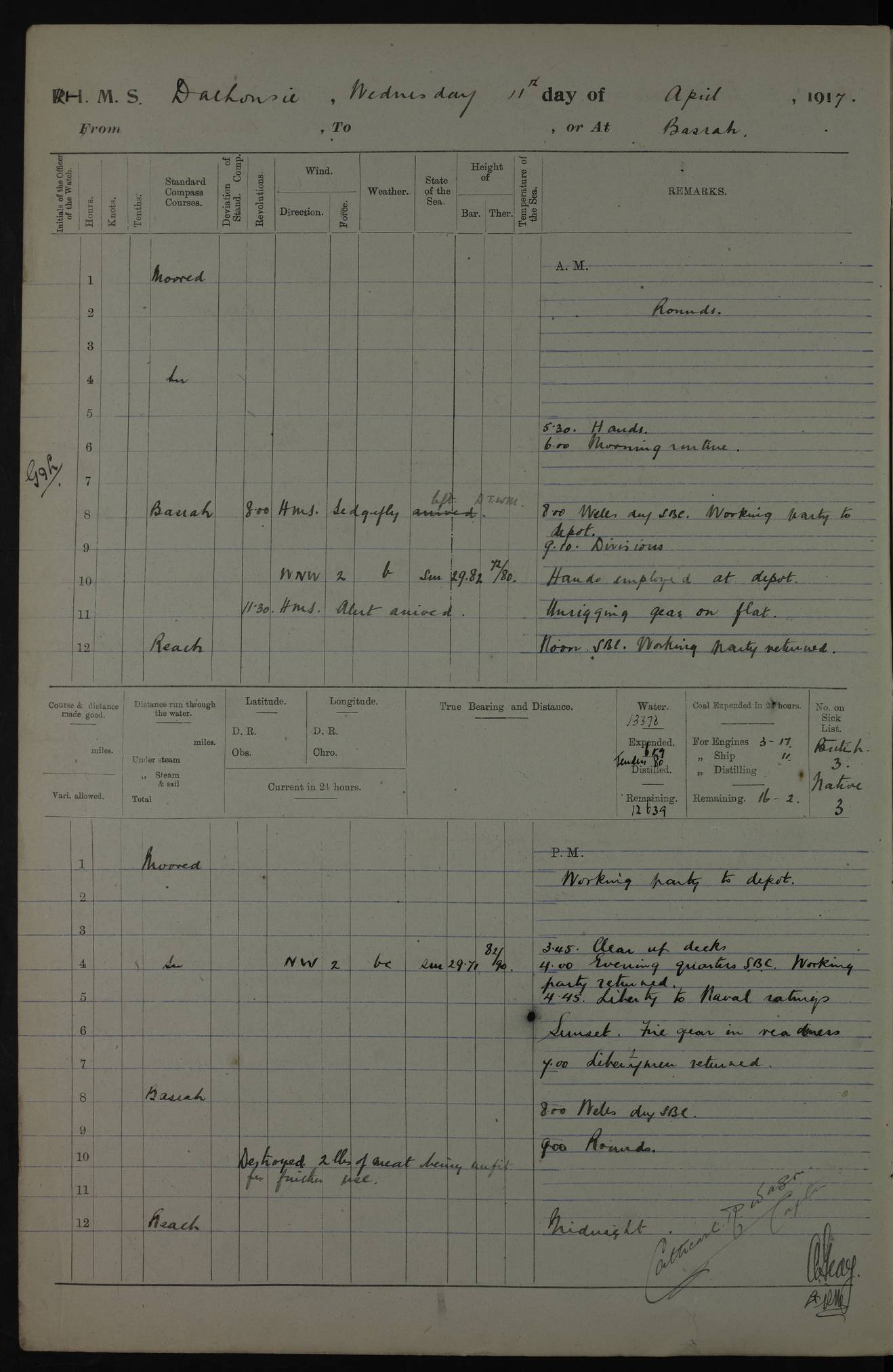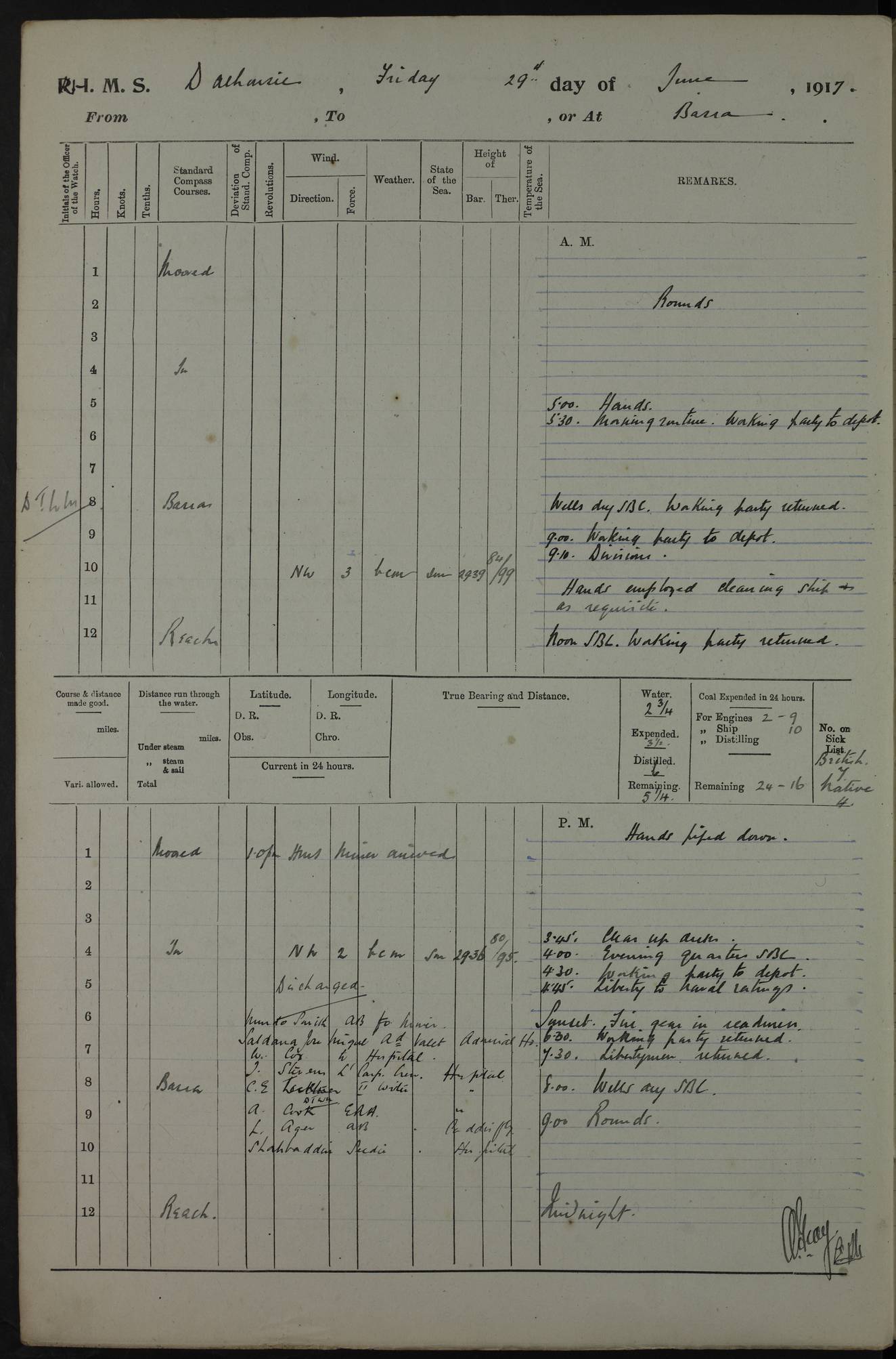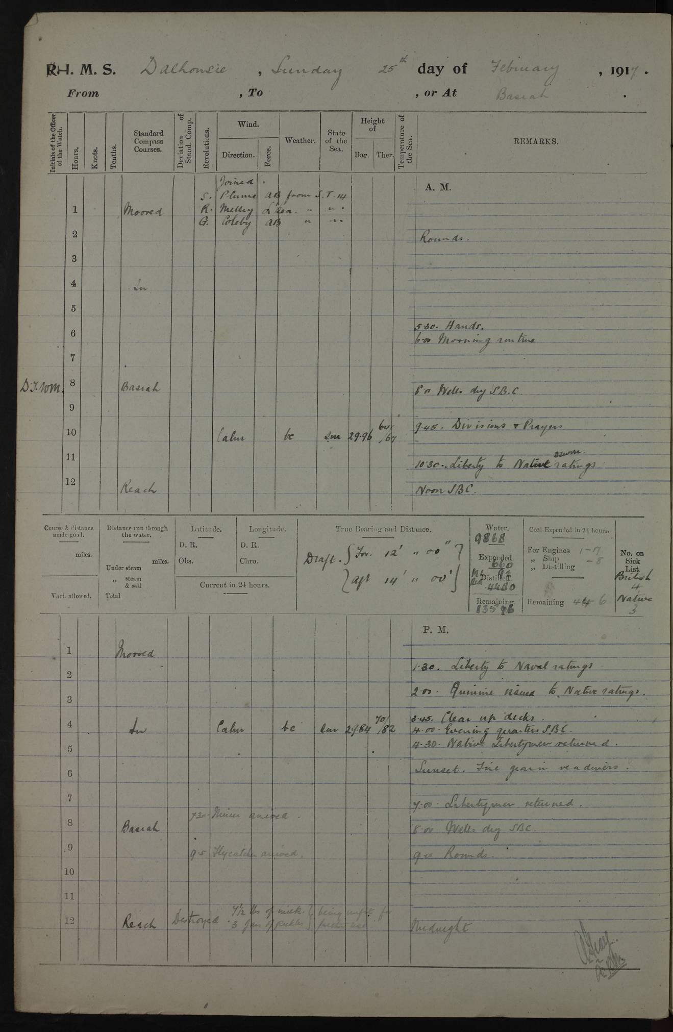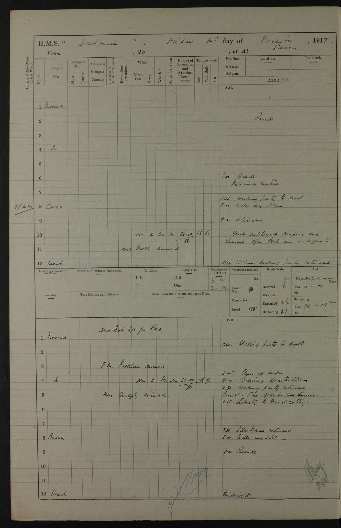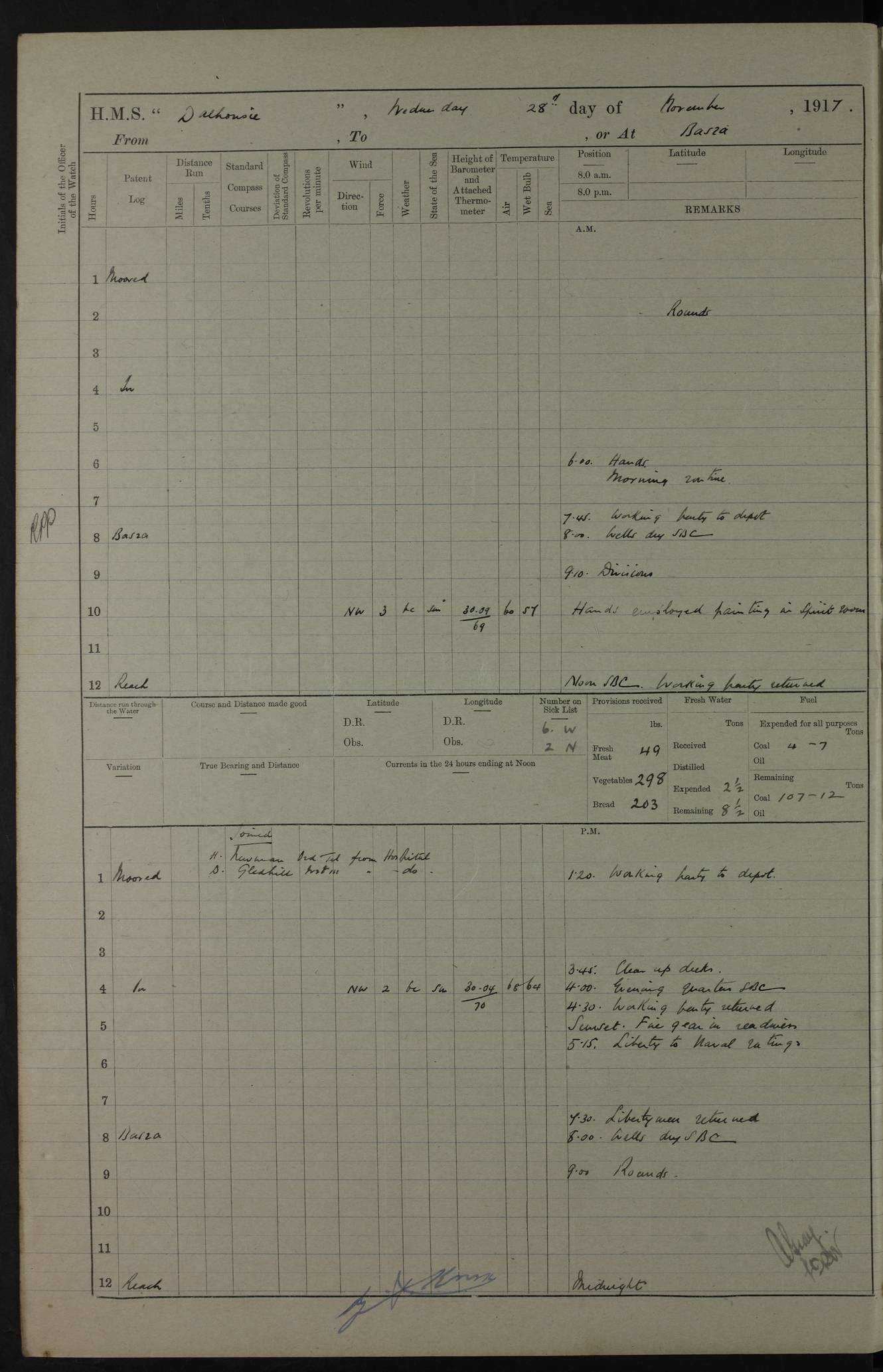 4ef4fafce53e0a0c91005931: (https://s3.amazonaws.com:443/oldweather/ADM53-39406/0015_1.jpg) 27 October 1917 Place: Basrah Lat 30.5269, Long 47.8407 2:00am: Rounds 6:00am: Hands - Morning Routine 7:00am: Exercised Fire stations 7:45am: Working party to Depot 8:00am: Wells dry - Signal Books correct 10:00am: Hands employed cleaning ship 12:00pm: Signal Books correct – Working party returned 1:00pm: Hands piped down 1:30pm: Liberty to Naval Ratings 3:45pm: Cleared up decks 4:00pm: Evening Quarters – Signal Books correct 5:15pm: Liberty to Naval Ratings 6:00pm: Sunset - Fire Gear in readiness 7:30pm: Liberty men returned 8:00pm: Wells dry - Signal Books correct 9:00pm: Rounds – Signal Books correct AM – Discharged To BARALA: W Denyer, Able Seaman - A Childs, Able Seaman - H Beckham Seaman - N Murray Seaman PM - Discharged To SCARAB: A Bushill, Senior Petty Officer - H Garth, Signalman To TARANTULA: G Campbell, Ship’s Steward Assistant 4ef4fafde53e0a0c91005932: (https://s3.amazonaws.com:443/oldweather/ADM53-39406/0016_0.jpg) 28 October 1917 Place: Basrah Lat 30.5269, Long 47.8407 2:00am: Rounds 5:30am: Hands 6:00am: Morning Routine 7:00am: Roman Catholic Church party landed 8:00am: Wells dry – Signal Books correct – Roman Catholics returned - Working party to Depot 8:30am: Church of England party to PROSERPINE 8:45am: Wesleyans landed 9:45am: Church parties returned - Divisions 10:30am: Liberty to Native Ratings 12:00pm: Signal Books correct – Working party returned 1:00pm: Issued Quinine to Naval Ratings- Issued Quinine to Native Ratings 1:30pm: Liberty to Naval ratings 3:45pm: Cleared up decks 4:00pm: Evening Quarters – Signal Books correct 5:15pm: Liberty to Naval Ratings 6:00pm: Sunset - Fire Gear in readiness 7:30pm: Liberty men returned 8:00pm: Wells dry - Signal Books correct 9:00pm: Rounds – Signal Books correct AM – Discharged To GRAYFLY: E.C. Shepherd, Petty Officer - W Hill, Able Seaman - Q Cox, Able Seaman - H Murphy, Able Seaman - A Taylor Telegrapher PM – Joined From SCARAB: J.G. Cooper, Stoker From Admiral’s House: Dounleg bin Eulog, Seedie PM - Discharged To ELEPHANTA: Alex de Souza, Officer's Steward To SCARAB: A Hatchard, Stoker To FIREFLY: W Burke, Stoker To Admiral’s House: Abrahim bin Shambi, Seedie