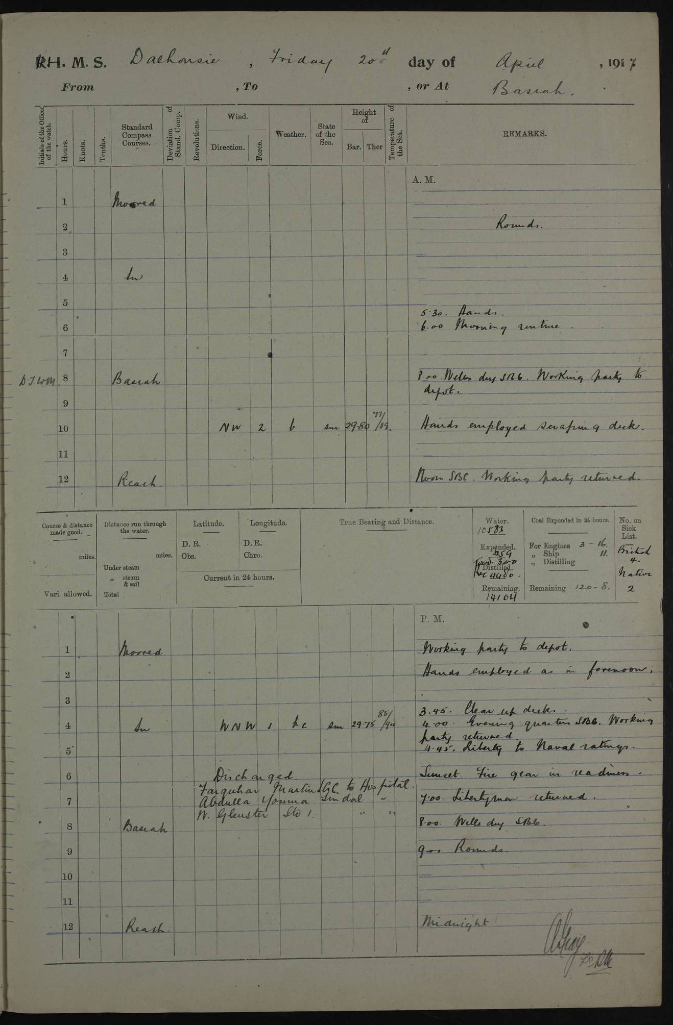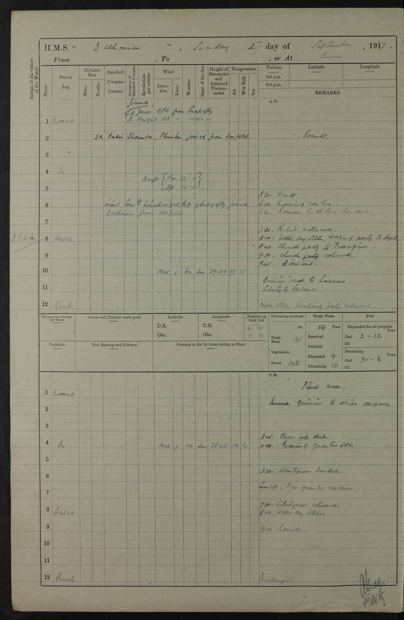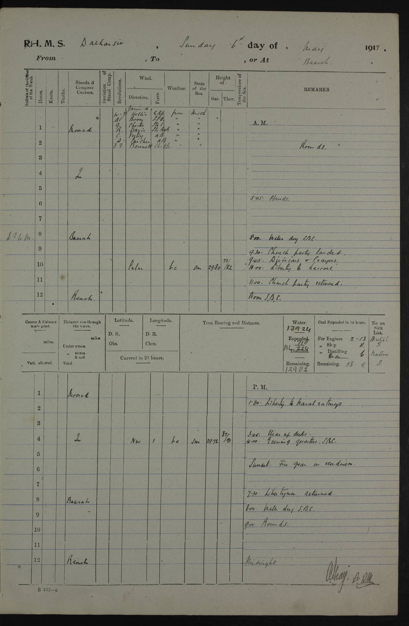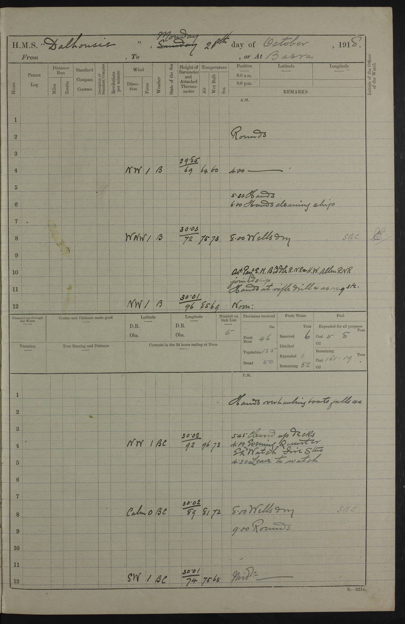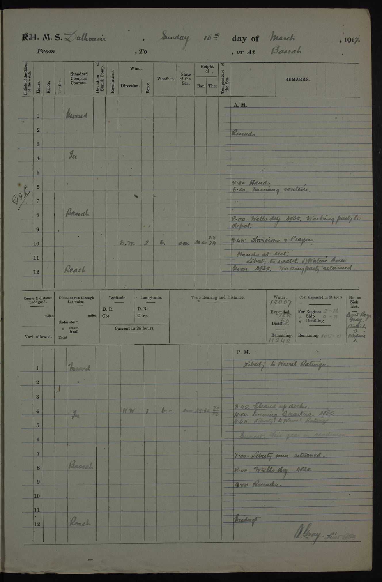 4ef4fafce53e0a0c91005931: (https://s3.amazonaws.com:443/oldweather/ADM53-39406/0015_1.jpg) 27 October 1917 Place: Basrah Lat 30.5269, Long 47.8407 2:00am: Rounds 6:00am: Hands - Morning Routine 7:00am: Exercised Fire stations 7:45am: Working party to Depot 8:00am: Wells dry - Signal Books correct 10:00am: Hands employed cleaning ship 12:00pm: Signal Books correct – Working party returned 1:00pm: Hands piped down 1:30pm: Liberty to Naval Ratings 3:45pm: Cleared up decks 4:00pm: Evening Quarters – Signal Books correct 5:15pm: Liberty to Naval Ratings 6:00pm: Sunset - Fire Gear in readiness 7:30pm: Liberty men returned 8:00pm: Wells dry - Signal Books correct 9:00pm: Rounds – Signal Books correct AM – Discharged To BARALA: W Denyer, Able Seaman - A Childs, Able Seaman - H Beckham Seaman - N Murray Seaman PM - Discharged To SCARAB: A Bushill, Senior Petty Officer - H Garth, Signalman To TARANTULA: G Campbell, Ship’s Steward Assistant 4ef4fafde53e0a0c91005932: (https://s3.amazonaws.com:443/oldweather/ADM53-39406/0016_0.jpg) 28 October 1917 Place: Basrah Lat 30.5269, Long 47.8407 2:00am: Rounds 5:30am: Hands 6:00am: Morning Routine 7:00am: Roman Catholic Church party landed 8:00am: Wells dry – Signal Books correct – Roman Catholics returned - Working party to Depot 8:30am: Church of England party to PROSERPINE 8:45am: Wesleyans landed 9:45am: Church parties returned - Divisions 10:30am: Liberty to Native Ratings 12:00pm: Signal Books correct – Working party returned 1:00pm: Issued Quinine to Naval Ratings- Issued Quinine to Native Ratings 1:30pm: Liberty to Naval ratings 3:45pm: Cleared up decks 4:00pm: Evening Quarters – Signal Books correct 5:15pm: Liberty to Naval Ratings 6:00pm: Sunset - Fire Gear in readiness 7:30pm: Liberty men returned 8:00pm: Wells dry - Signal Books correct 9:00pm: Rounds – Signal Books correct AM – Discharged To GRAYFLY: E.C. Shepherd, Petty Officer - W Hill, Able Seaman - Q Cox, Able Seaman - H Murphy, Able Seaman - A Taylor Telegrapher PM – Joined From SCARAB: J.G. Cooper, Stoker From Admiral’s House: Dounleg bin Eulog, Seedie PM - Discharged To ELEPHANTA: Alex de Souza, Officer's Steward To SCARAB: A Hatchard, Stoker To FIREFLY: W Burke, Stoker To Admiral’s House: Abrahim bin Shambi, Seedie