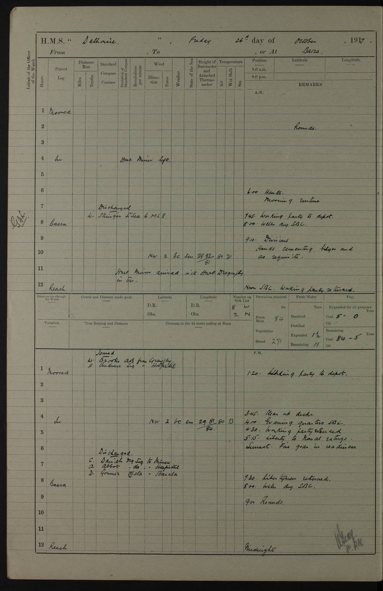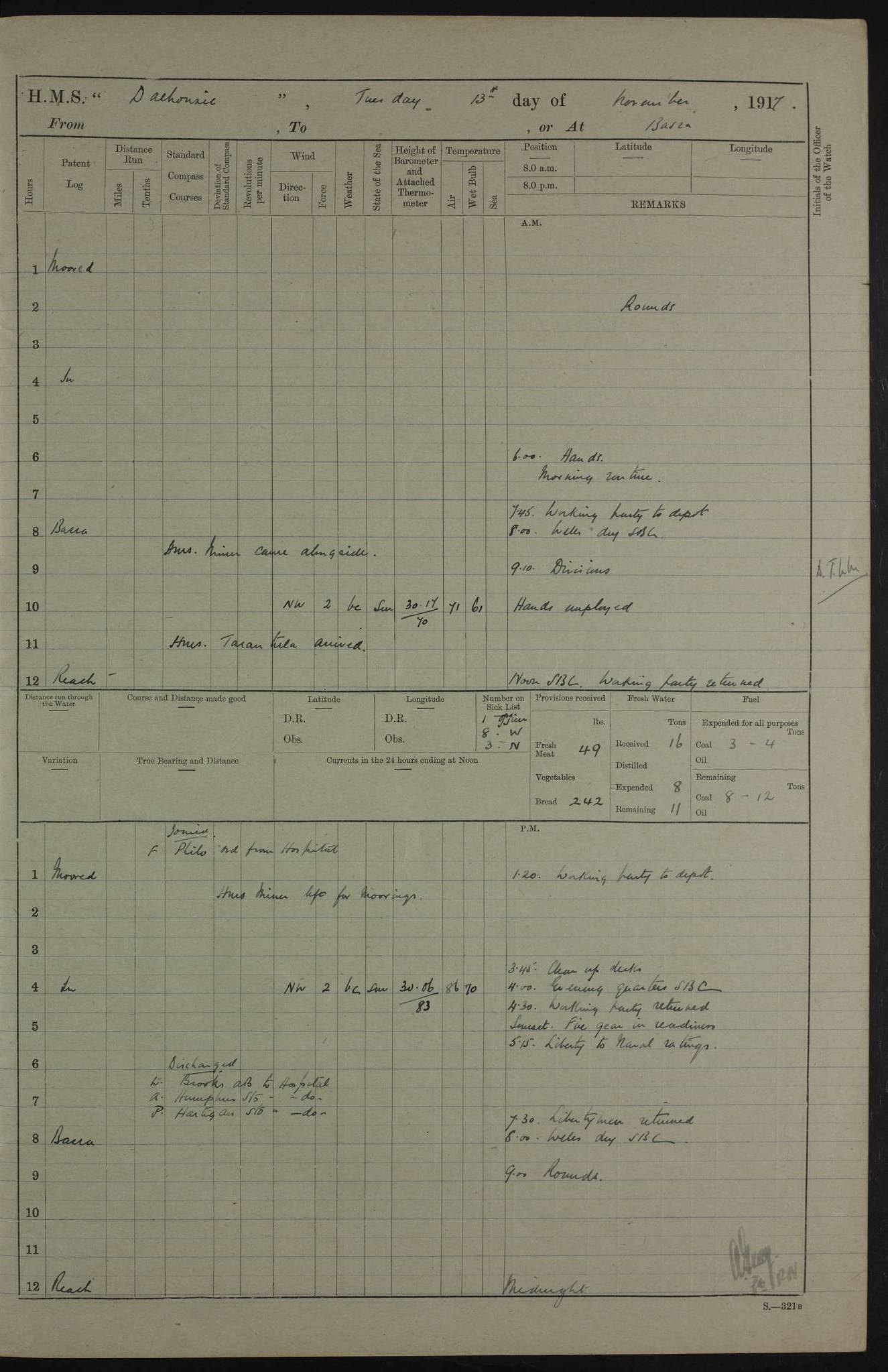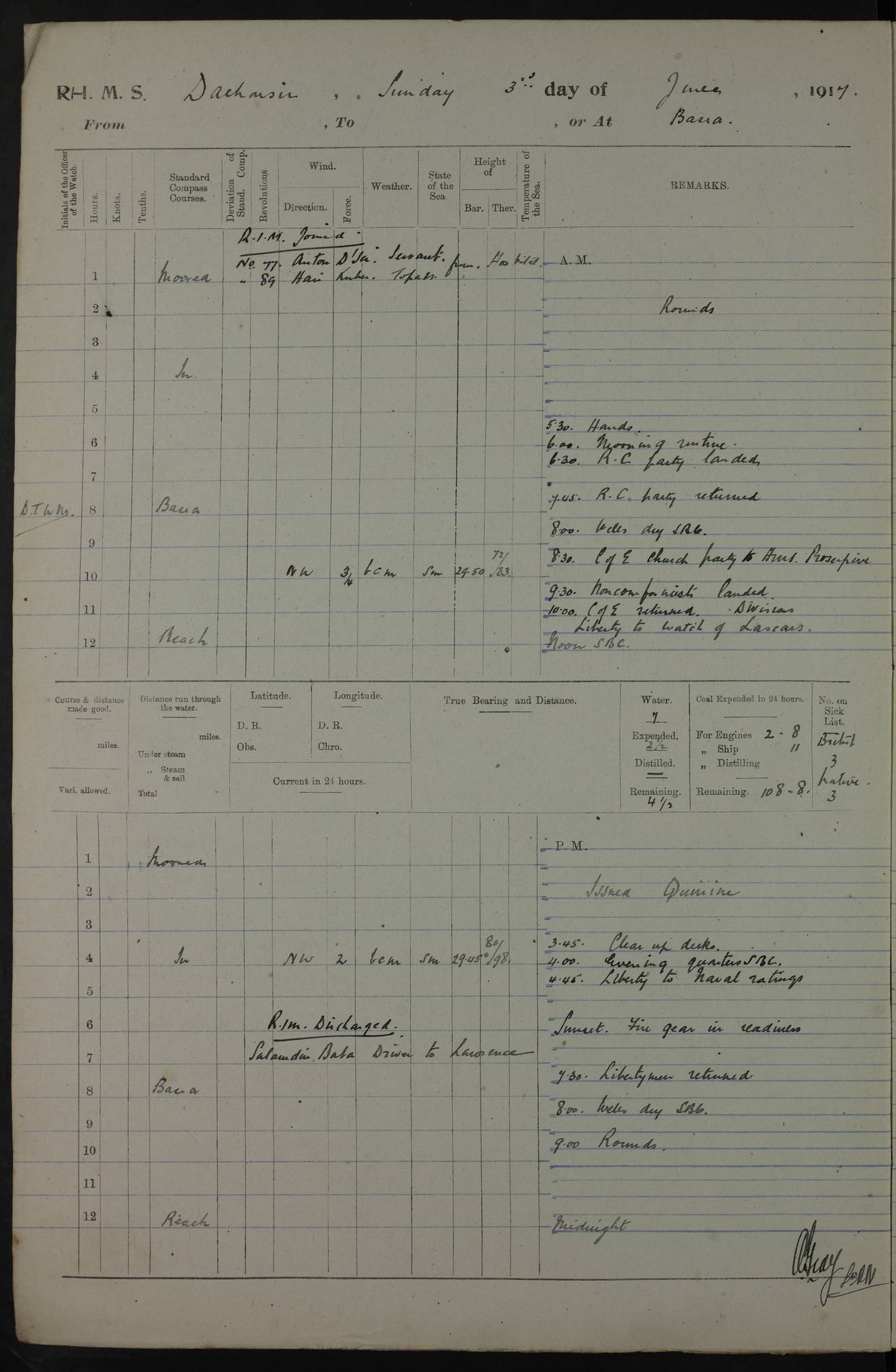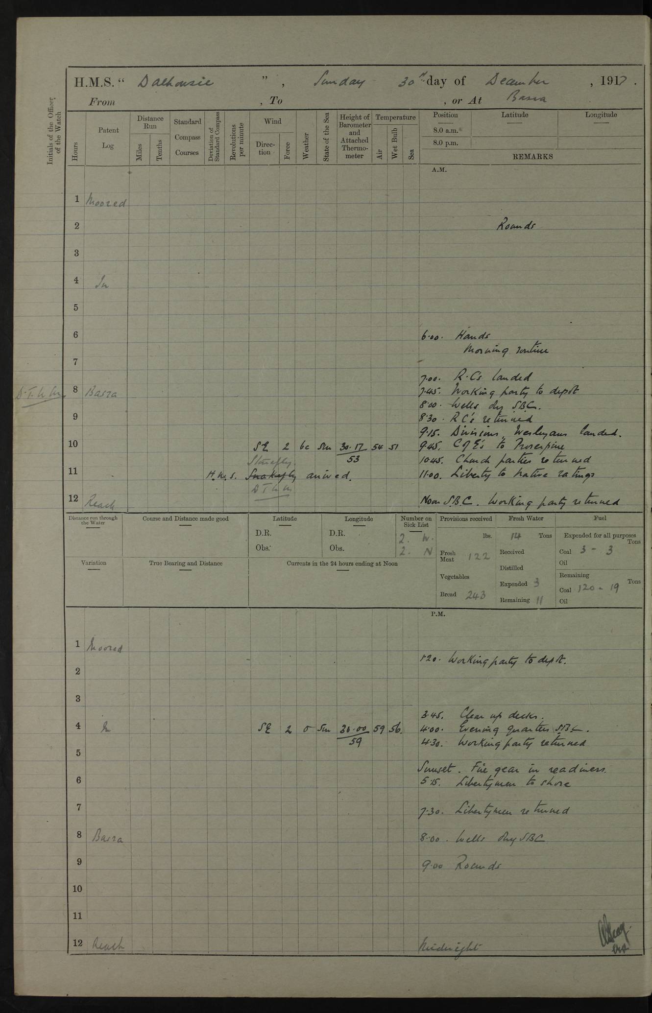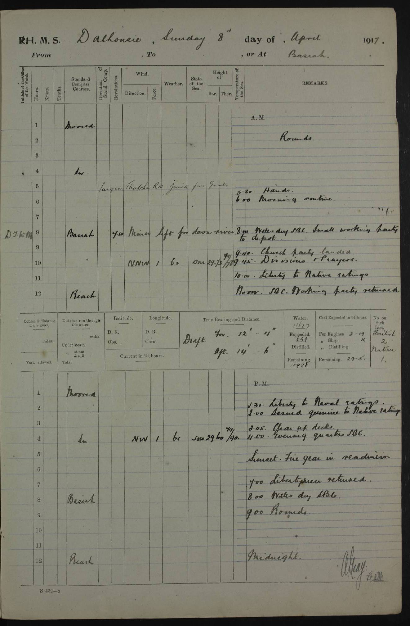 4ef4fafce53e0a0c91005931: (https://s3.amazonaws.com:443/oldweather/ADM53-39406/0015_1.jpg) 27 October 1917 Place: Basrah Lat 30.5269, Long 47.8407 2:00am: Rounds 6:00am: Hands - Morning Routine 7:00am: Exercised Fire stations 7:45am: Working party to Depot 8:00am: Wells dry - Signal Books correct 10:00am: Hands employed cleaning ship 12:00pm: Signal Books correct – Working party returned 1:00pm: Hands piped down 1:30pm: Liberty to Naval Ratings 3:45pm: Cleared up decks 4:00pm: Evening Quarters – Signal Books correct 5:15pm: Liberty to Naval Ratings 6:00pm: Sunset - Fire Gear in readiness 7:30pm: Liberty men returned 8:00pm: Wells dry - Signal Books correct 9:00pm: Rounds – Signal Books correct AM – Discharged To BARALA: W Denyer, Able Seaman - A Childs, Able Seaman - H Beckham Seaman - N Murray Seaman PM - Discharged To SCARAB: A Bushill, Senior Petty Officer - H Garth, Signalman To TARANTULA: G Campbell, Ship’s Steward Assistant 4ef4fafde53e0a0c91005932: (https://s3.amazonaws.com:443/oldweather/ADM53-39406/0016_0.jpg) 28 October 1917 Place: Basrah Lat 30.5269, Long 47.8407 2:00am: Rounds 5:30am: Hands 6:00am: Morning Routine 7:00am: Roman Catholic Church party landed 8:00am: Wells dry – Signal Books correct – Roman Catholics returned - Working party to Depot 8:30am: Church of England party to PROSERPINE 8:45am: Wesleyans landed 9:45am: Church parties returned - Divisions 10:30am: Liberty to Native Ratings 12:00pm: Signal Books correct – Working party returned 1:00pm: Issued Quinine to Naval Ratings- Issued Quinine to Native Ratings 1:30pm: Liberty to Naval ratings 3:45pm: Cleared up decks 4:00pm: Evening Quarters – Signal Books correct 5:15pm: Liberty to Naval Ratings 6:00pm: Sunset - Fire Gear in readiness 7:30pm: Liberty men returned 8:00pm: Wells dry - Signal Books correct 9:00pm: Rounds – Signal Books correct AM – Discharged To GRAYFLY: E.C. Shepherd, Petty Officer - W Hill, Able Seaman - Q Cox, Able Seaman - H Murphy, Able Seaman - A Taylor Telegrapher PM – Joined From SCARAB: J.G. Cooper, Stoker From Admiral’s House: Dounleg bin Eulog, Seedie PM - Discharged To ELEPHANTA: Alex de Souza, Officer's Steward To SCARAB: A Hatchard, Stoker To FIREFLY: W Burke, Stoker To Admiral’s House: Abrahim bin Shambi, Seedie