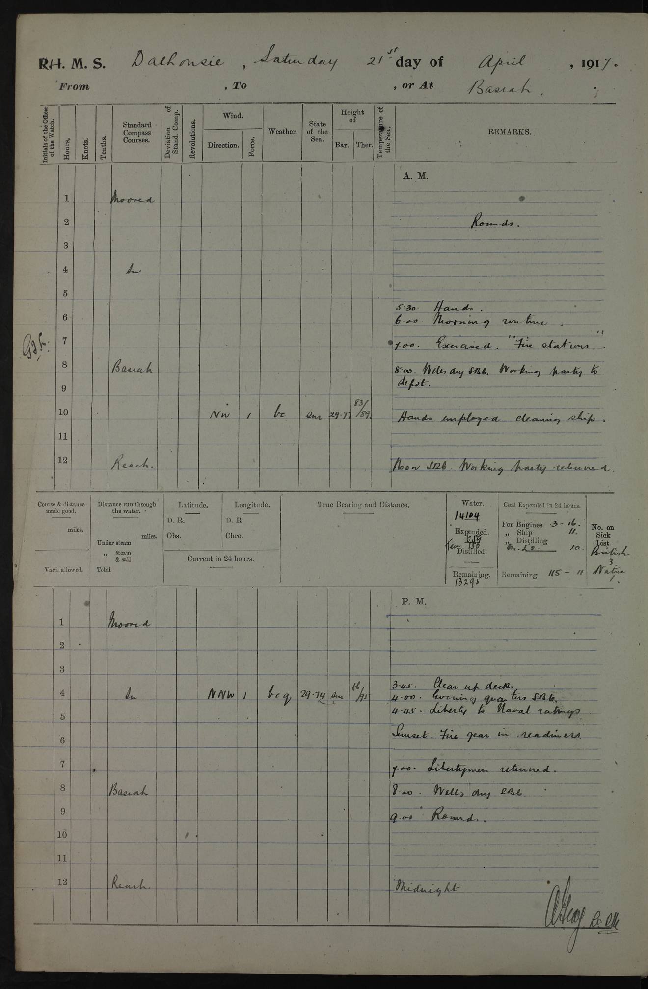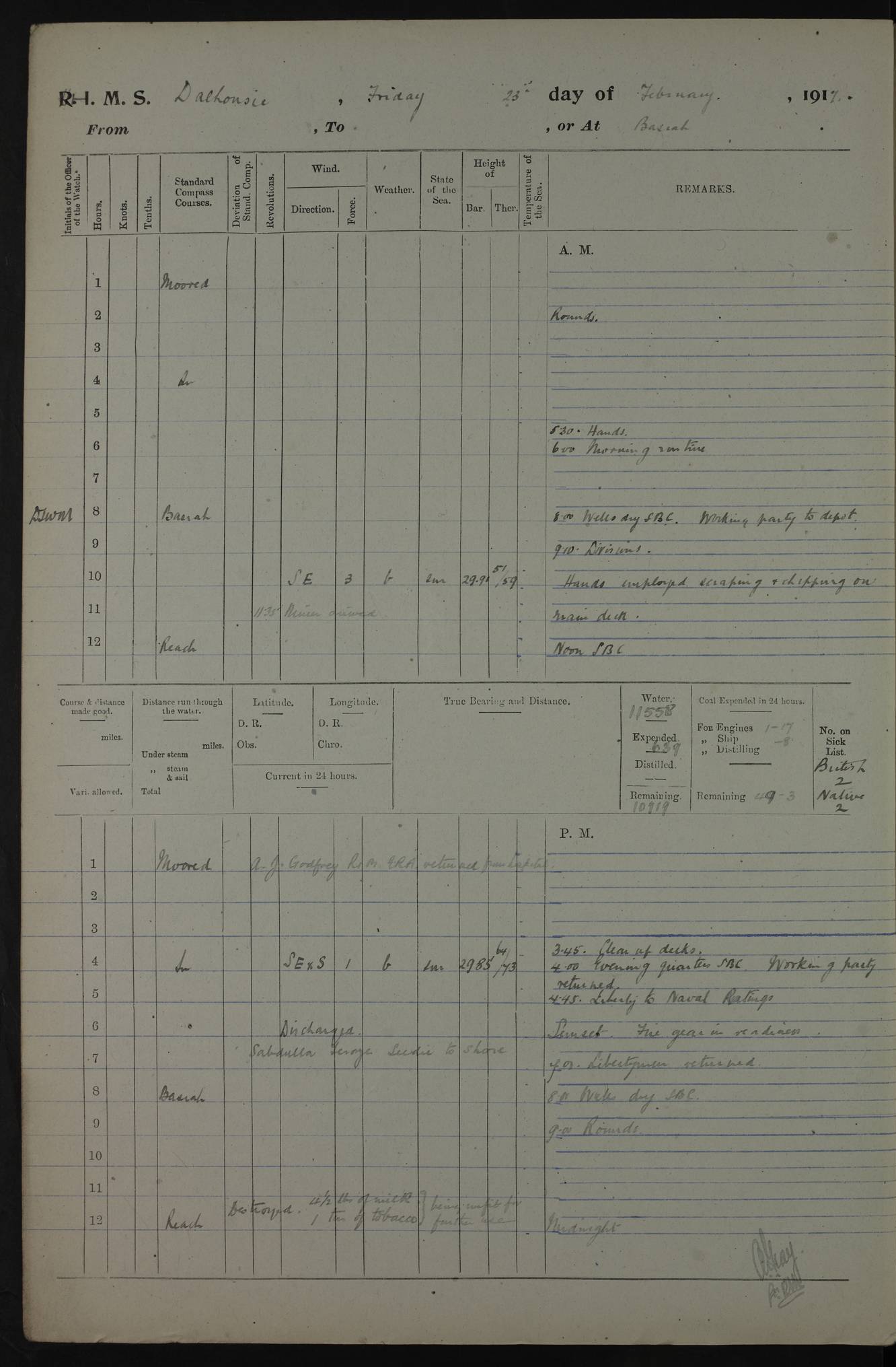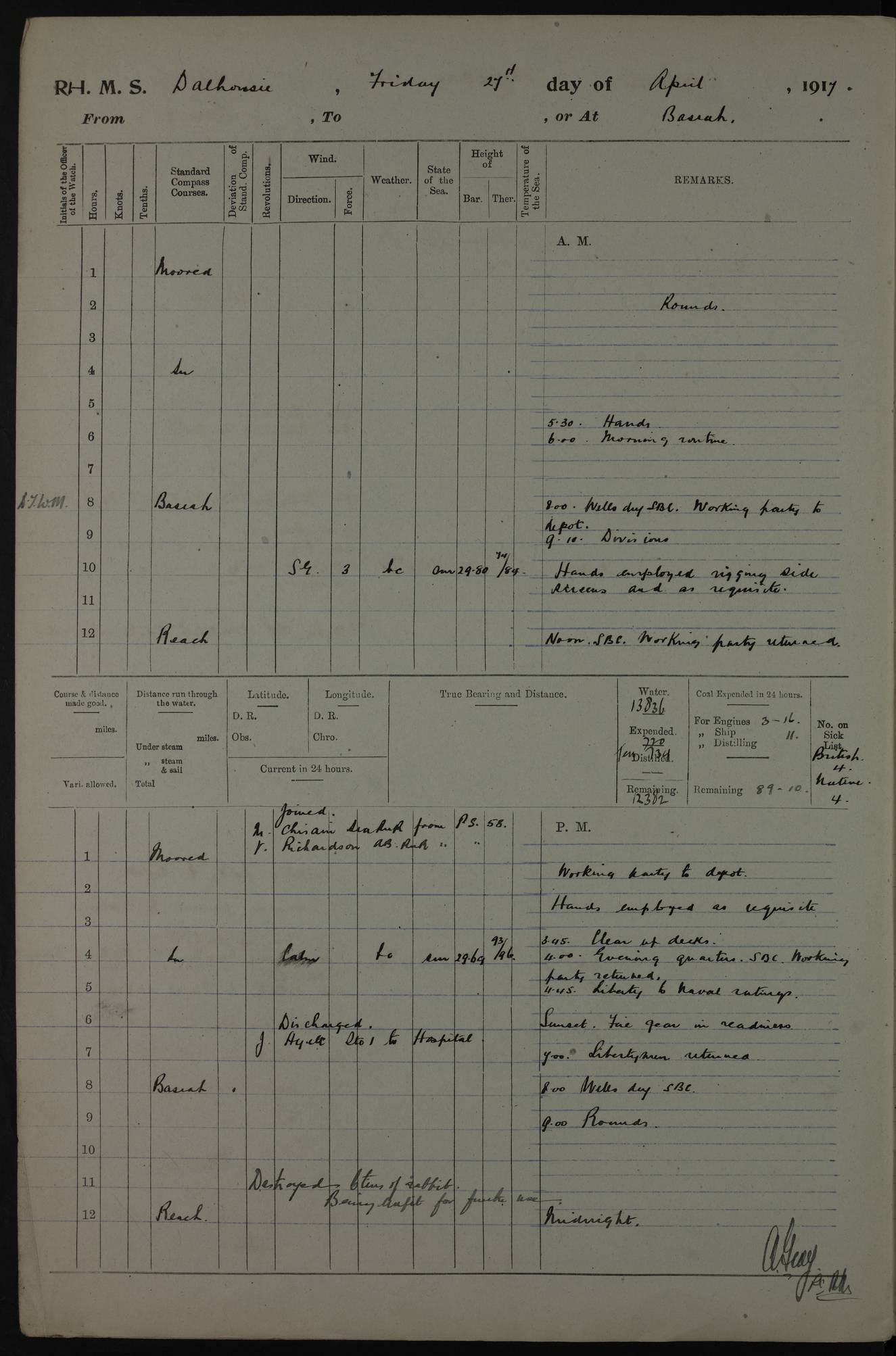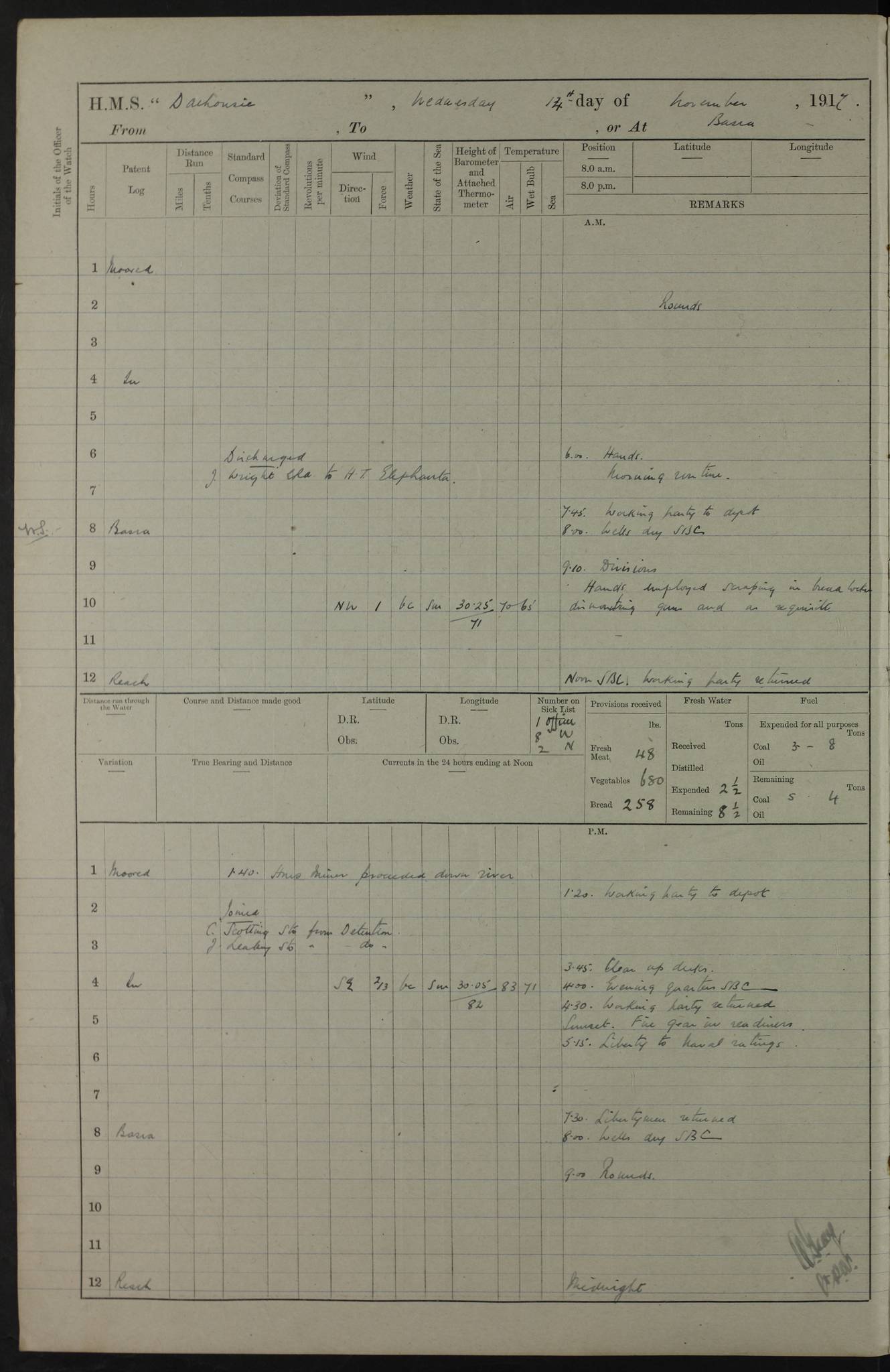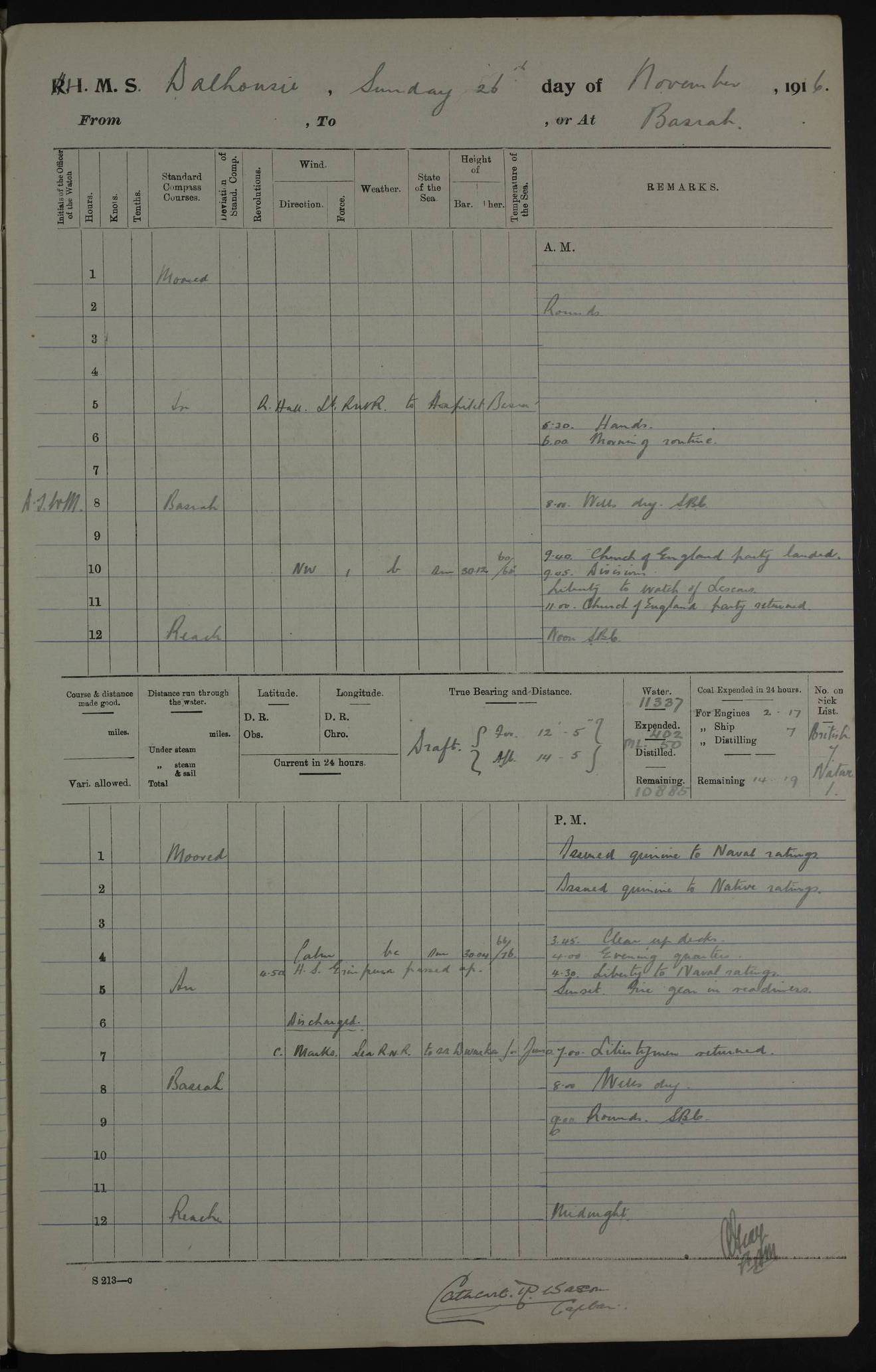 4ef4fafce53e0a0c91005931: (https://s3.amazonaws.com:443/oldweather/ADM53-39406/0015_1.jpg) 27 October 1917 Place: Basrah Lat 30.5269, Long 47.8407 2:00am: Rounds 6:00am: Hands - Morning Routine 7:00am: Exercised Fire stations 7:45am: Working party to Depot 8:00am: Wells dry - Signal Books correct 10:00am: Hands employed cleaning ship 12:00pm: Signal Books correct – Working party returned 1:00pm: Hands piped down 1:30pm: Liberty to Naval Ratings 3:45pm: Cleared up decks 4:00pm: Evening Quarters – Signal Books correct 5:15pm: Liberty to Naval Ratings 6:00pm: Sunset - Fire Gear in readiness 7:30pm: Liberty men returned 8:00pm: Wells dry - Signal Books correct 9:00pm: Rounds – Signal Books correct AM – Discharged To BARALA: W Denyer, Able Seaman - A Childs, Able Seaman - H Beckham Seaman - N Murray Seaman PM - Discharged To SCARAB: A Bushill, Senior Petty Officer - H Garth, Signalman To TARANTULA: G Campbell, Ship’s Steward Assistant 4ef4fafde53e0a0c91005932: (https://s3.amazonaws.com:443/oldweather/ADM53-39406/0016_0.jpg) 28 October 1917 Place: Basrah Lat 30.5269, Long 47.8407 2:00am: Rounds 5:30am: Hands 6:00am: Morning Routine 7:00am: Roman Catholic Church party landed 8:00am: Wells dry – Signal Books correct – Roman Catholics returned - Working party to Depot 8:30am: Church of England party to PROSERPINE 8:45am: Wesleyans landed 9:45am: Church parties returned - Divisions 10:30am: Liberty to Native Ratings 12:00pm: Signal Books correct – Working party returned 1:00pm: Issued Quinine to Naval Ratings- Issued Quinine to Native Ratings 1:30pm: Liberty to Naval ratings 3:45pm: Cleared up decks 4:00pm: Evening Quarters – Signal Books correct 5:15pm: Liberty to Naval Ratings 6:00pm: Sunset - Fire Gear in readiness 7:30pm: Liberty men returned 8:00pm: Wells dry - Signal Books correct 9:00pm: Rounds – Signal Books correct AM – Discharged To GRAYFLY: E.C. Shepherd, Petty Officer - W Hill, Able Seaman - Q Cox, Able Seaman - H Murphy, Able Seaman - A Taylor Telegrapher PM – Joined From SCARAB: J.G. Cooper, Stoker From Admiral’s House: Dounleg bin Eulog, Seedie PM - Discharged To ELEPHANTA: Alex de Souza, Officer's Steward To SCARAB: A Hatchard, Stoker To FIREFLY: W Burke, Stoker To Admiral’s House: Abrahim bin Shambi, Seedie